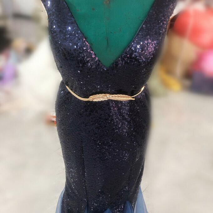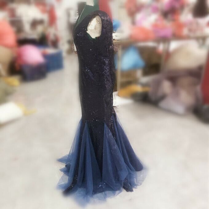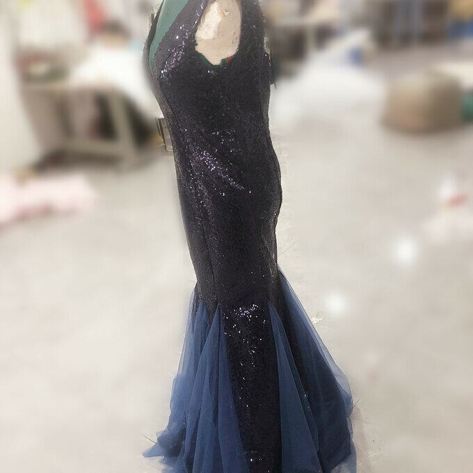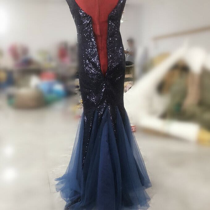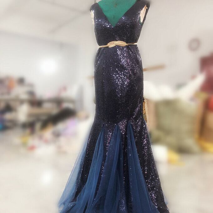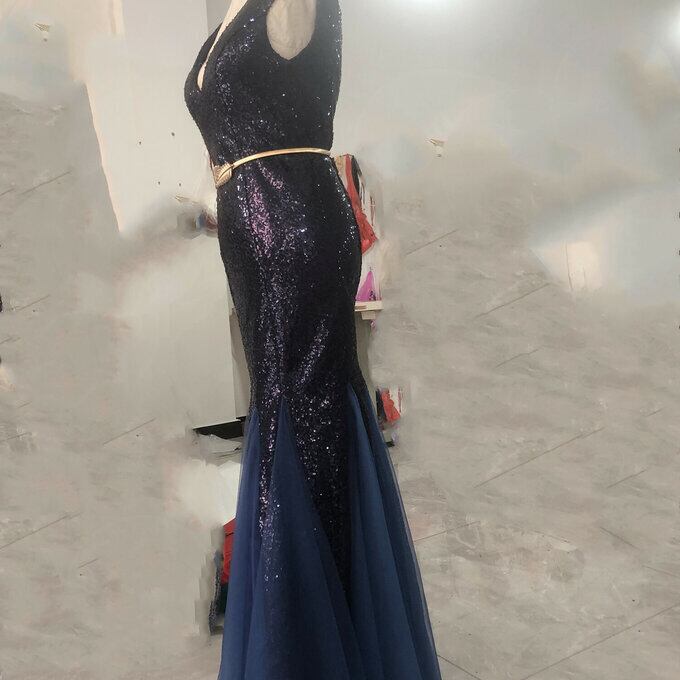 上品! パーティードレス 紺 マーメイドライン 深Vネック 優雅なシルエット 細見えシルエット