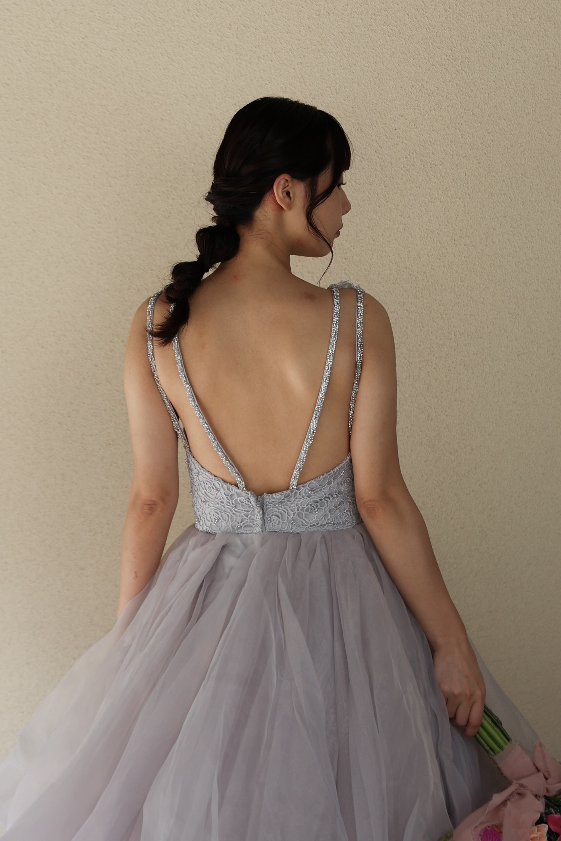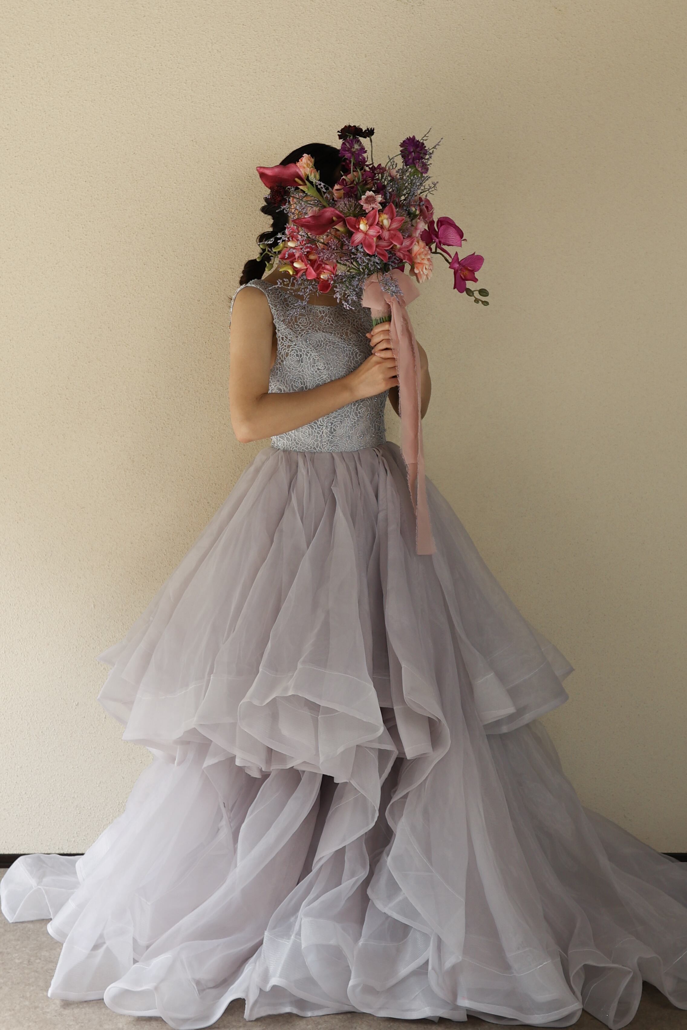 送料無料!人気上昇!グレー エレ ガントレース柔らかく重ねたチュールスカート カラードレス ロングトレーン /結婚式/披露宴