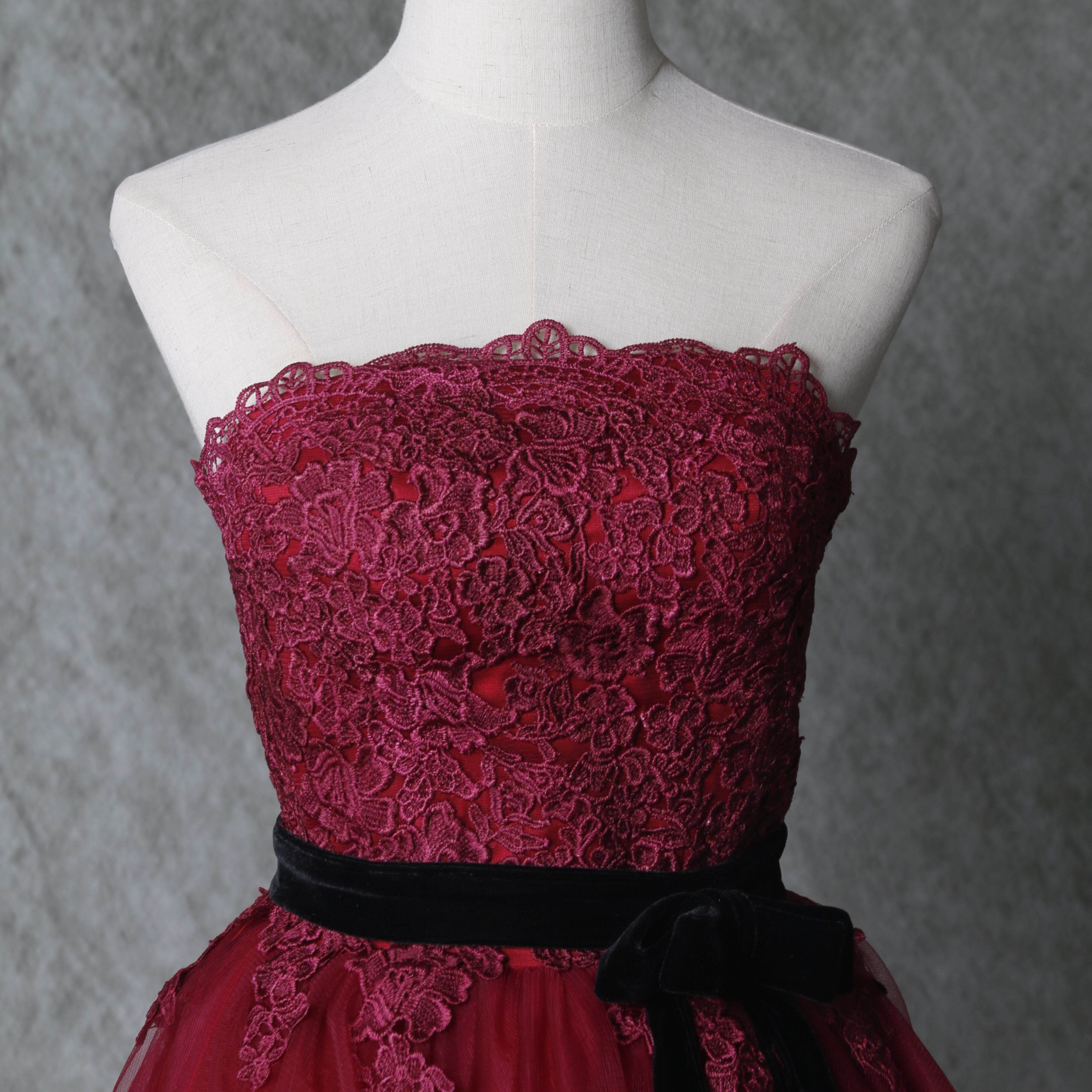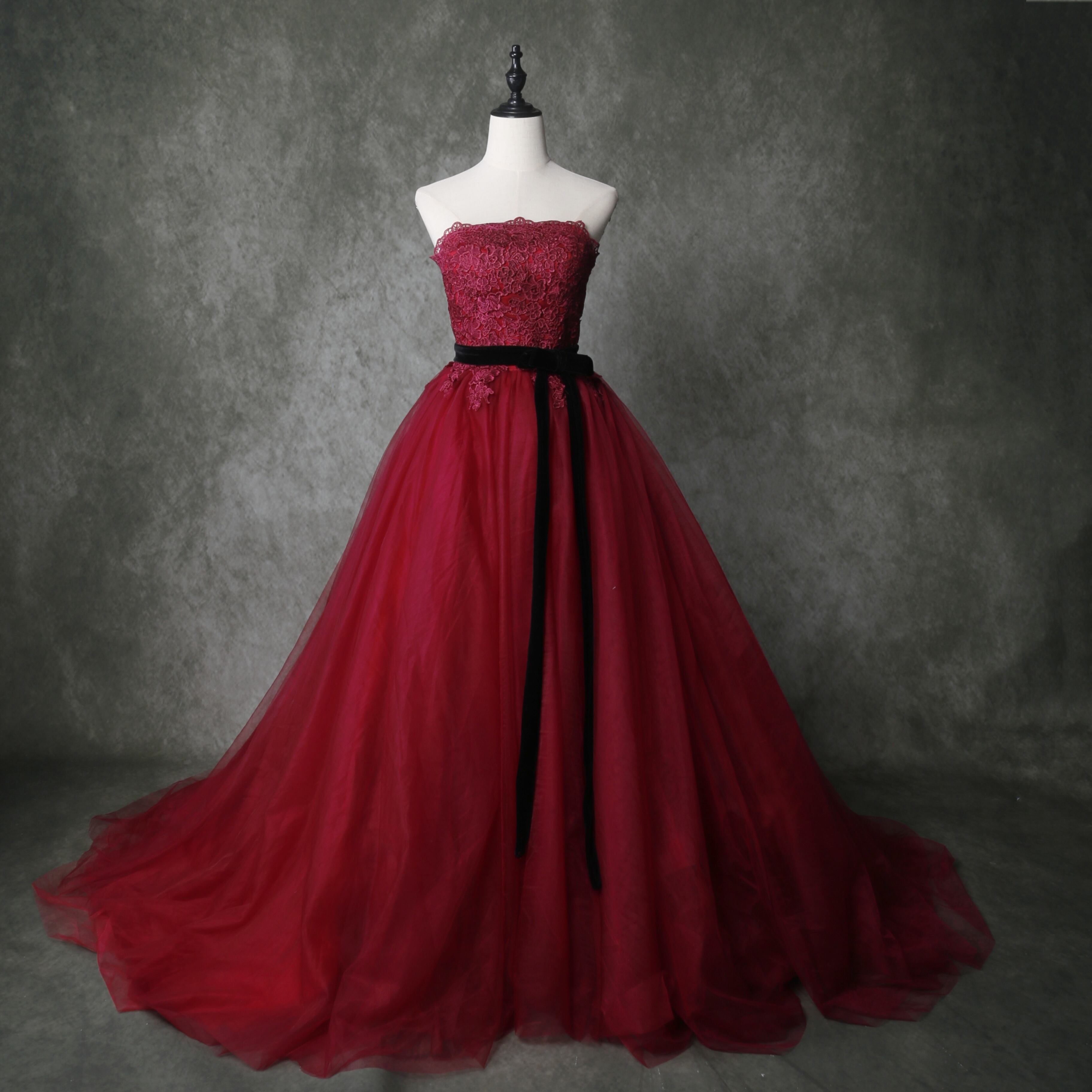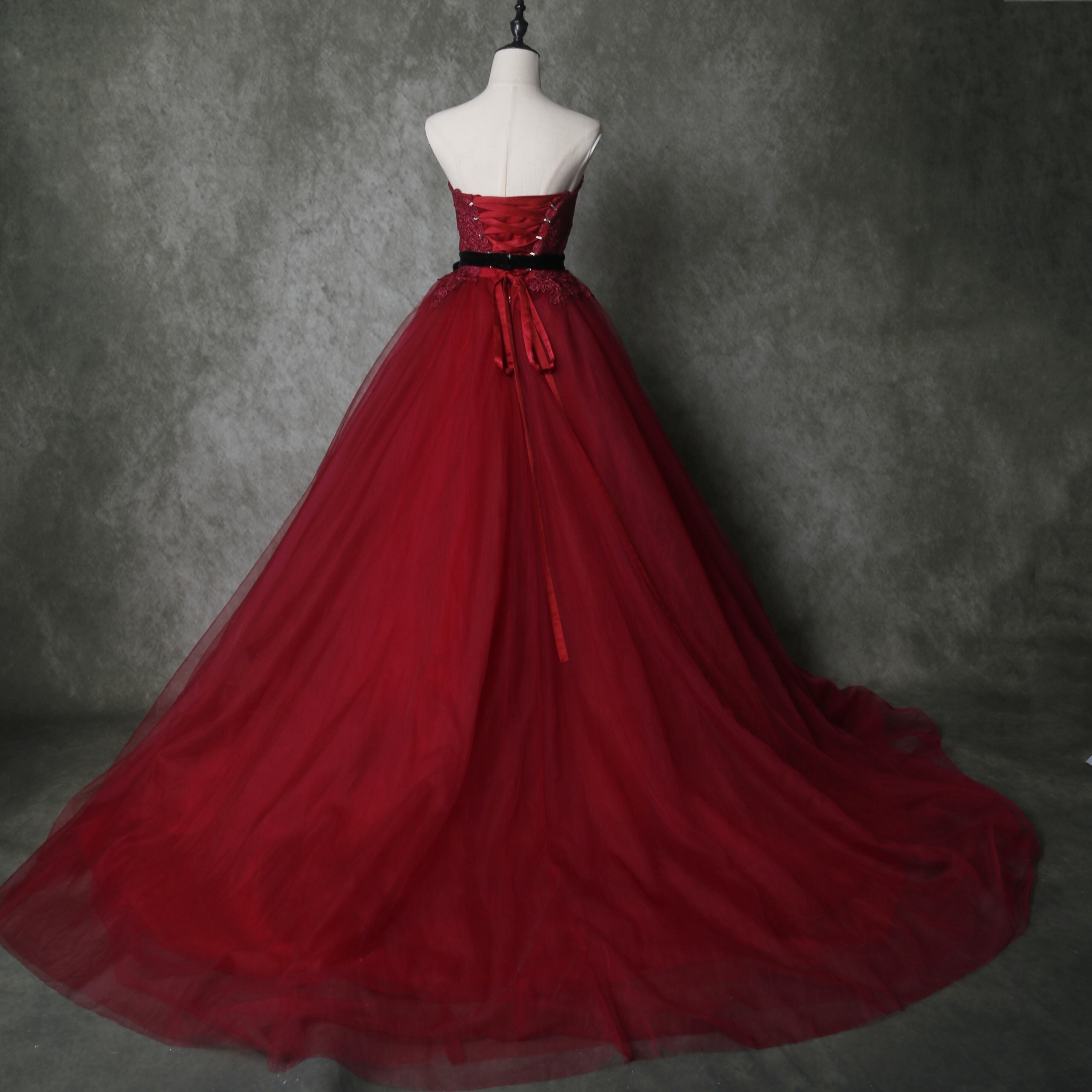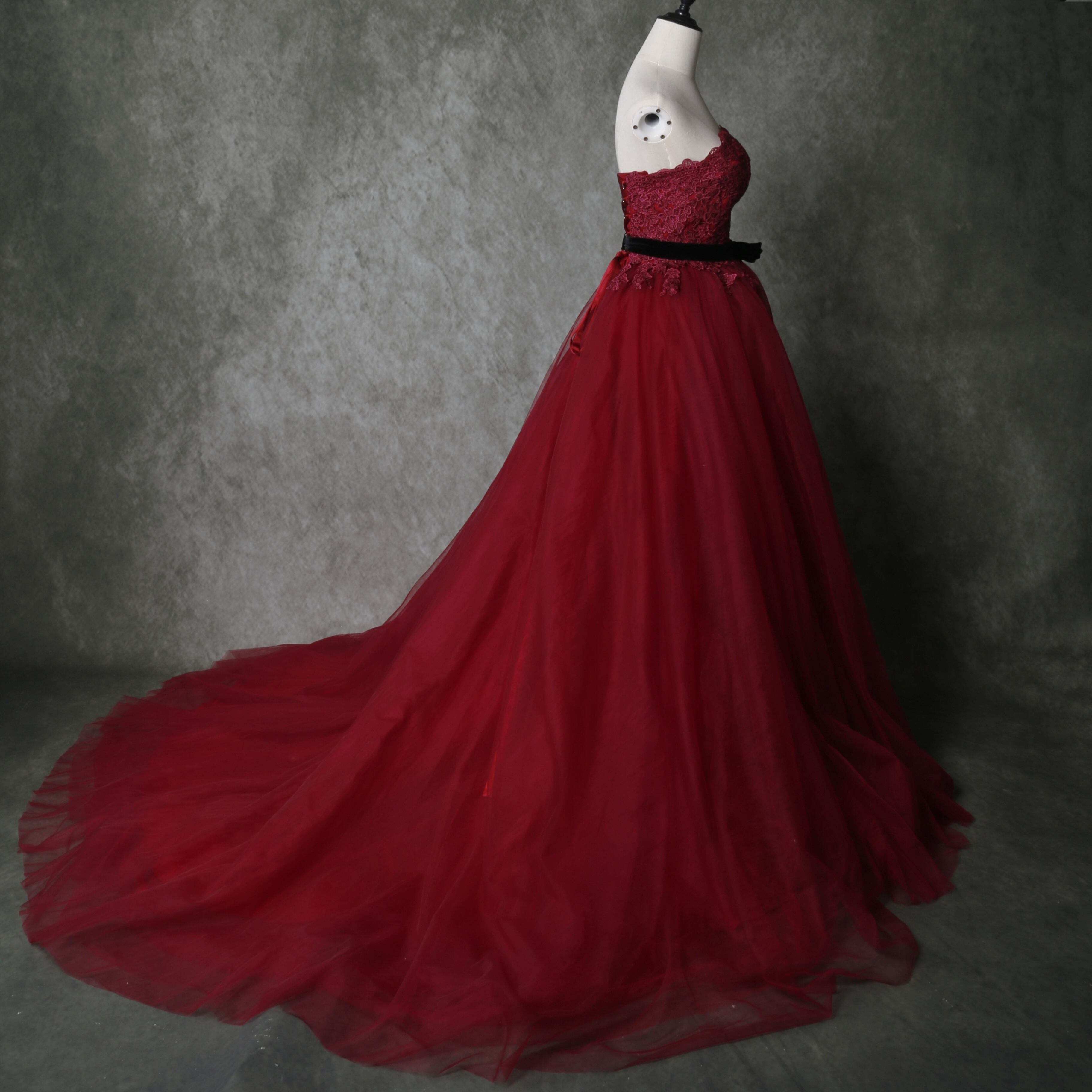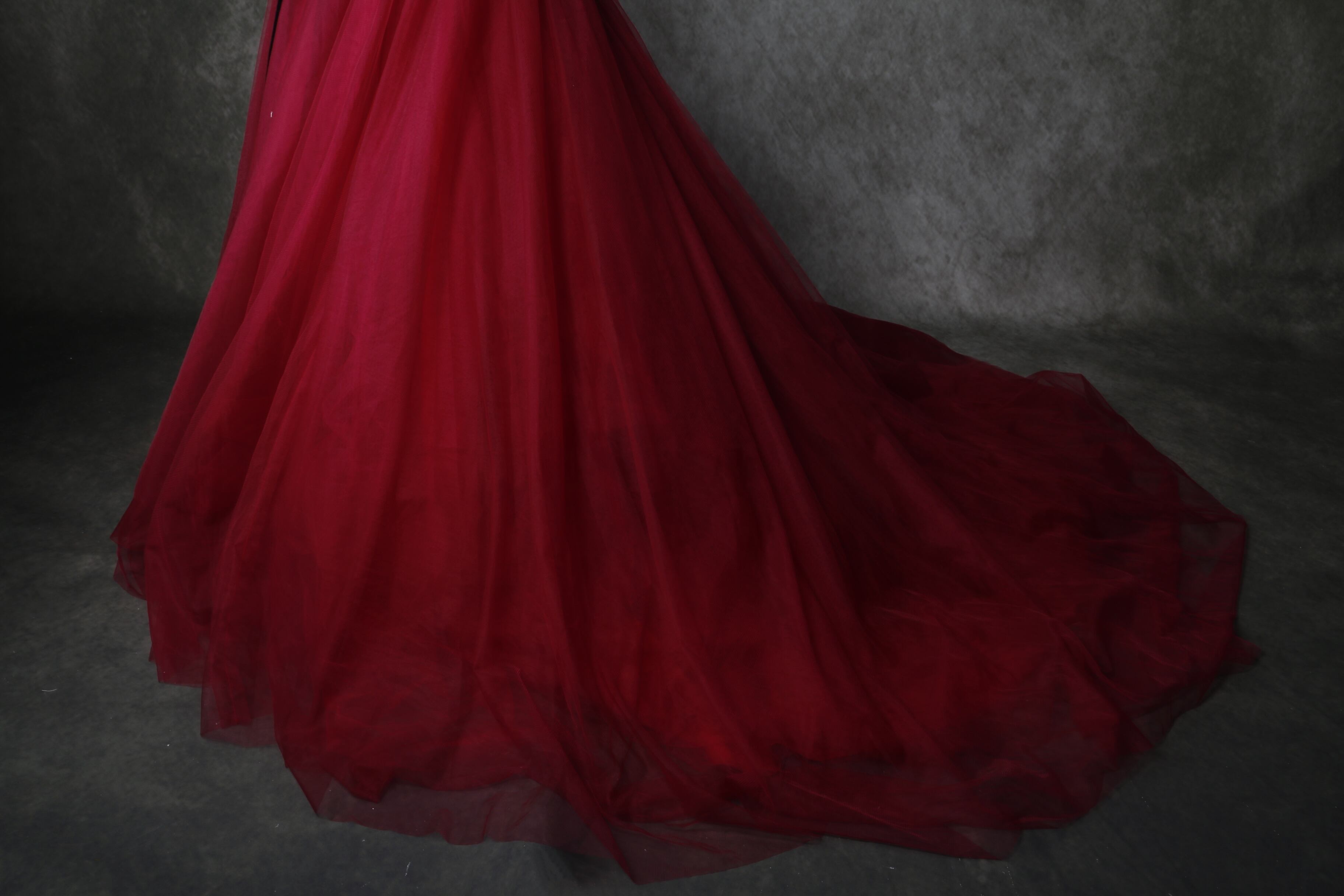 抜群のおしゃれ見え パフスリーブ ベアトップ ワインレッド カラードレス 華やかなトレーン/花嫁/結婚式