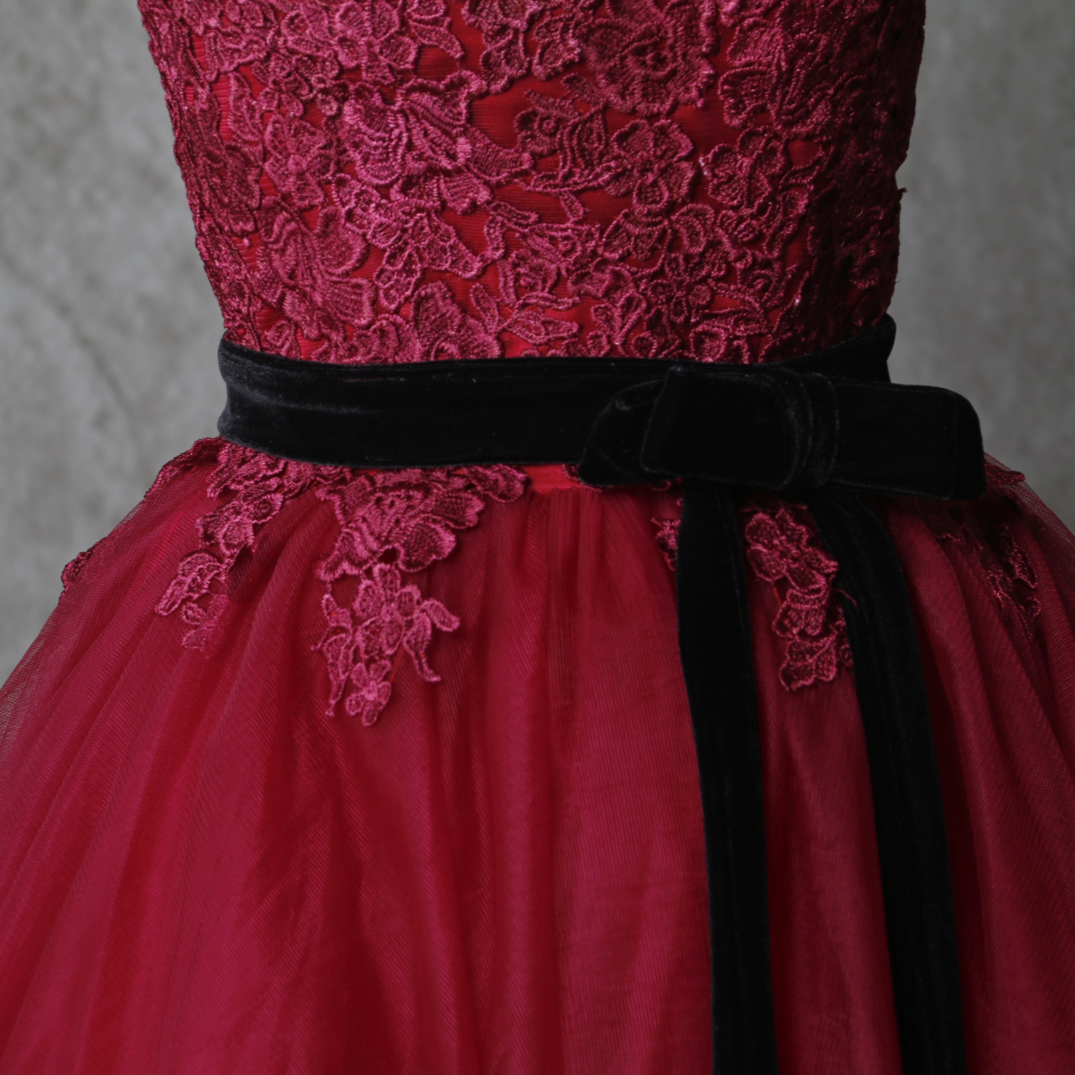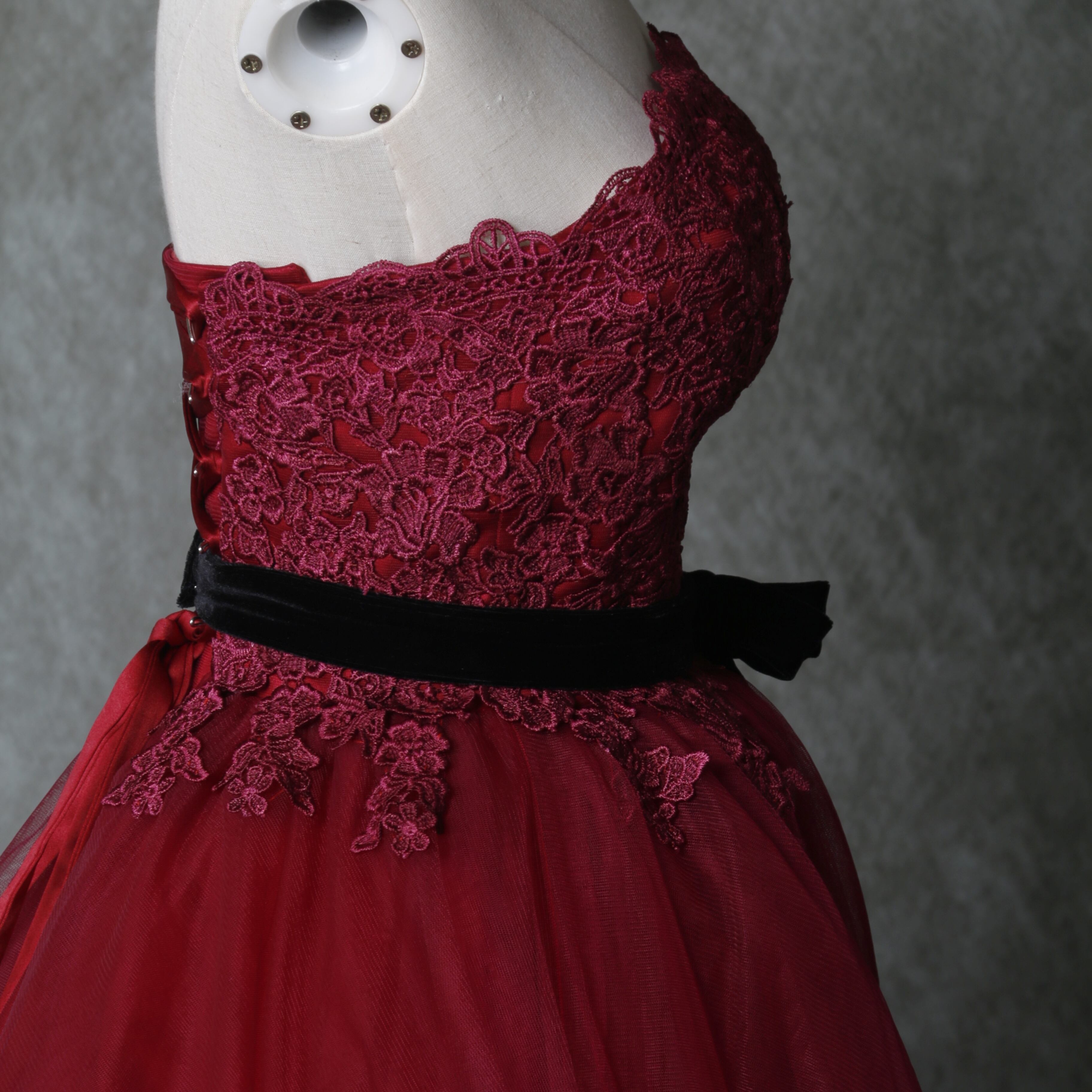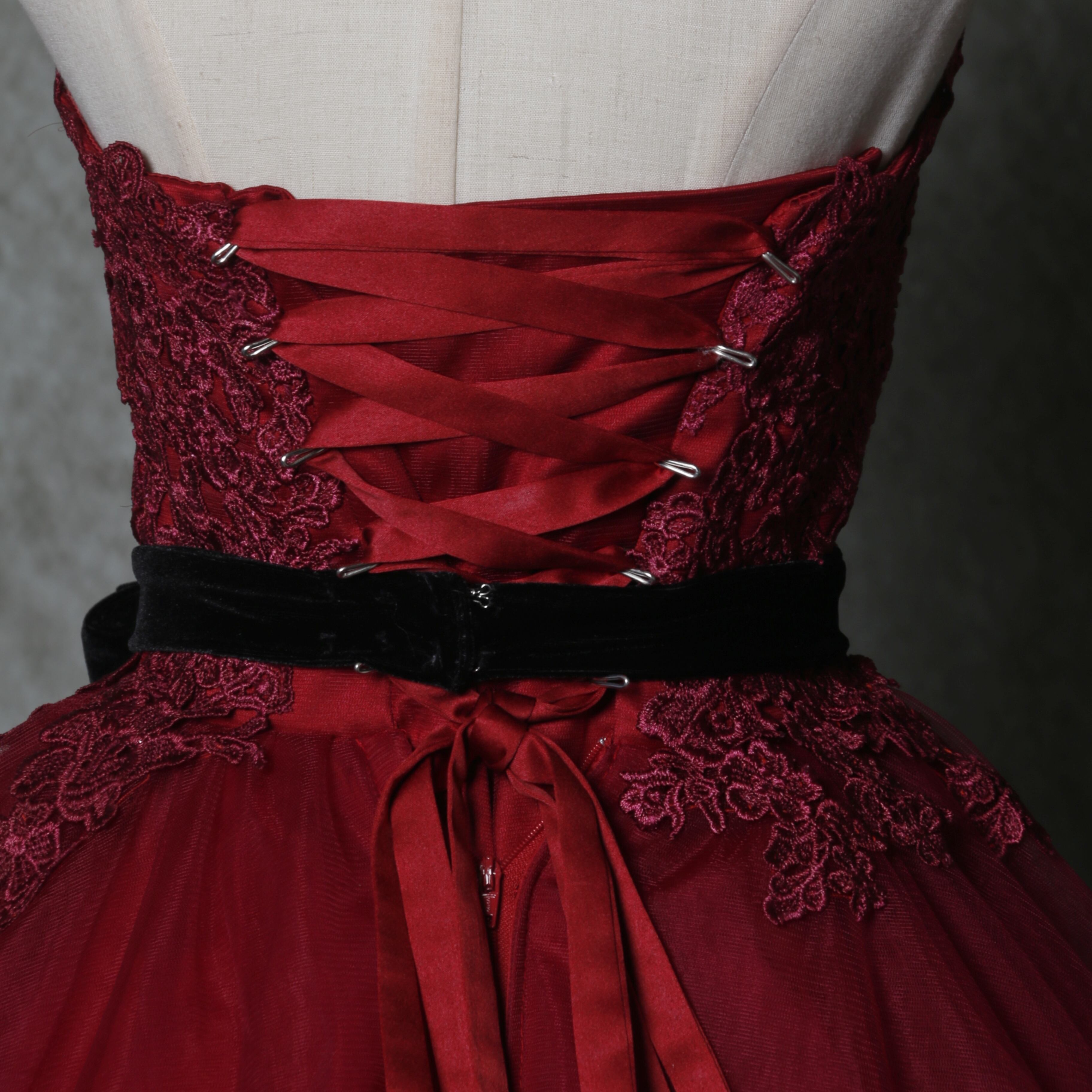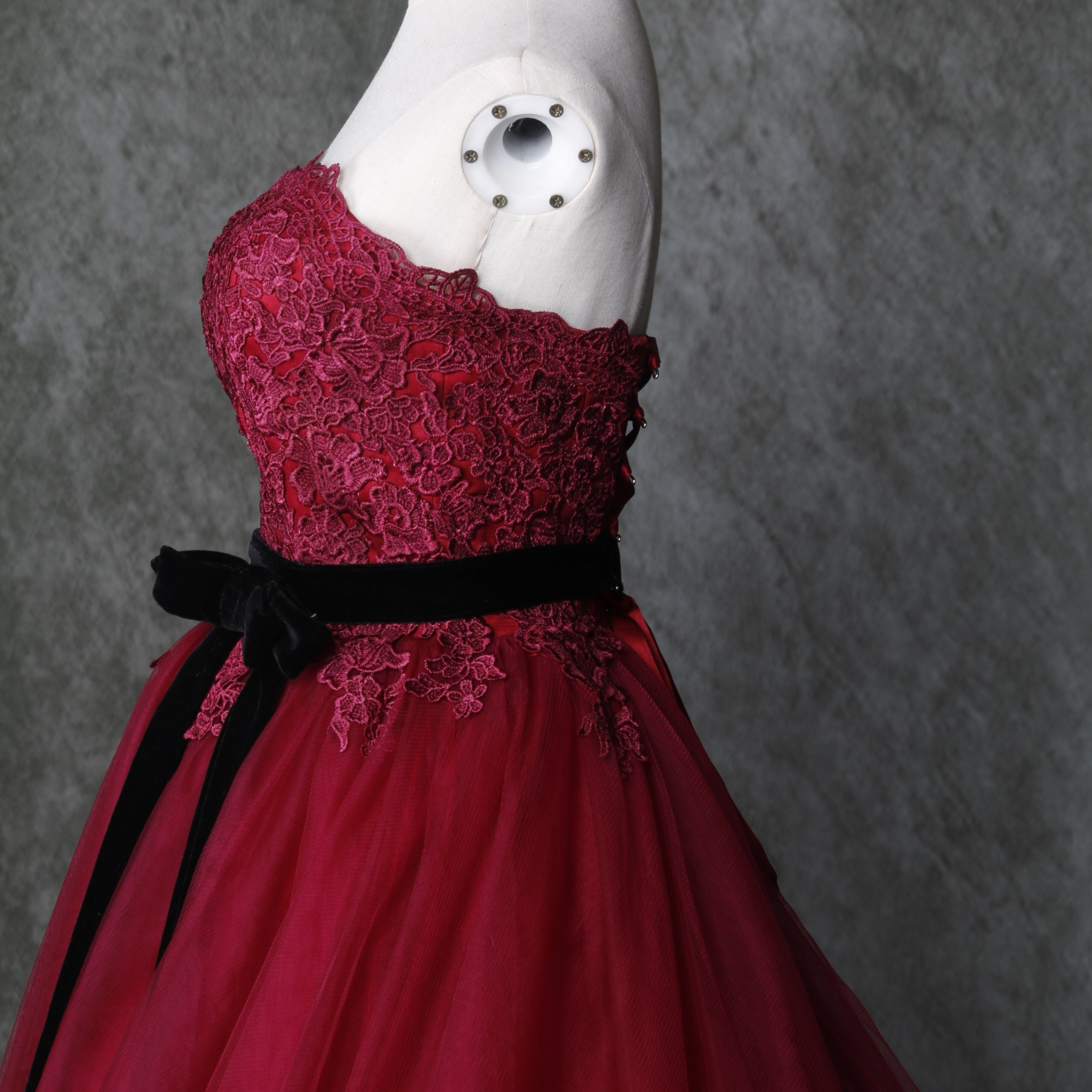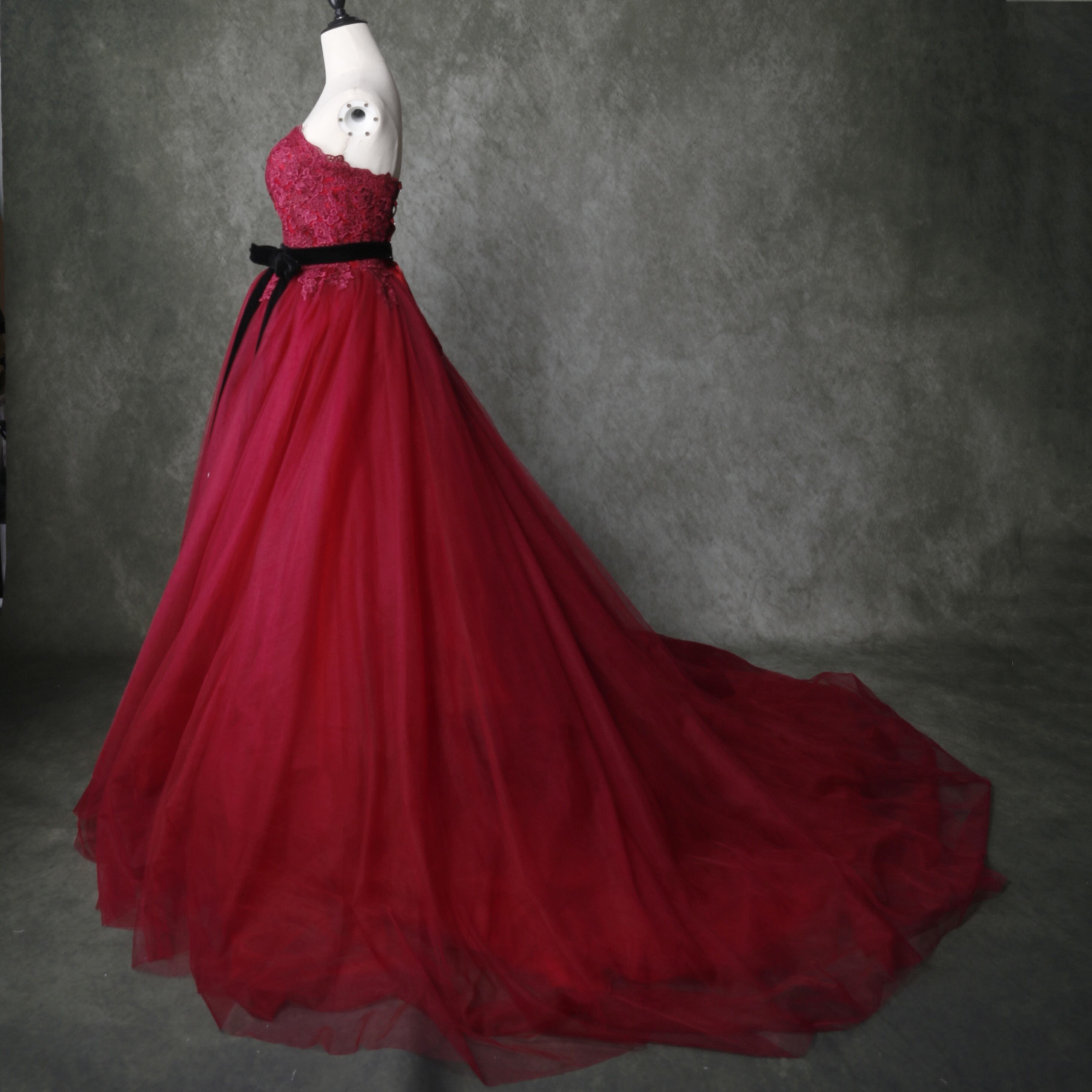 抜群のおしゃれ見え パフスリーブ ベアトップ ワインレッド カラードレス 華やかなトレーン/花嫁/結婚式