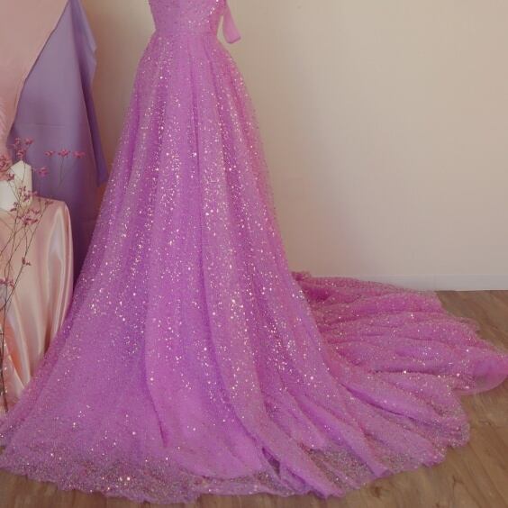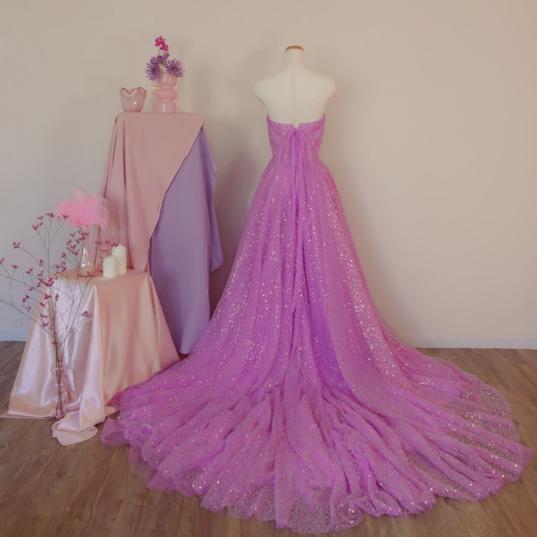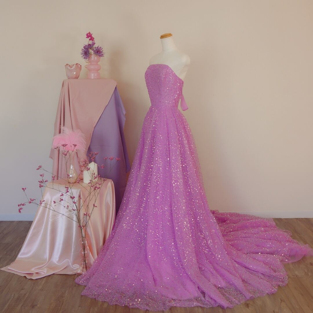 送料無料! パープル カラードレス キラキラグリッターチュール 華やかなトレーン 前撮り結婚式