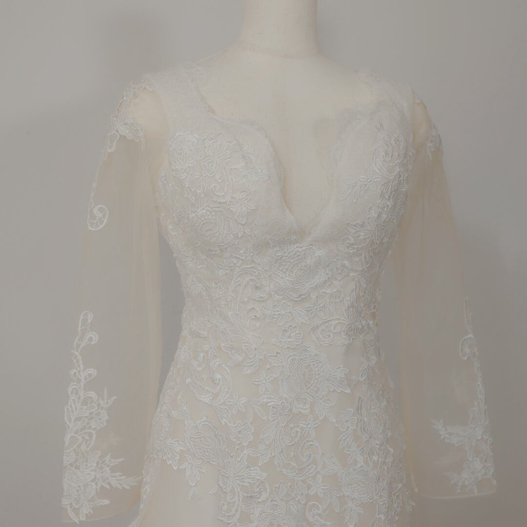 送料無料! 美品! 長袖 ウエディングドレス ロングトレーンソフトマーメイドライン /結婚式/披露宴
