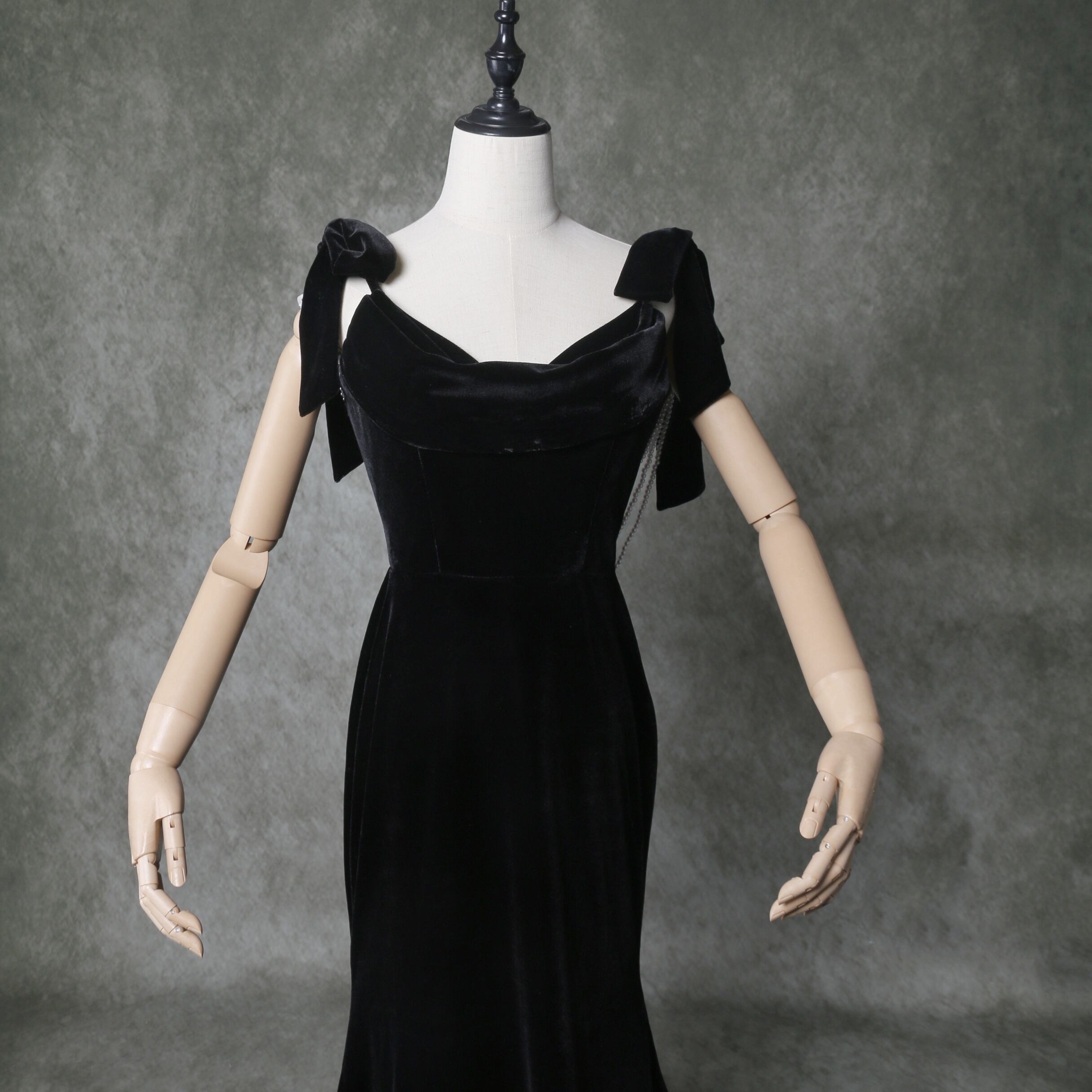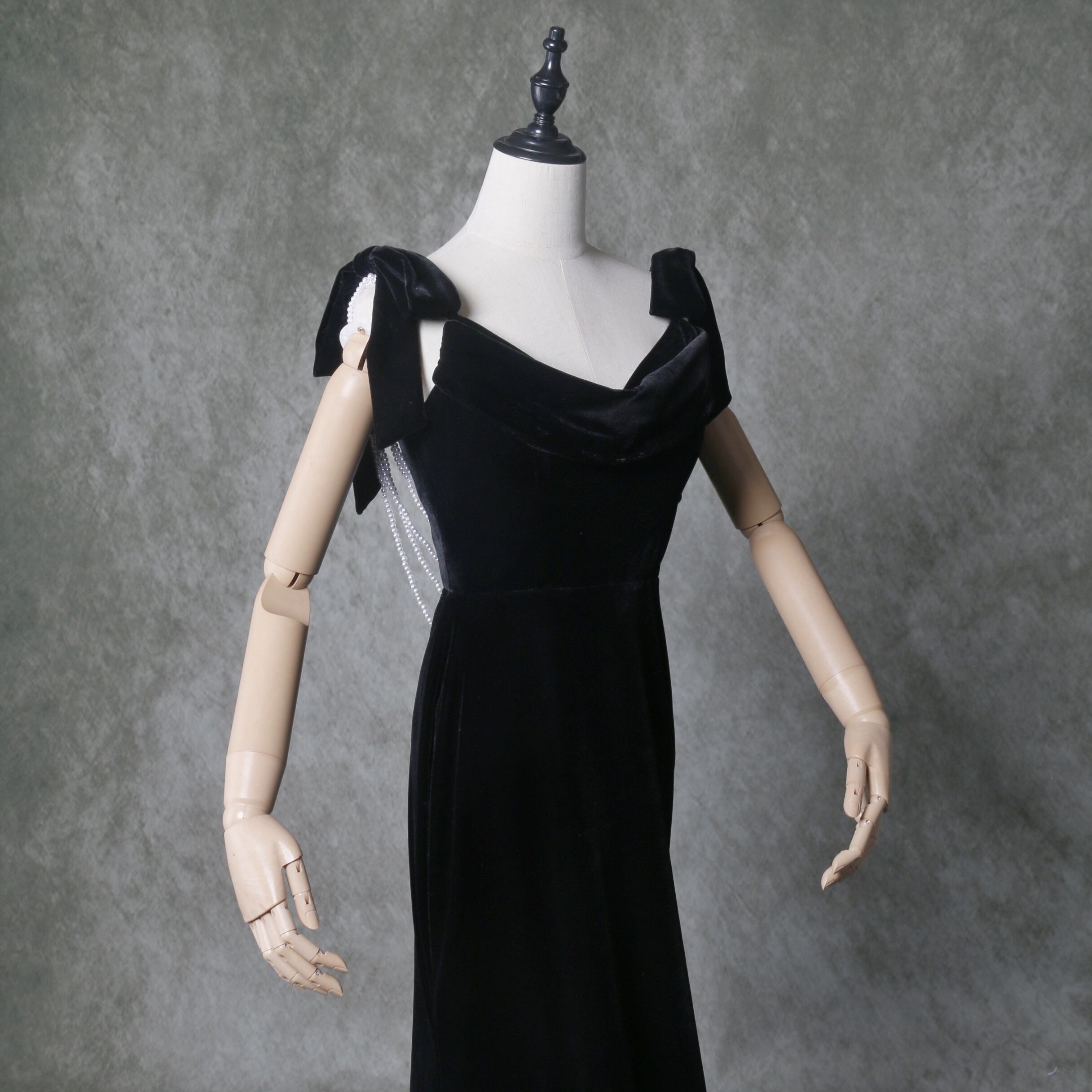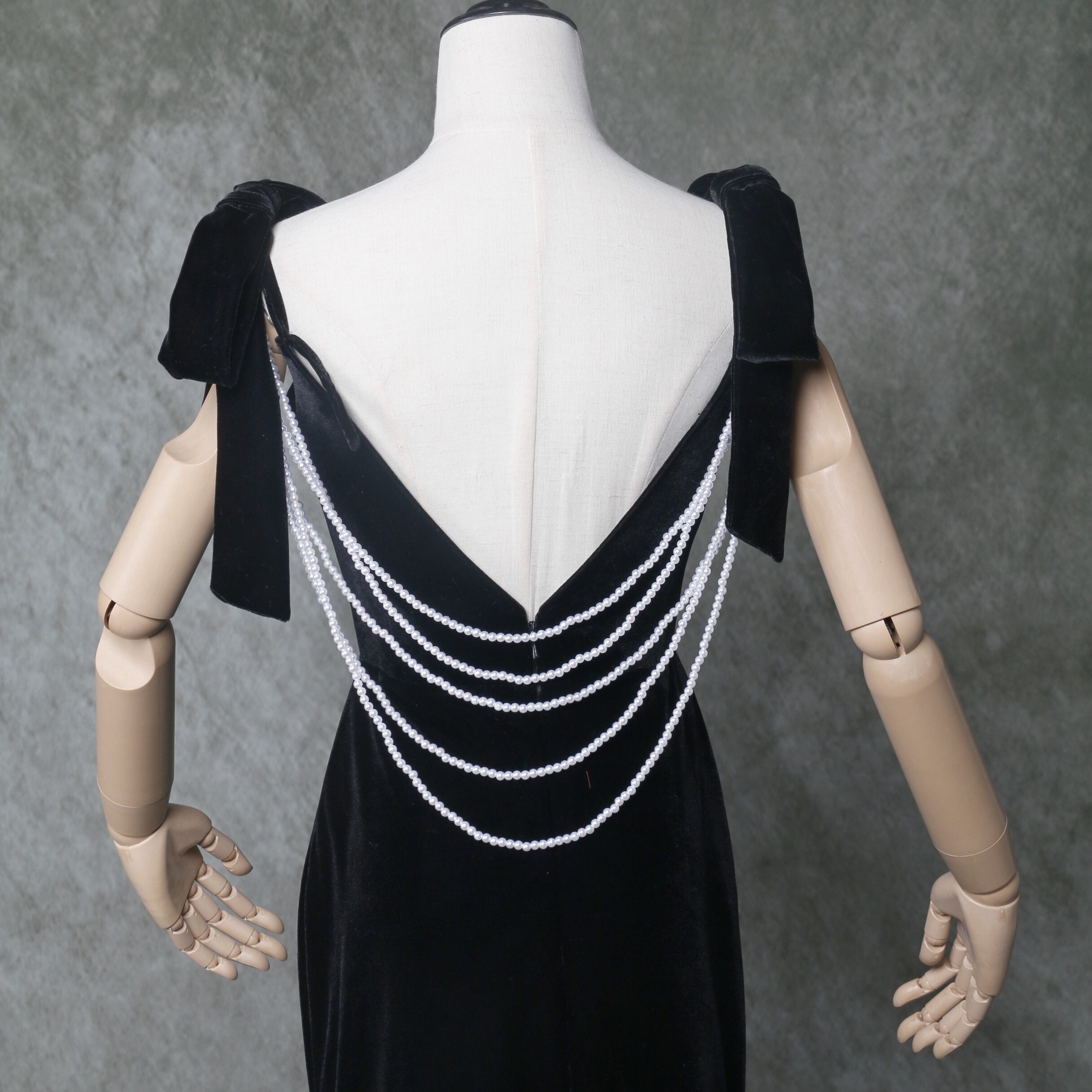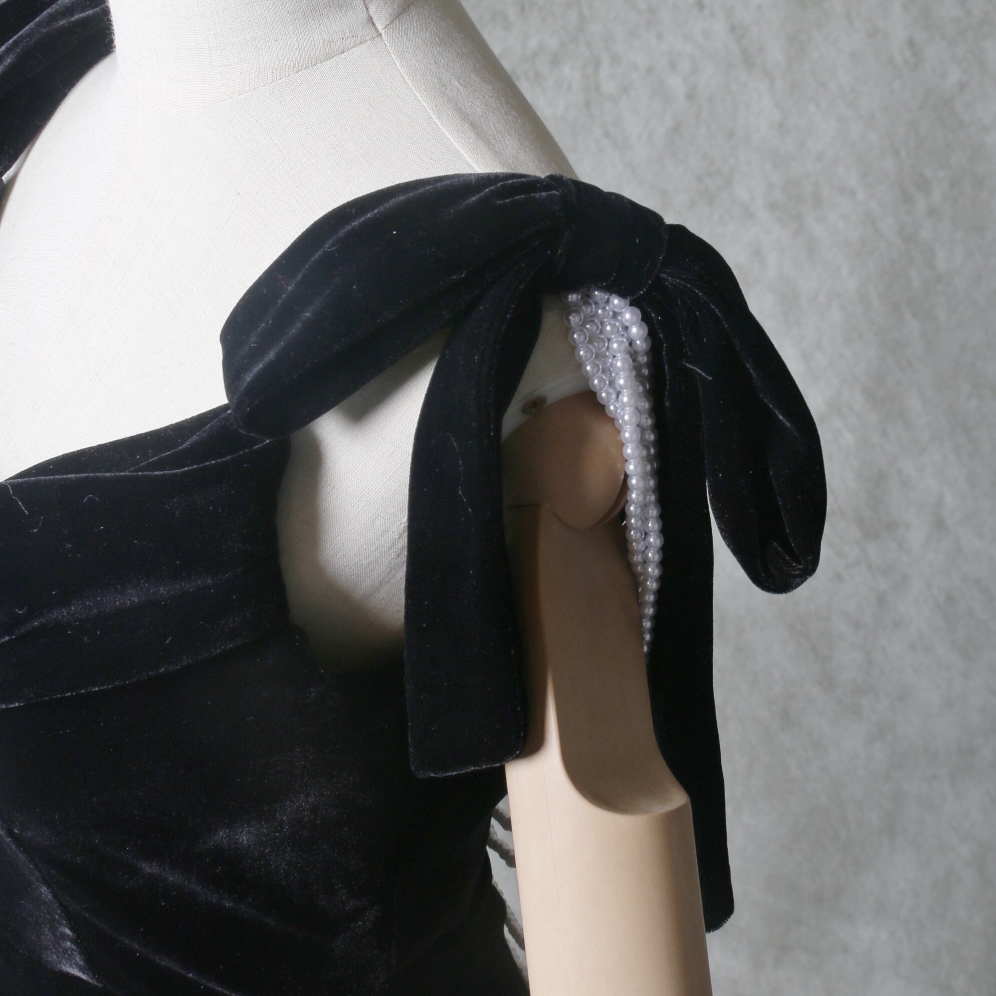 優雅なシルエット! オードリー風!パーティードレス 黒 パール 高級ベロア マーメイドライン 背中見せ シアーな美しさ