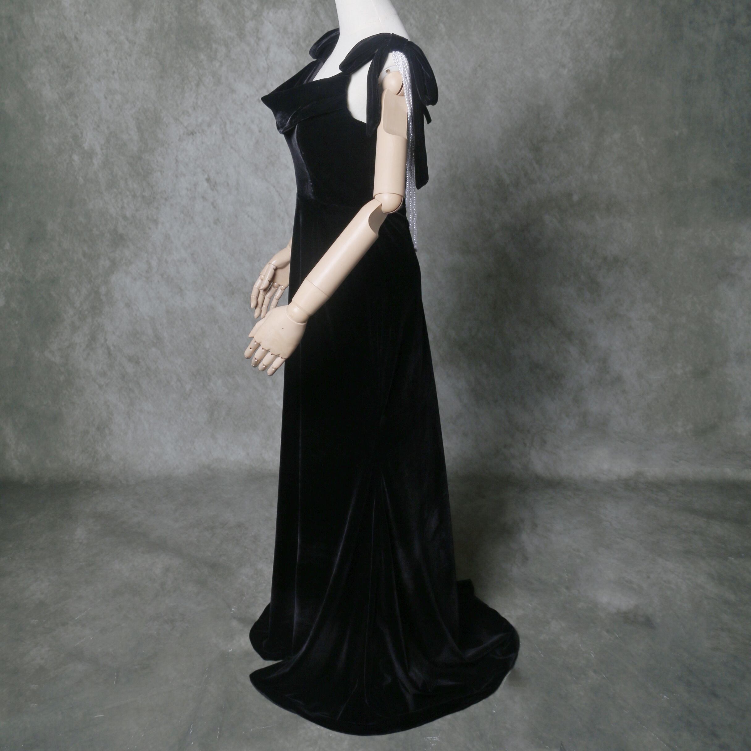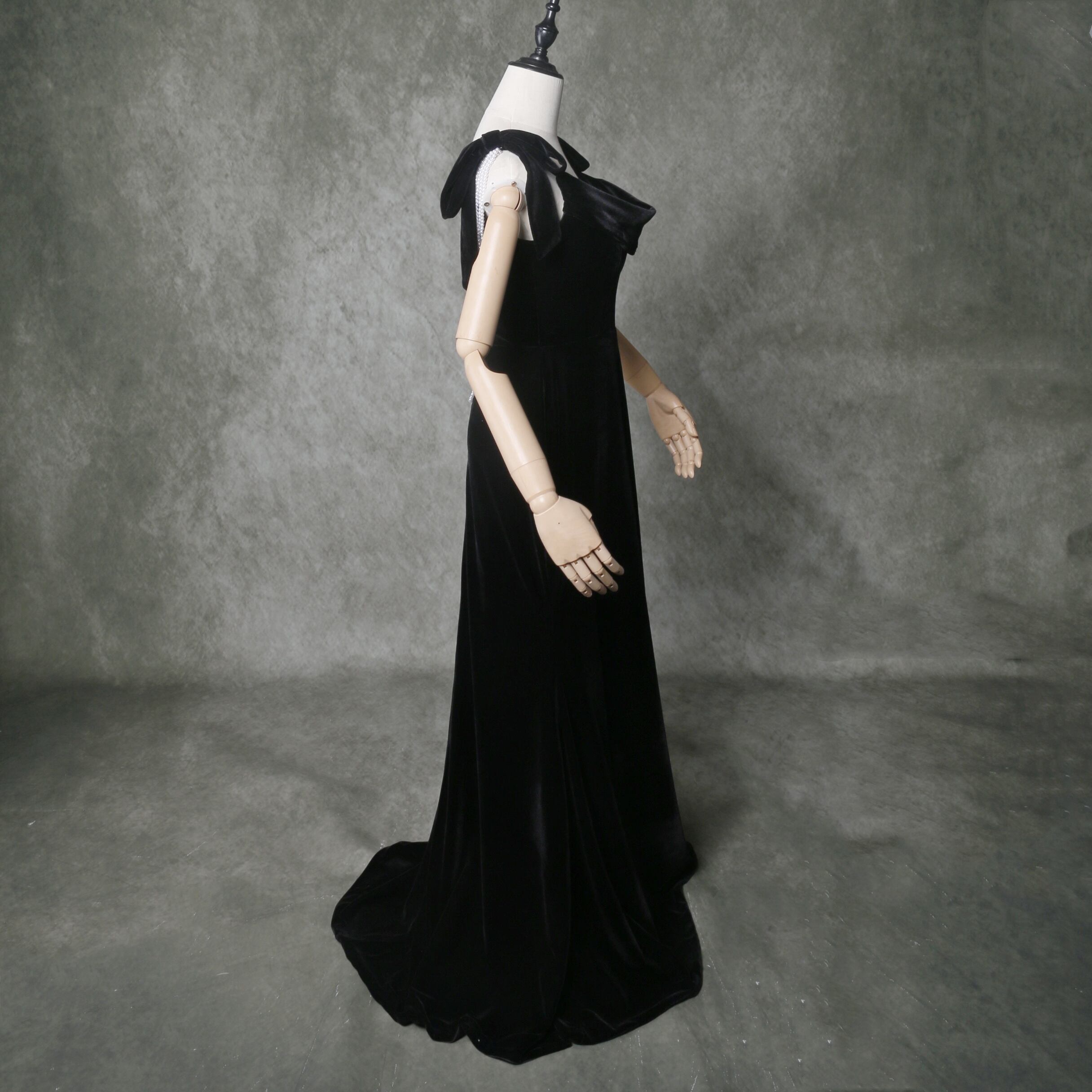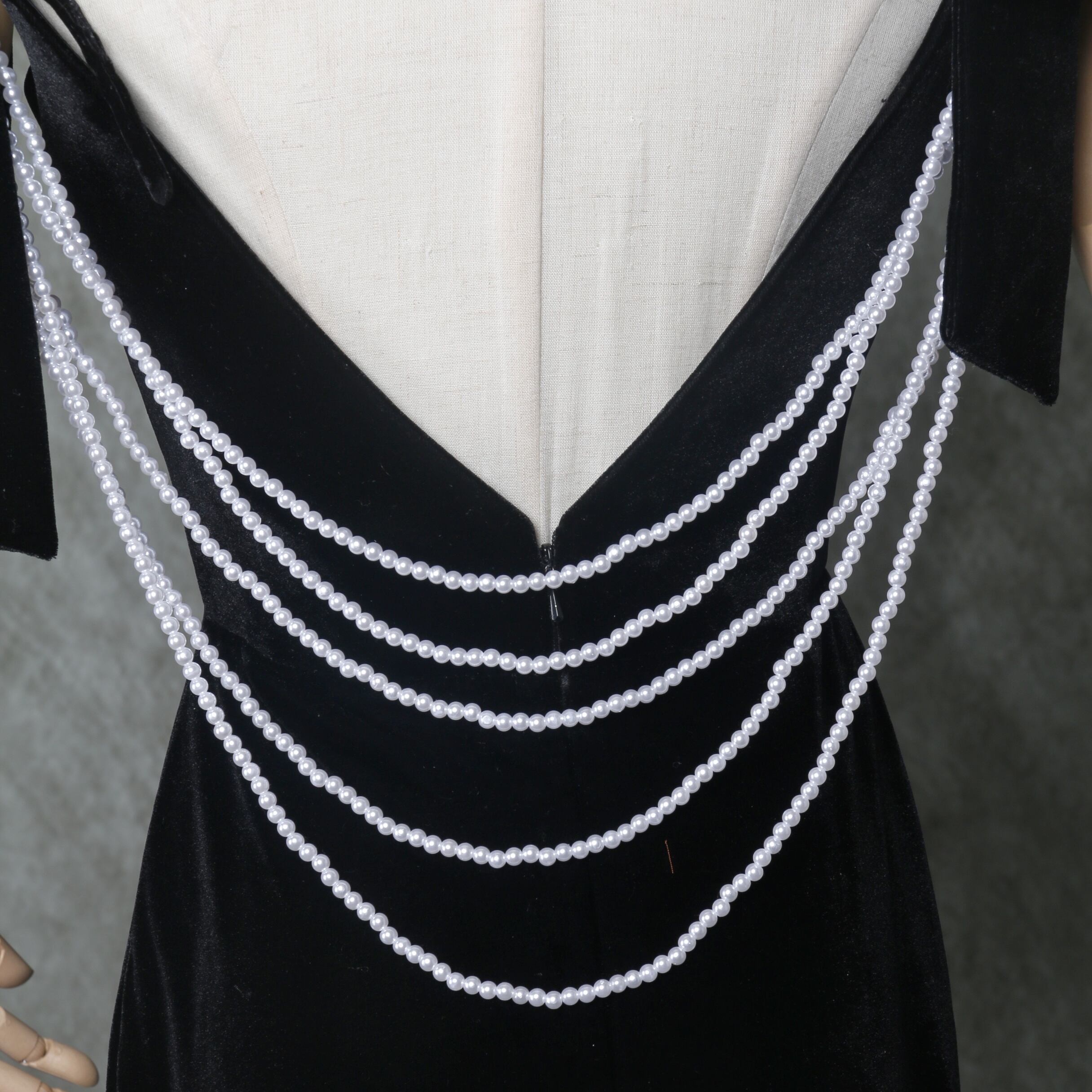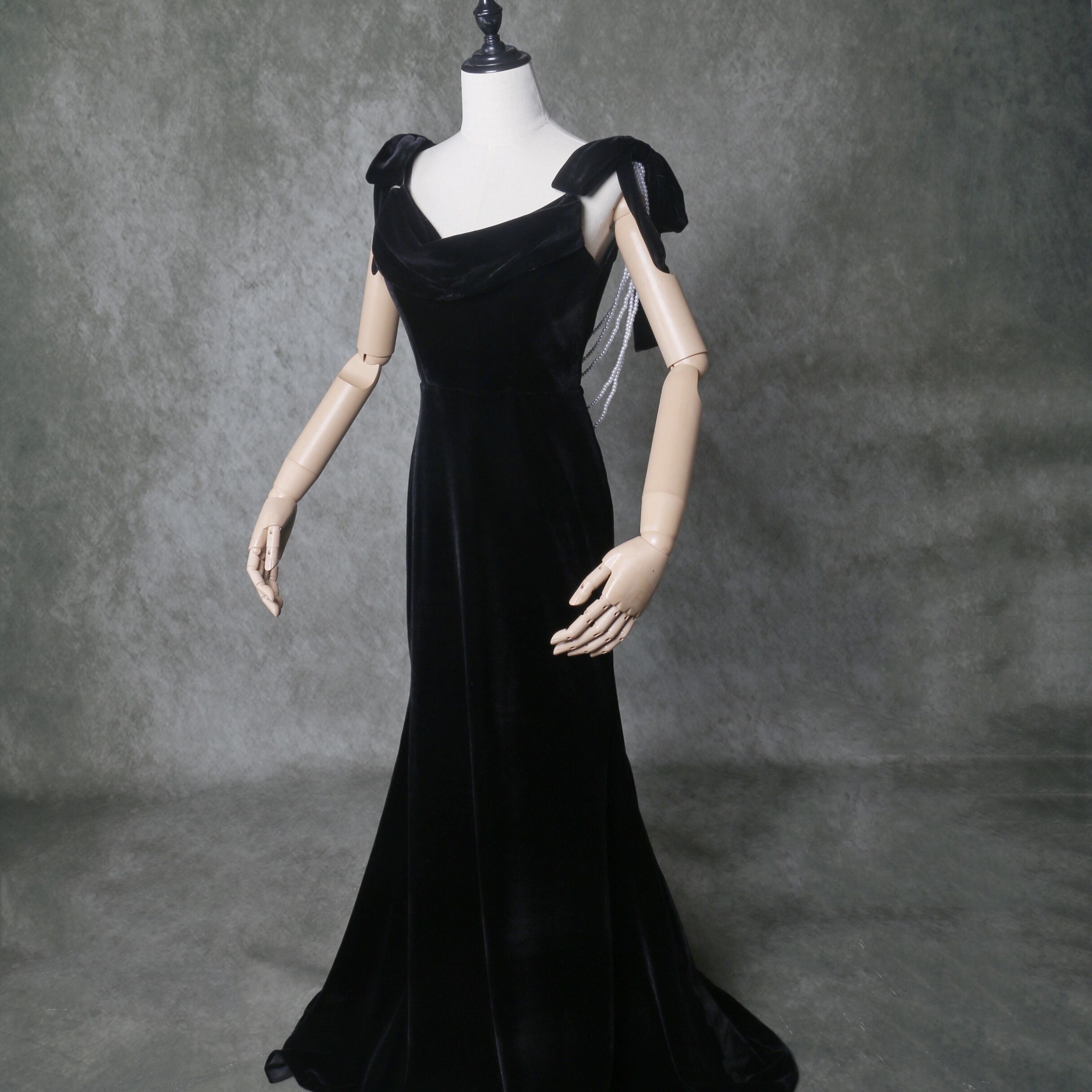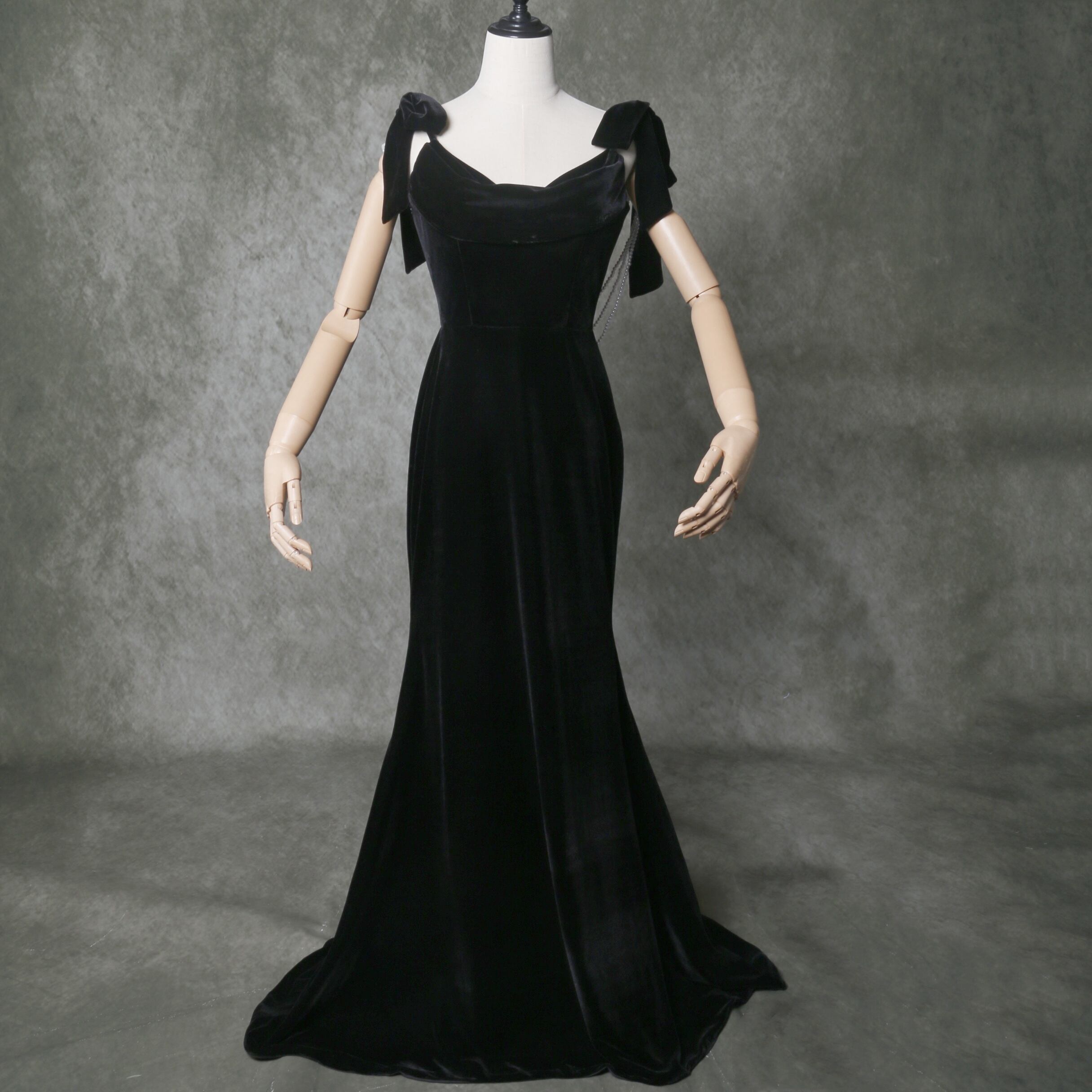 優雅なシルエット! オードリー風!パーティードレス 黒 パール 高級ベロア マーメイドライン 背中見せ シアーな美しさ