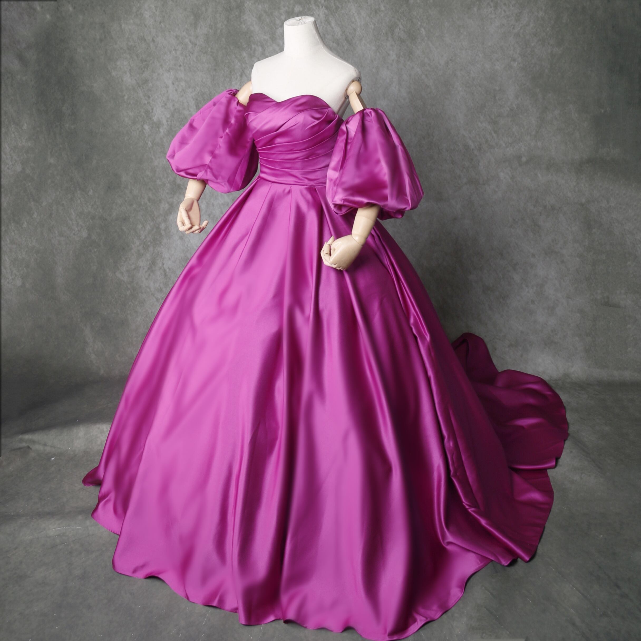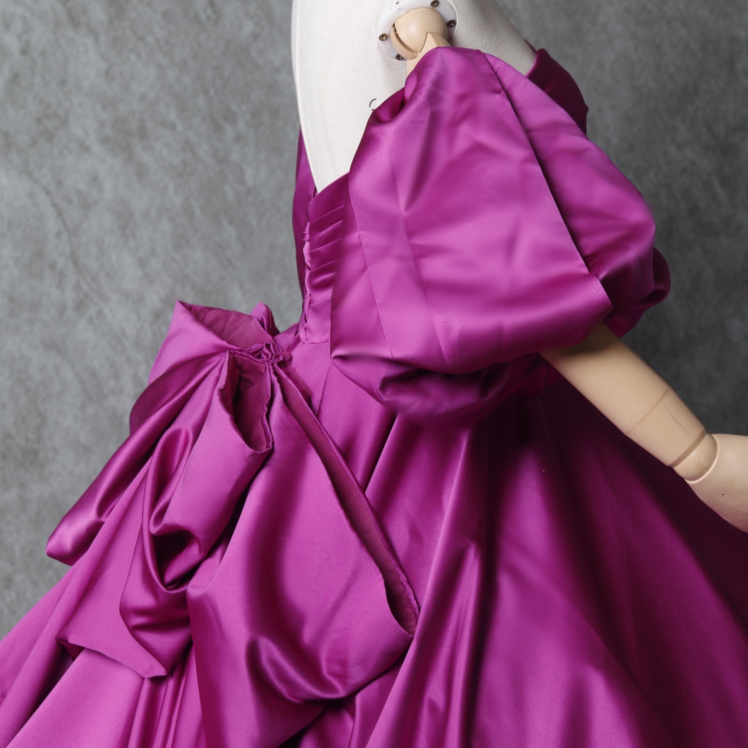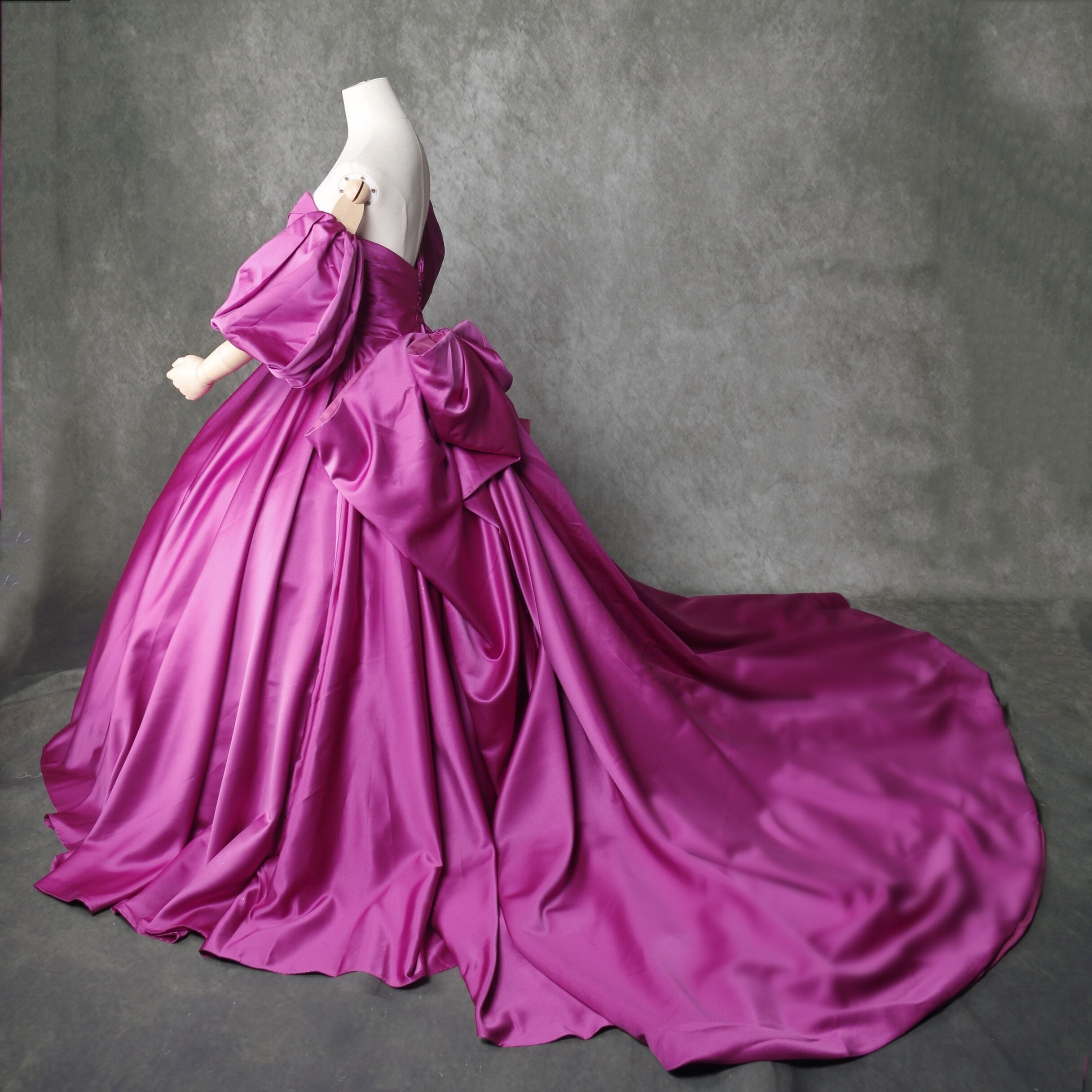 送料無料! 人気上昇!ローズピンク カラードレス ふっくら柔らかなバックリボン 取り外し袖 華やかなトレーン パーティードレス お色直し