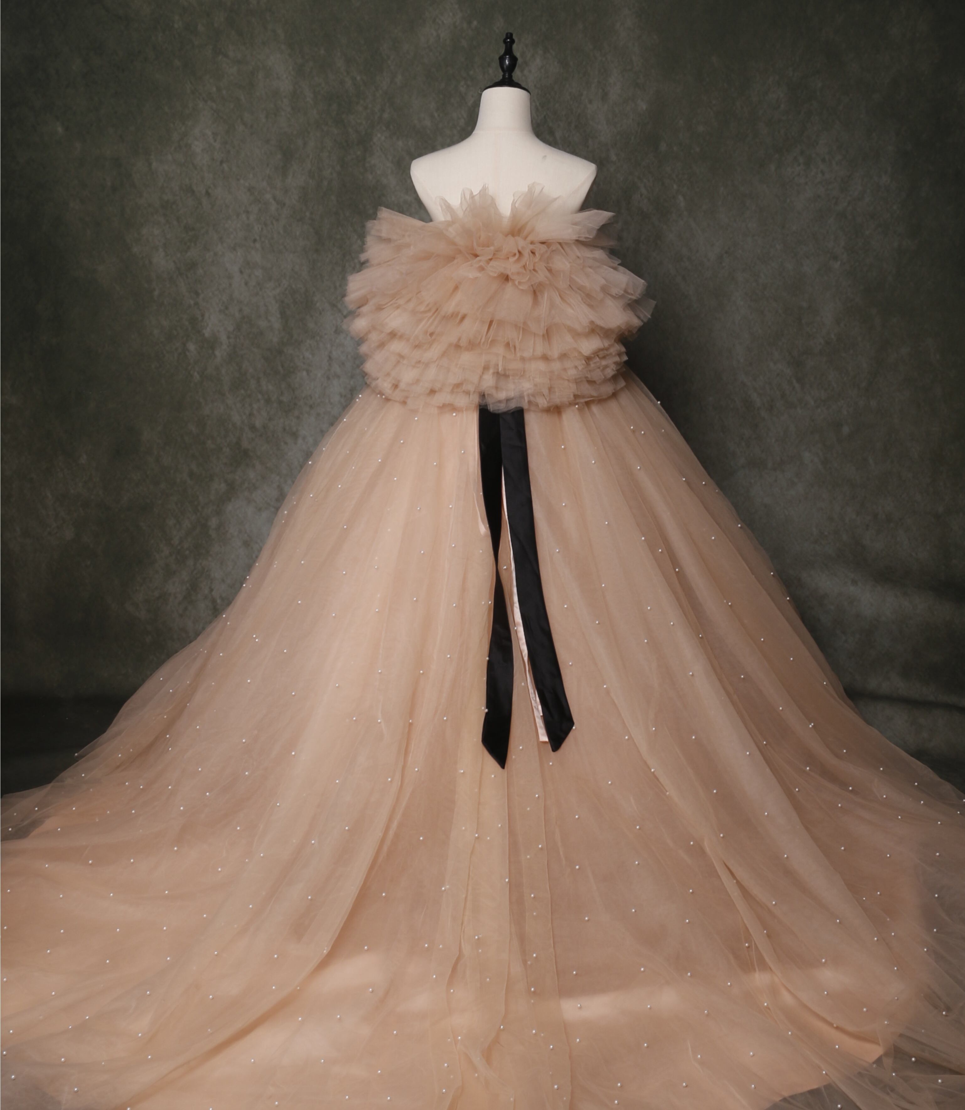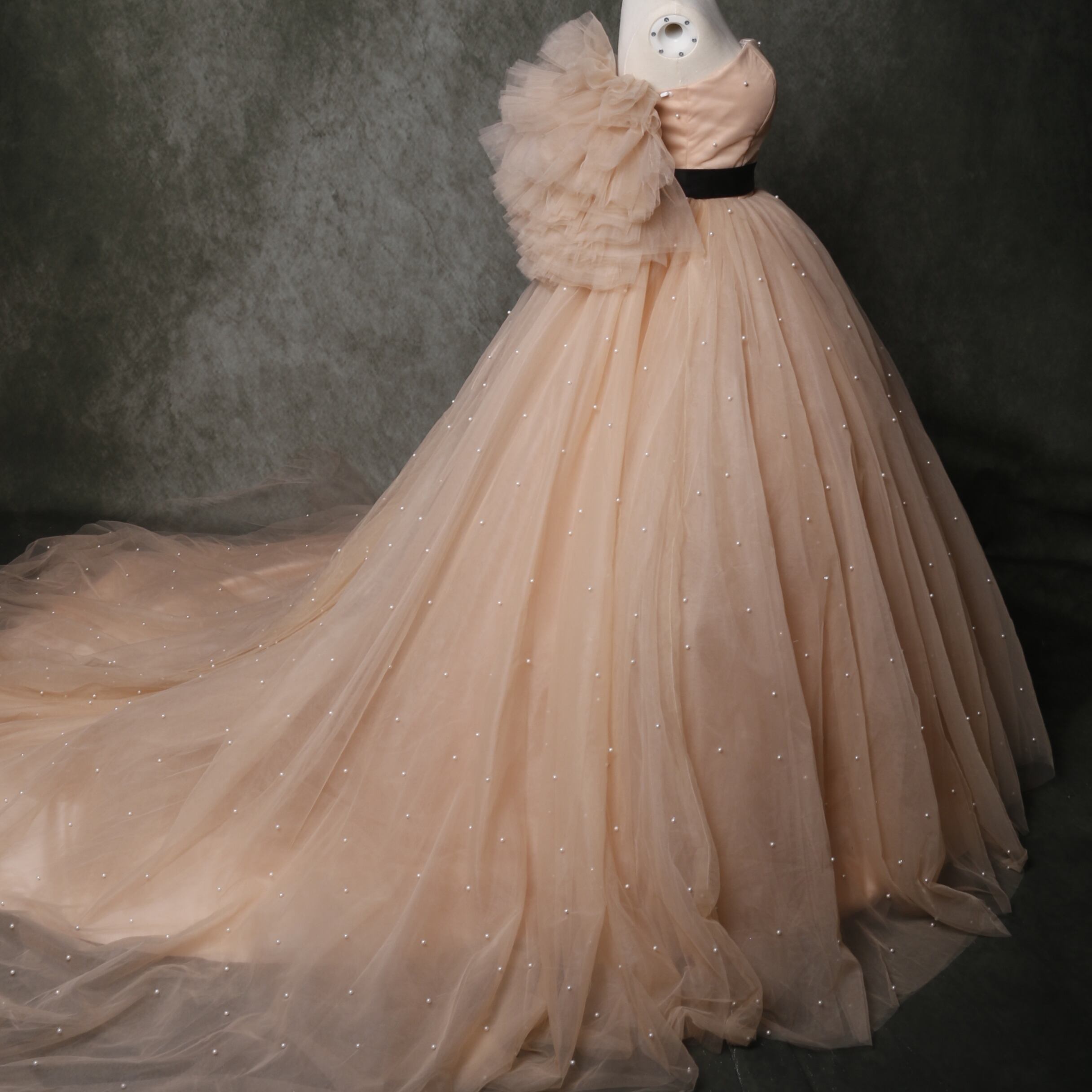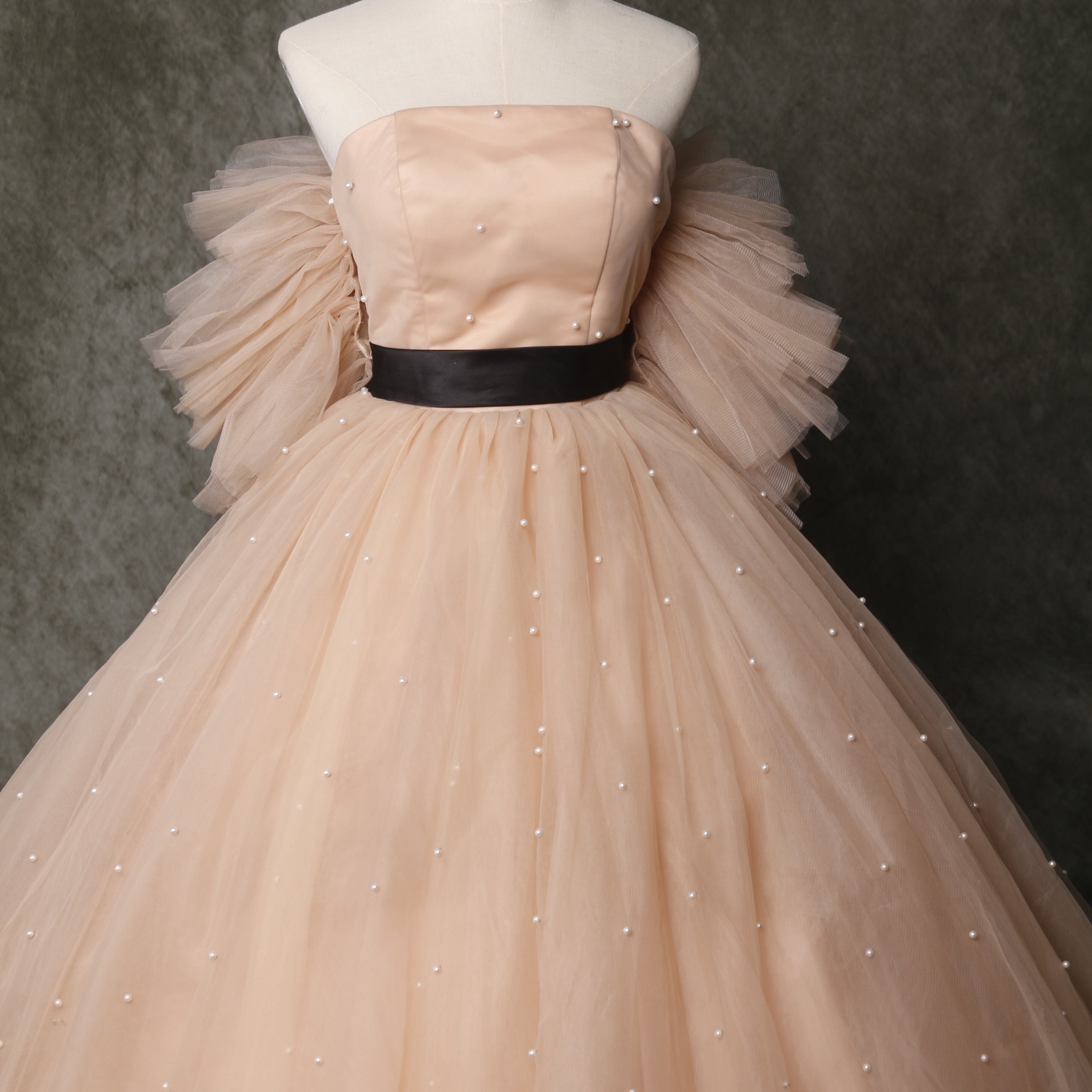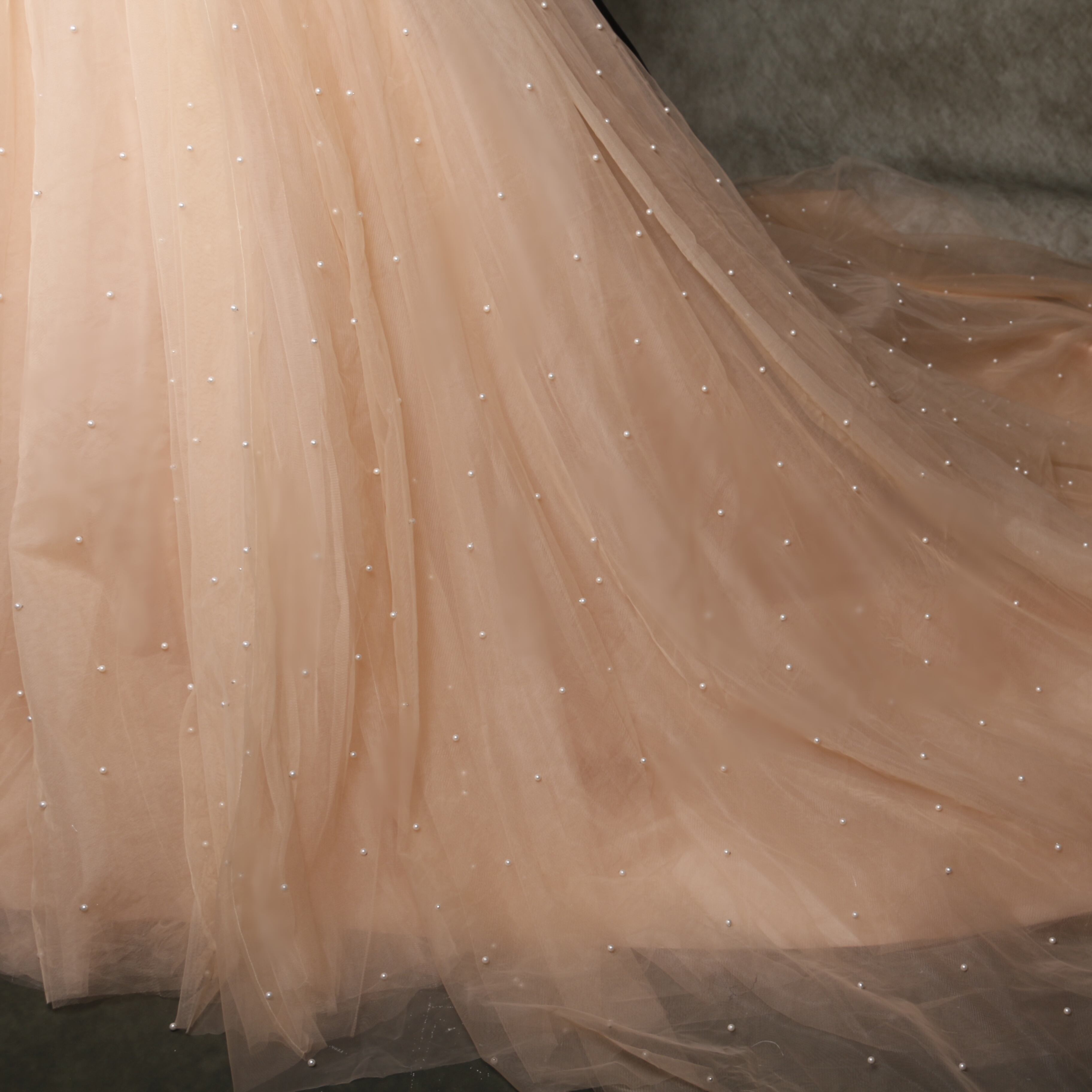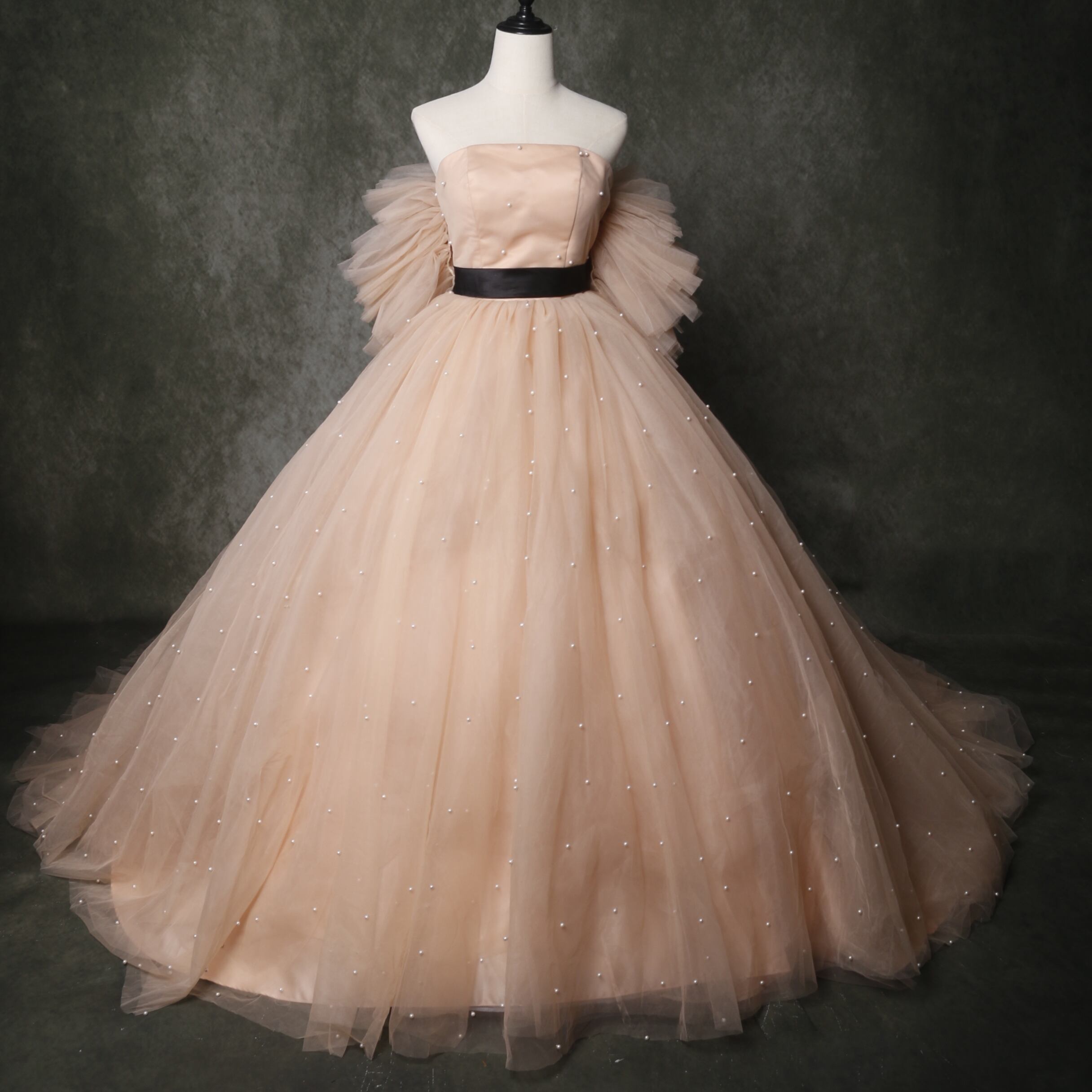 送料無料! 輝きな光彩を放つ シャンパン色 パール キャミソール カラードレス 可愛い 華やかなトレーン/前撮り/結婚式/