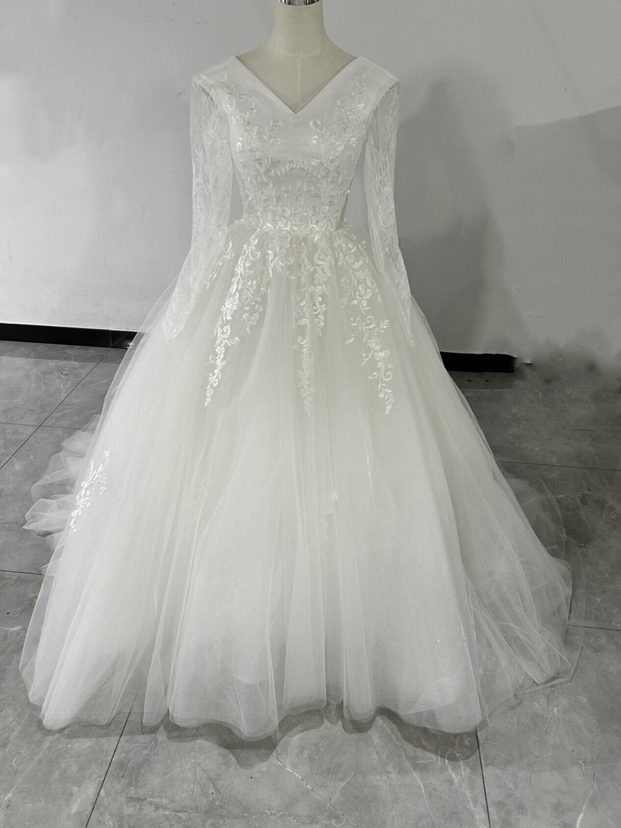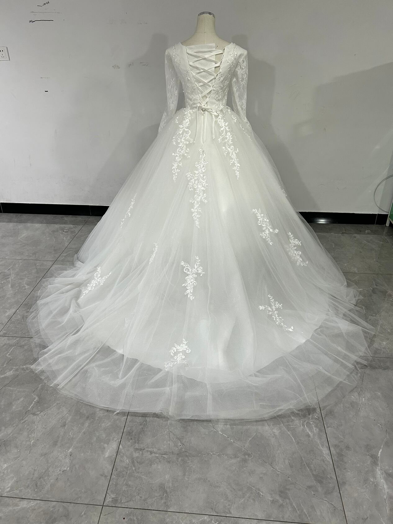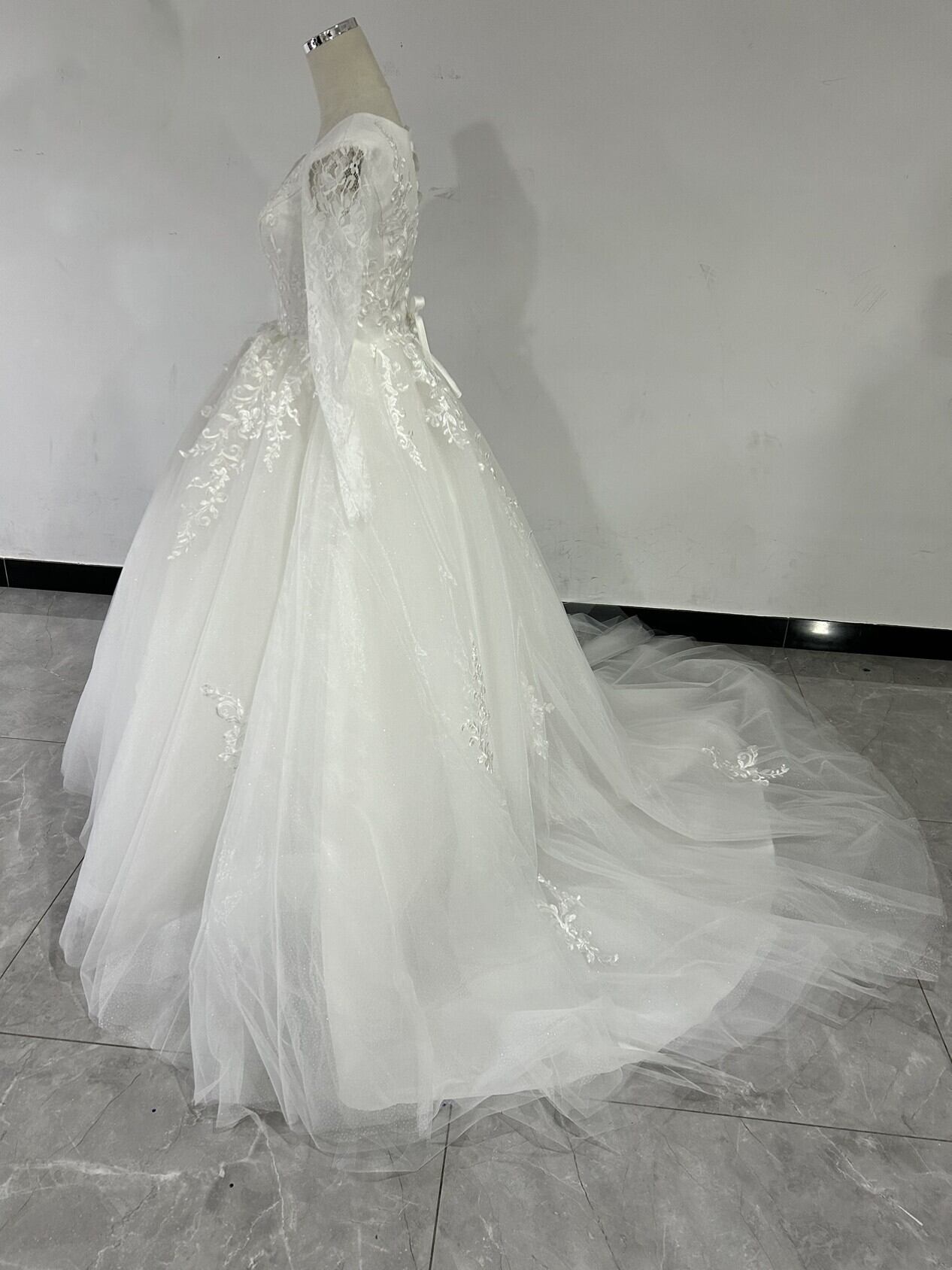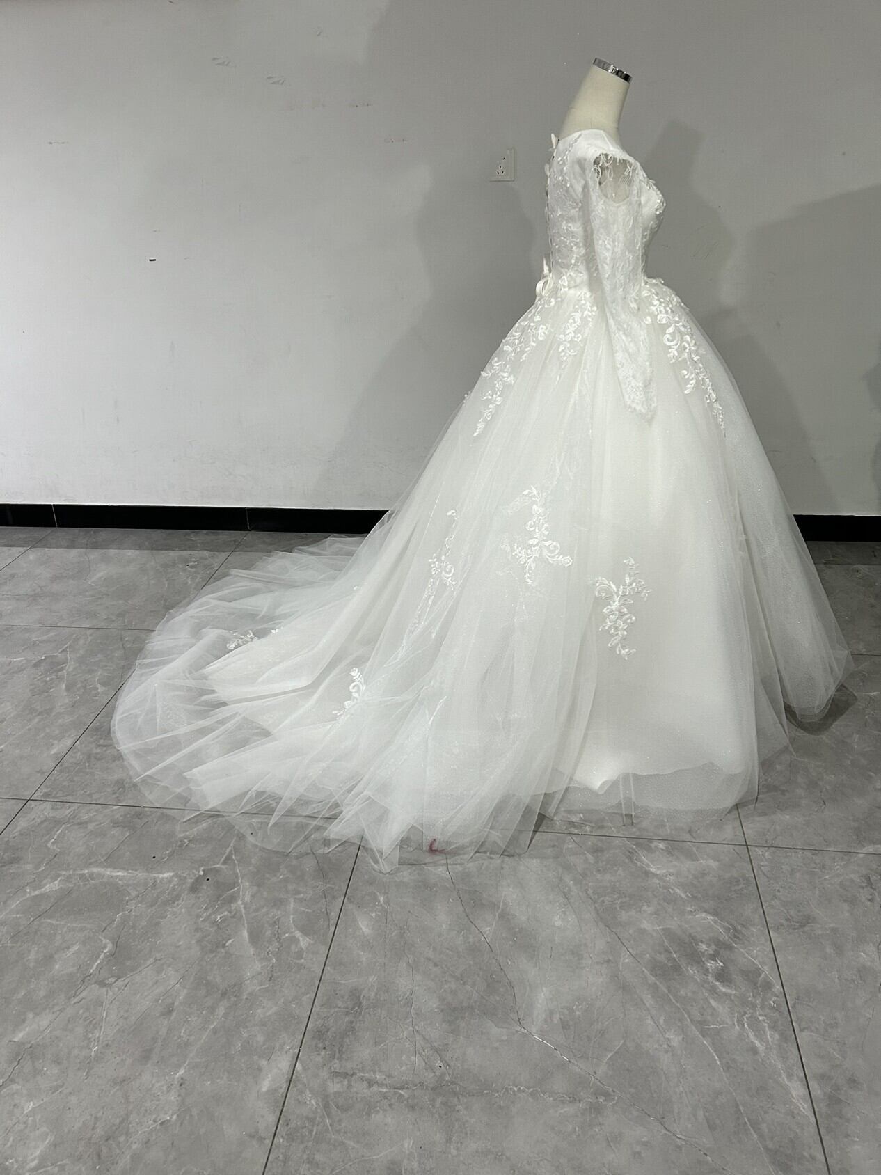 送料無料! 上品!ウエディングドレス 上品透け袖 魅惑の花レース編み上げ 華やかなトレーン プリンセスライン 結婚式/