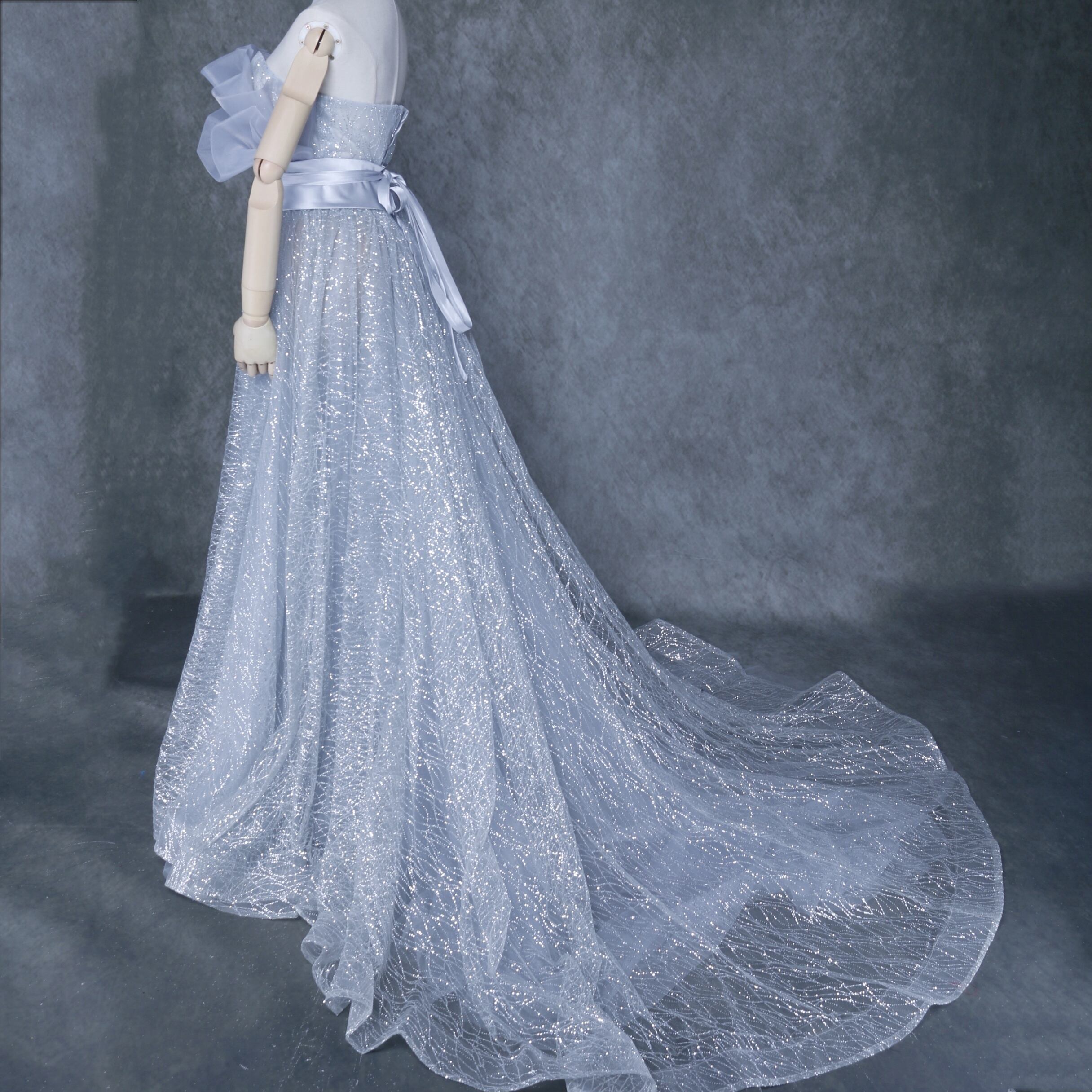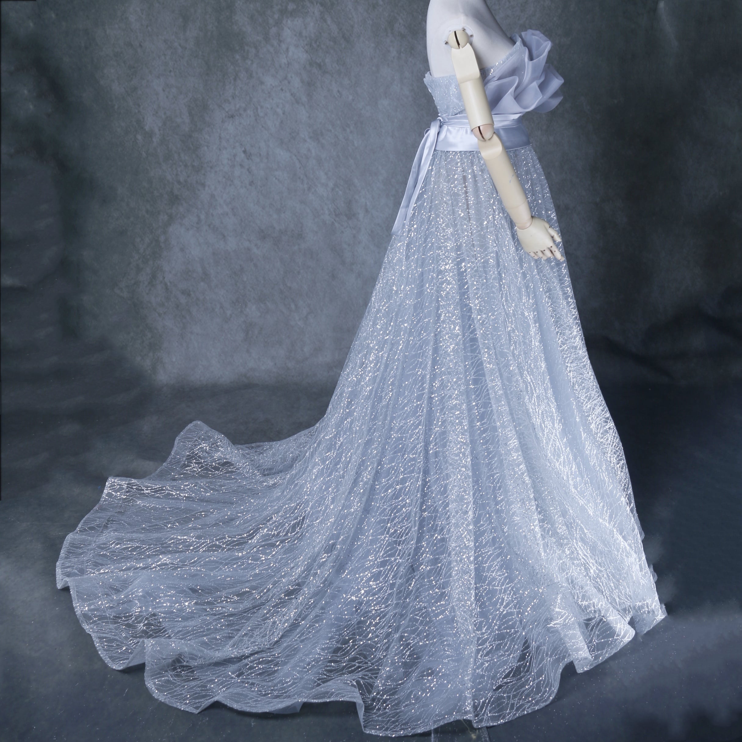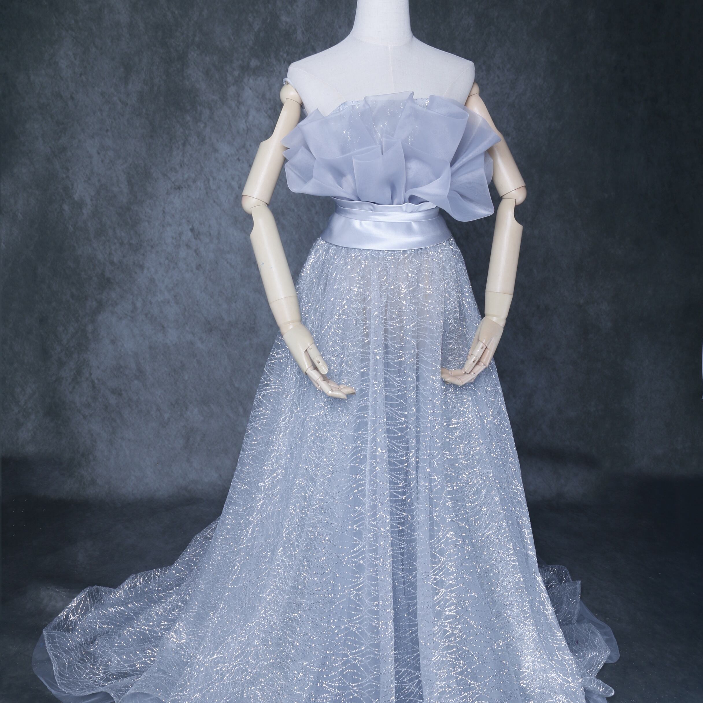 送料無料! 輝きな光彩を放つ シルバー オフショルダー キラキラグリッ カラードレス オーバースカート 結婚式/