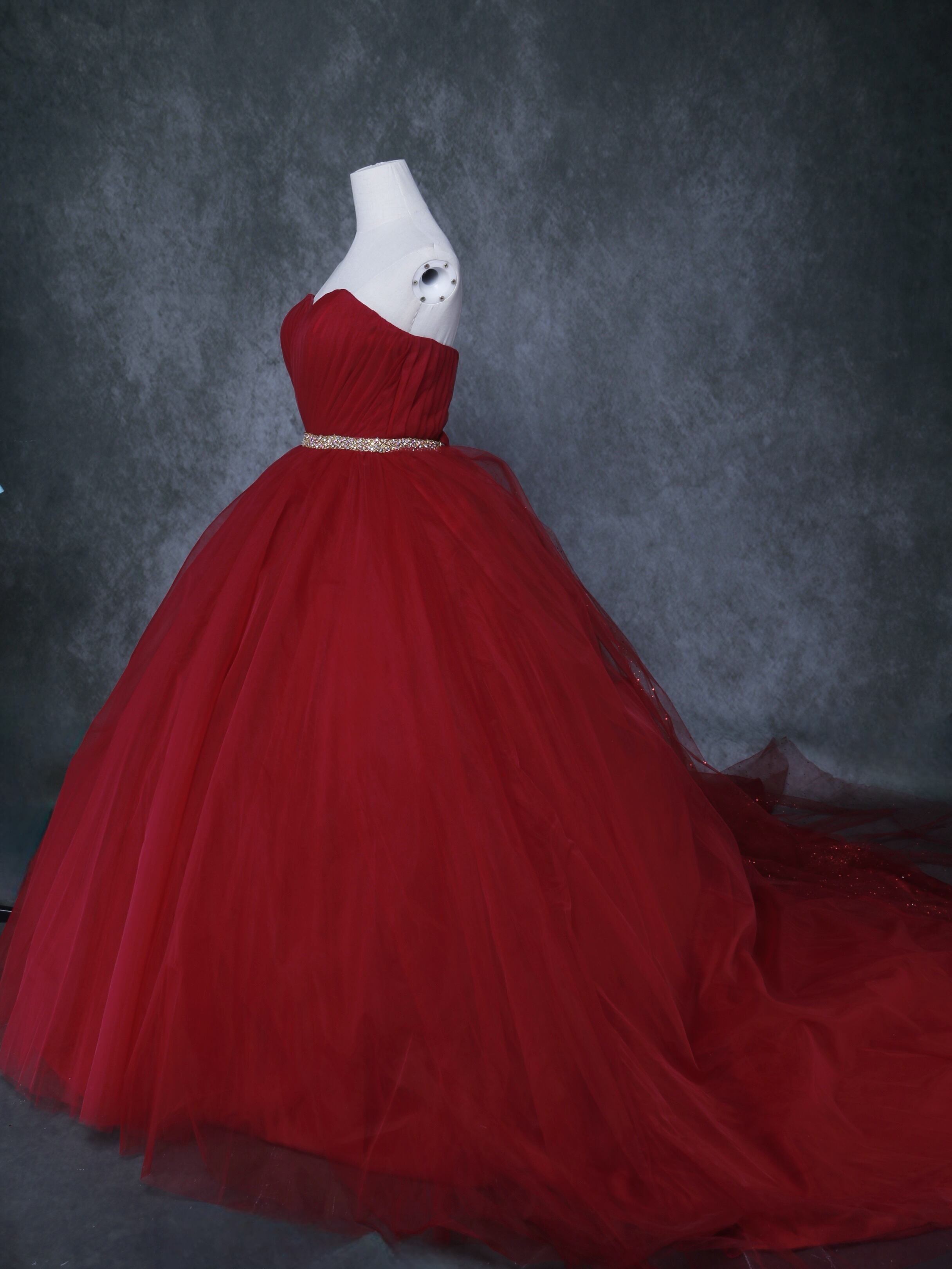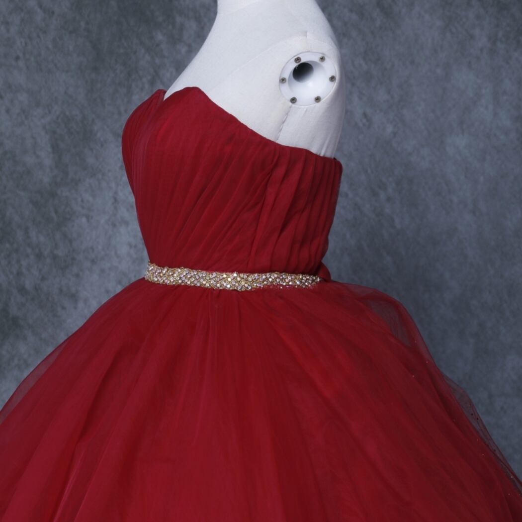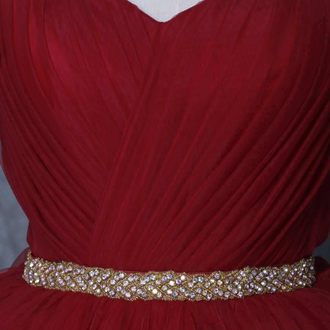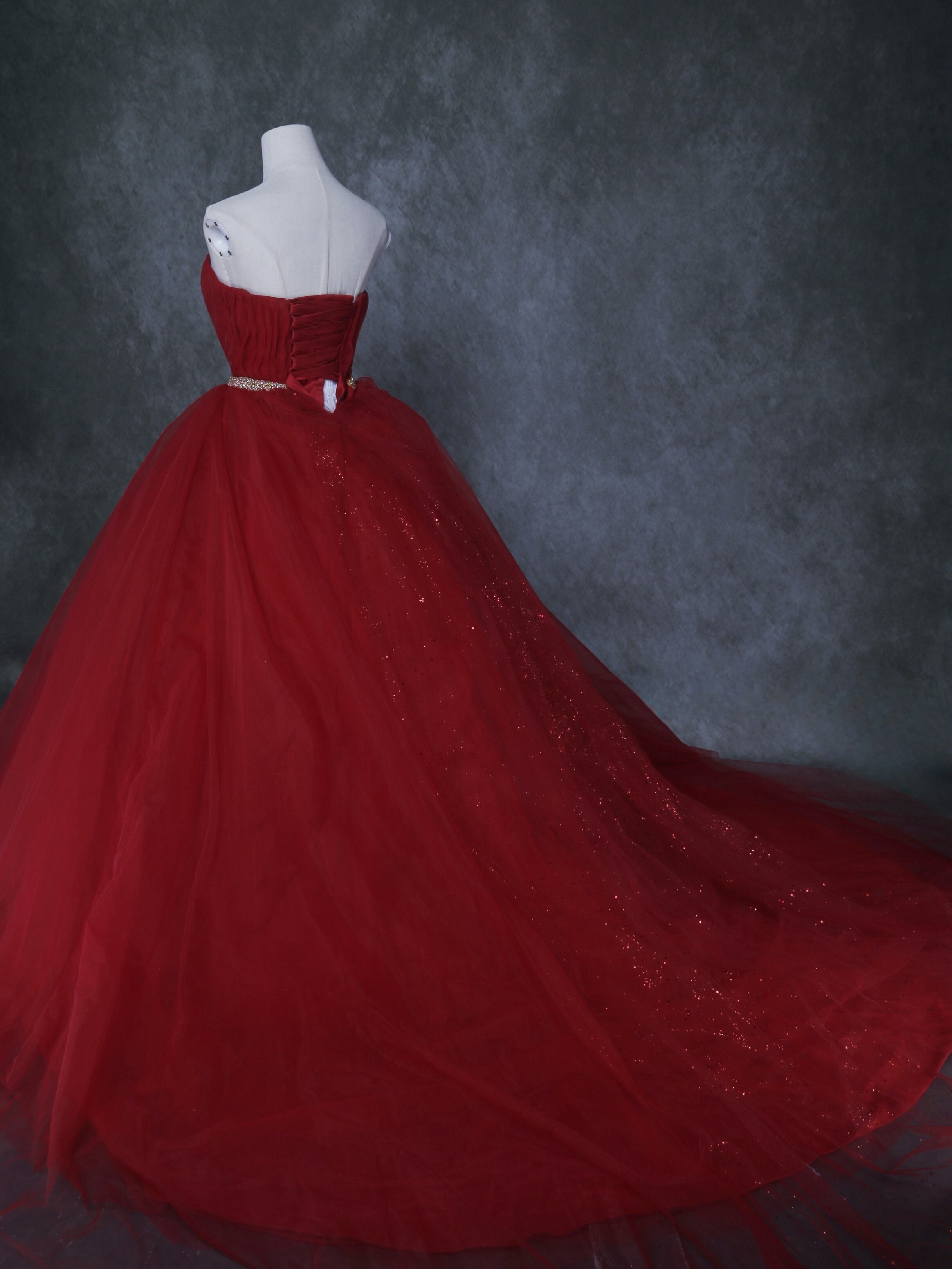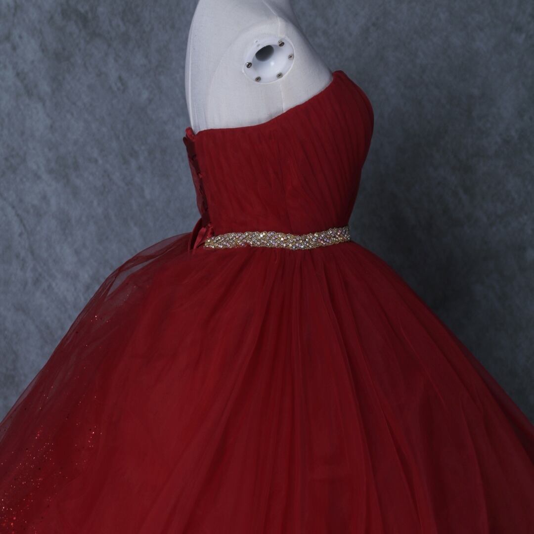 送料無料! 輝きな光彩を放つ 赤 キラキラグリッターチュール カラードレス 華やかなトレーン 結婚式/