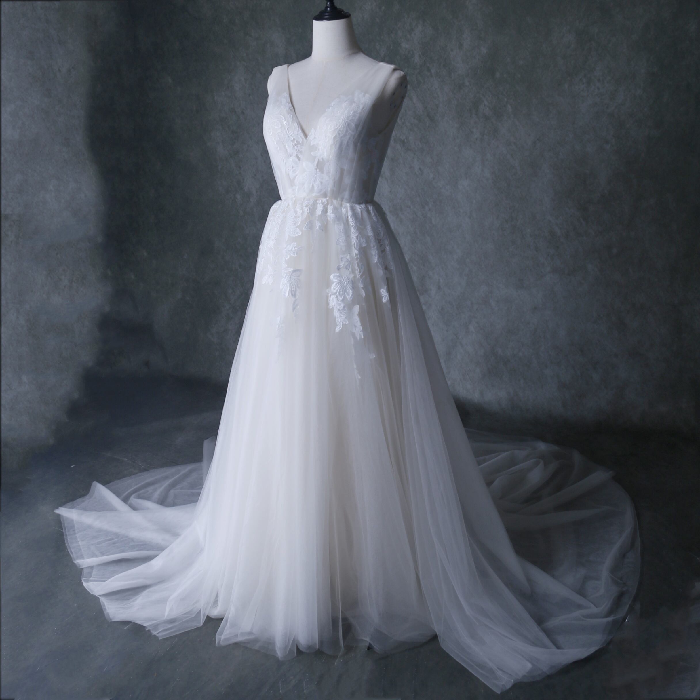 送料無料! 輝きな光彩を放つ アイボリー 上品レース ウエディングドレス 華やかなトレーン2次会 前撮り 花嫁 結婚式/