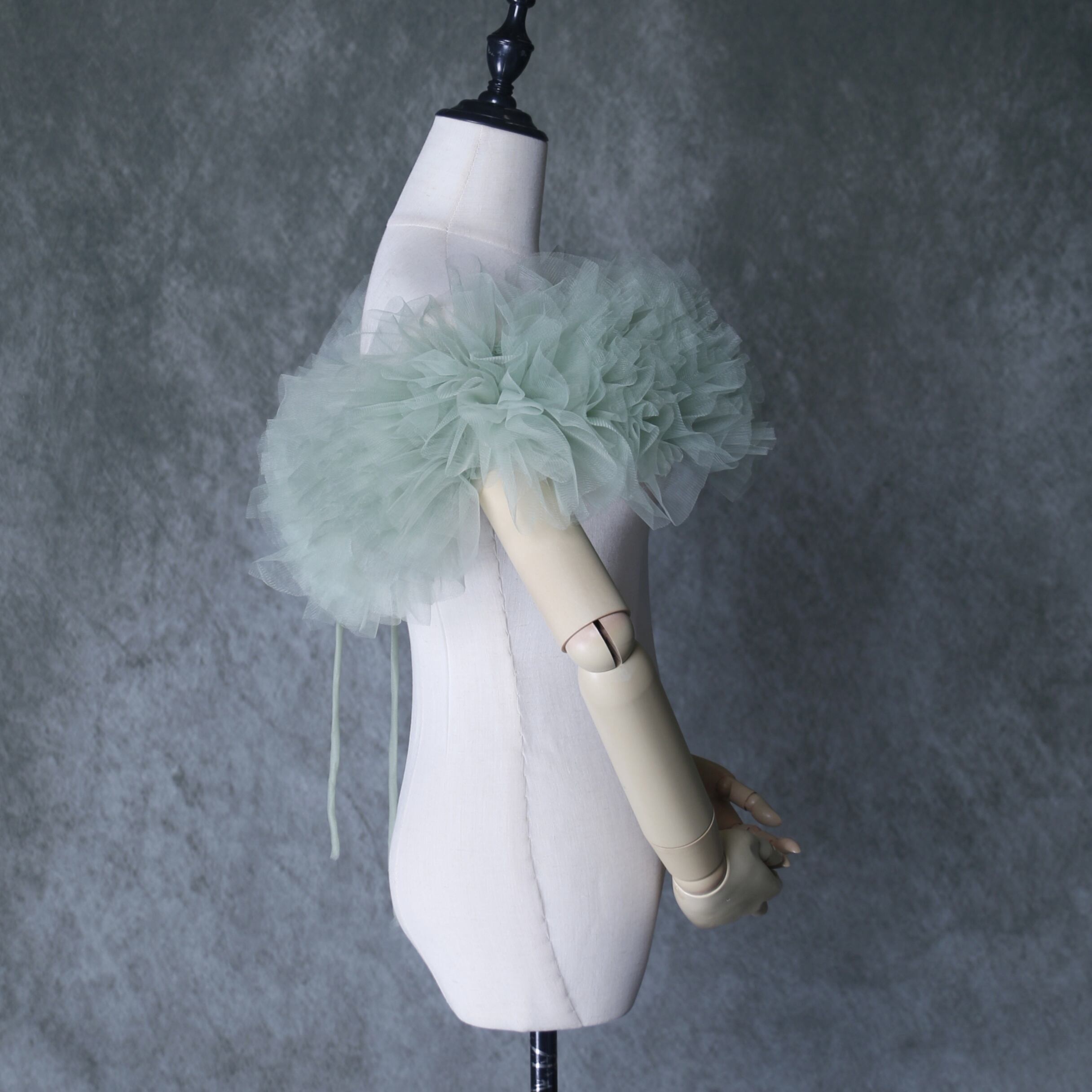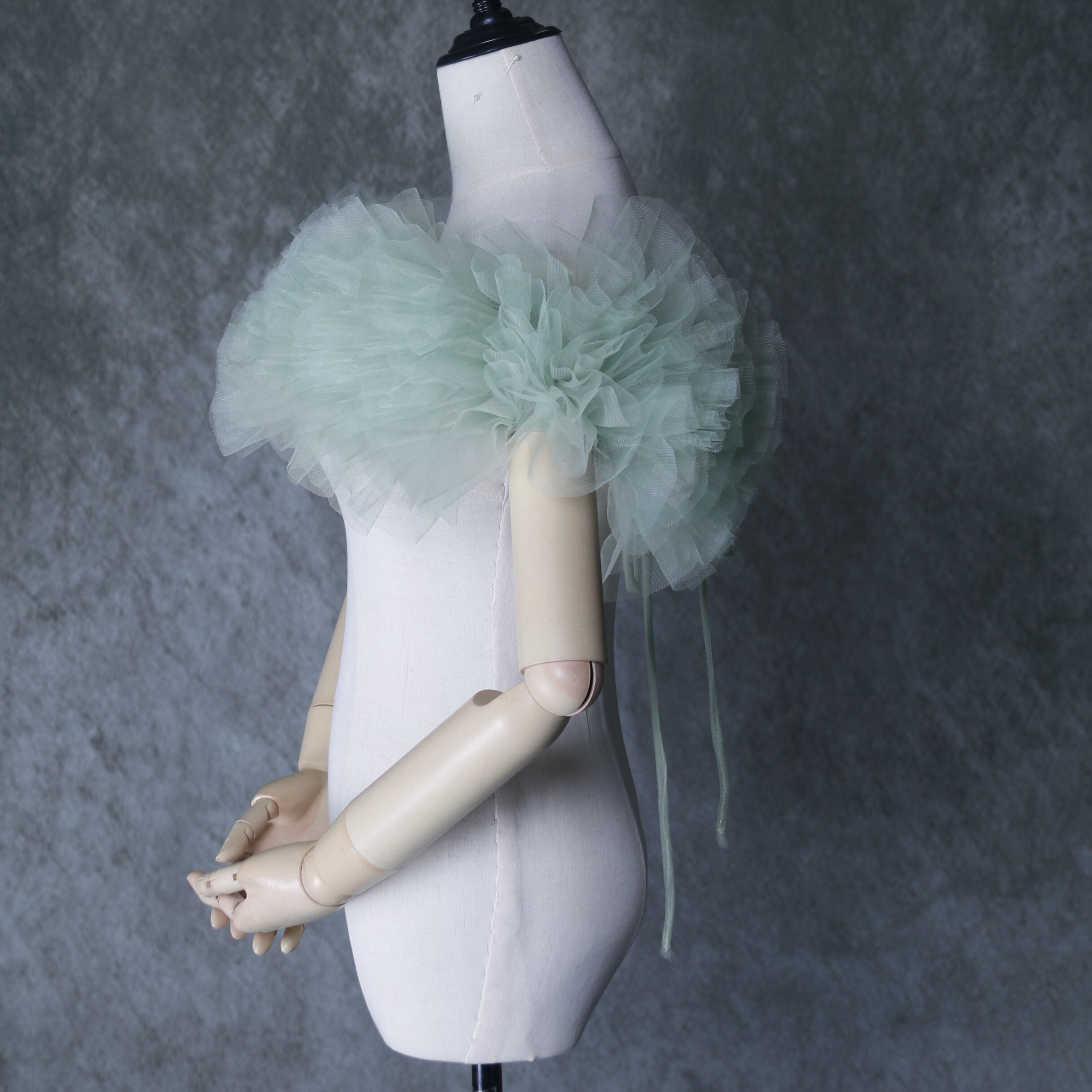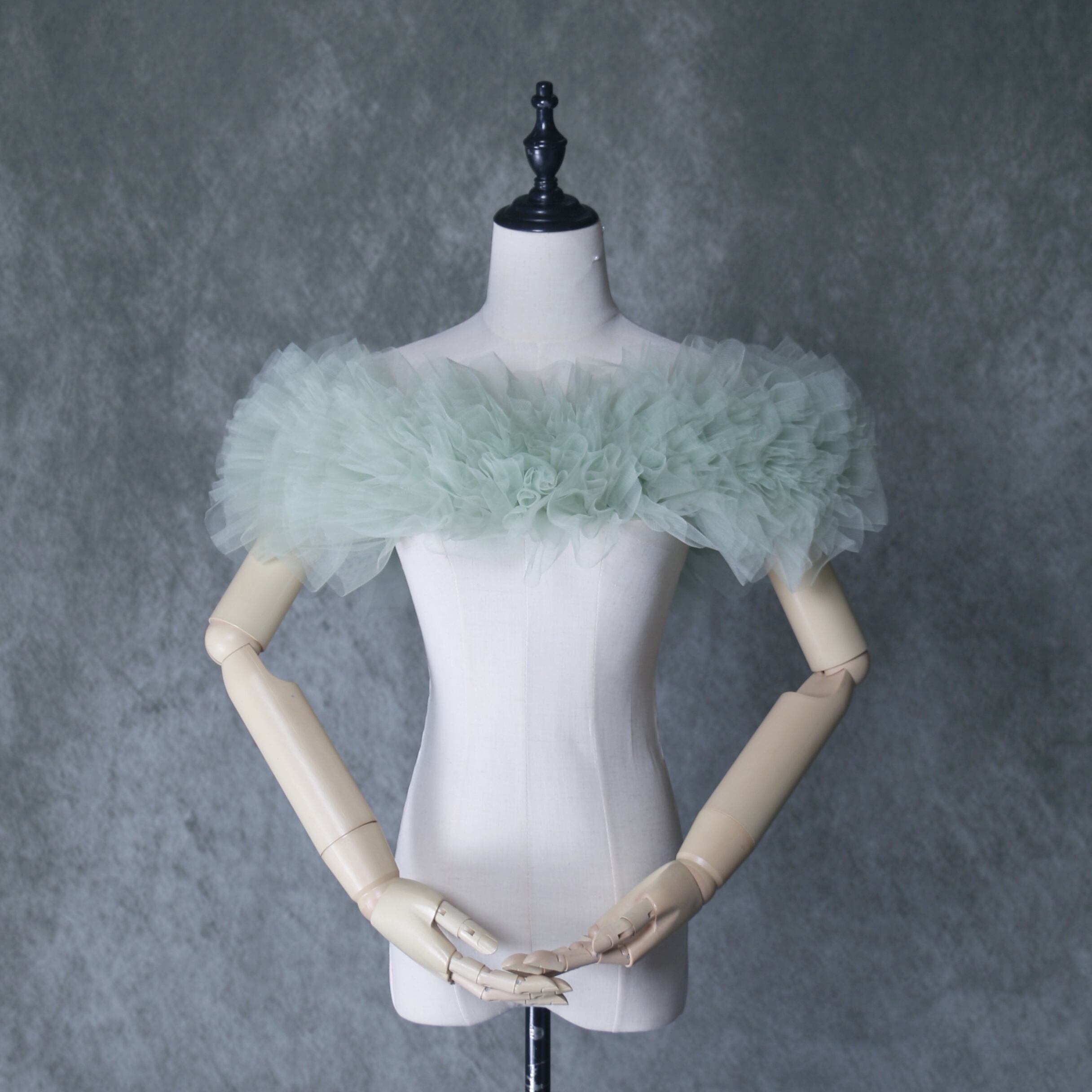 送料無料!グリーン ポンチョ ソフトチュール ラッフルフリル  取り外しオフショルダー