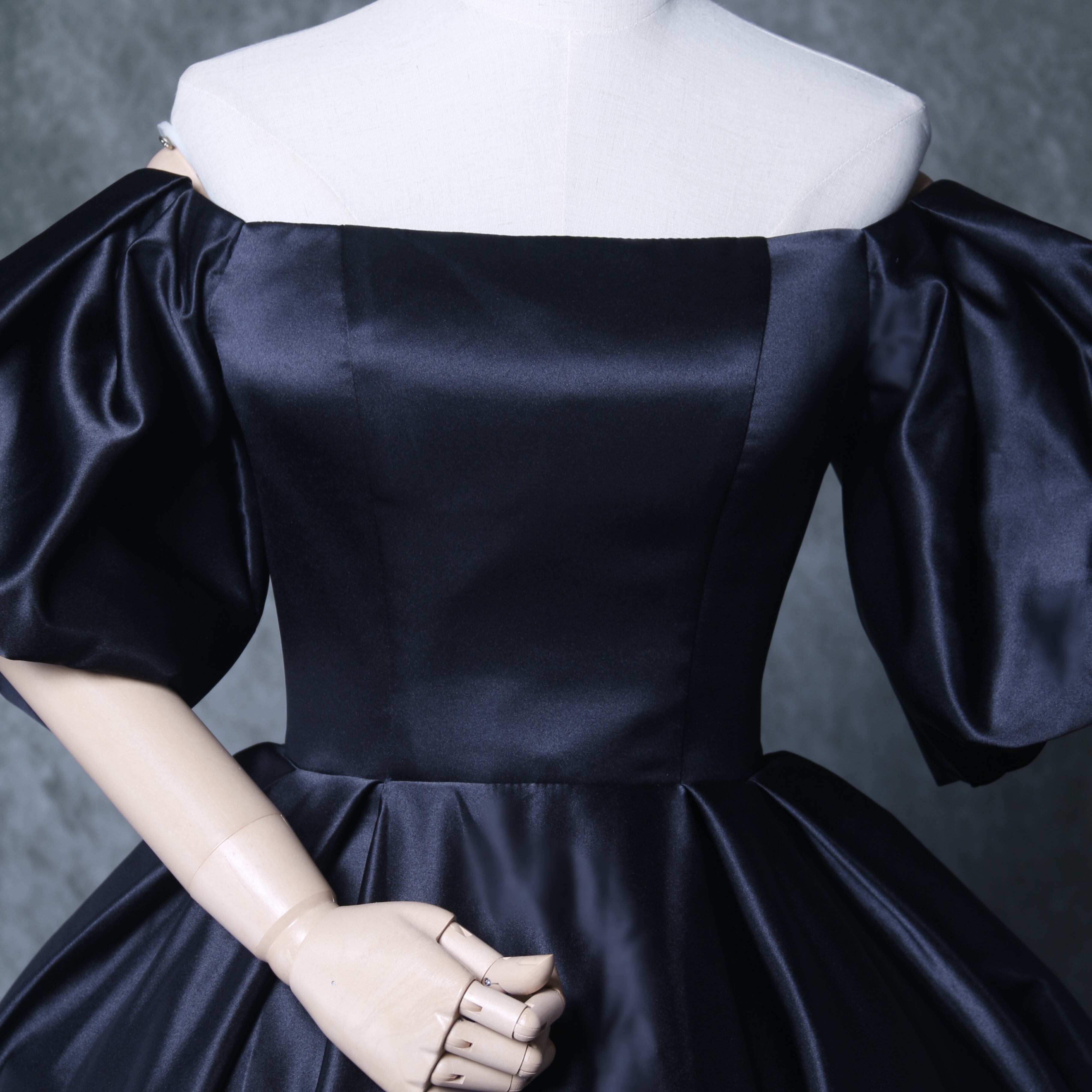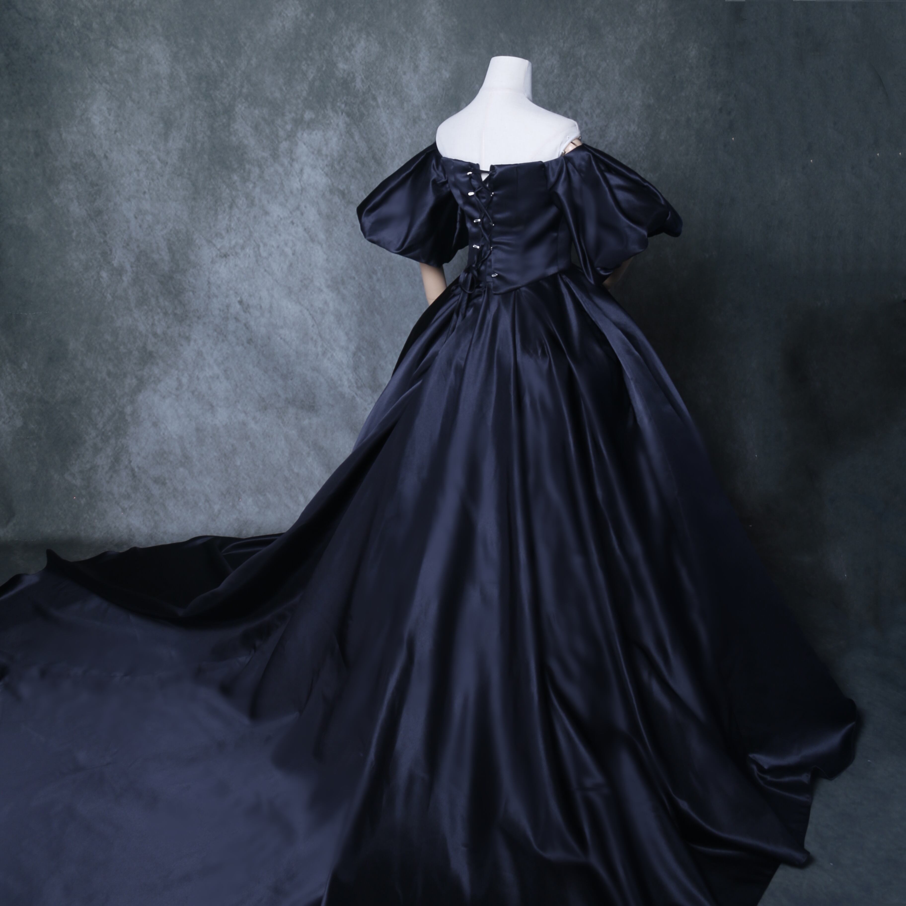 送料無料! 雅やか 黒 オフショルダー カラードレス パフスリーブ 華やかなトレーン 結婚式/花嫁