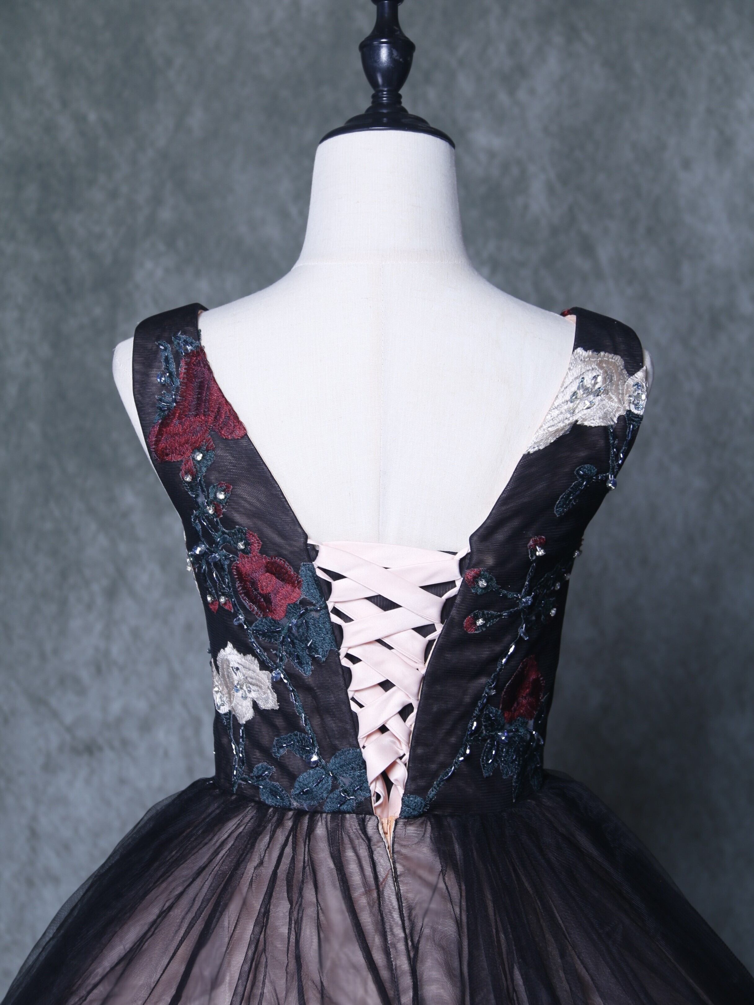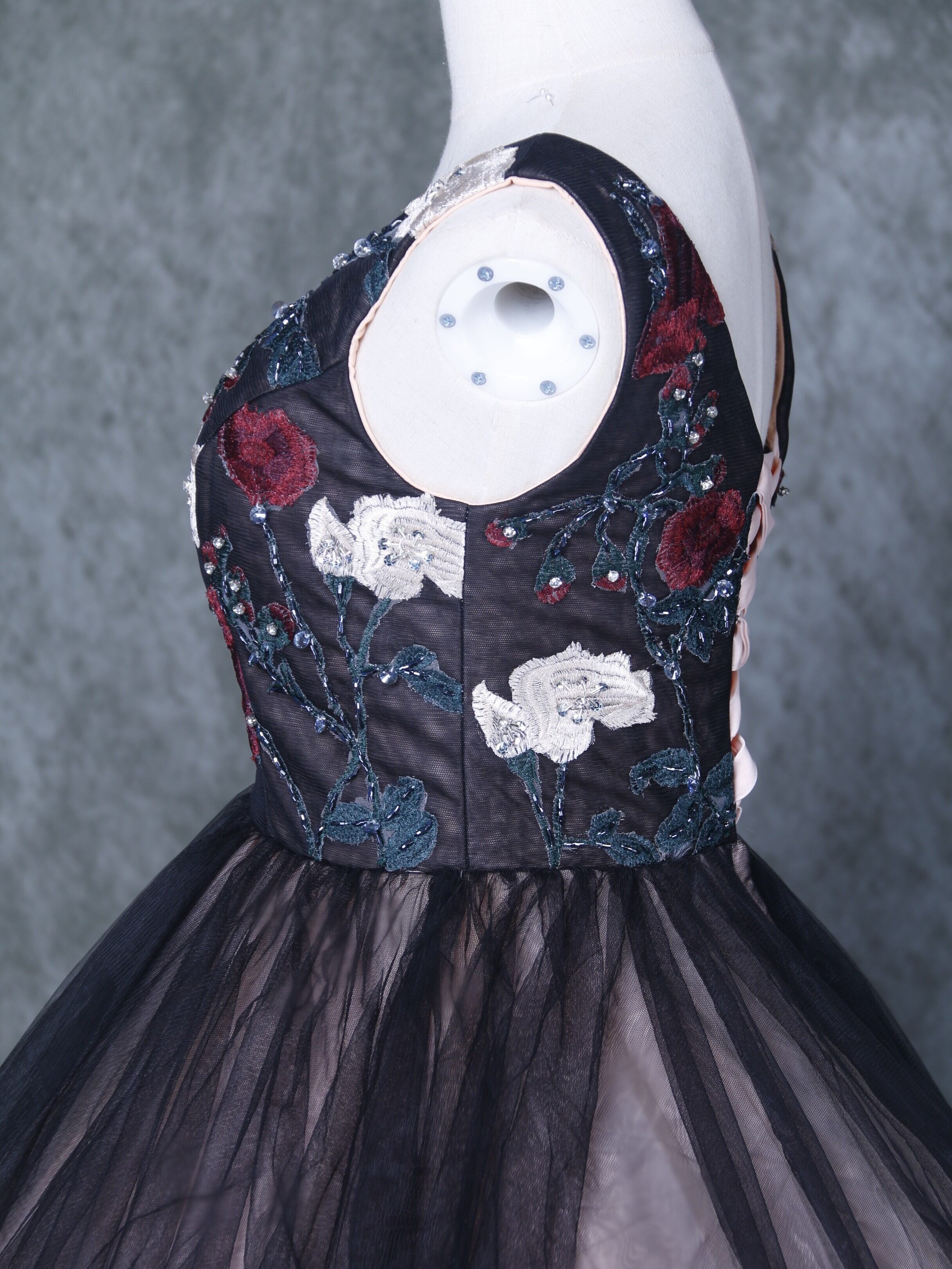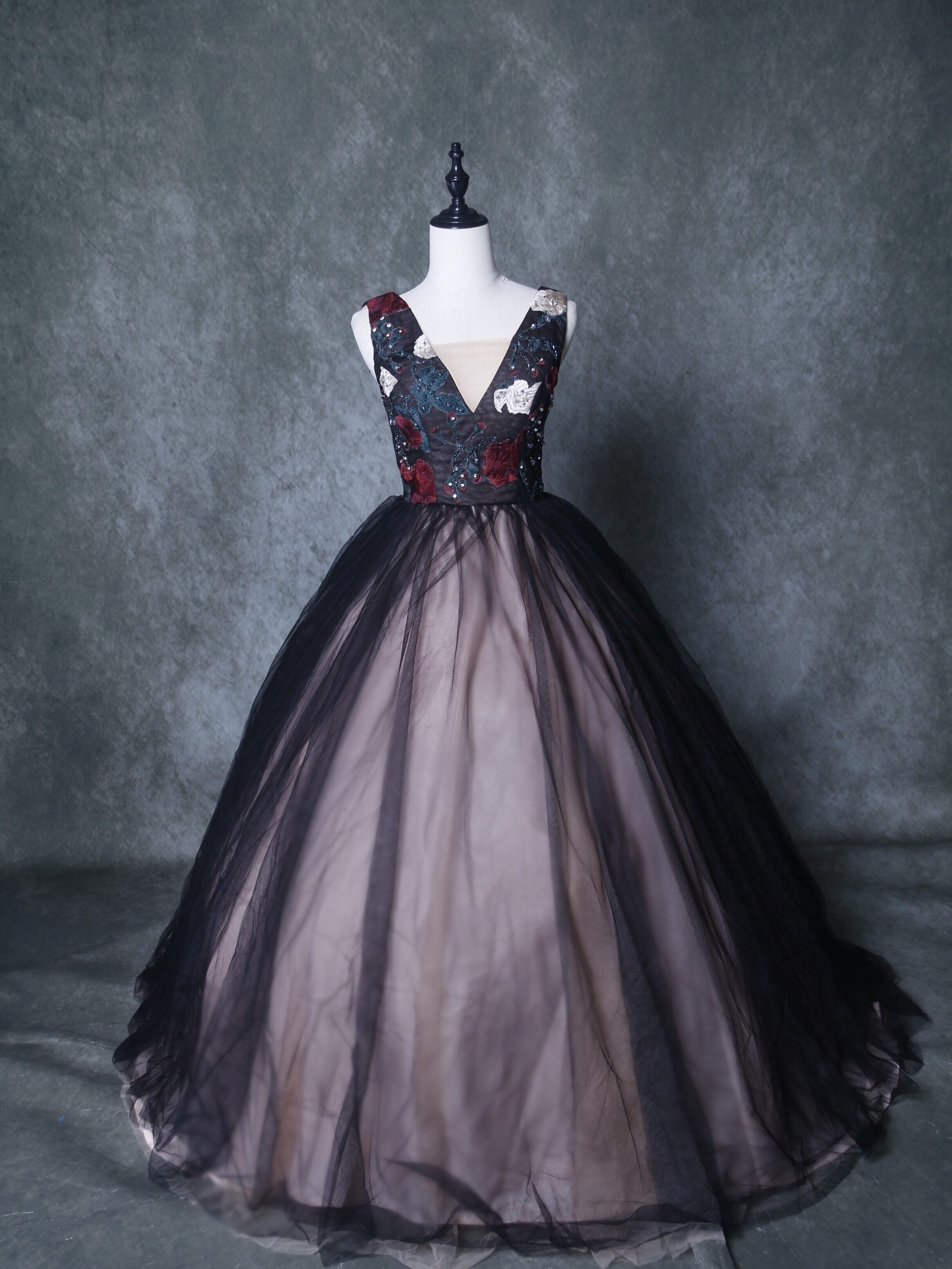 送料無料! 雅やか 黒 リーフ刺繍 カラードレス Vネックドレス 結婚式/花嫁