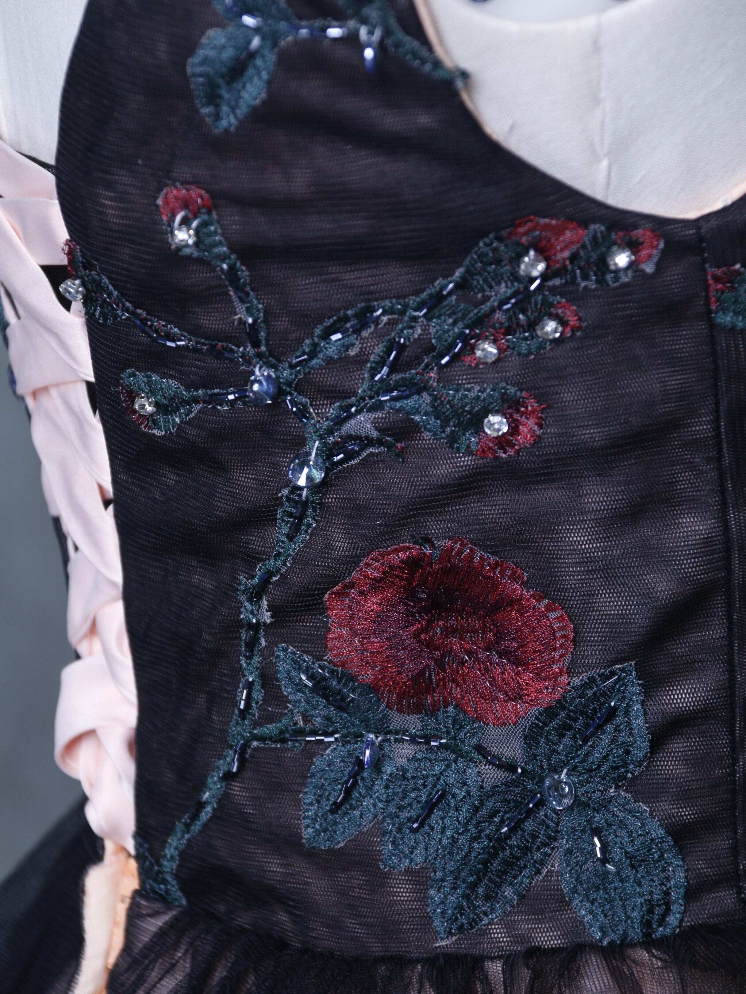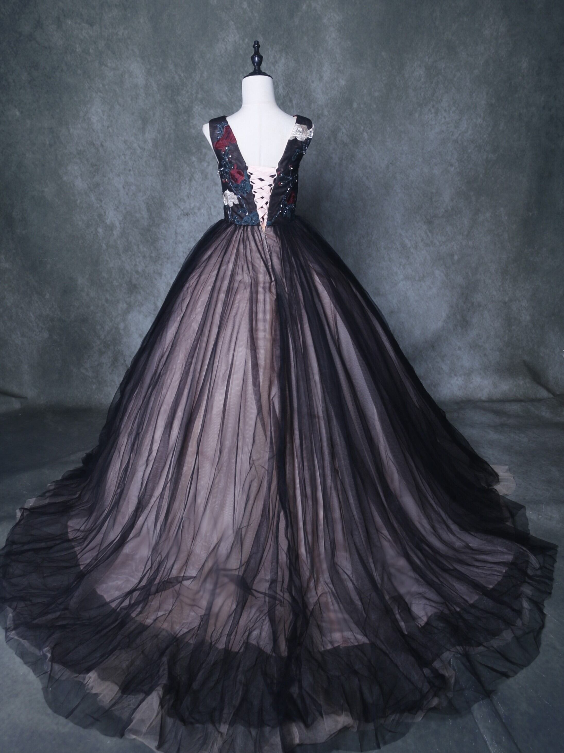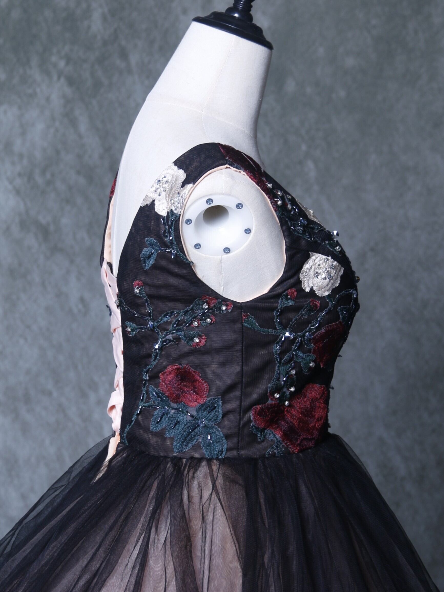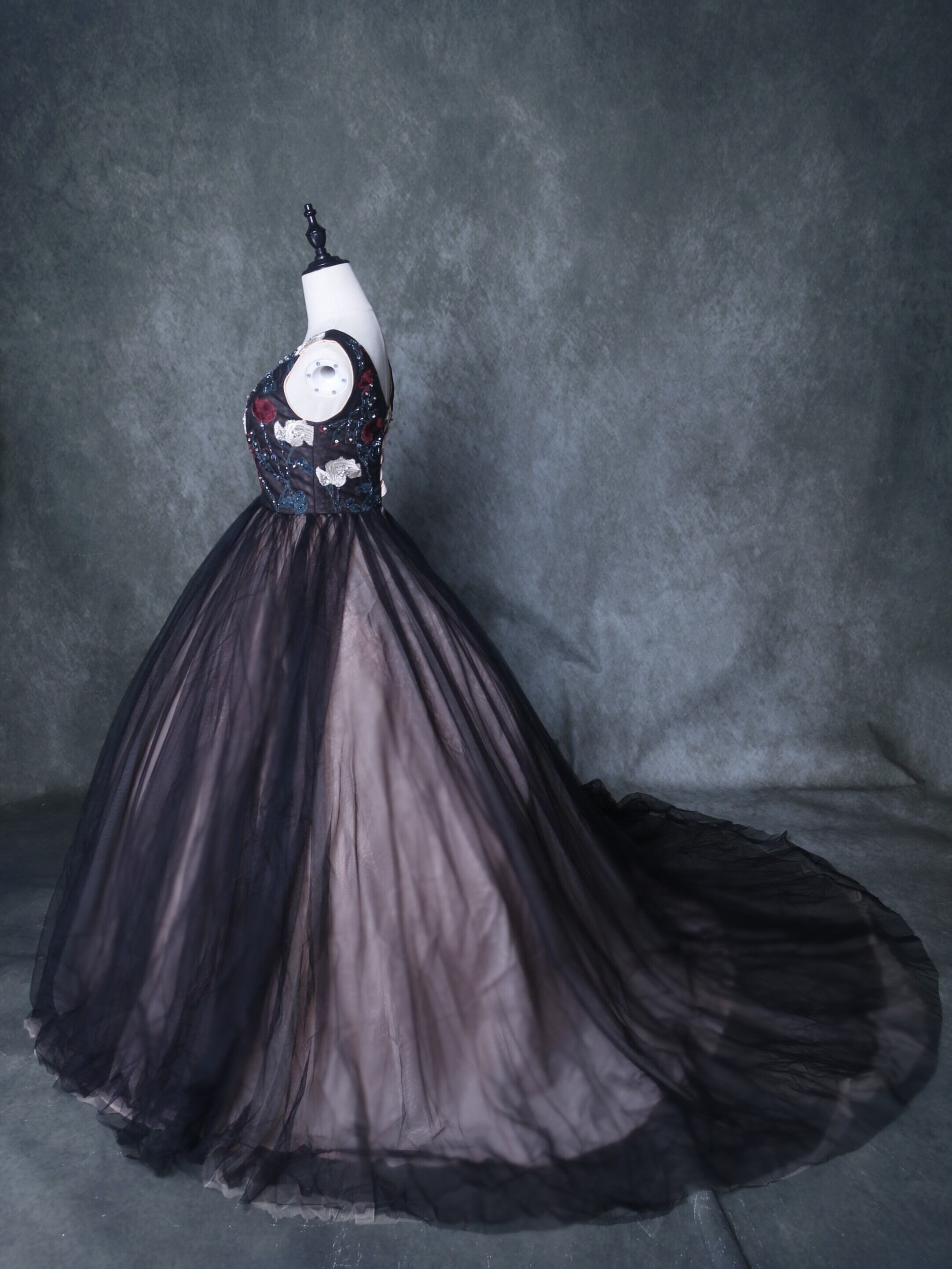 送料無料! 雅やか 黒 リーフ刺繍 カラードレス Vネックドレス 結婚式/花嫁