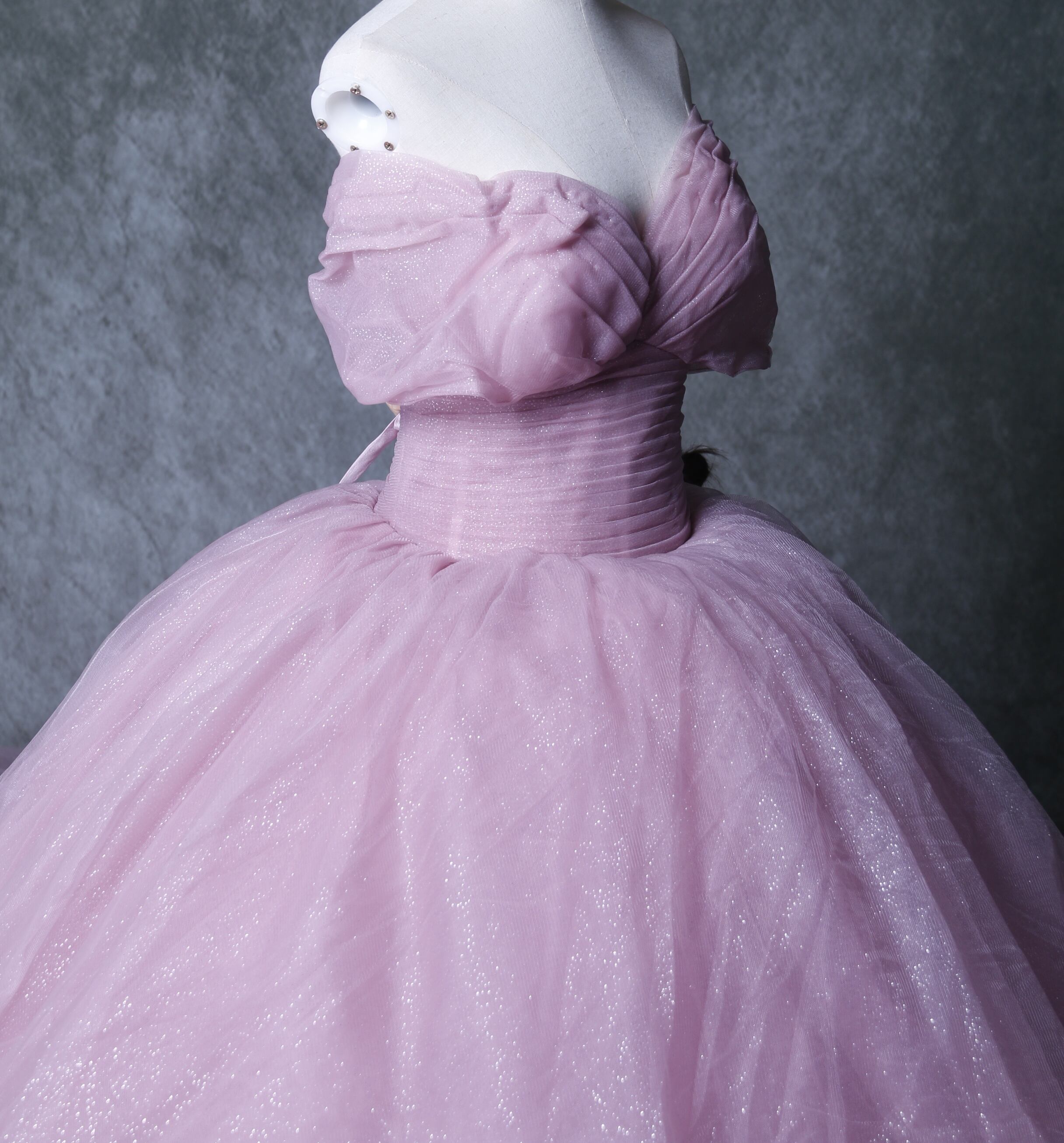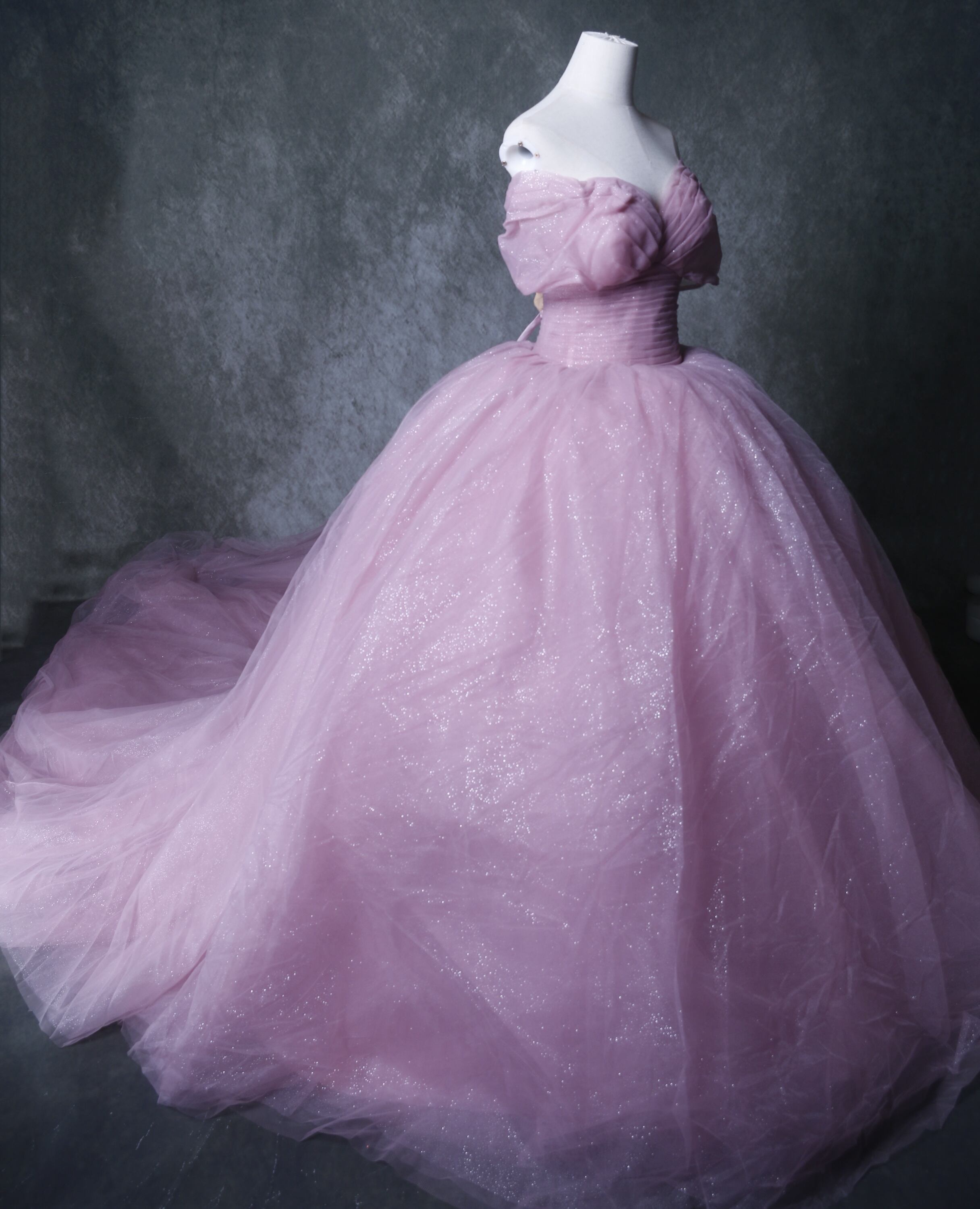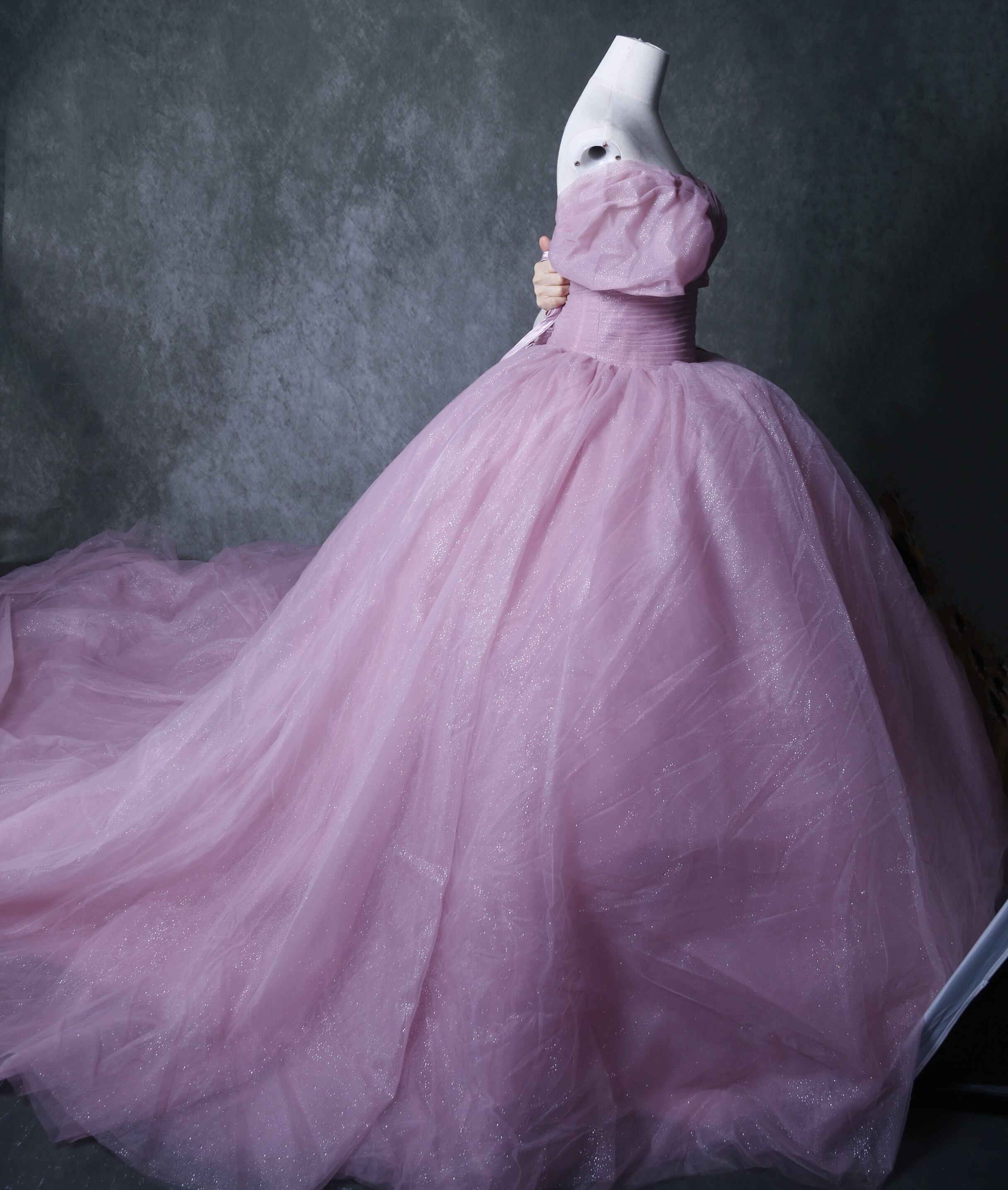 送料無料! 輝きな光彩を放つ ピンク キラキラグリッターチュール カラードレス 華やかなトレーン 結婚式/