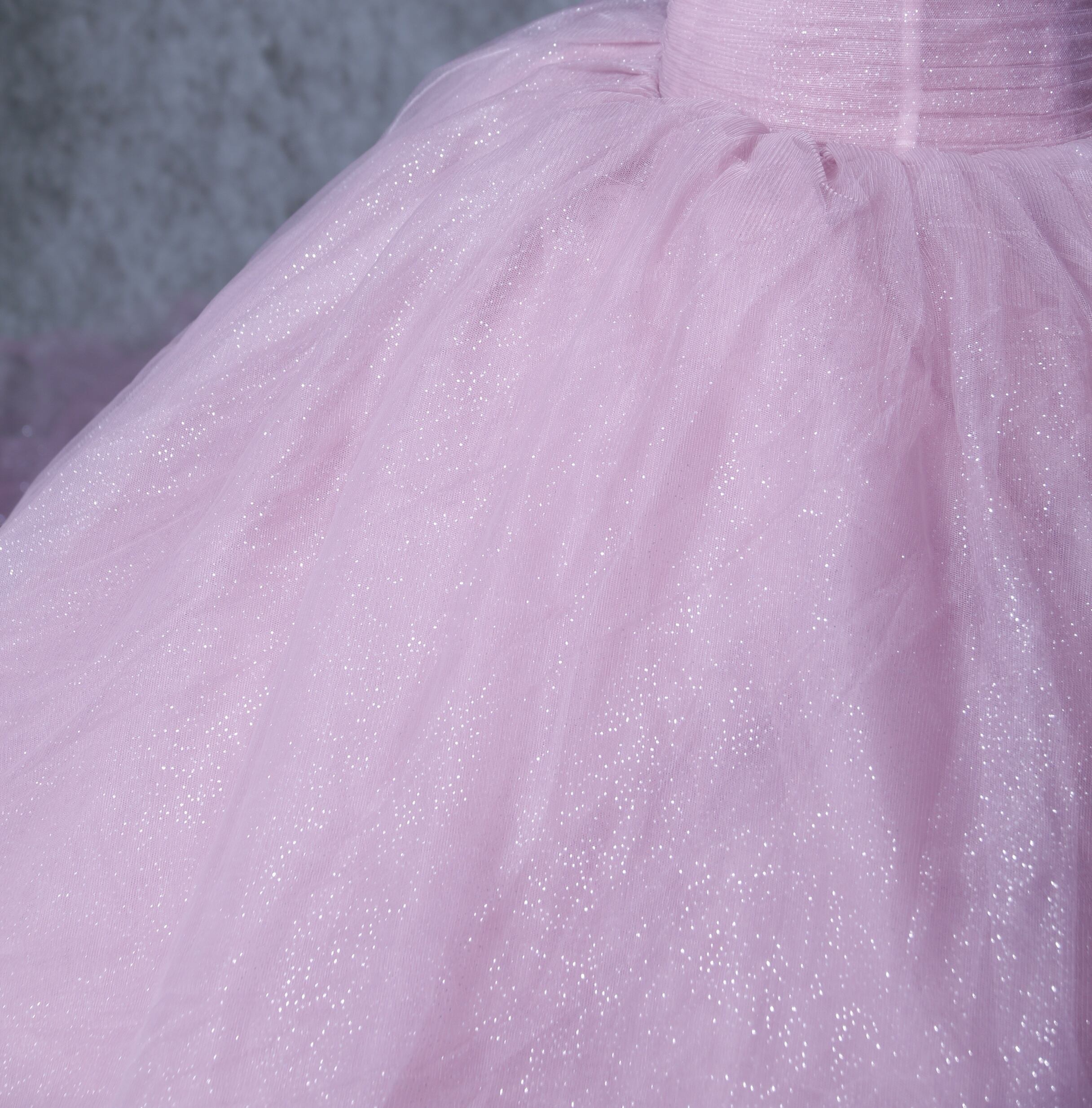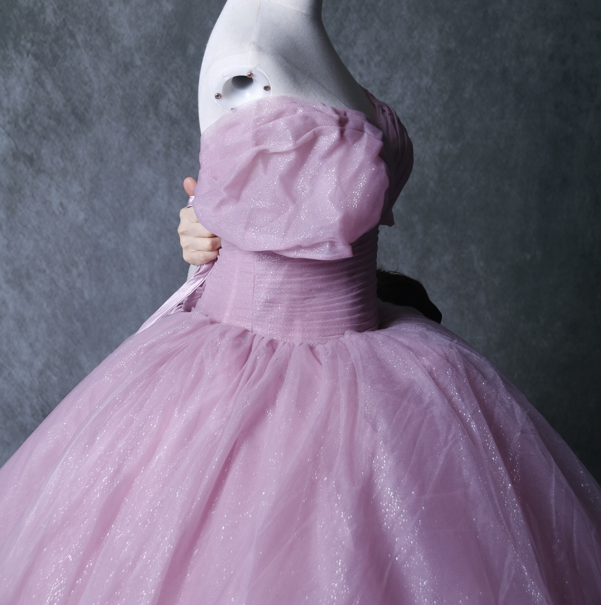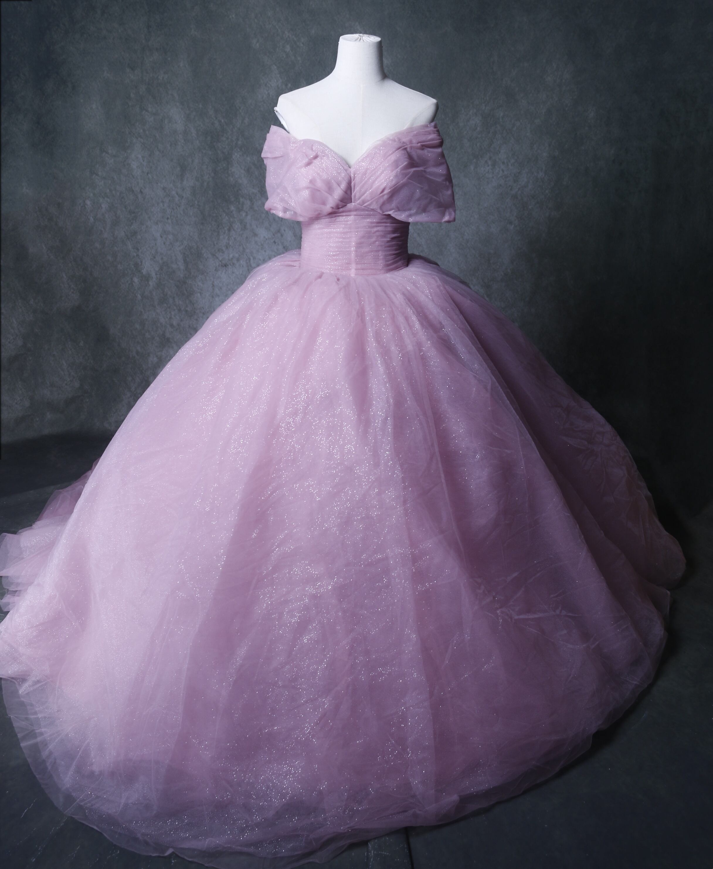 送料無料! 輝きな光彩を放つ ピンク キラキラグリッターチュール カラードレス 華やかなトレーン 結婚式/