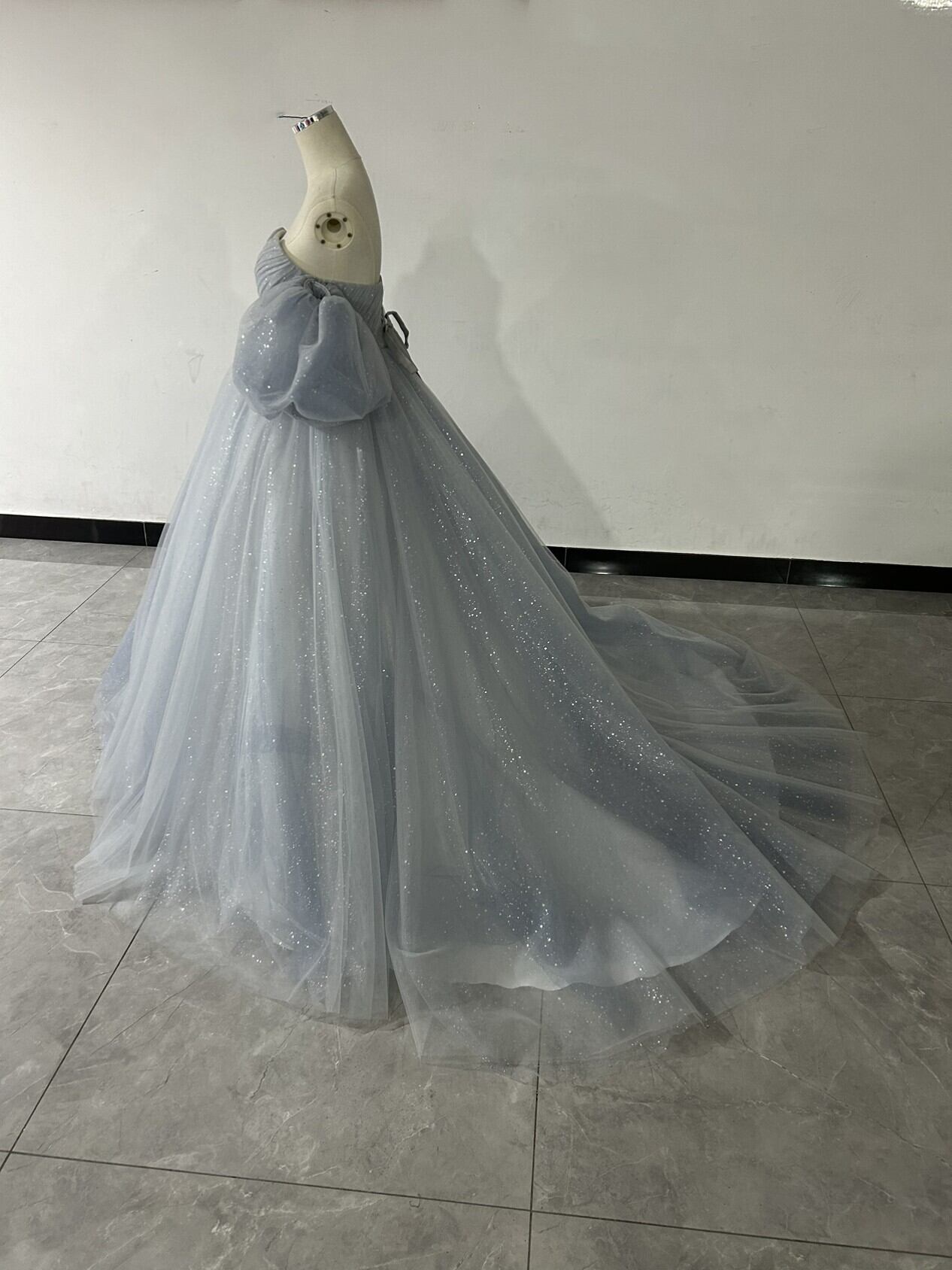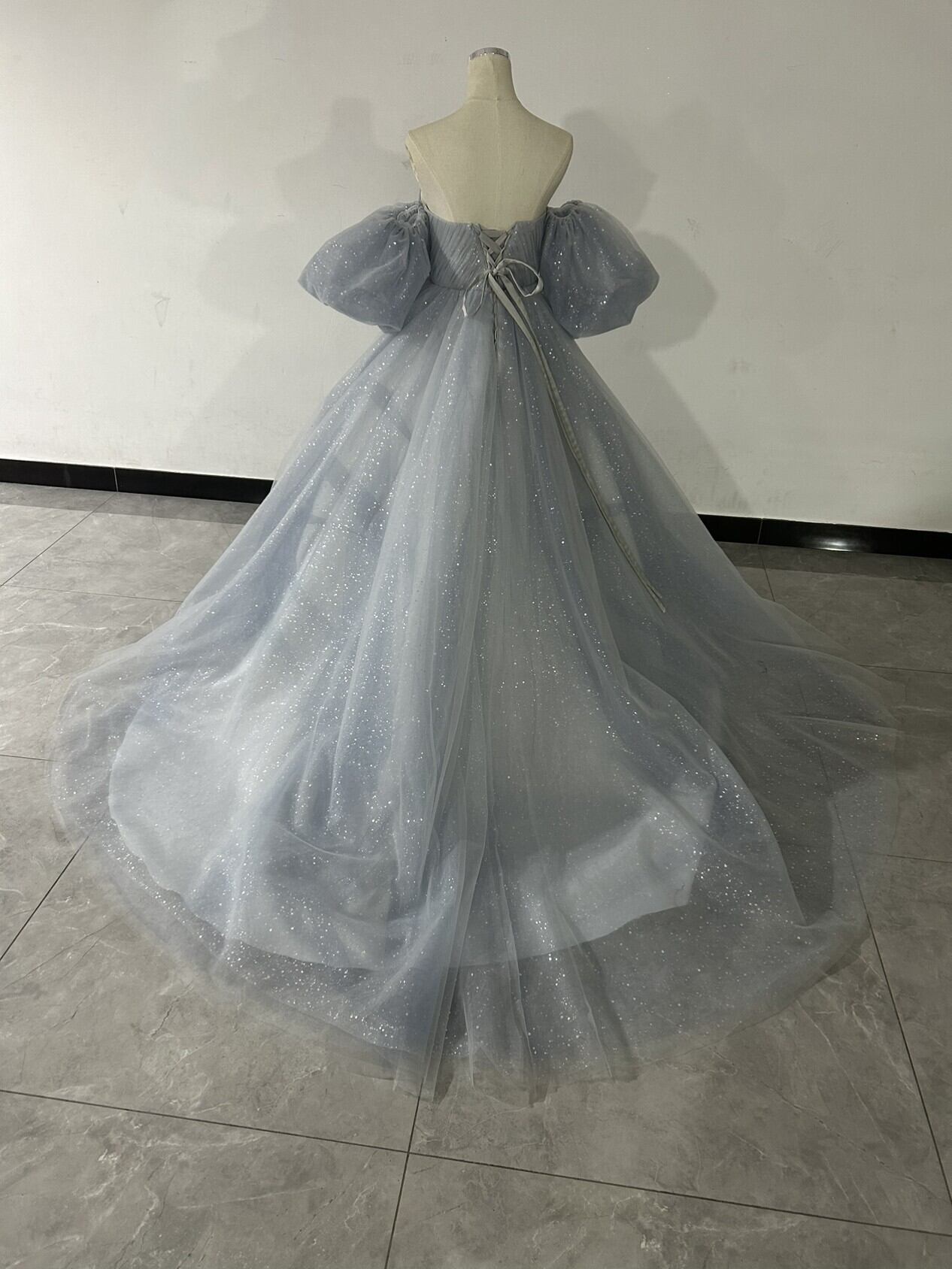 送料無料 !美品!グレー,カラードレス キラキラグリッターチュール 取り外し袖 華やかなトレ/挙式/前撮り/花嫁/