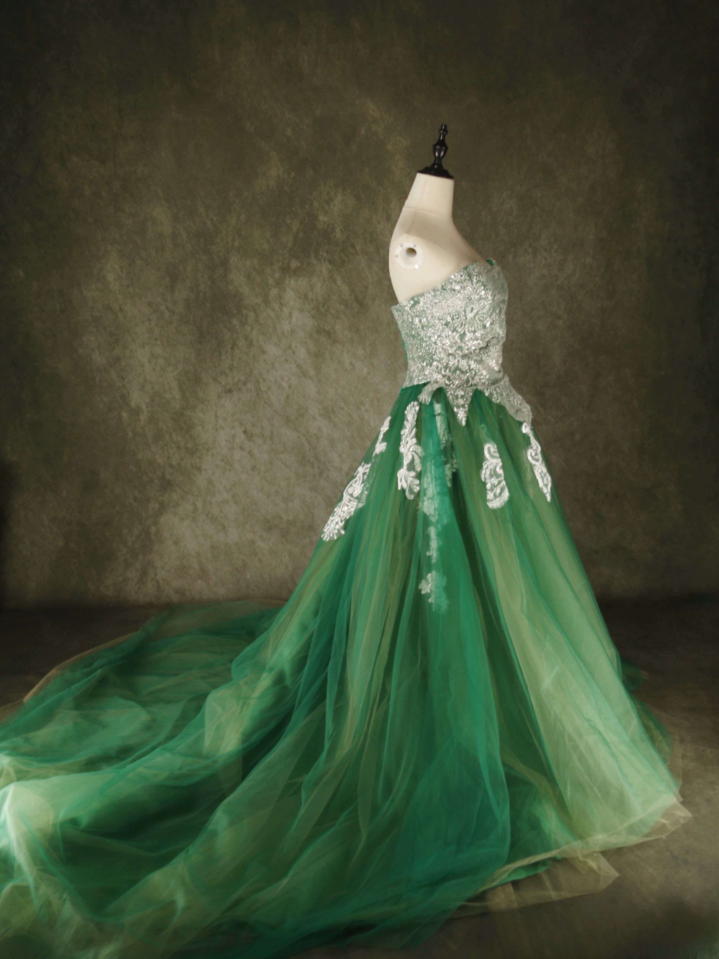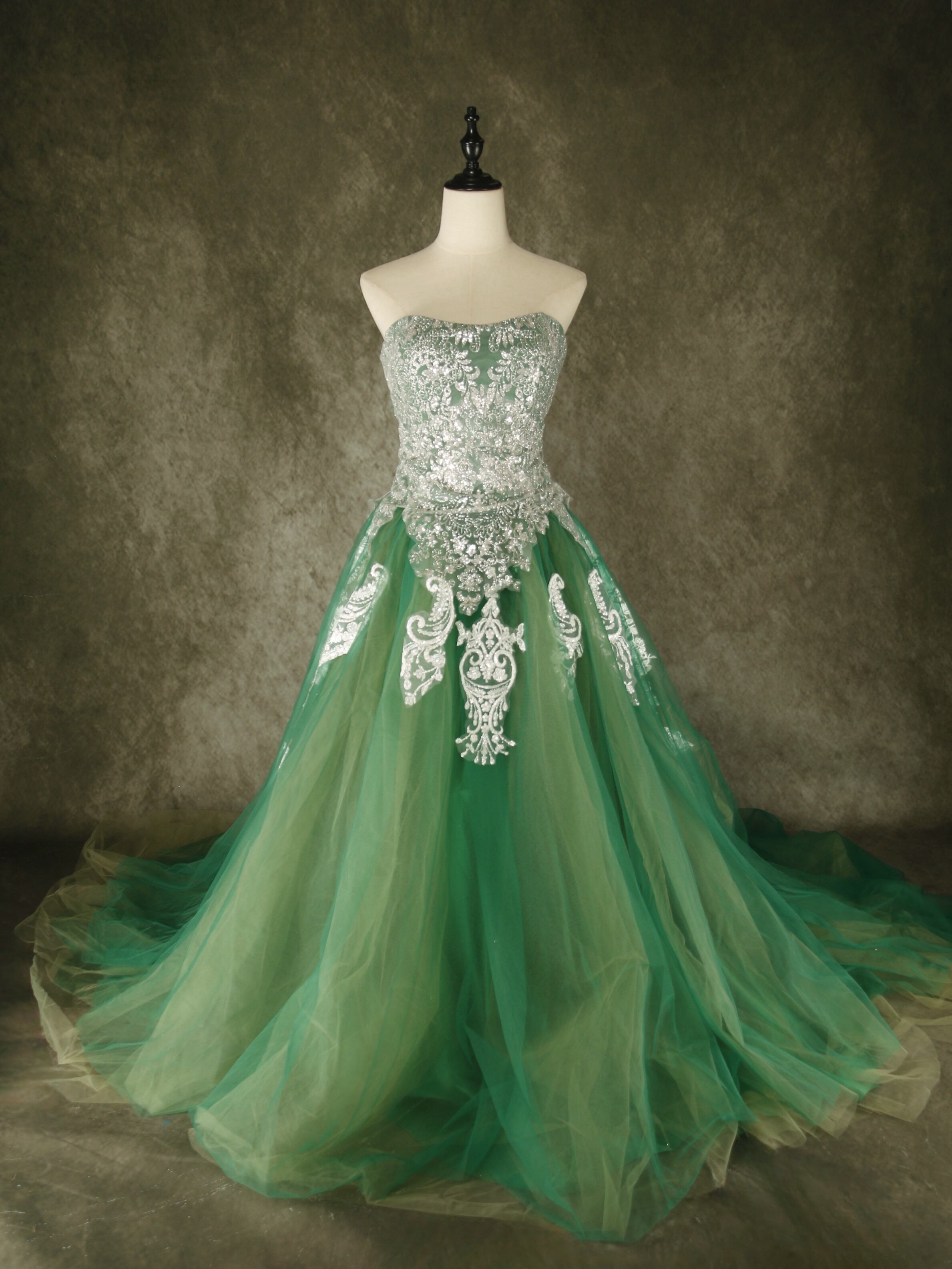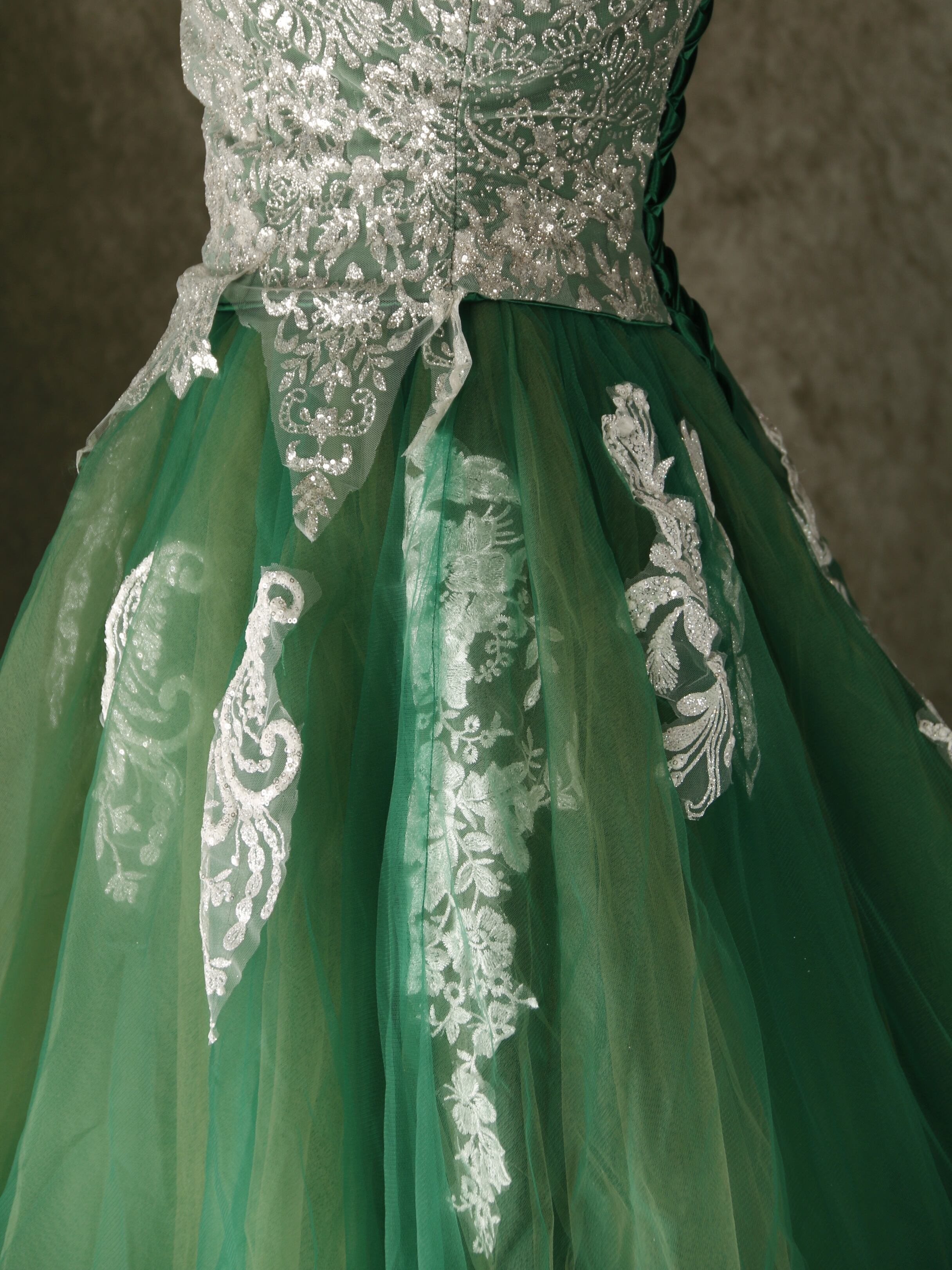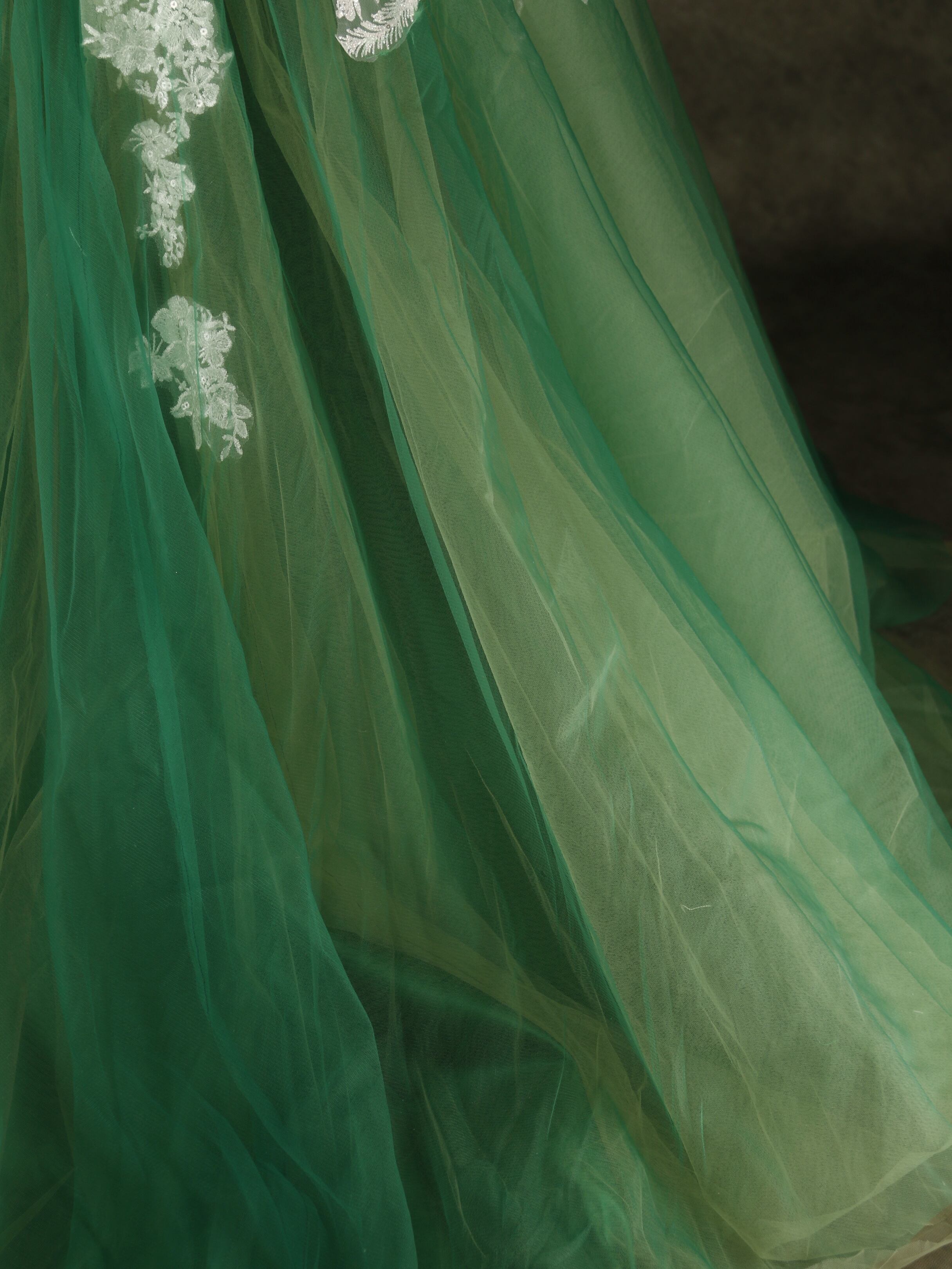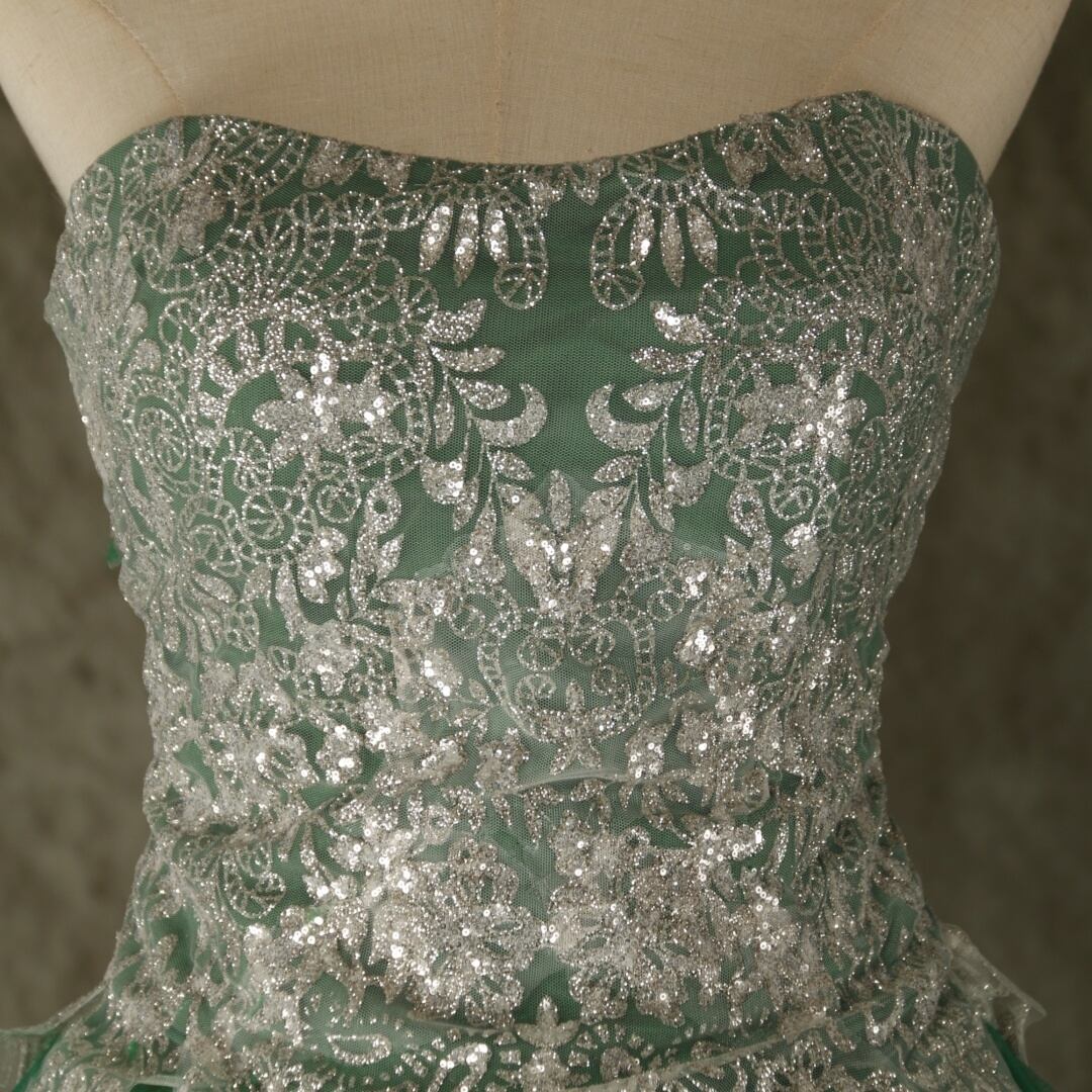 輝きな光彩を放つ グリーン3D立体レース刺繍 キラキラのハンドビーディング カラードレス 華やかなトレマーメイドライン前撮り/花嫁/
