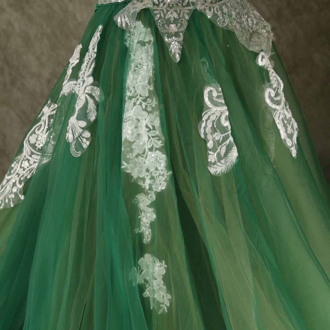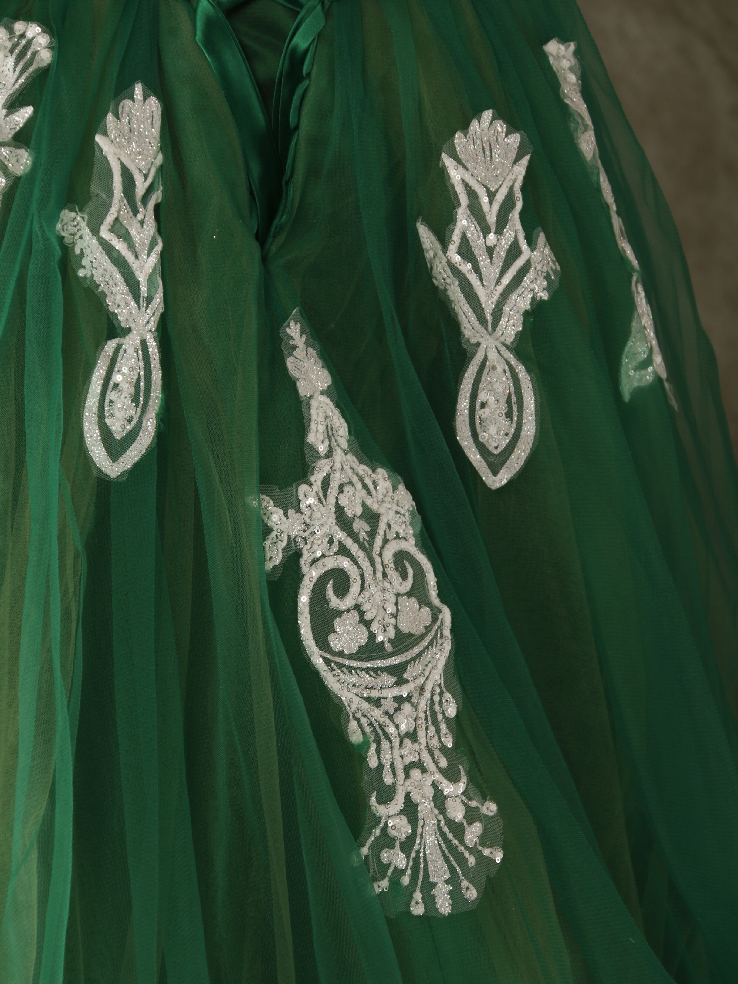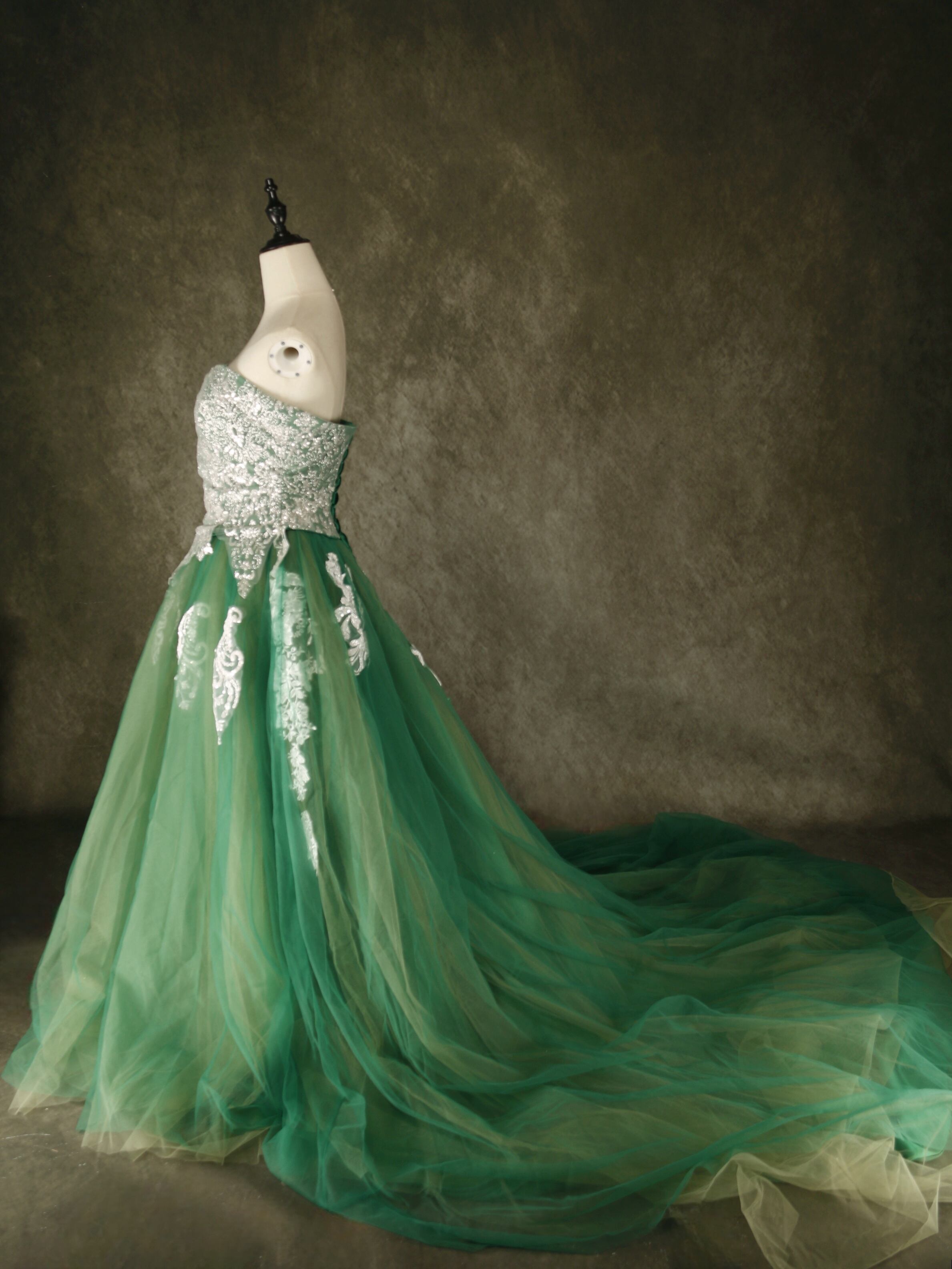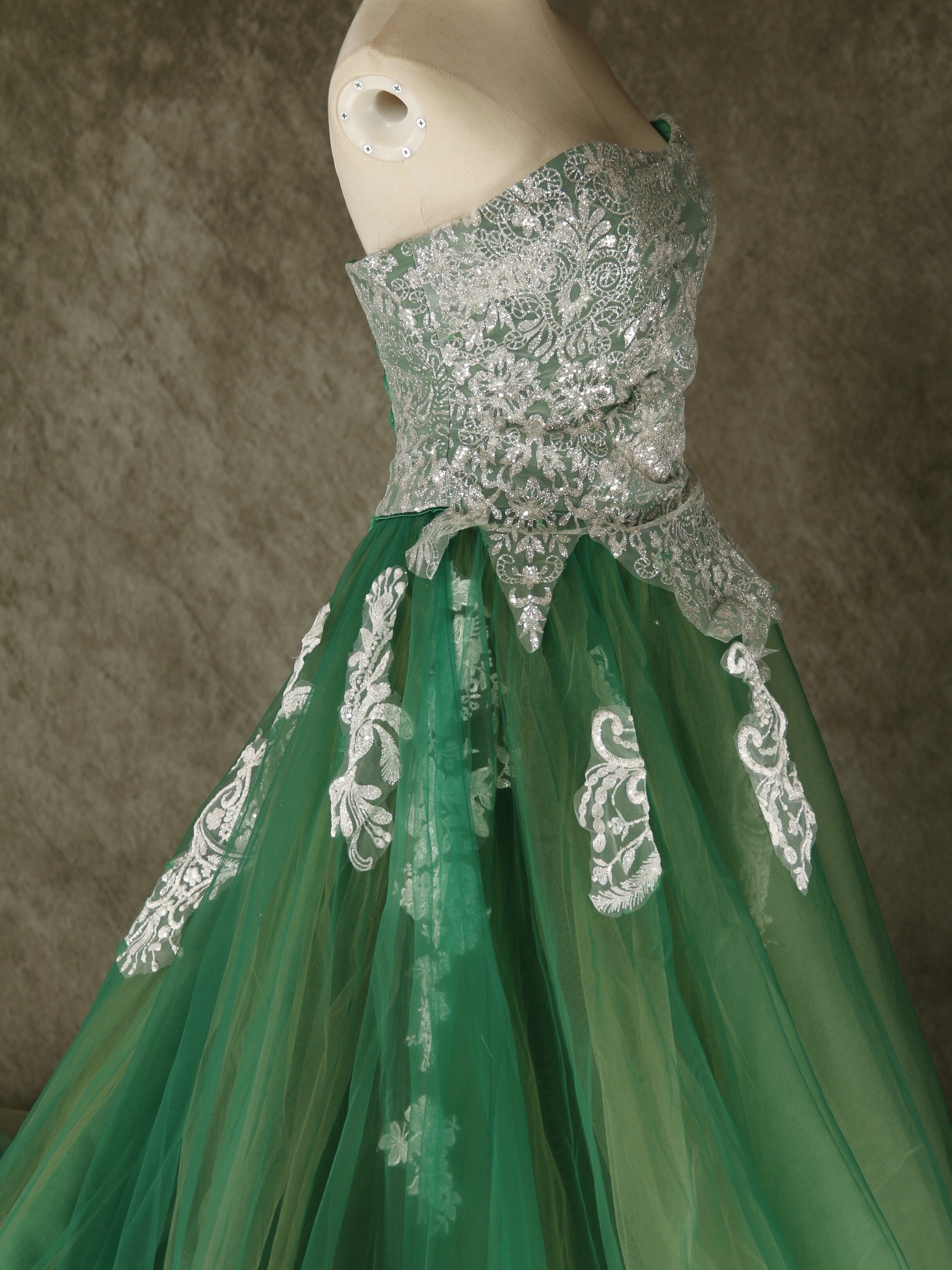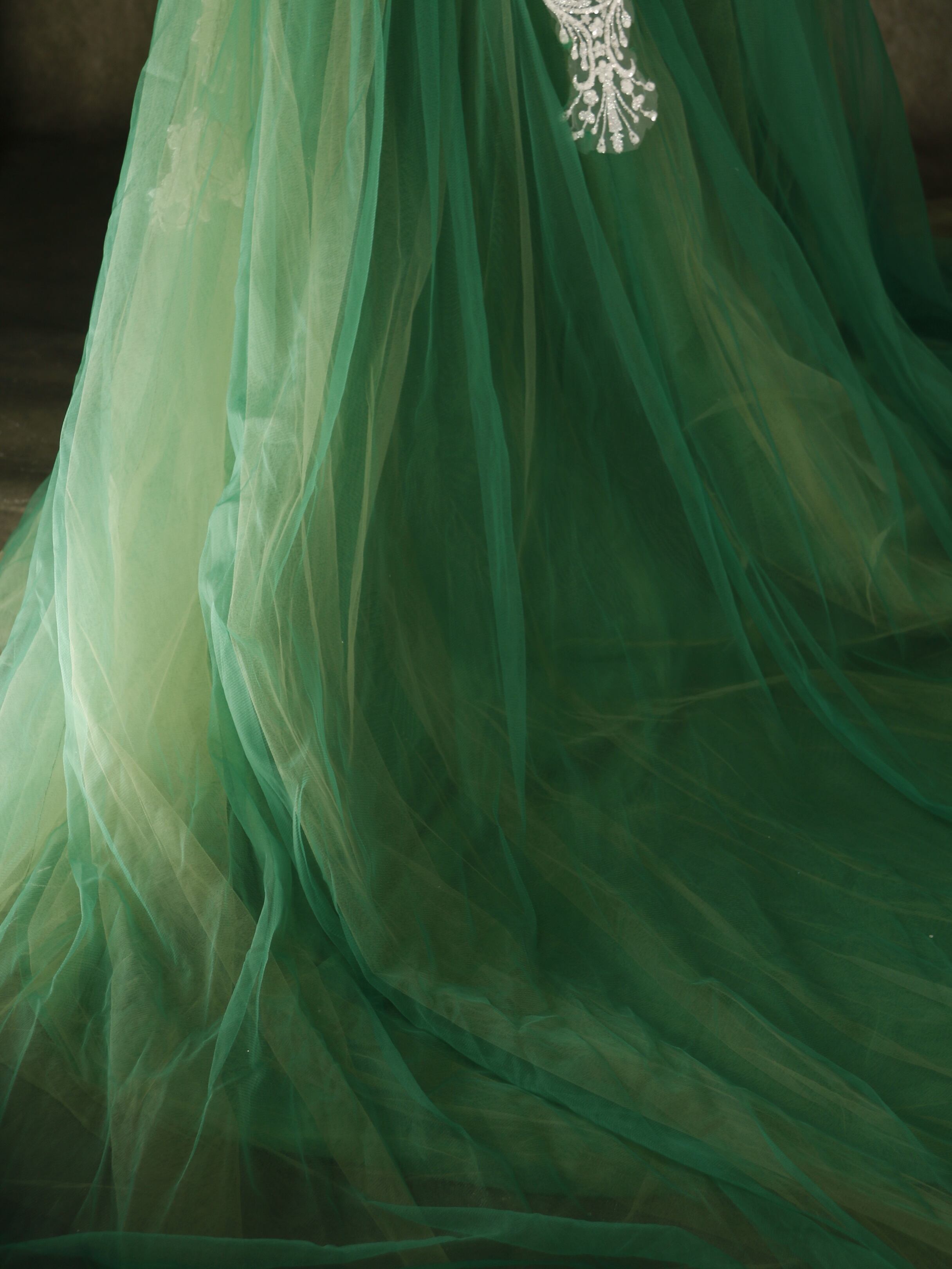輝きな光彩を放つ グリーン3D立体レース刺繍 キラキラのハンドビーディング カラードレス 華やかなトレマーメイドライン前撮り/花嫁/