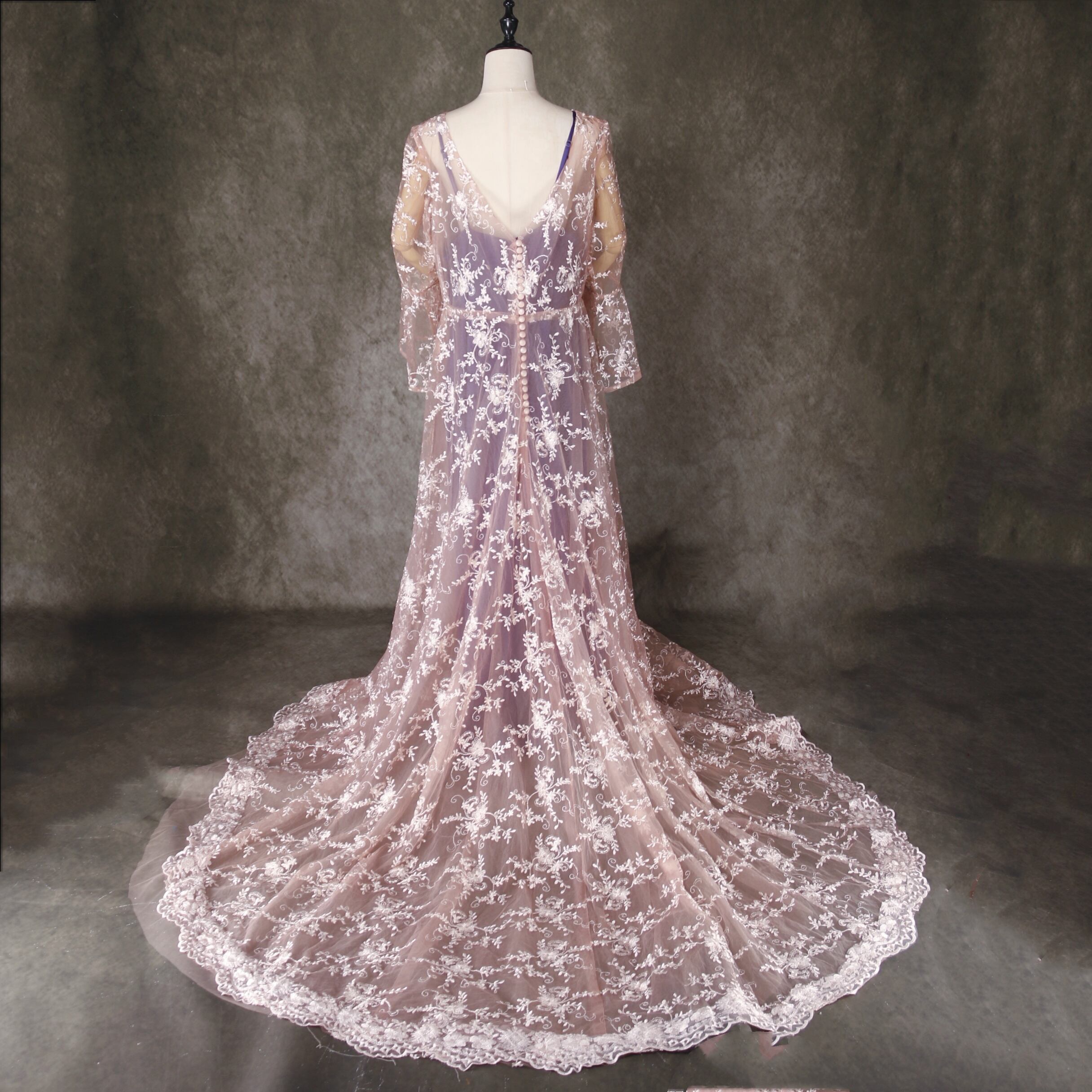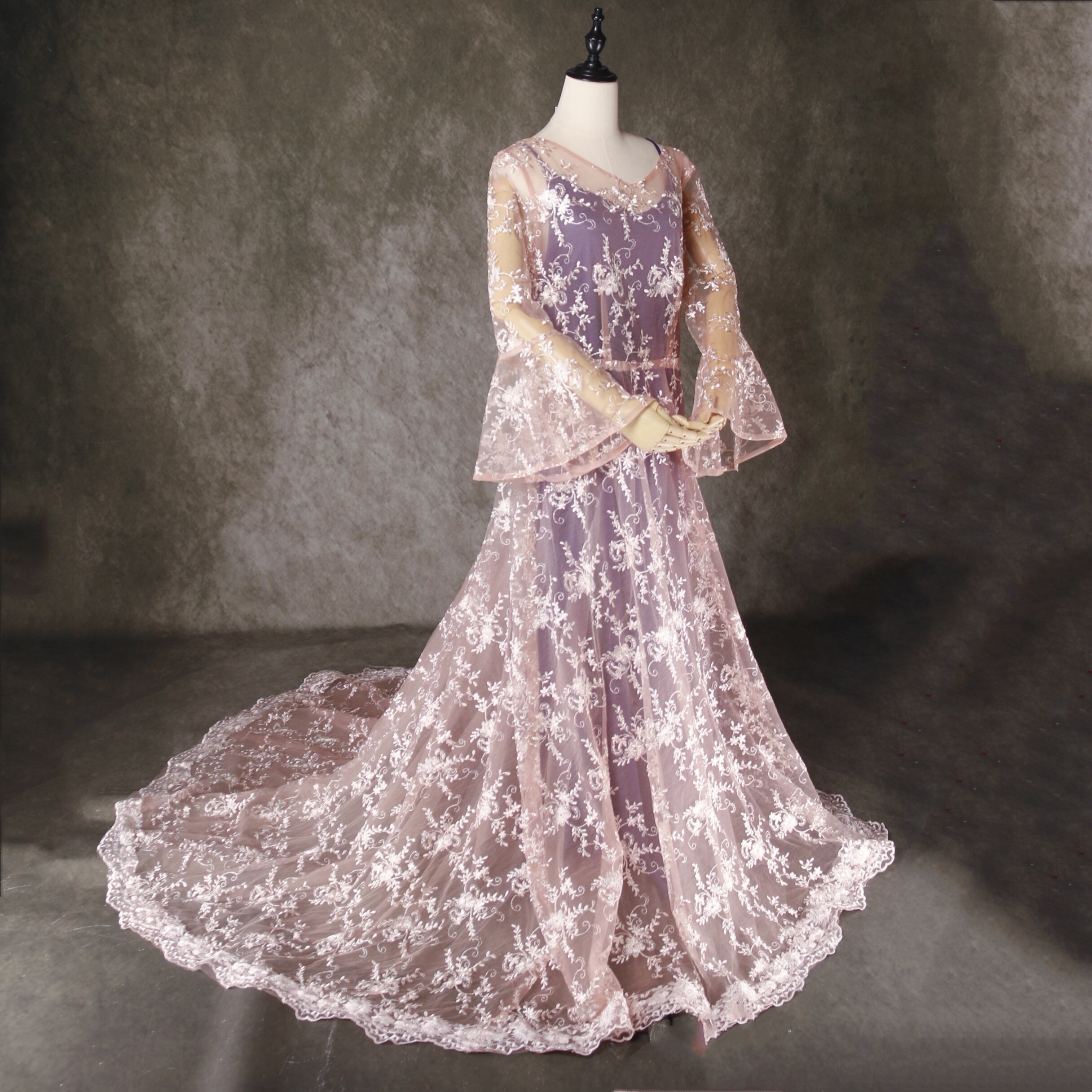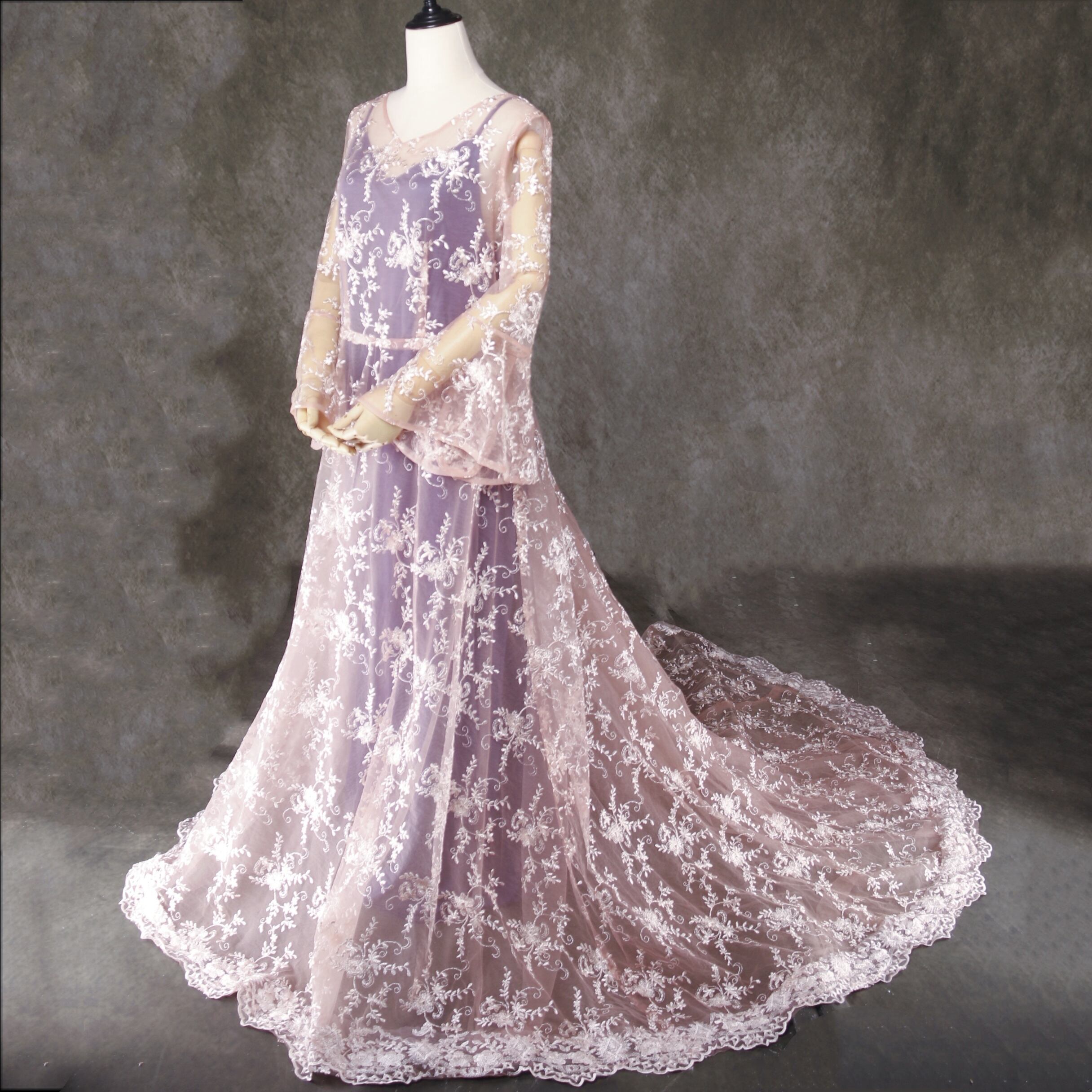 送料無料!華やか 紫色 カラードレス + ベルスリーブ 贅沢な総レースオーバースカート 外 前撮り/花嫁/