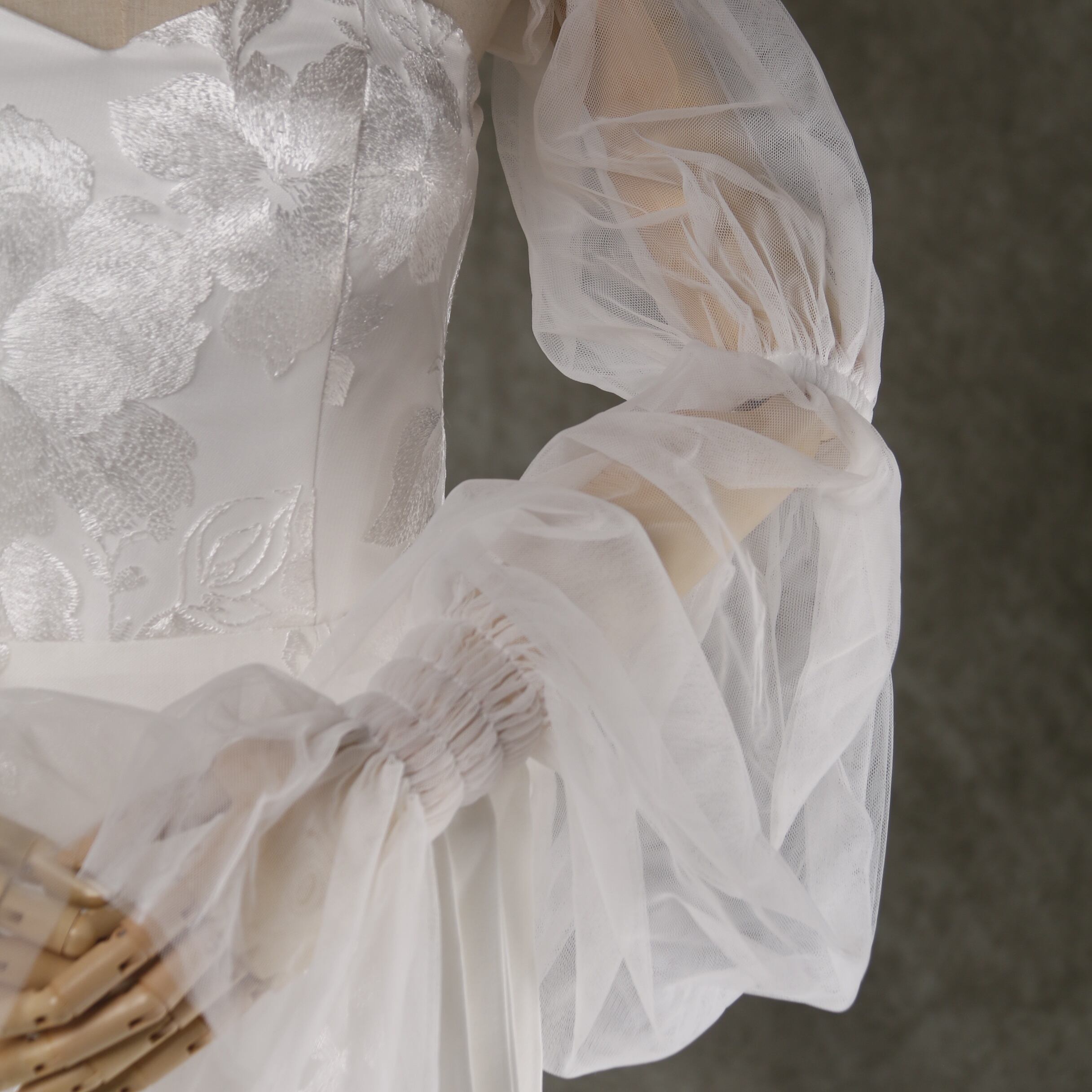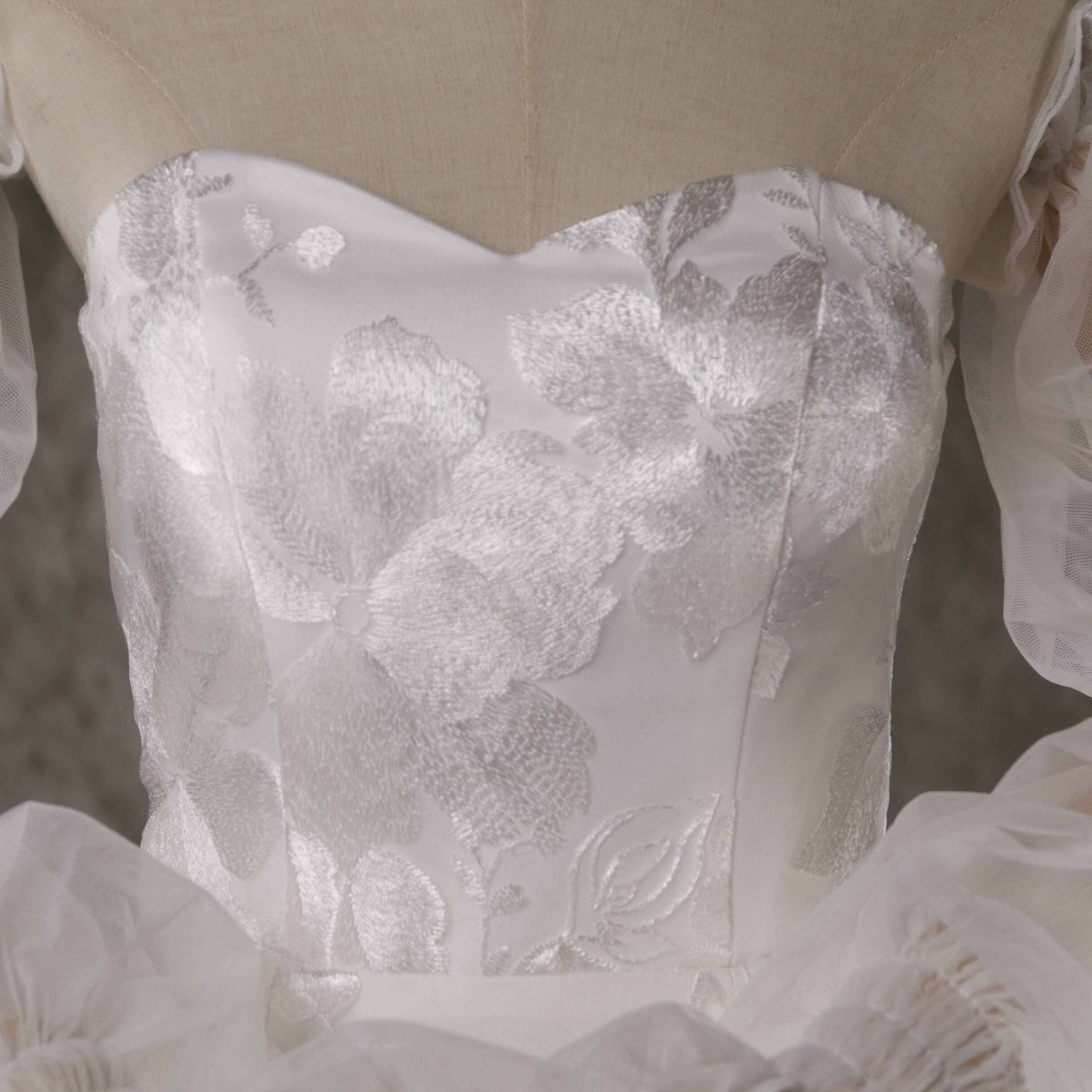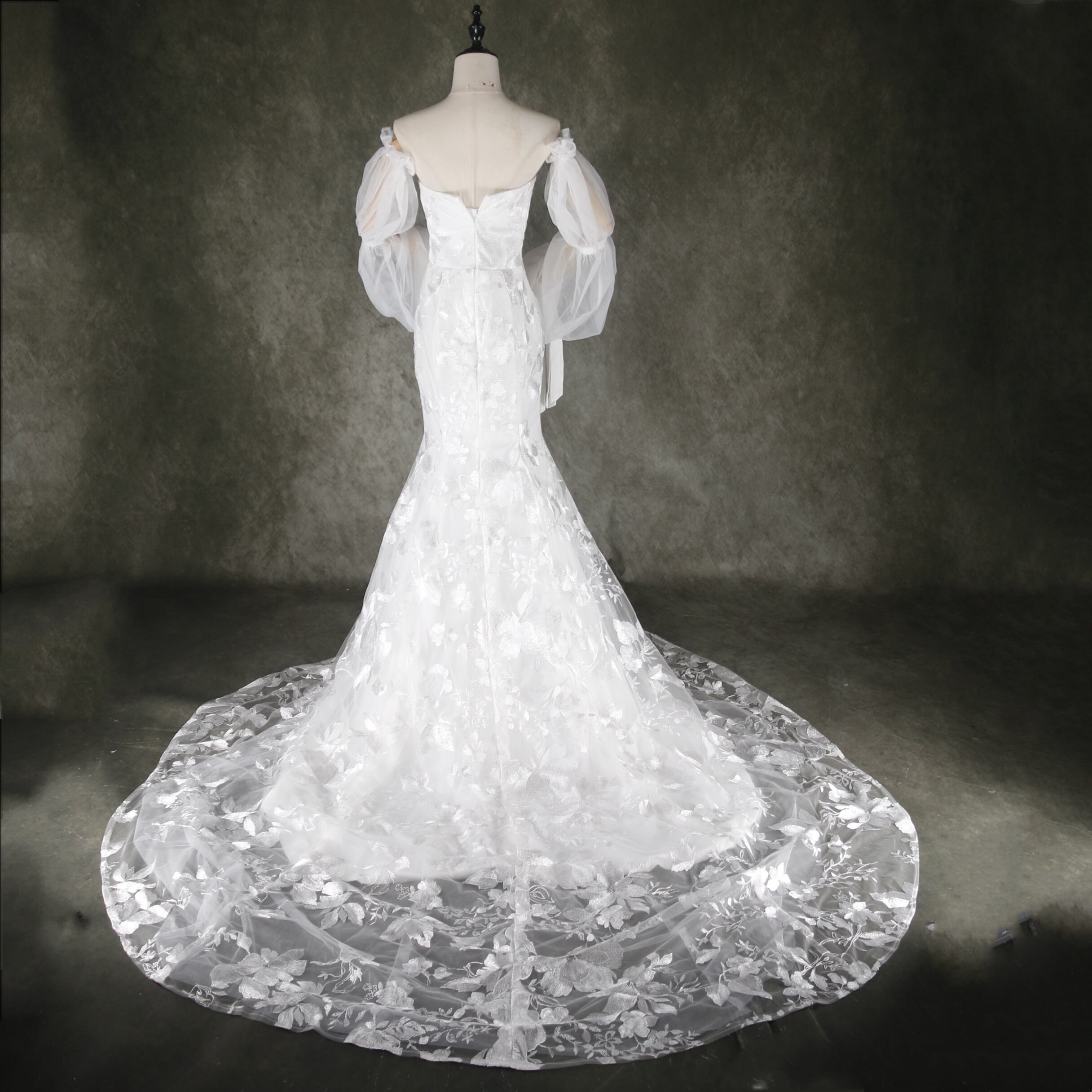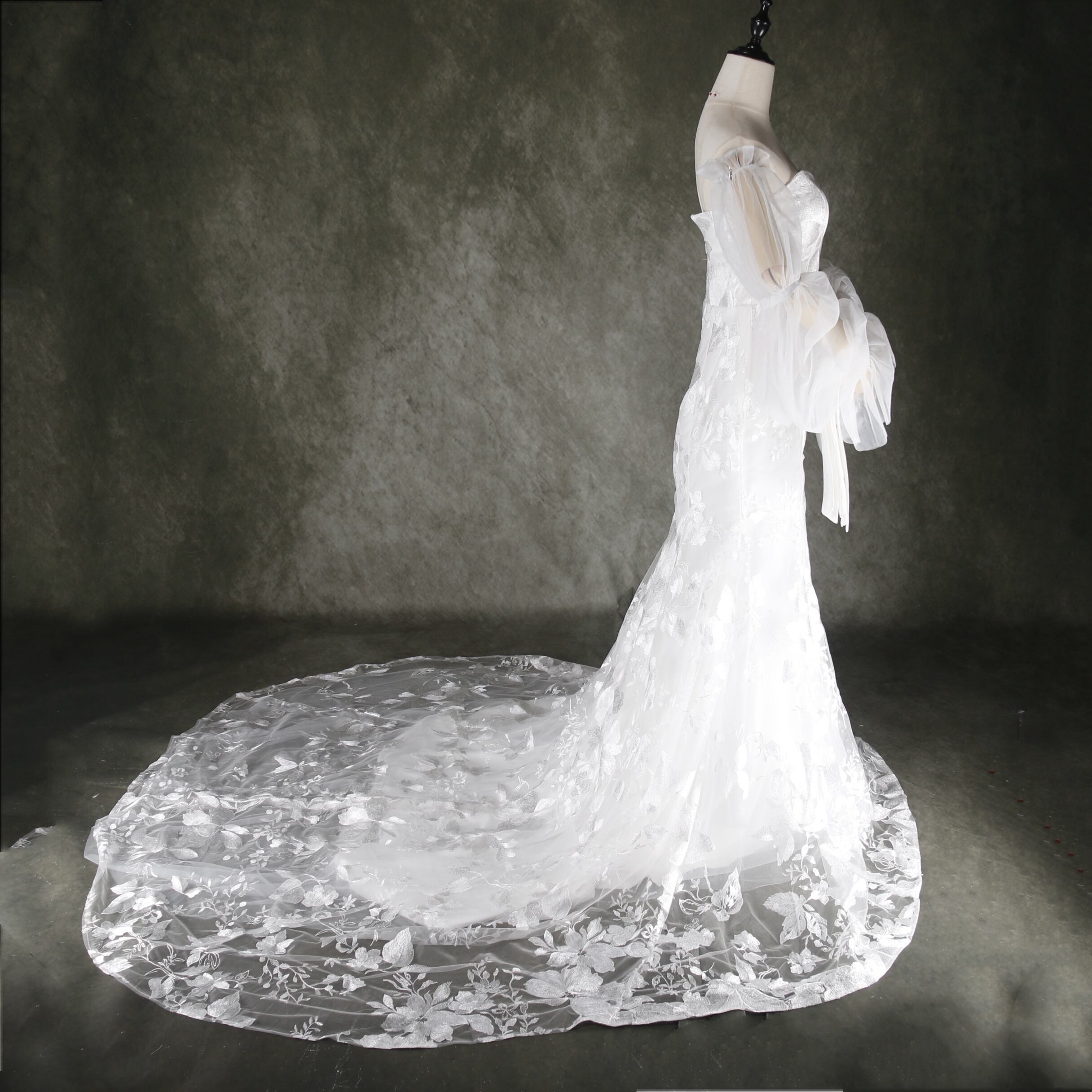 送料無料!憧れのドレス ホワイト3D立体レース刺繍 ふわふわ袖 ウエディングドレス 華やかなトレーン マーメイドライン 前撮り/花嫁/