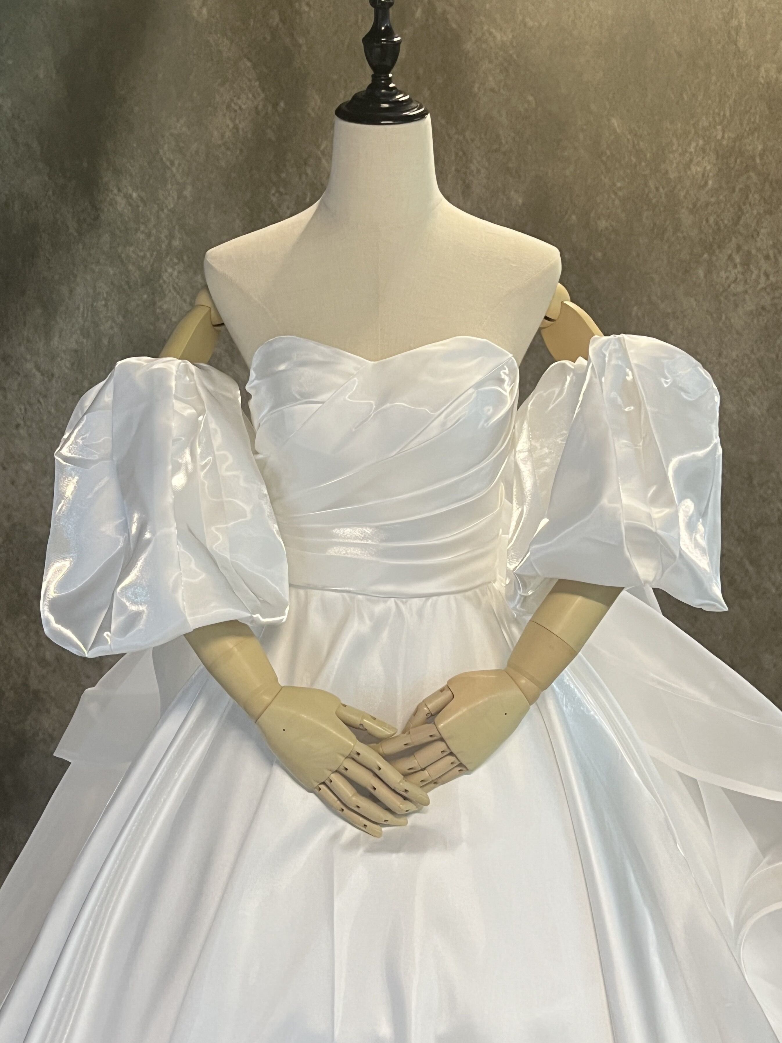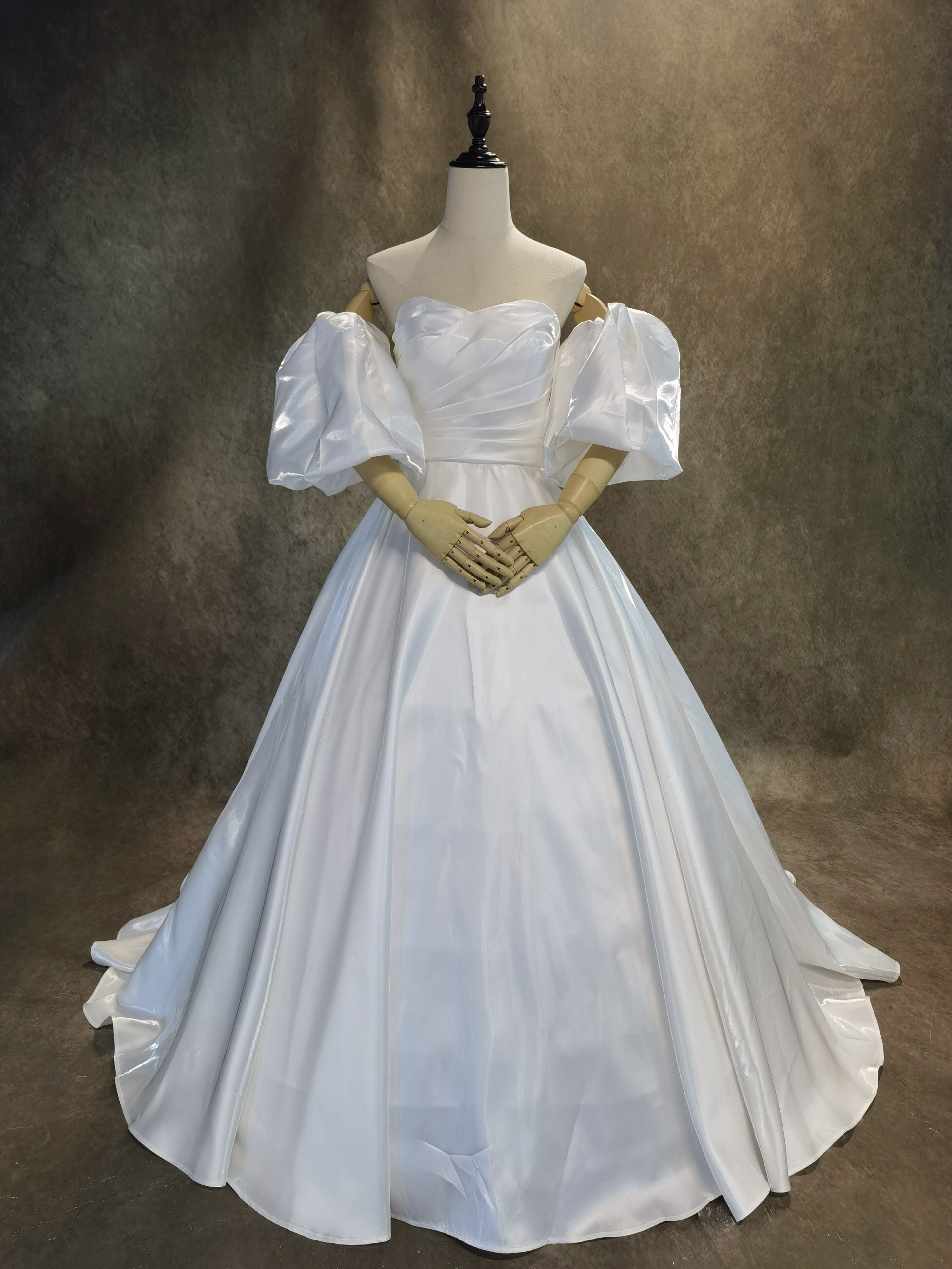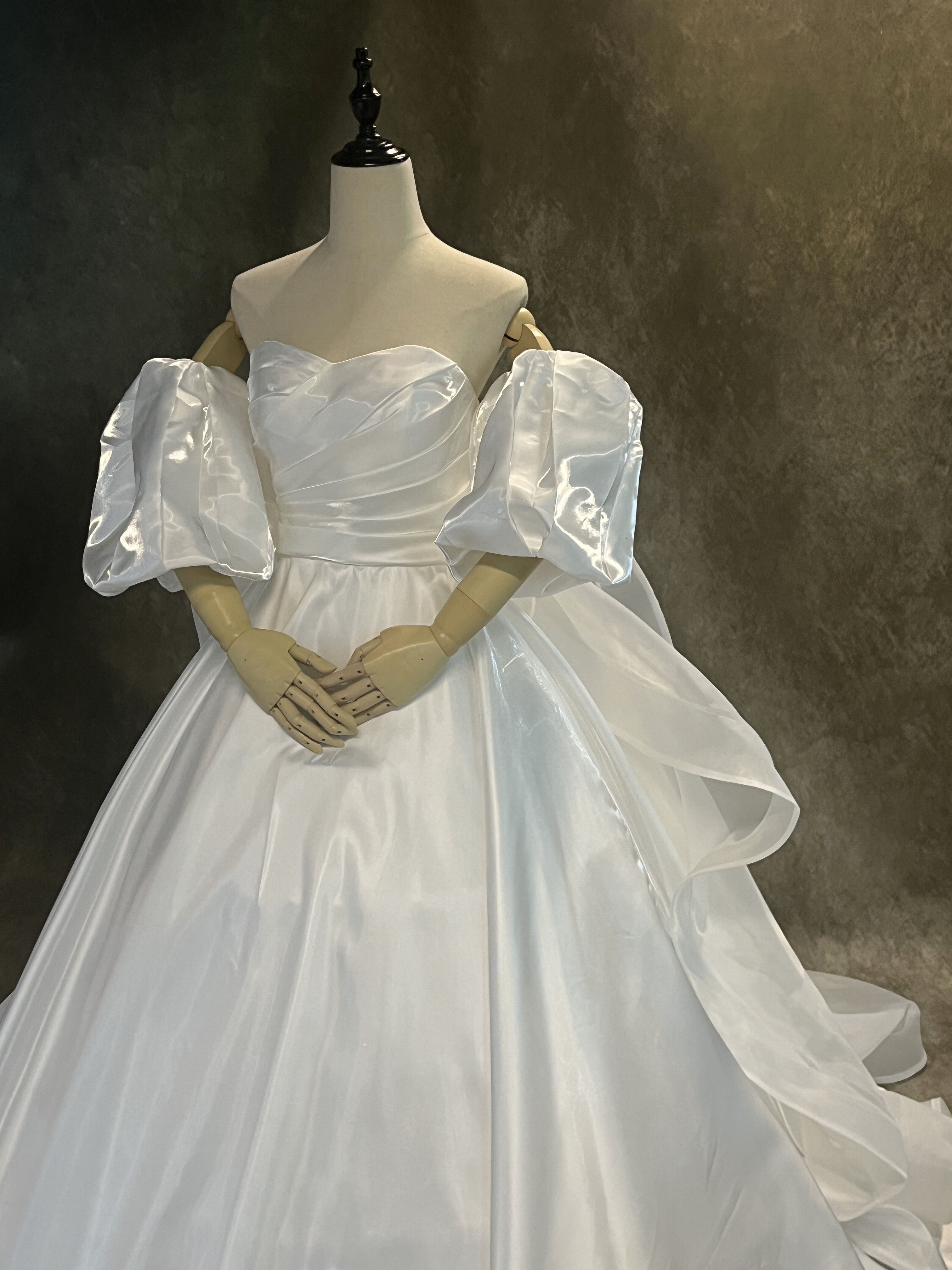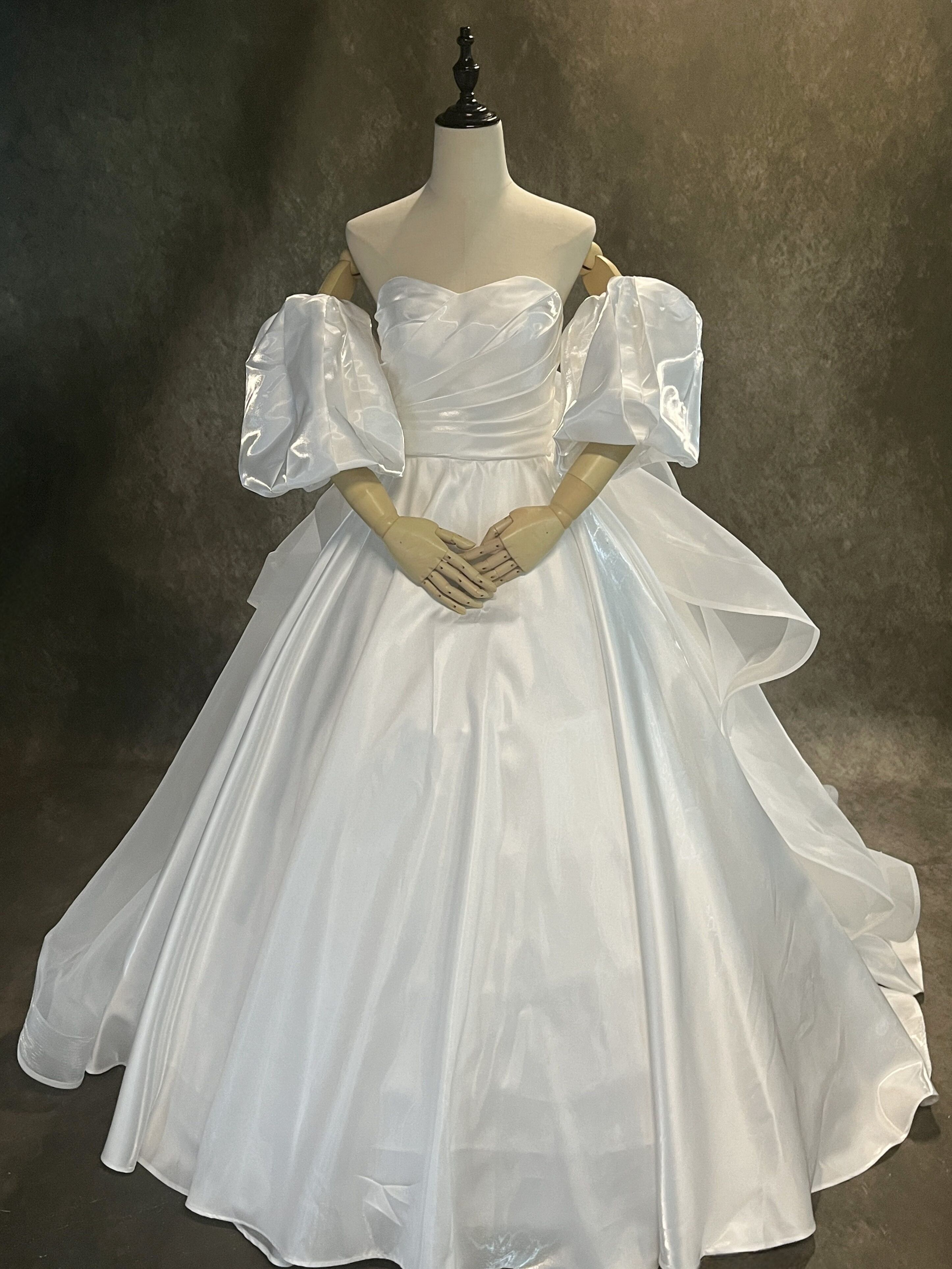 送料無料!憧れのドレス ホワイト 光沢サテン パフスリーブ ウエディングドレス 華やかなトレーン 前撮り/花嫁/