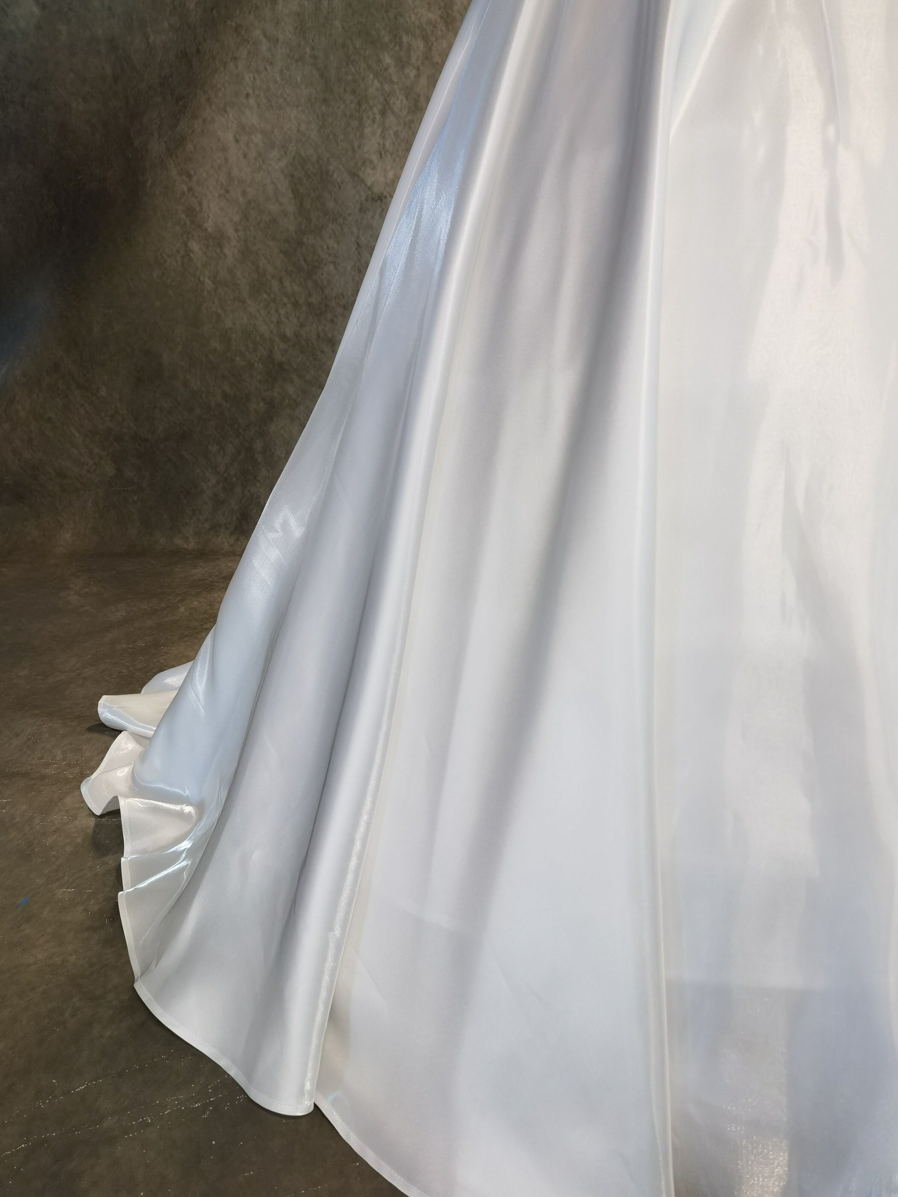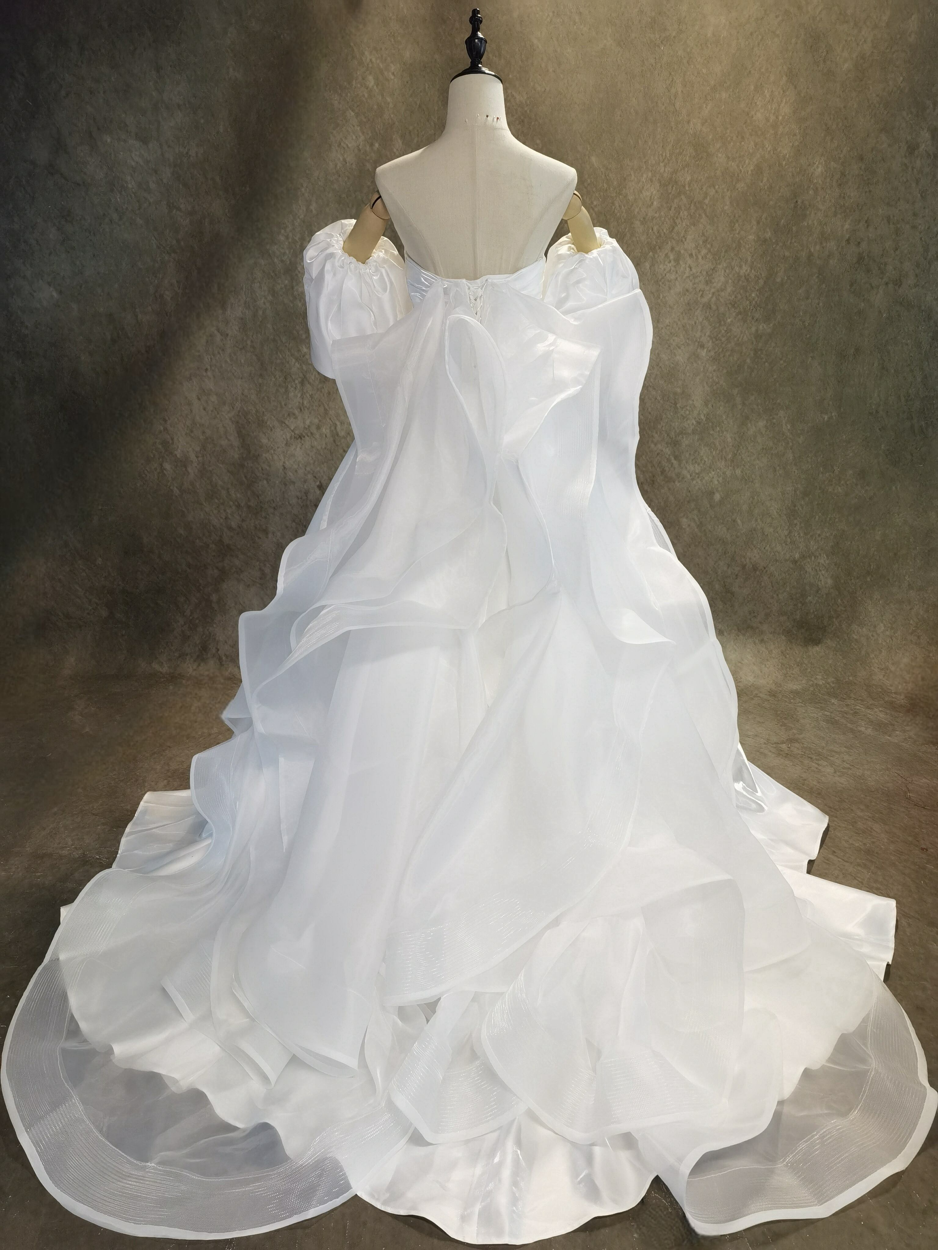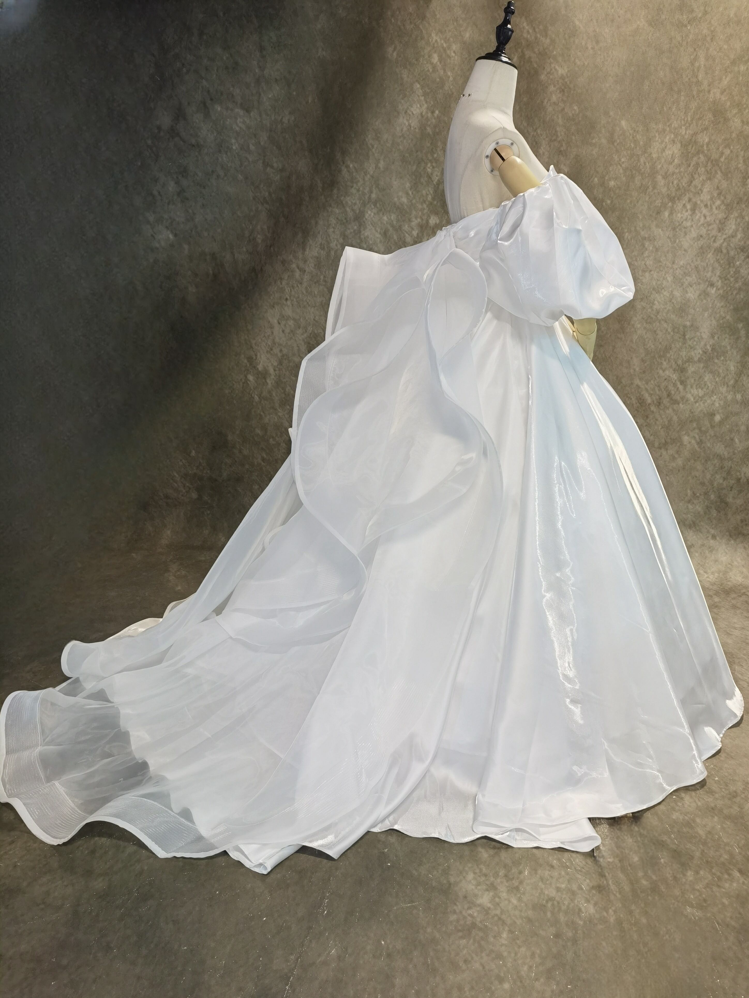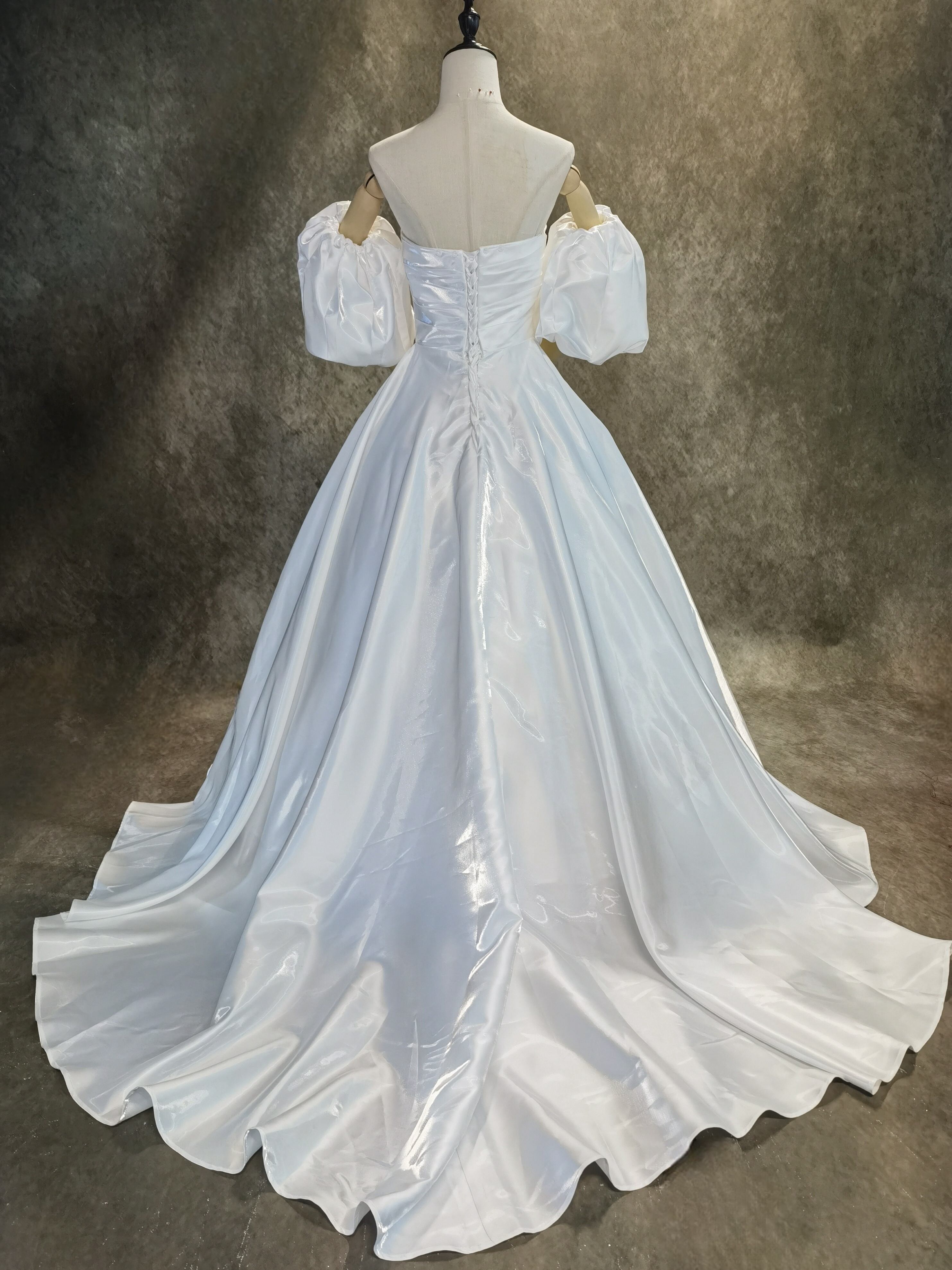 送料無料!憧れのドレス ホワイト 光沢サテン パフスリーブ ウエディングドレス 華やかなトレーン 前撮り/花嫁/