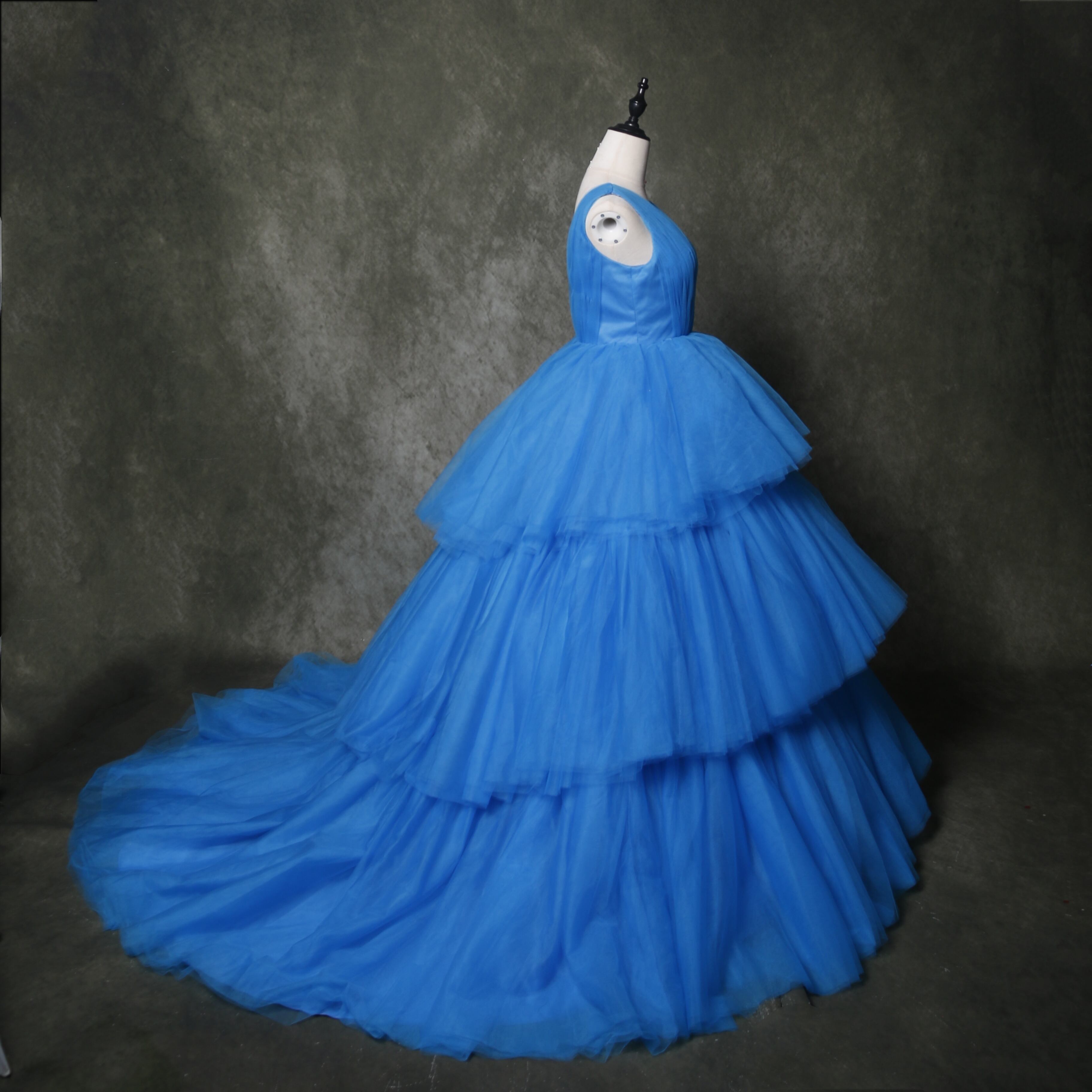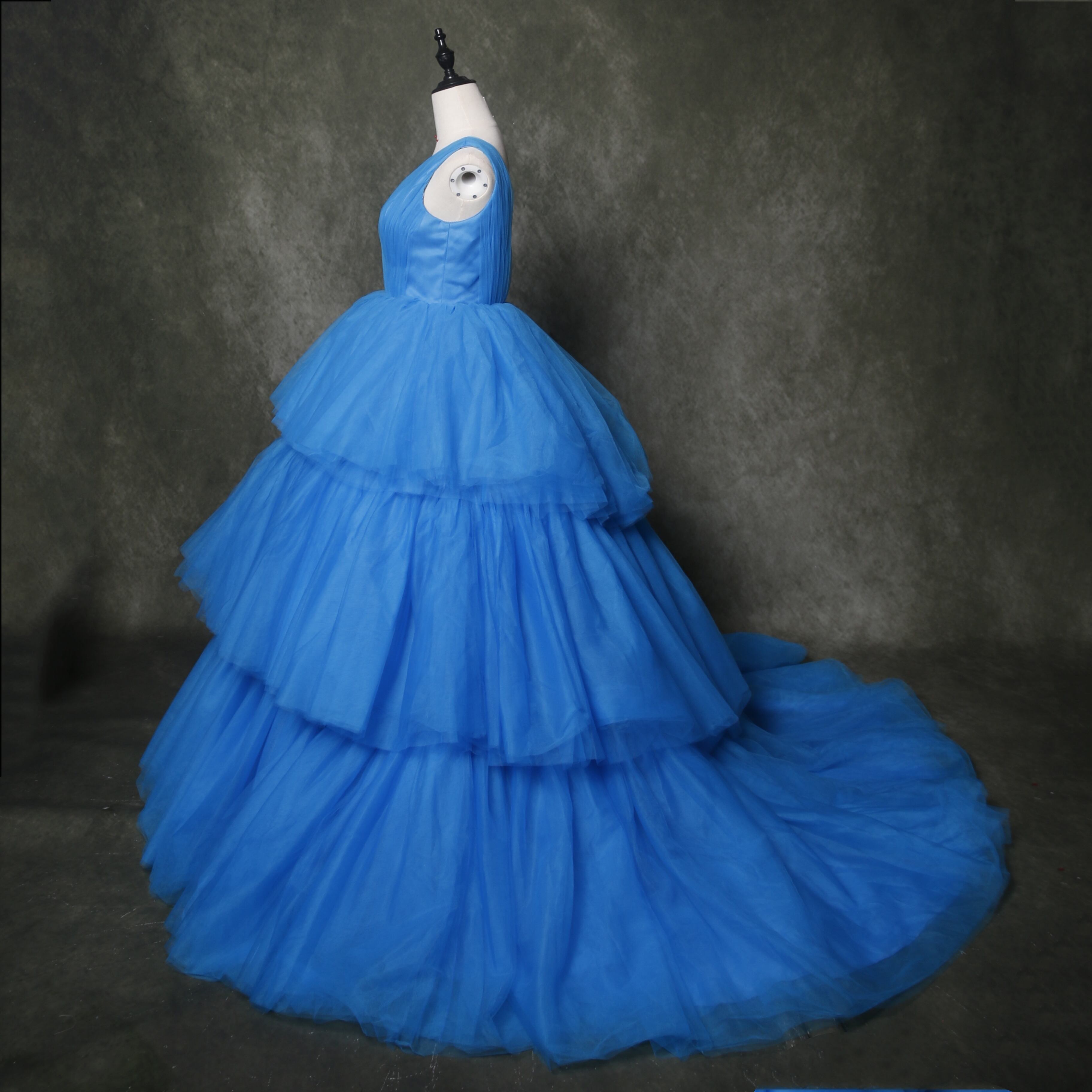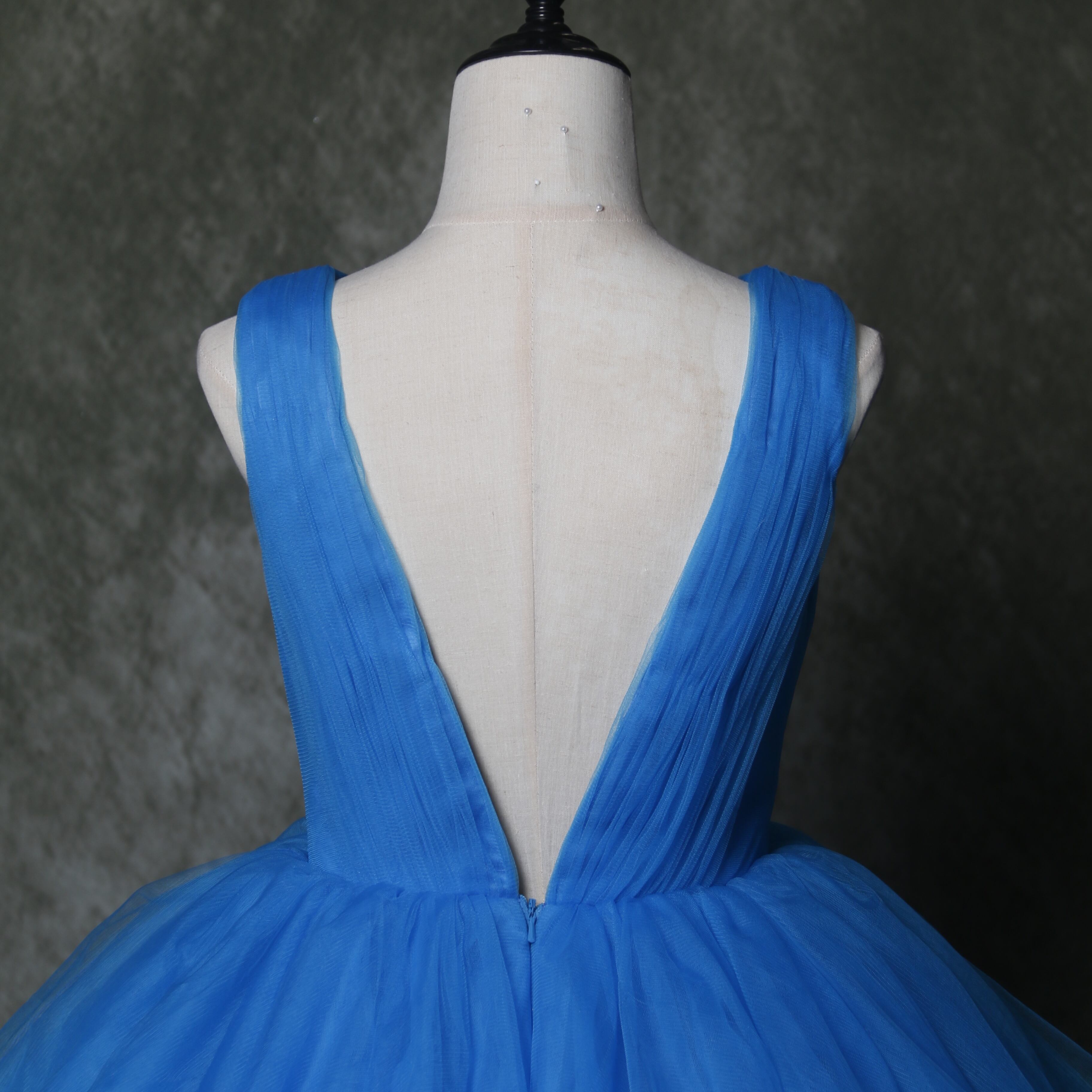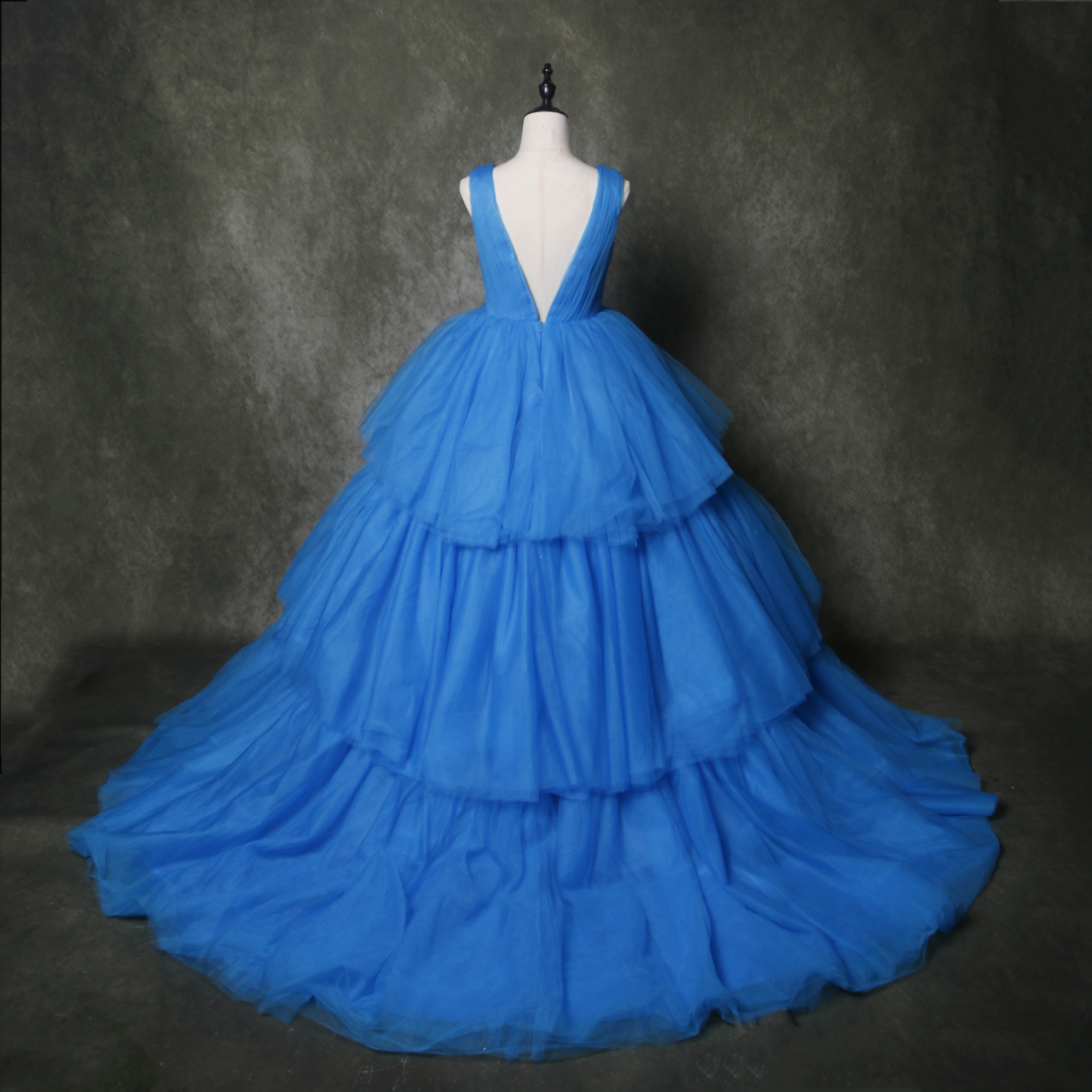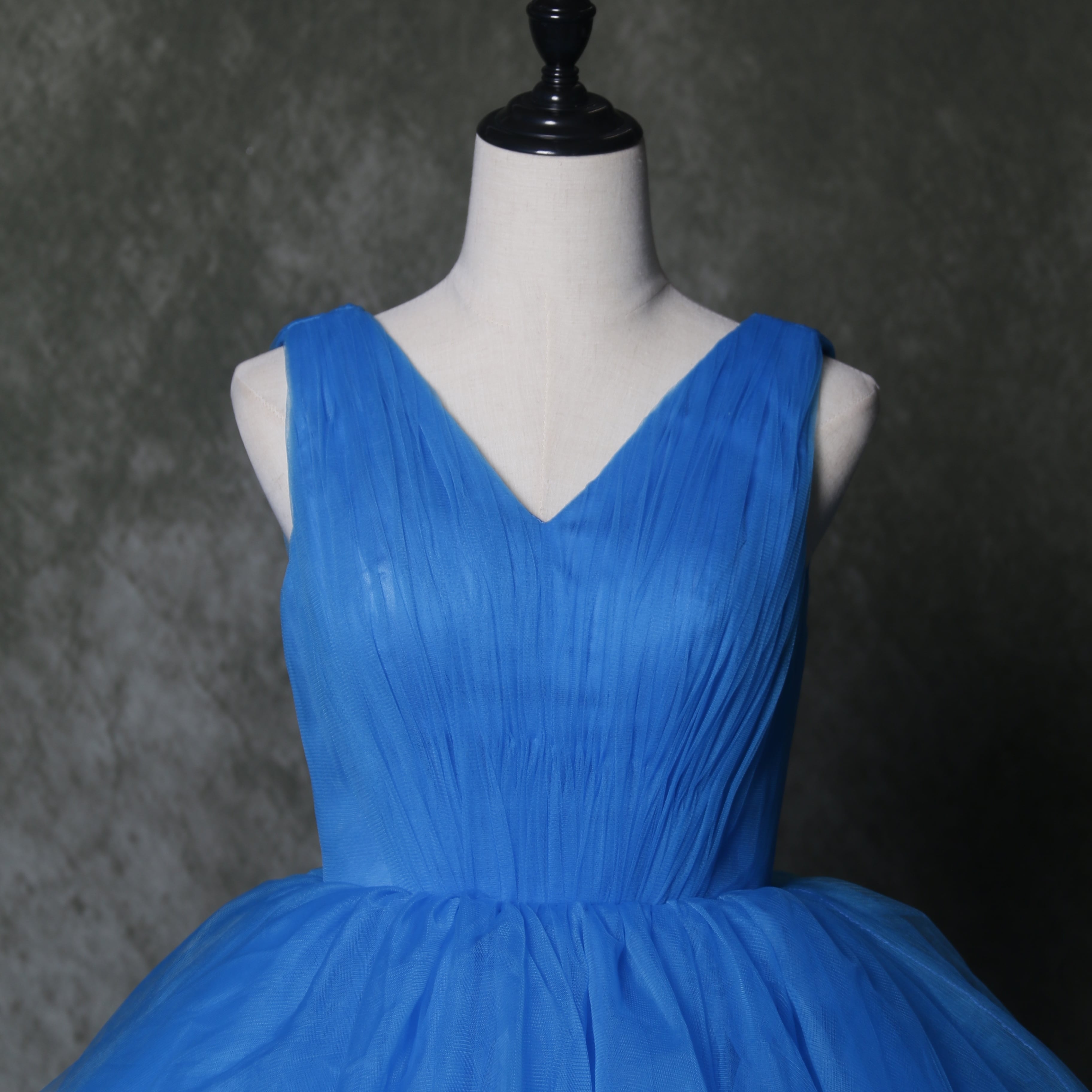送料無料! 爽やかで優しいブルー Vネック カラードレス 華やかなトレーン 柔らかく重ねたチュールスカート 前撮り/花嫁/