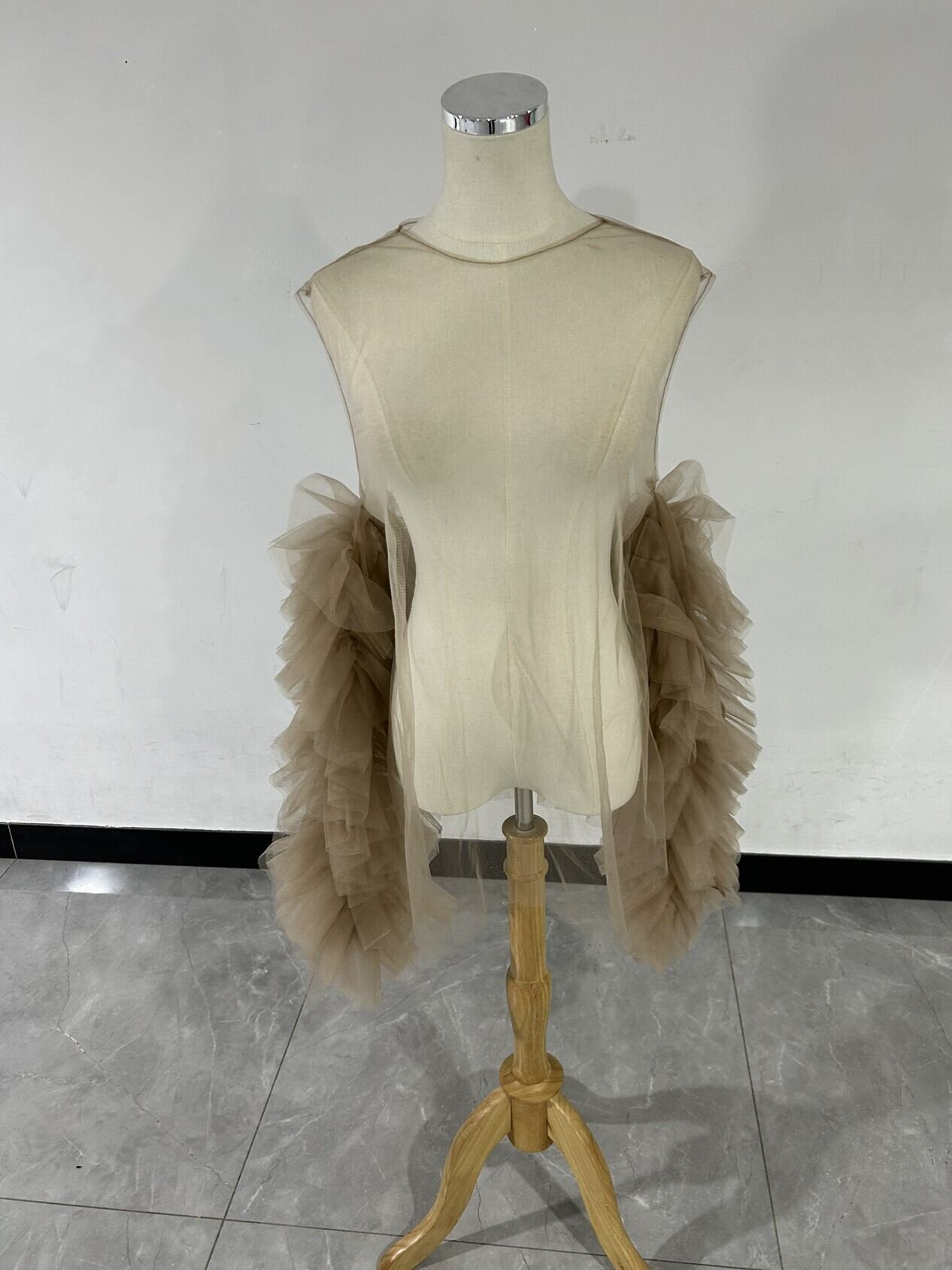 送料無料!フェミニンなフレームレースの袖トップス + ソフトチュール ポンチョ ベージュ