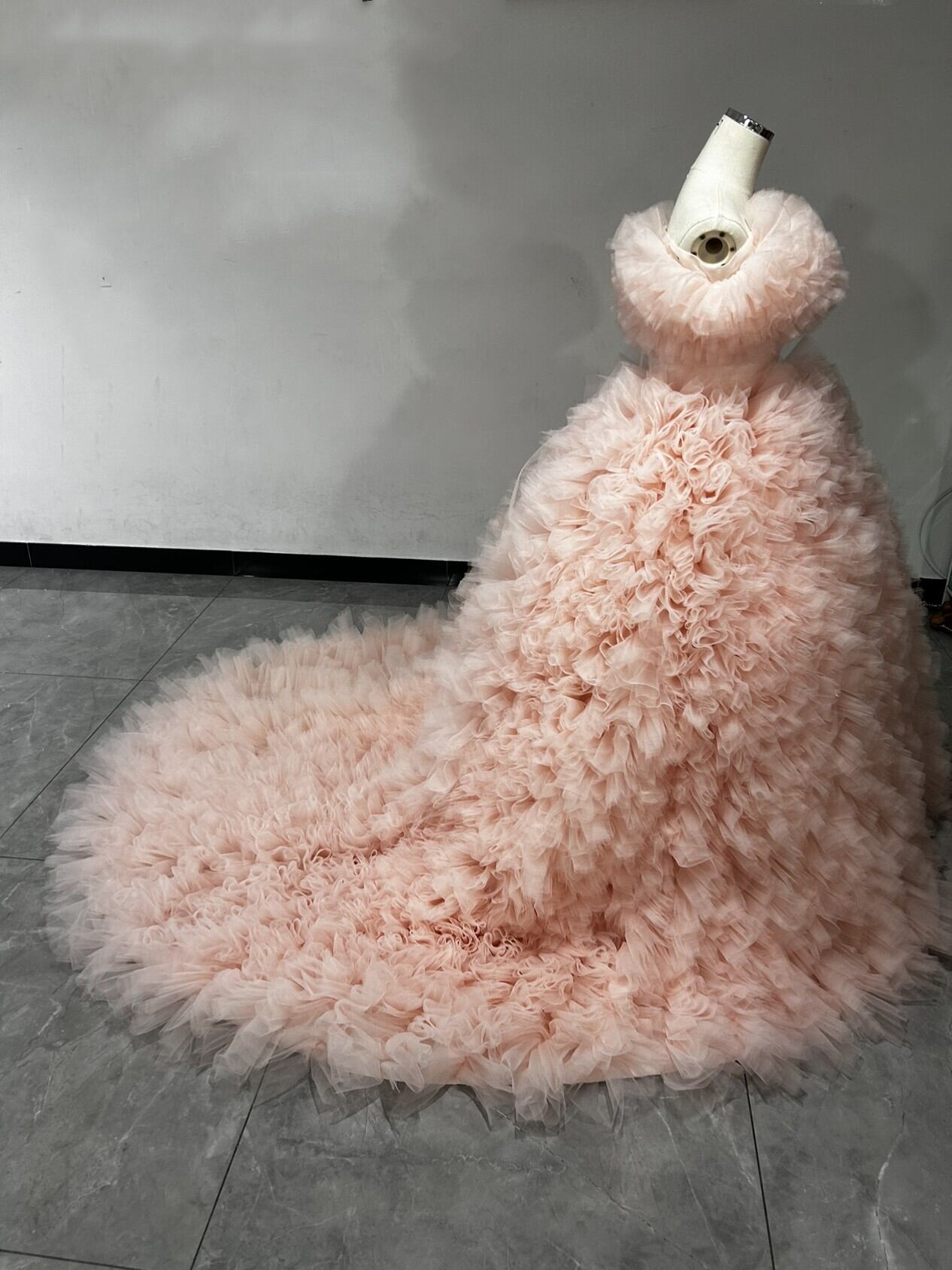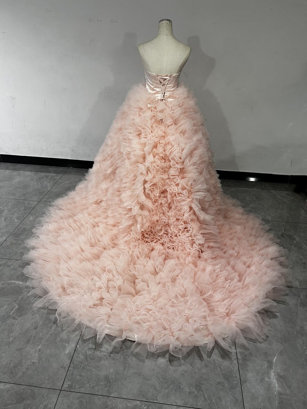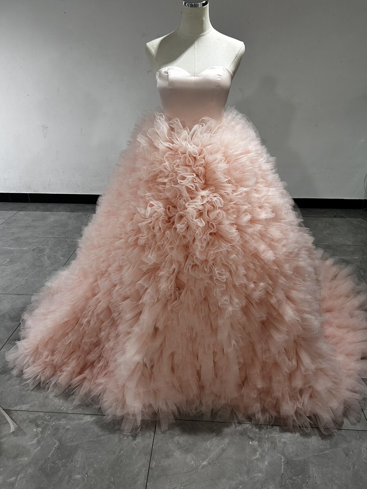 高品質! ウエディングドレス 薄ピンク ソフトチュール 柔らかく重ねたチュールスカート 結婚式/披露宴