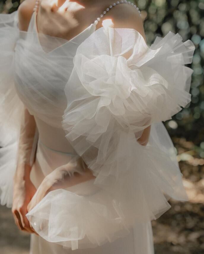 抜群のおしゃれ見えパーティードレスホワイトトレーン シアーな美しさ ポンチョ + ソフトチュール ポンチョ演奏会