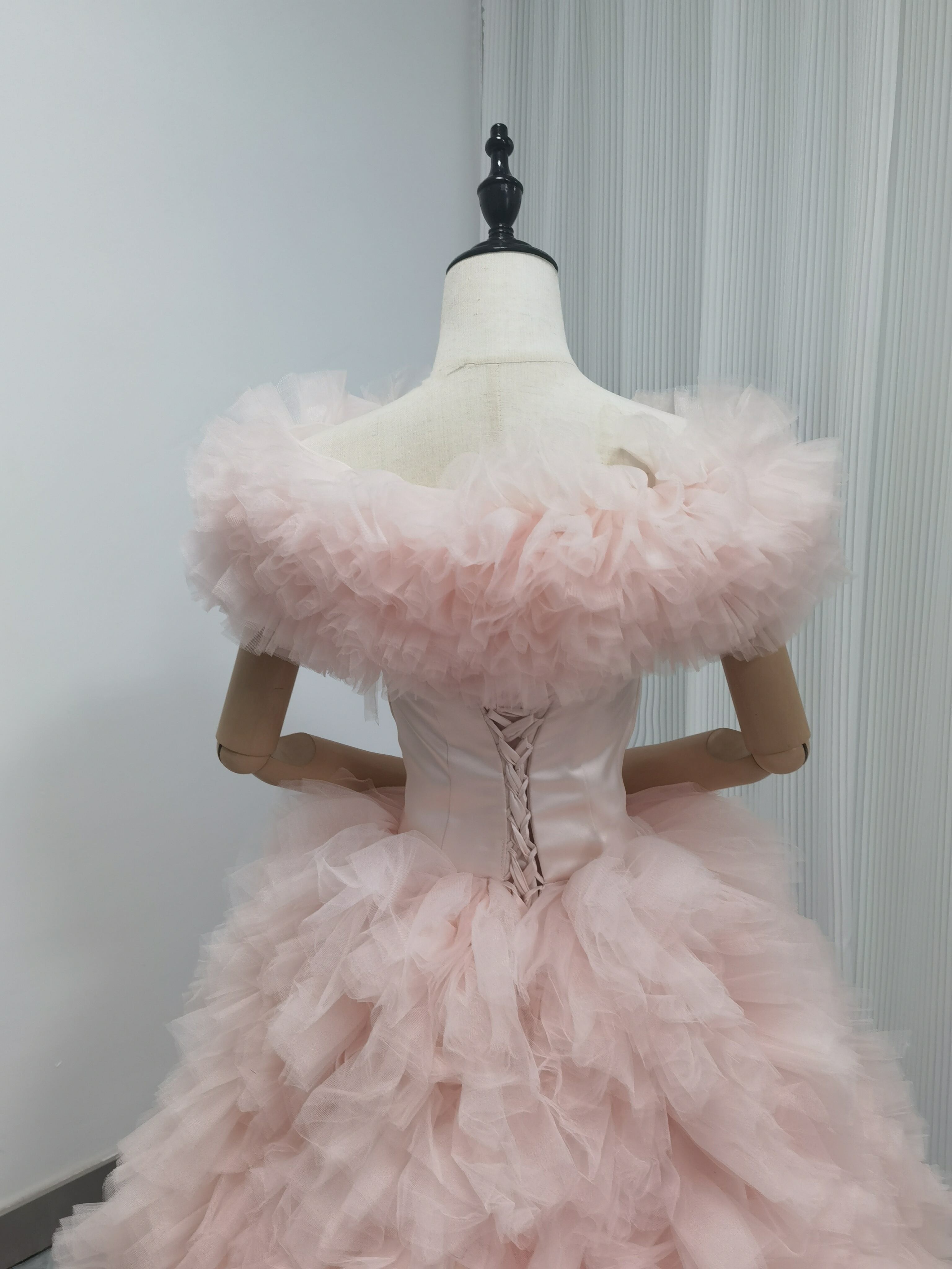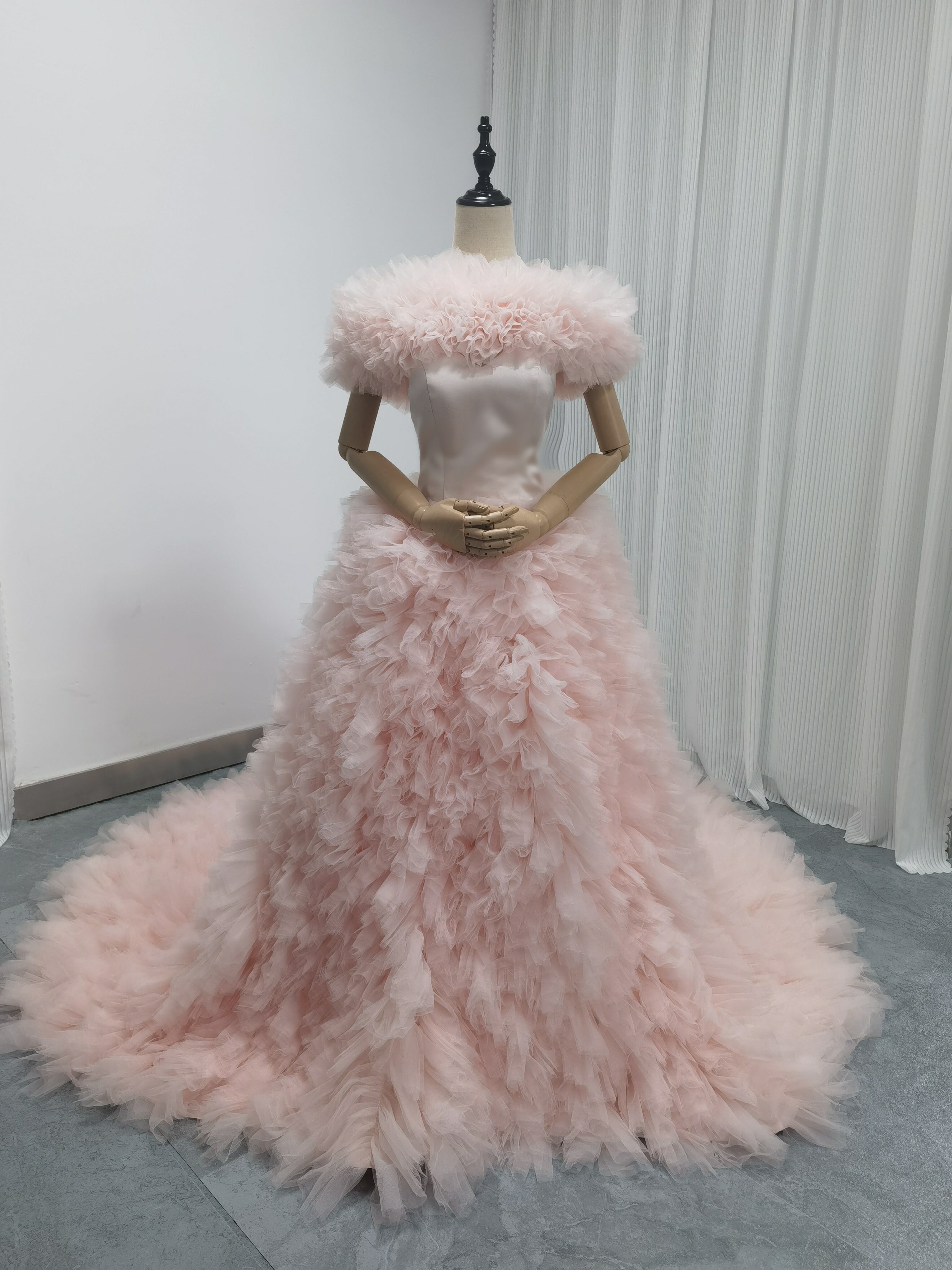 高品質!カラードレス 薄ピンク ソフトチュール 柔らかく重ねたチュールスカート 結婚式/披露宴