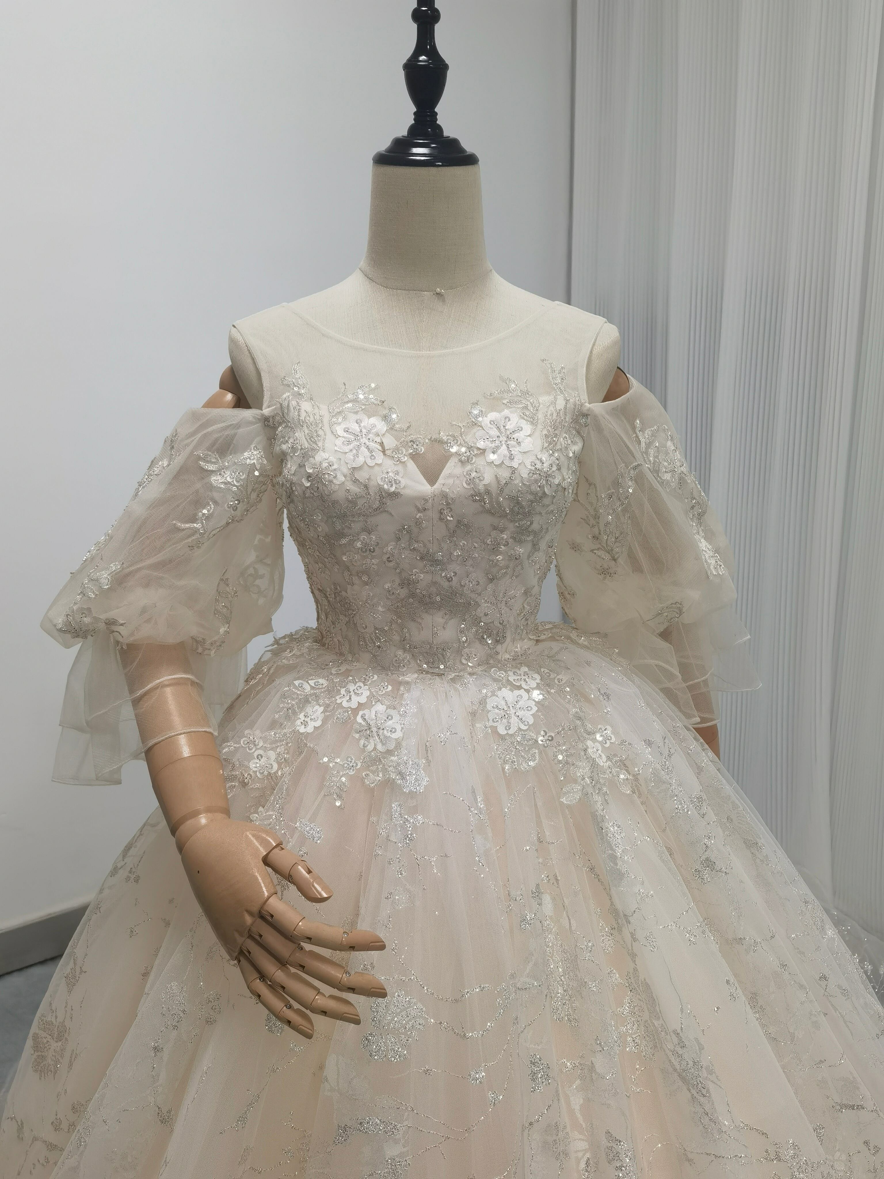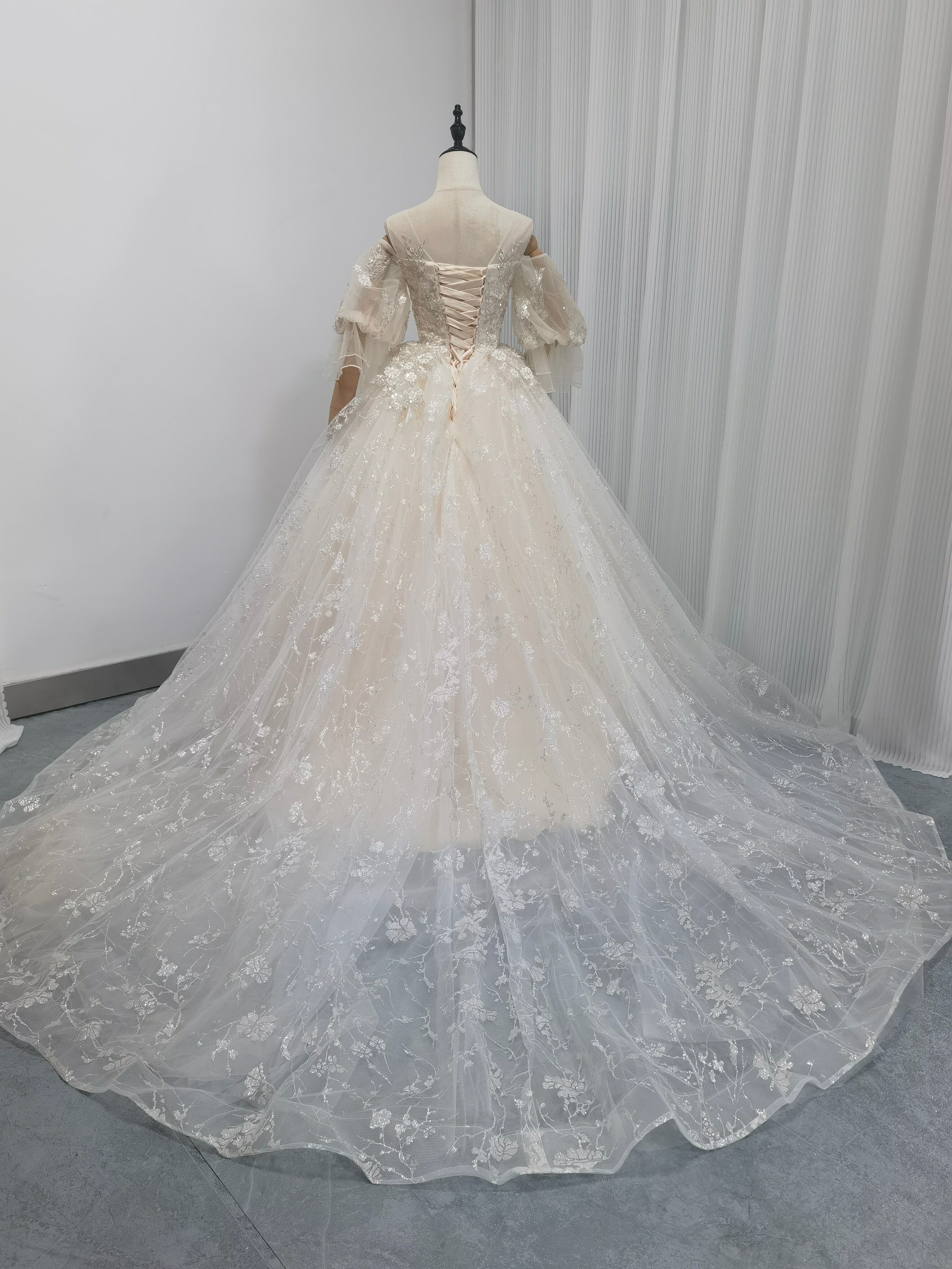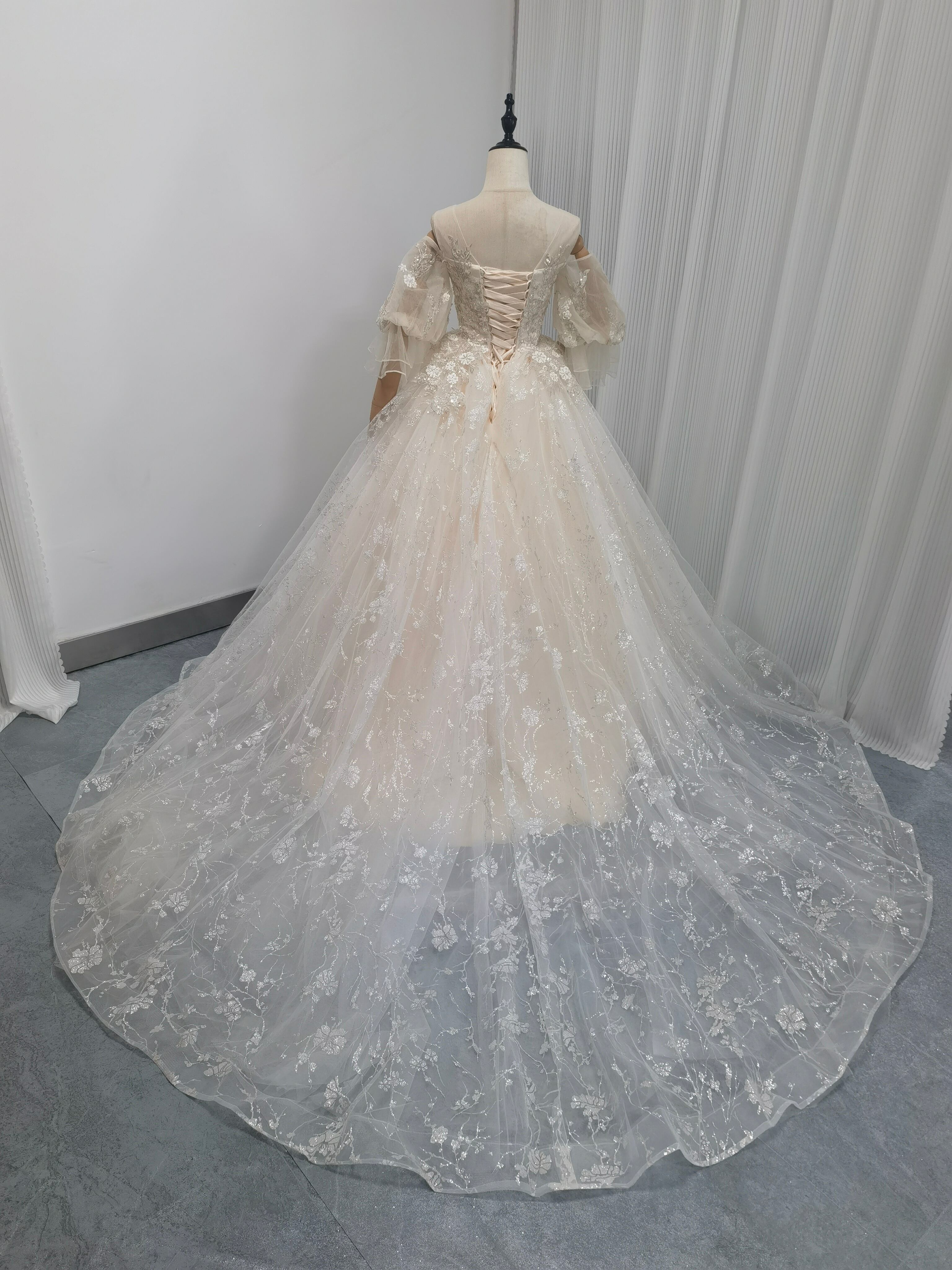 送料無料!豪華!カラードレスキラキラスパンコール 薄シャンパンの色贅沢な小花総レースふわふわ袖 華やかなトレー/結婚