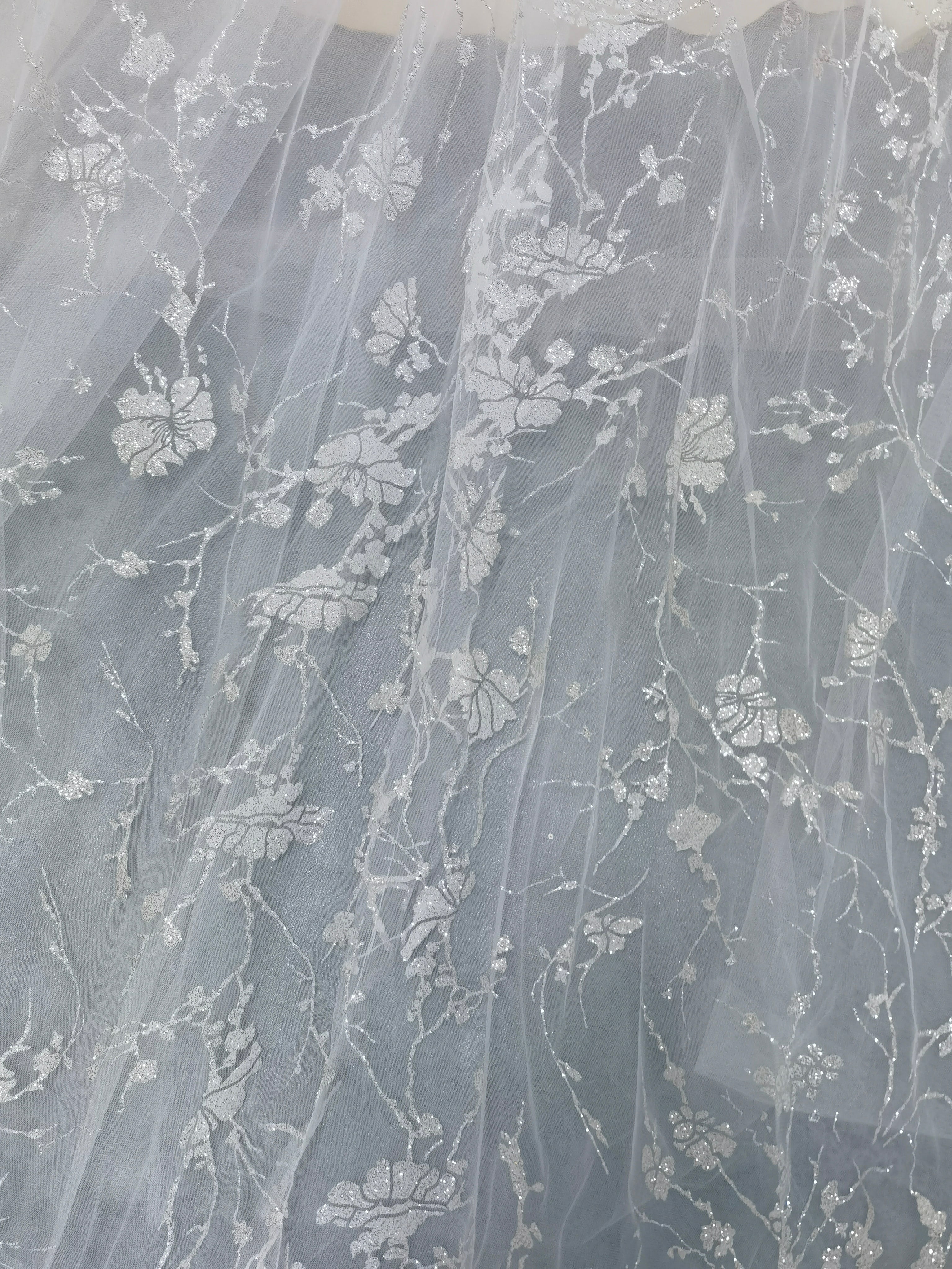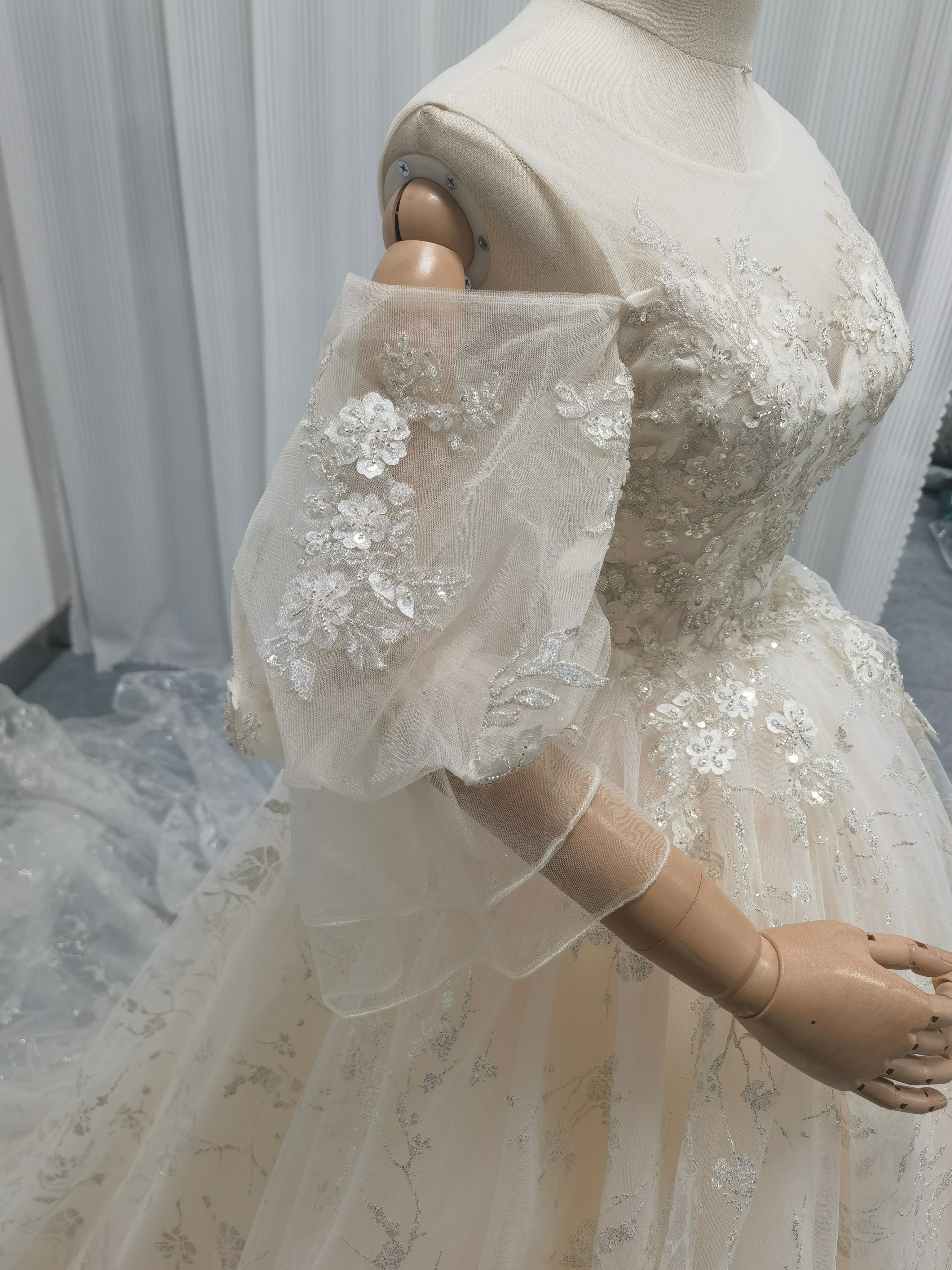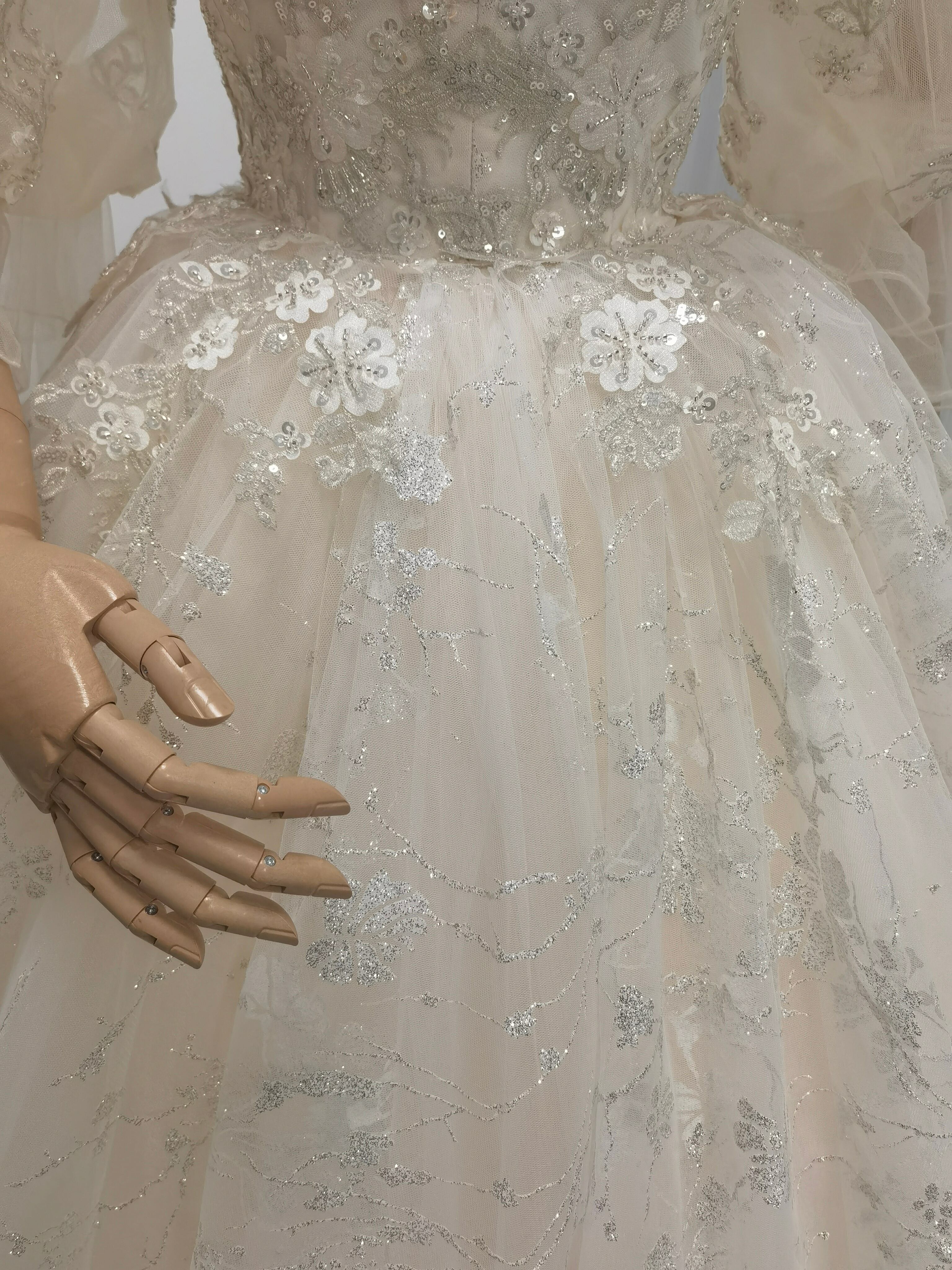送料無料!豪華!カラードレスキラキラスパンコール 薄シャンパンの色贅沢な小花総レースふわふわ袖 華やかなトレー/結婚