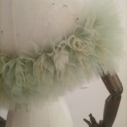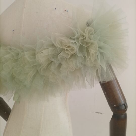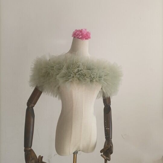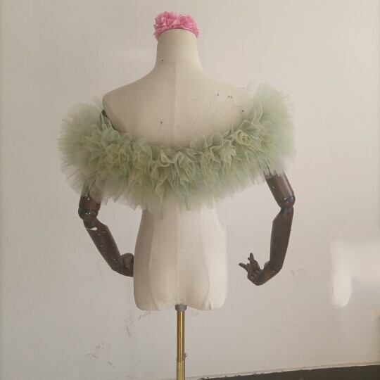 送料無料! 人気上昇! グリーン ポンチョ ソフトチュール ラッフルフリル  取り外しオフショルダー