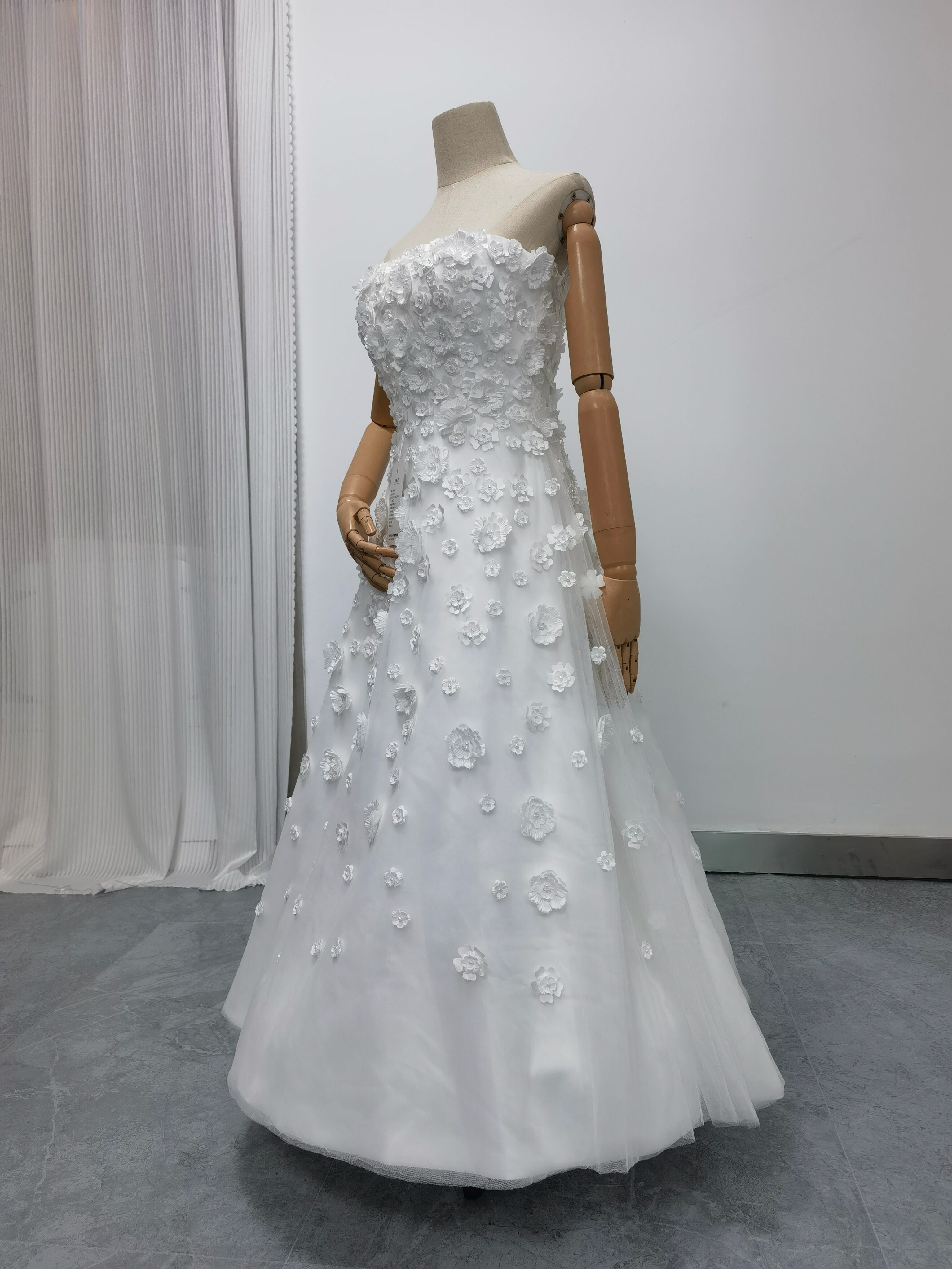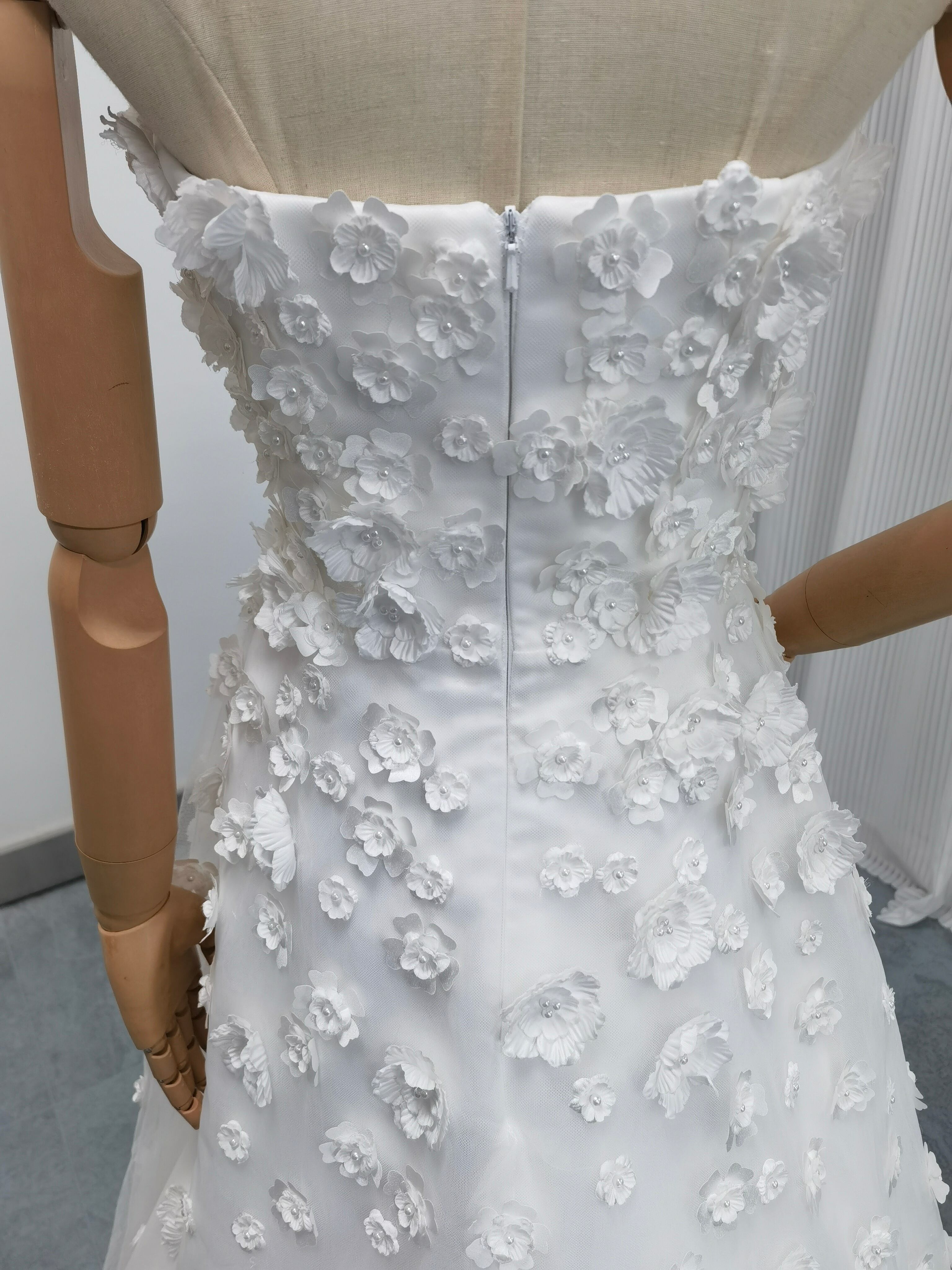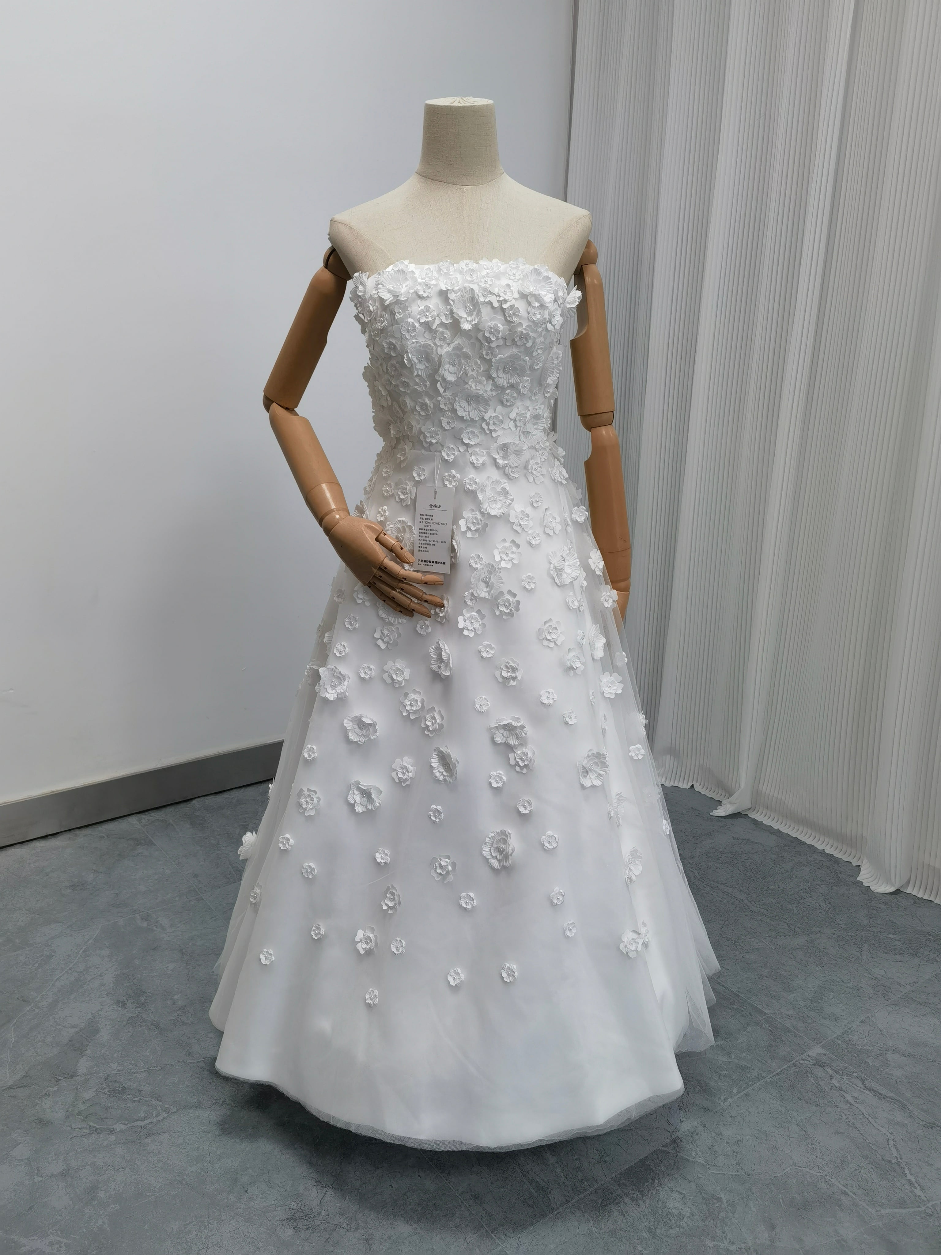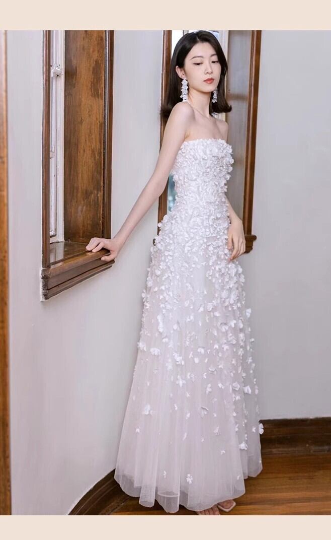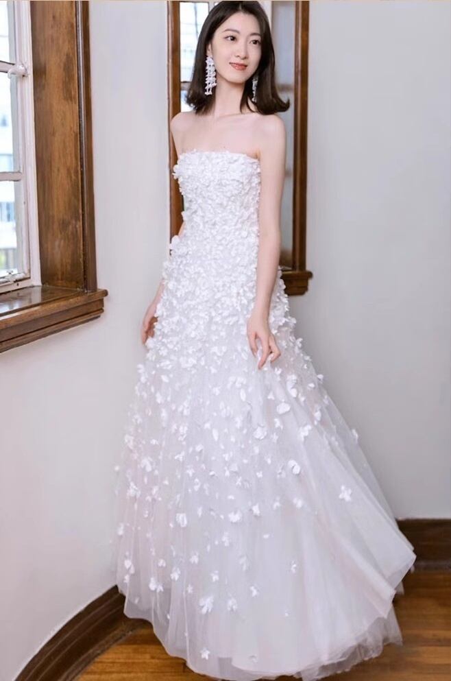 送料無料! ホワイト ベアトップ パール ウエディングドレス パーティードレス 前撮り 挙式