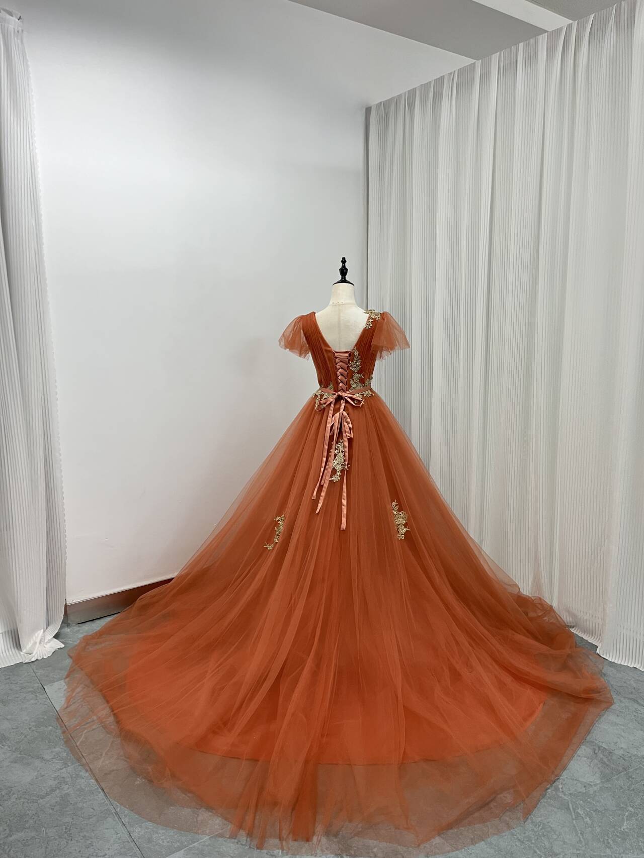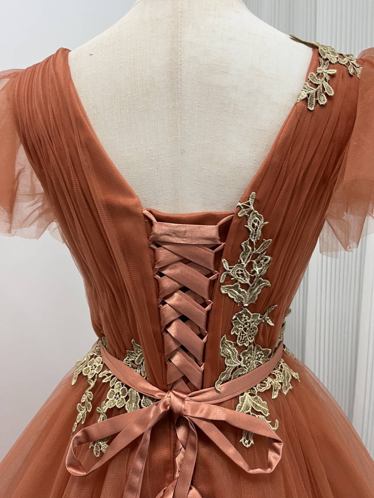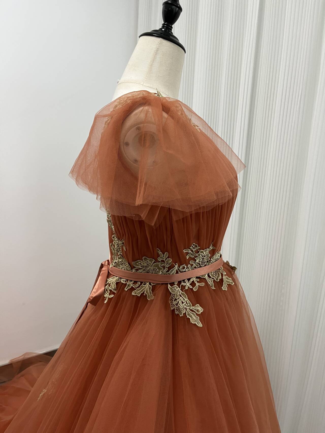 送料無料 !テラコッタ色 3D立体レース刺繍 長袖 カラードレ 華やかなトレーン 前撮り/花嫁/結婚式/