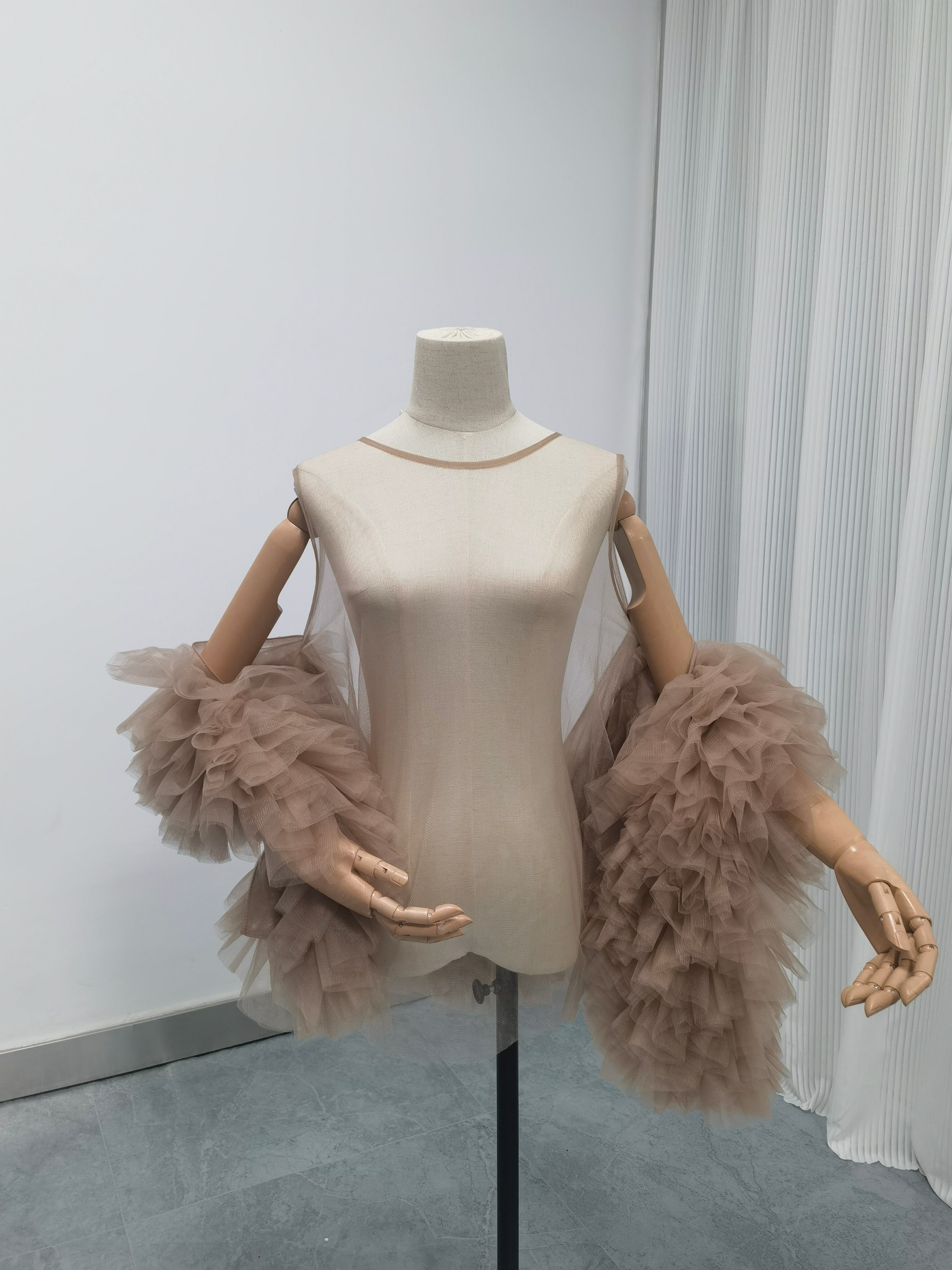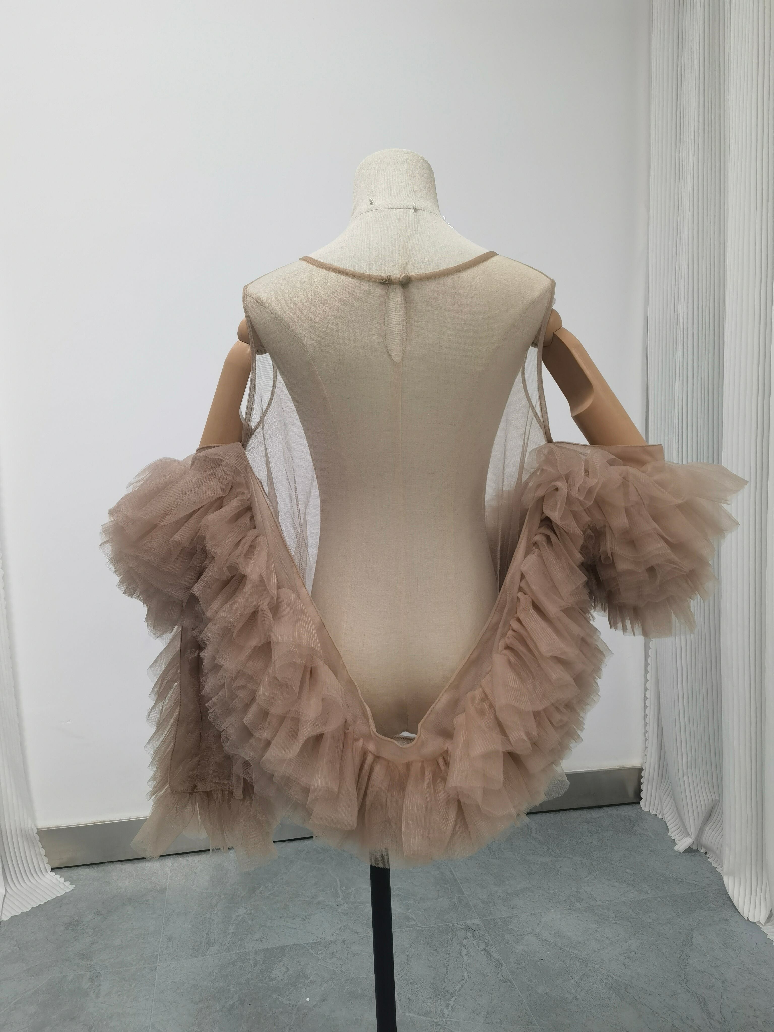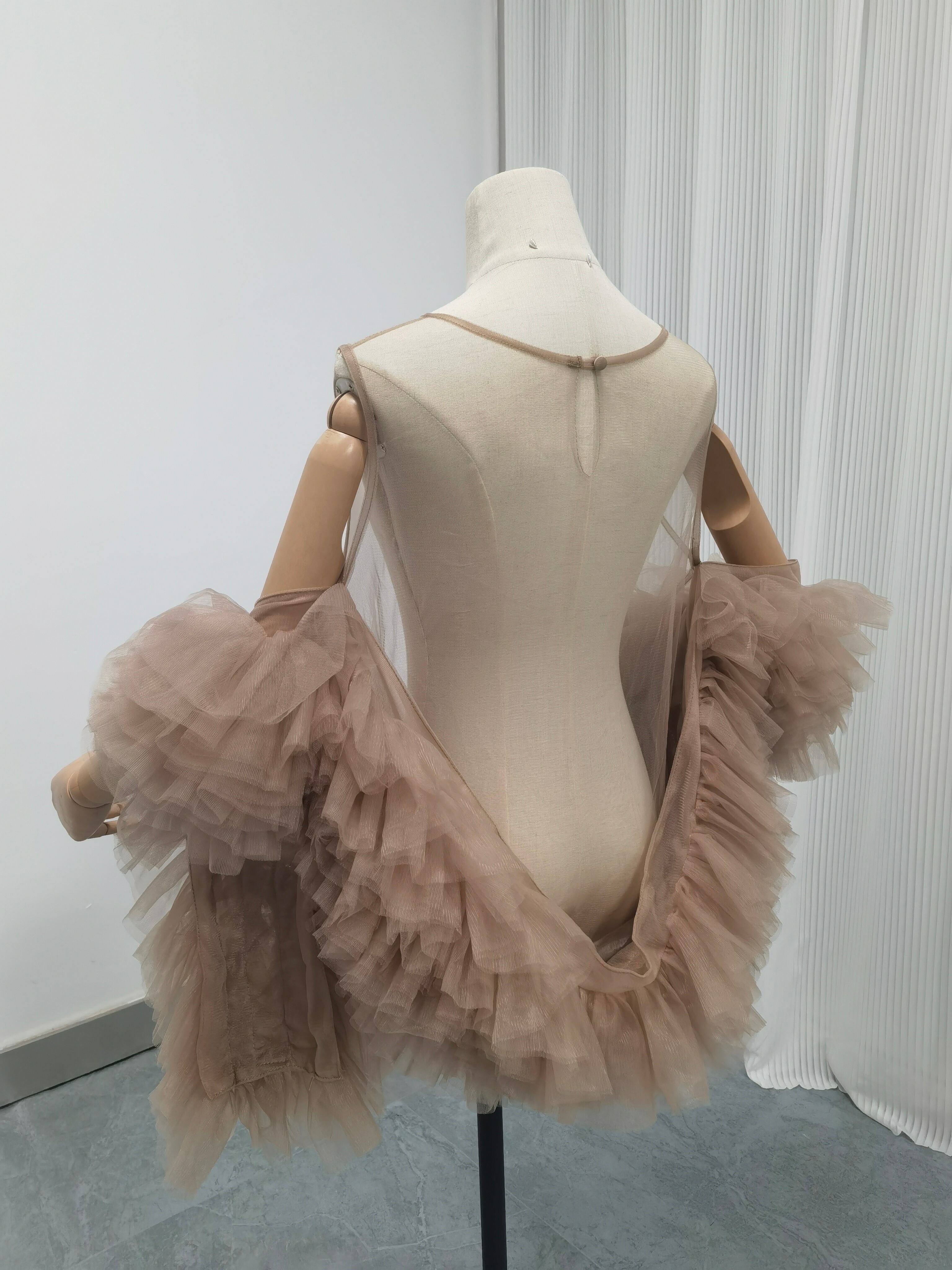 送料無料!フェミニンなフレームレースの袖トップス + シャンパン色 ソフトチュール ポンチョ