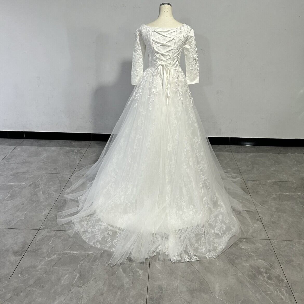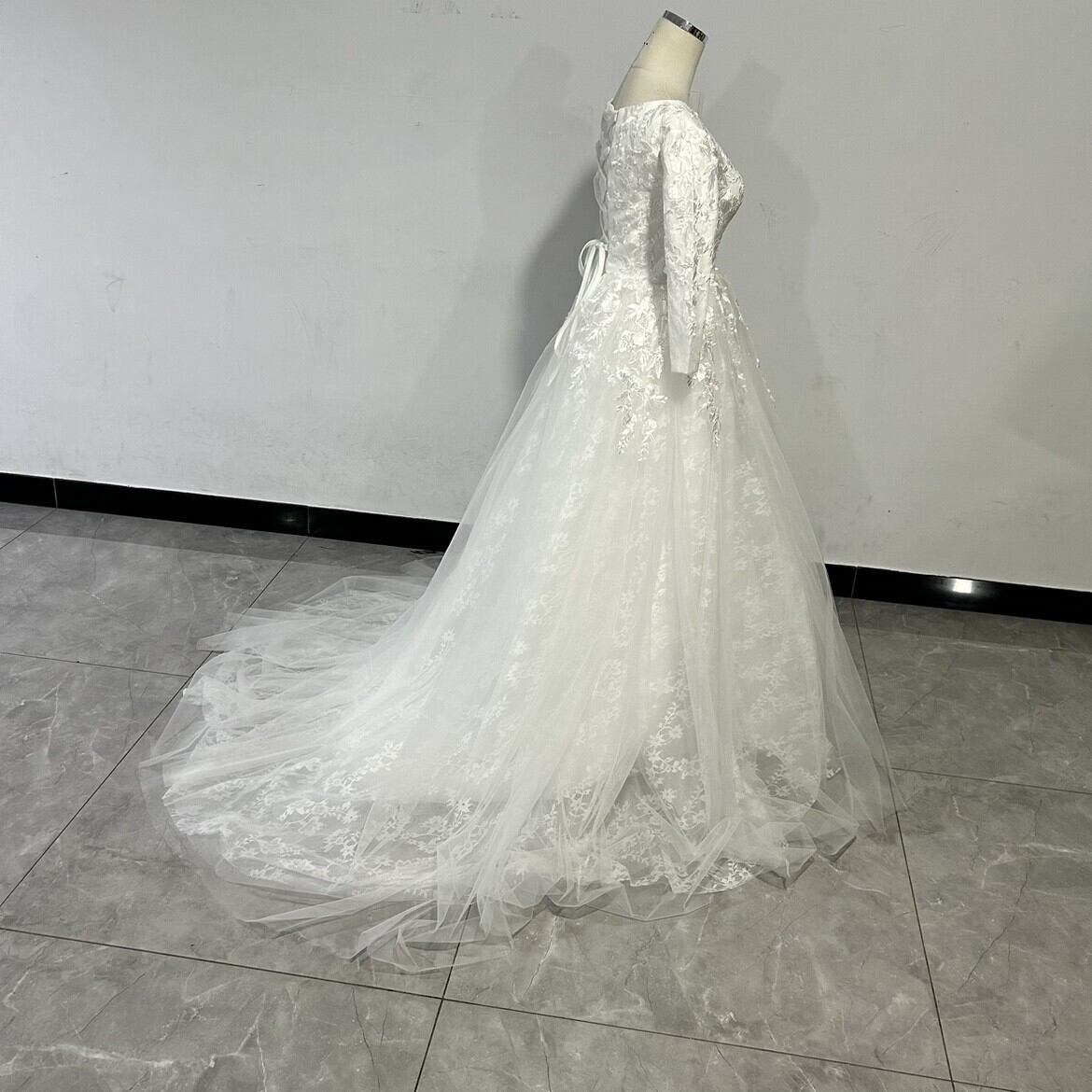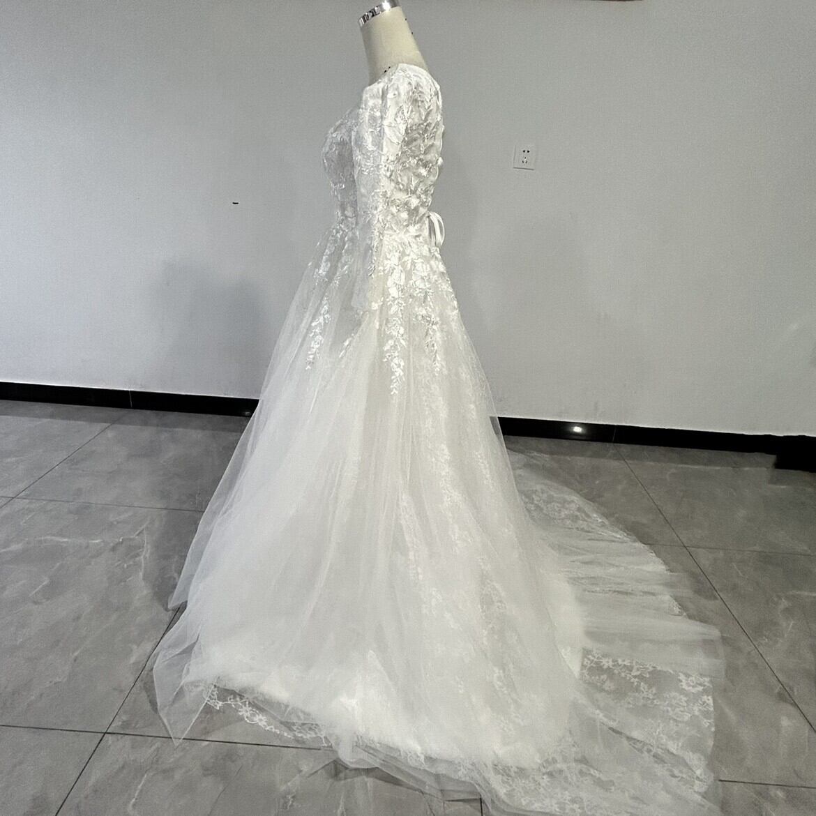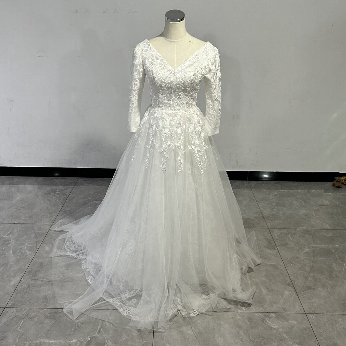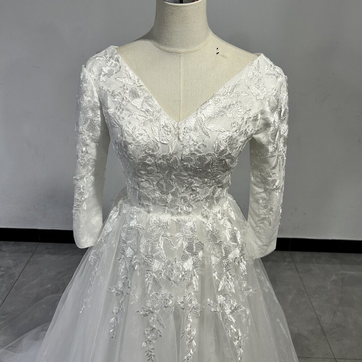 送料無料!雅やか Vネック ホワイト 上品レース ウエディングドレス 長袖 パーティードレス 結婚式/披露宴/
