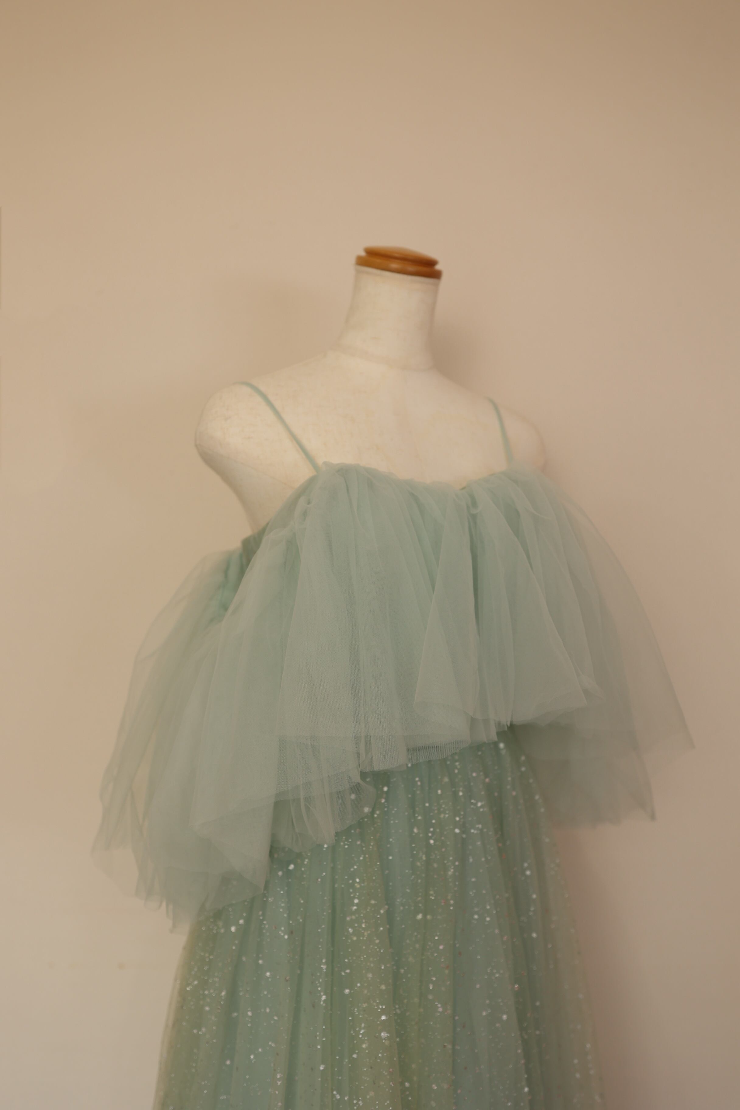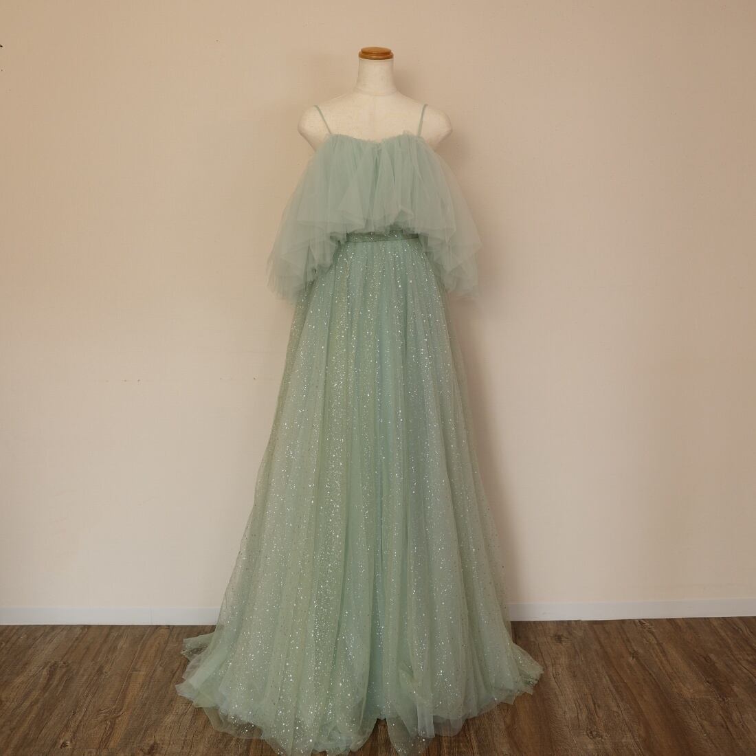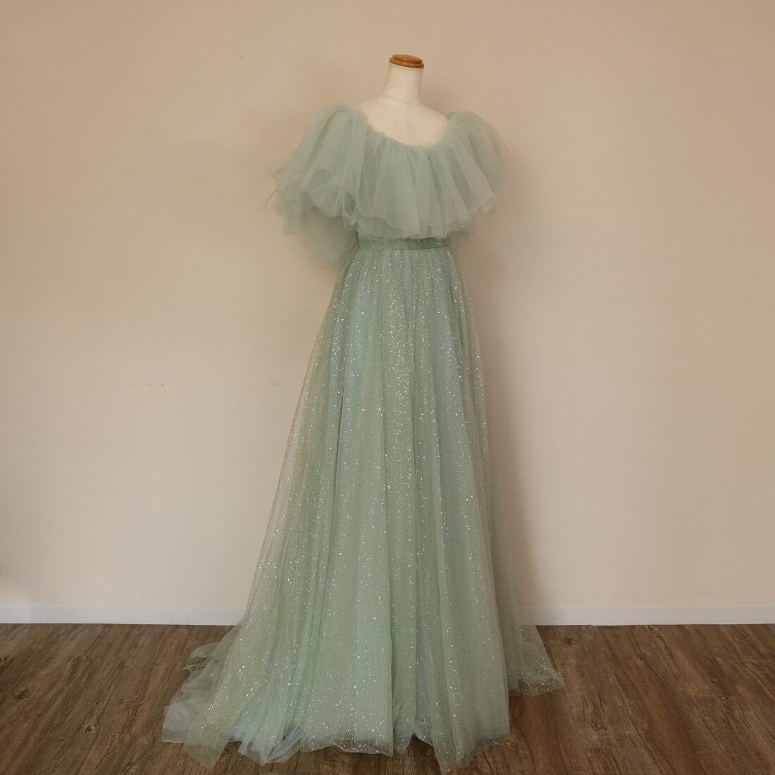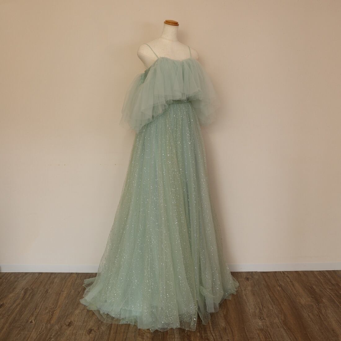 高品質! グリーン オフショルダー キラキラグリッターチュール カラードレス 披露宴/拳式