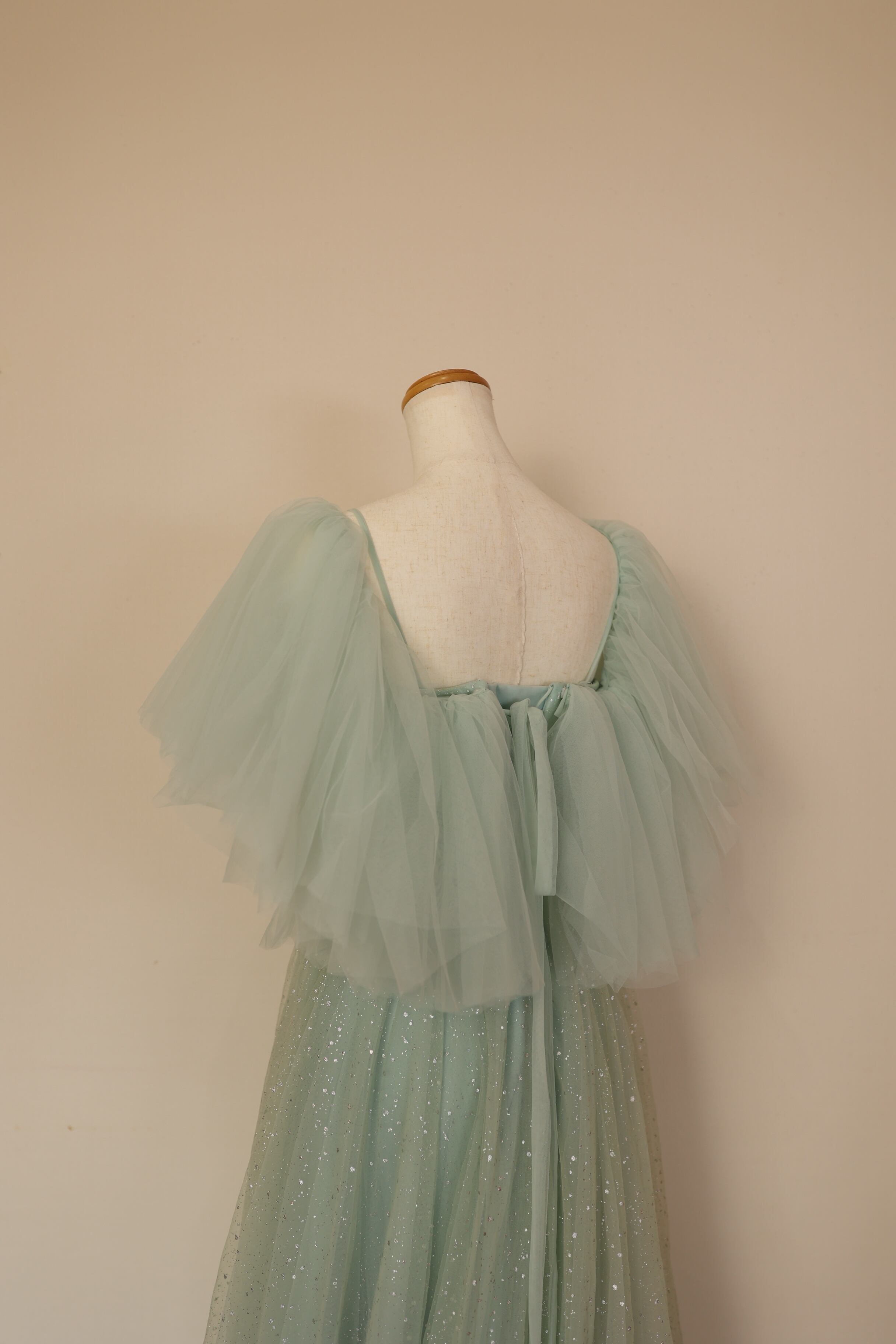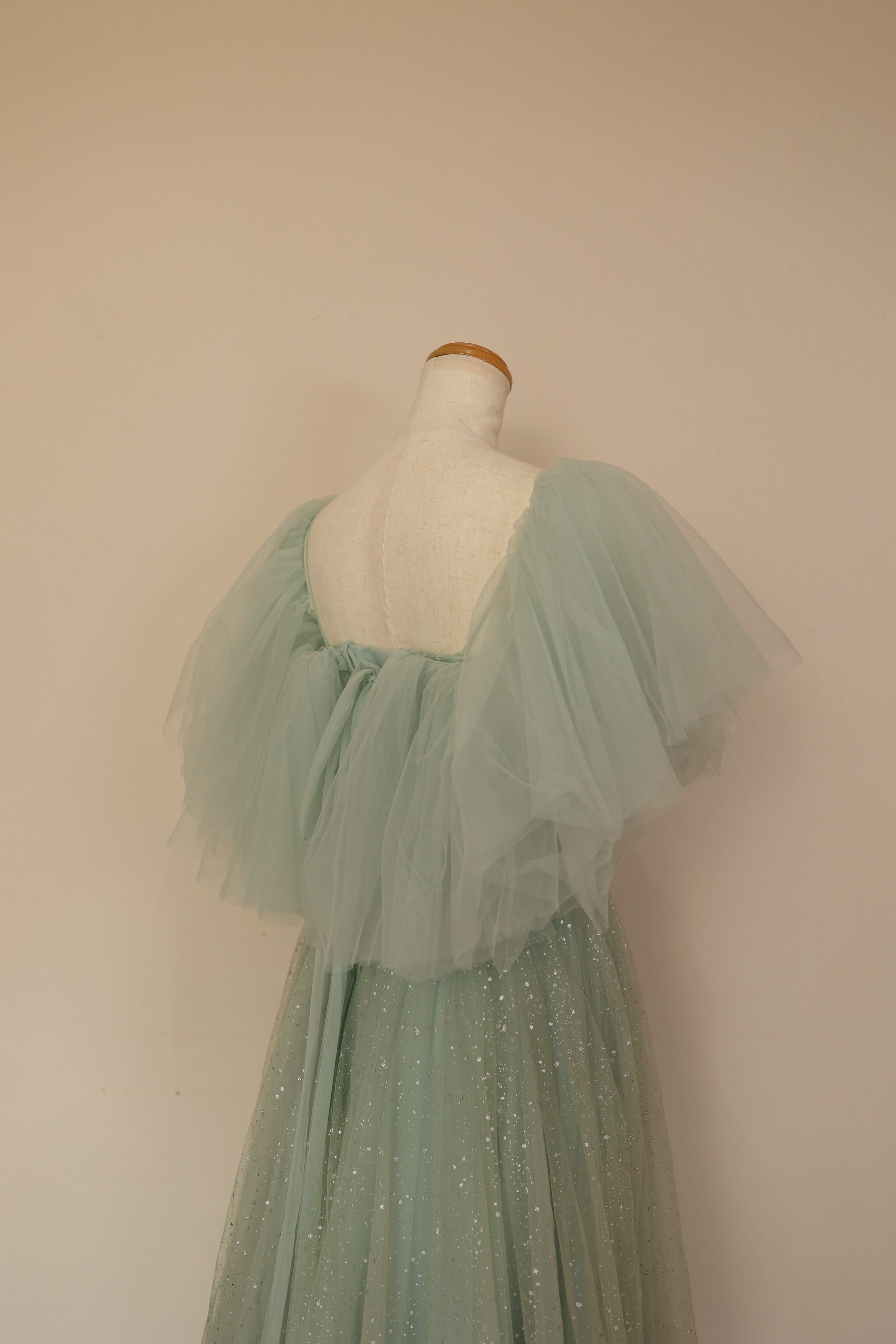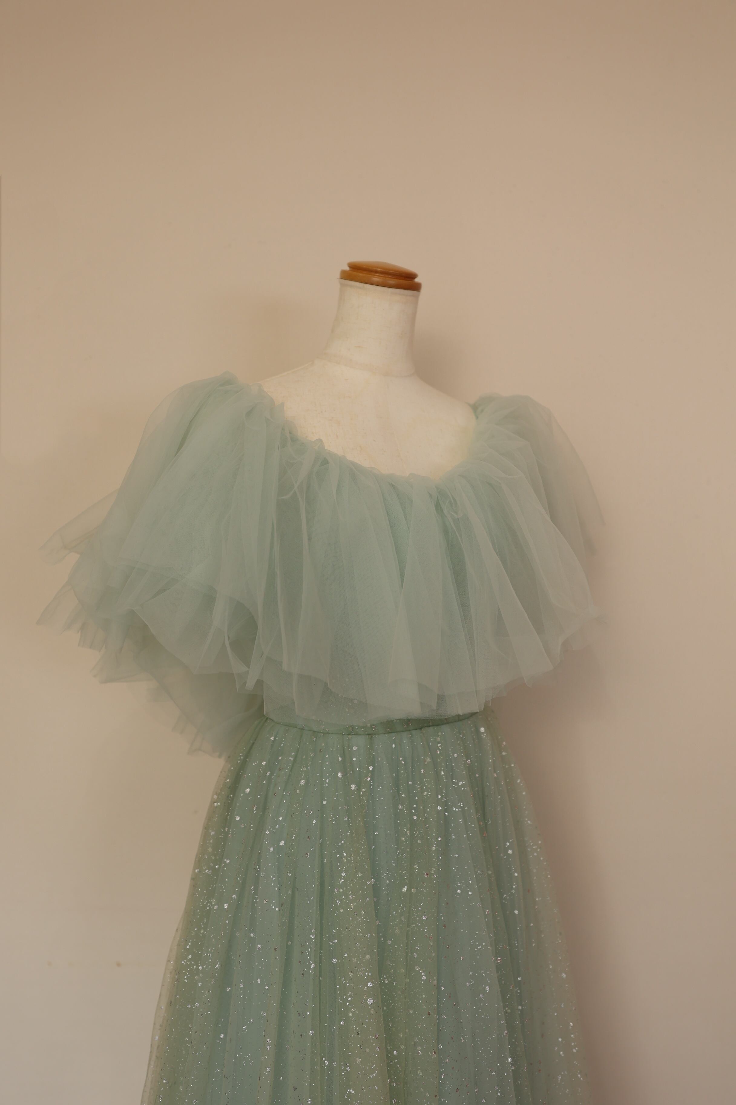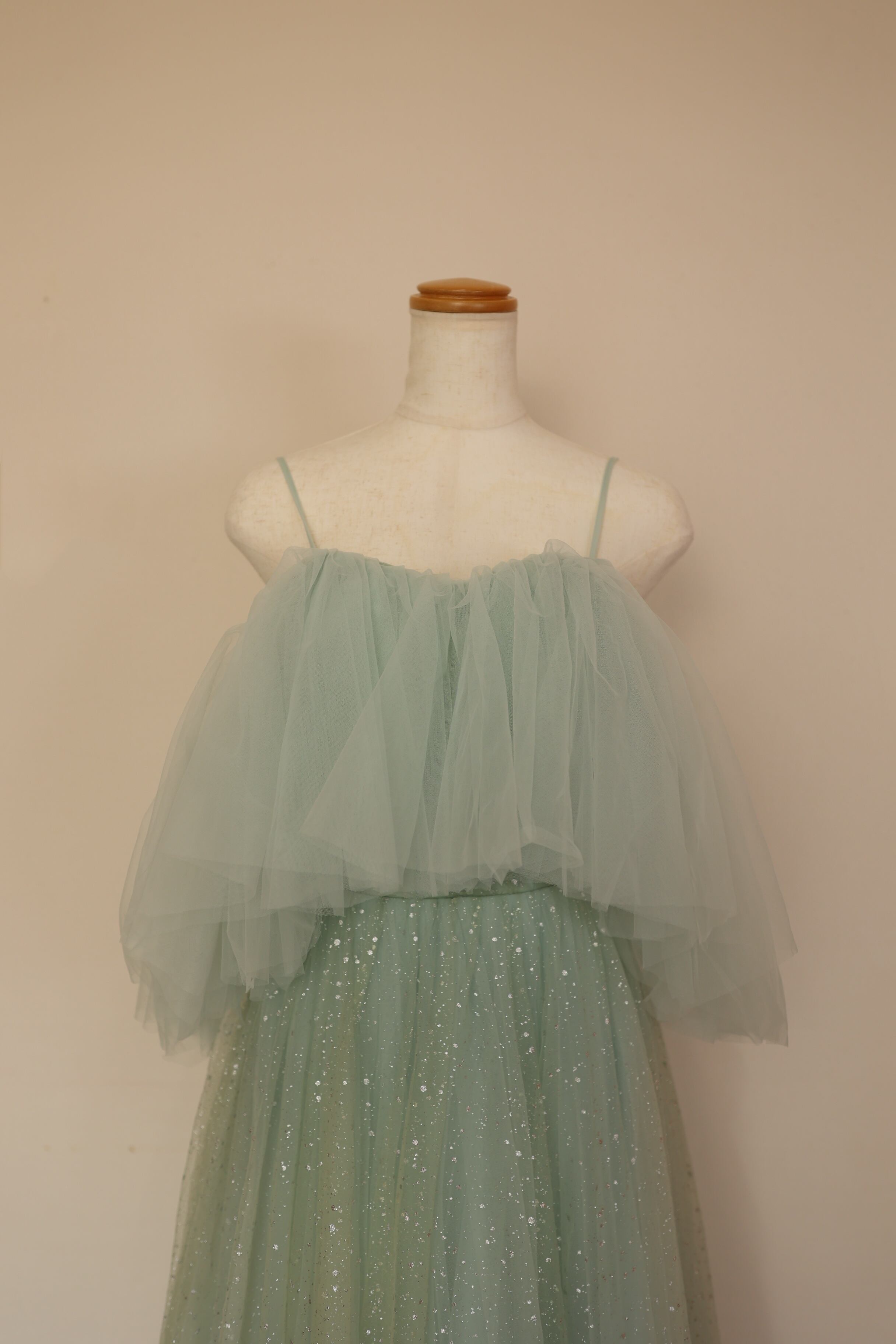 高品質! グリーン オフショルダー キラキラグリッターチュール カラードレス 披露宴/拳式