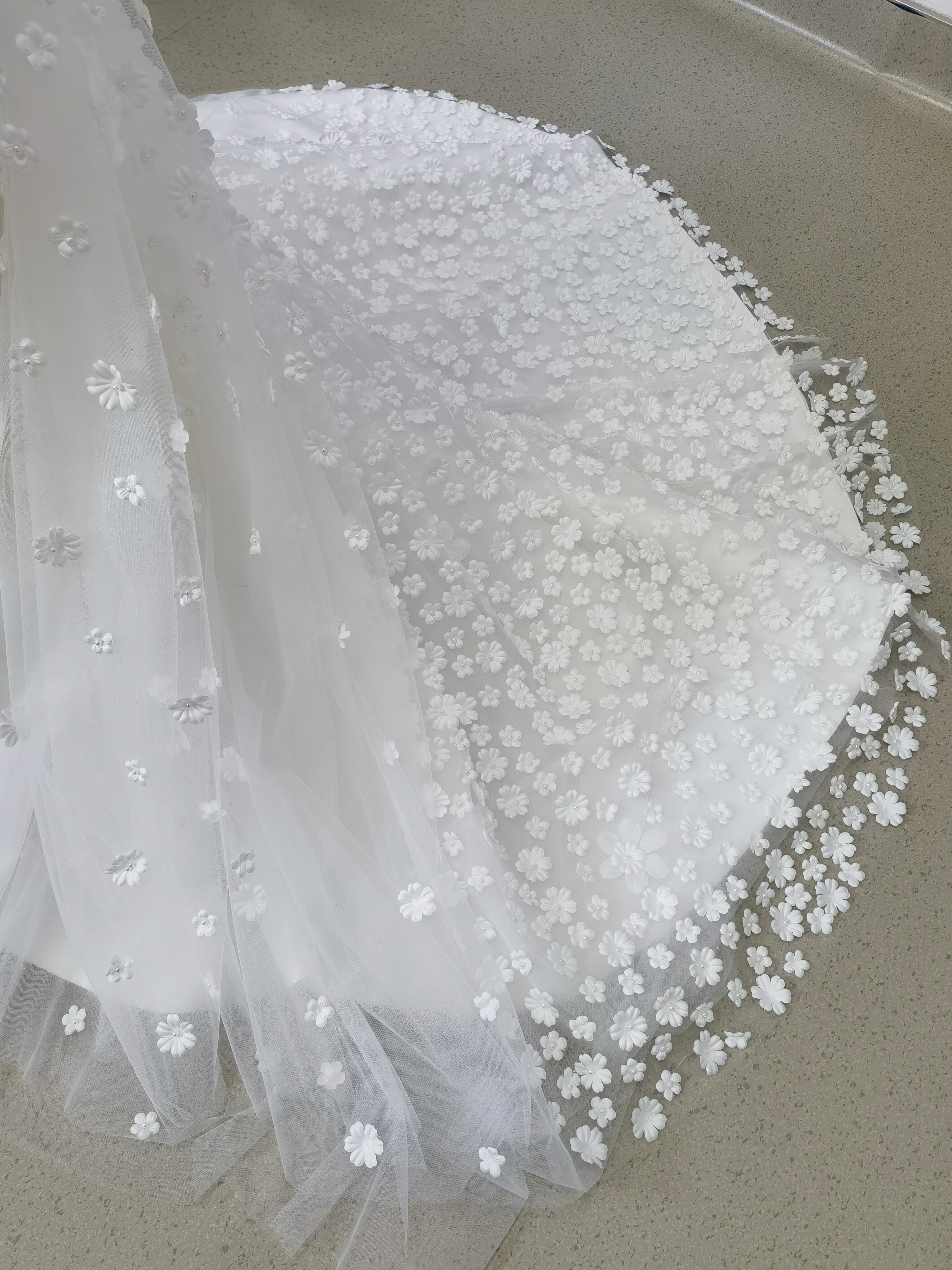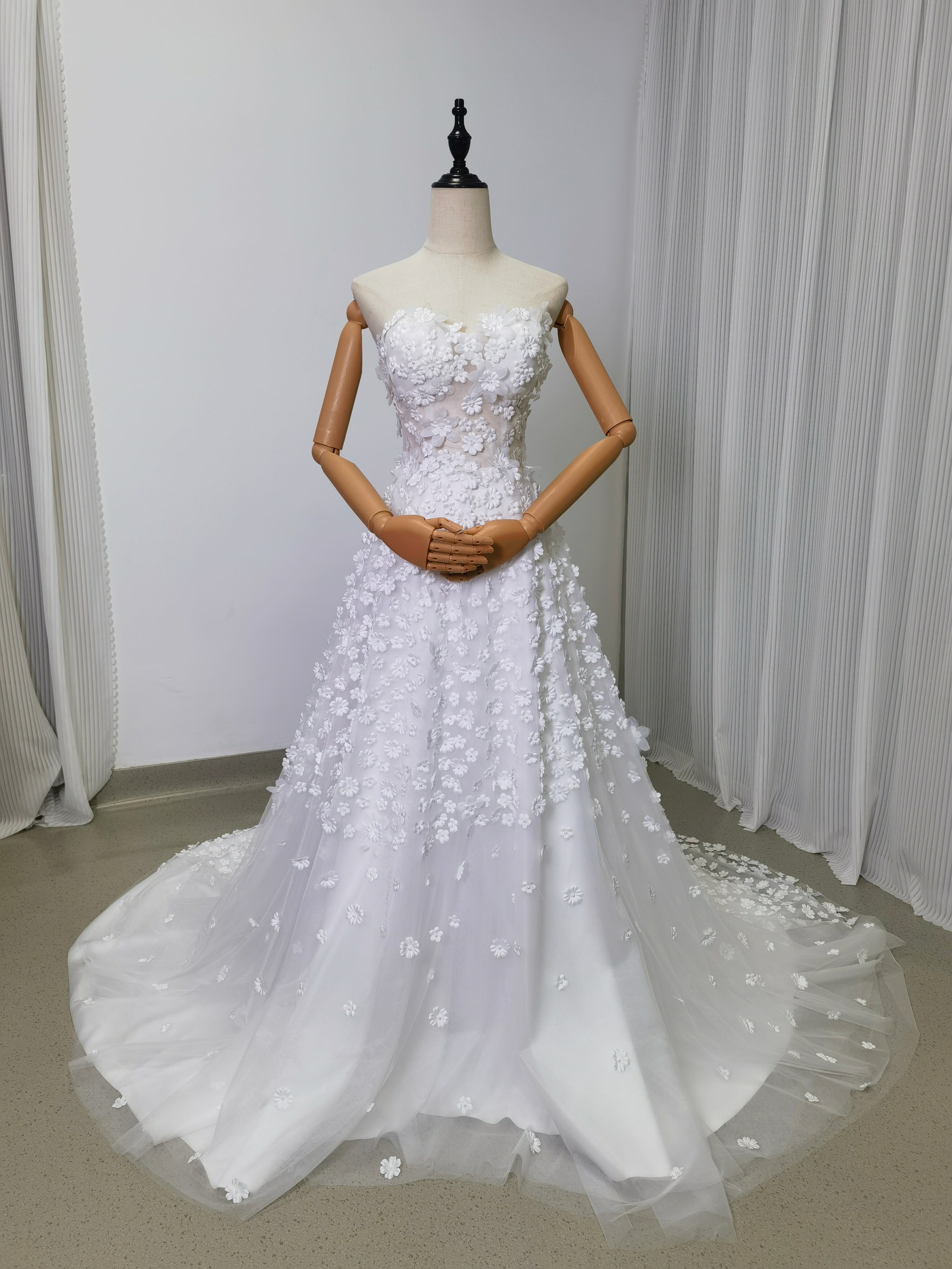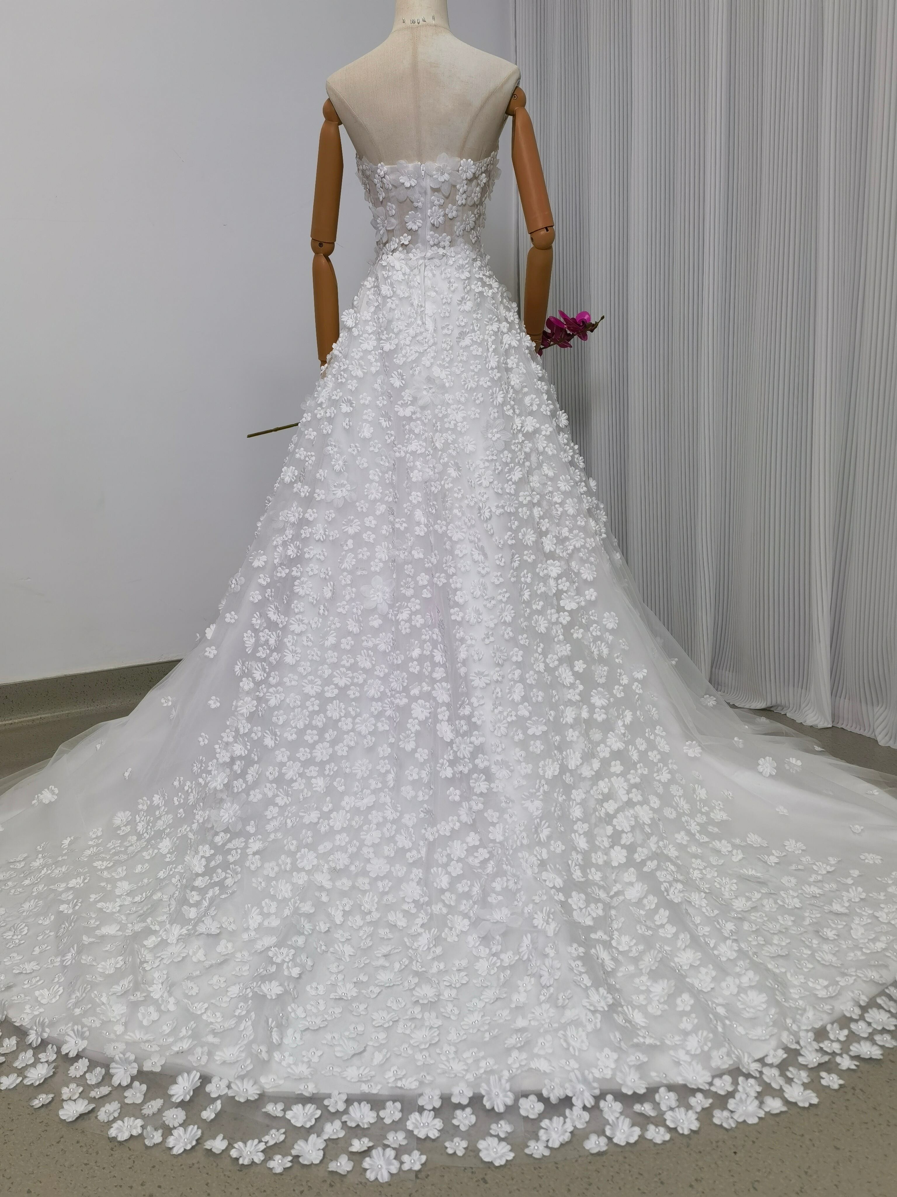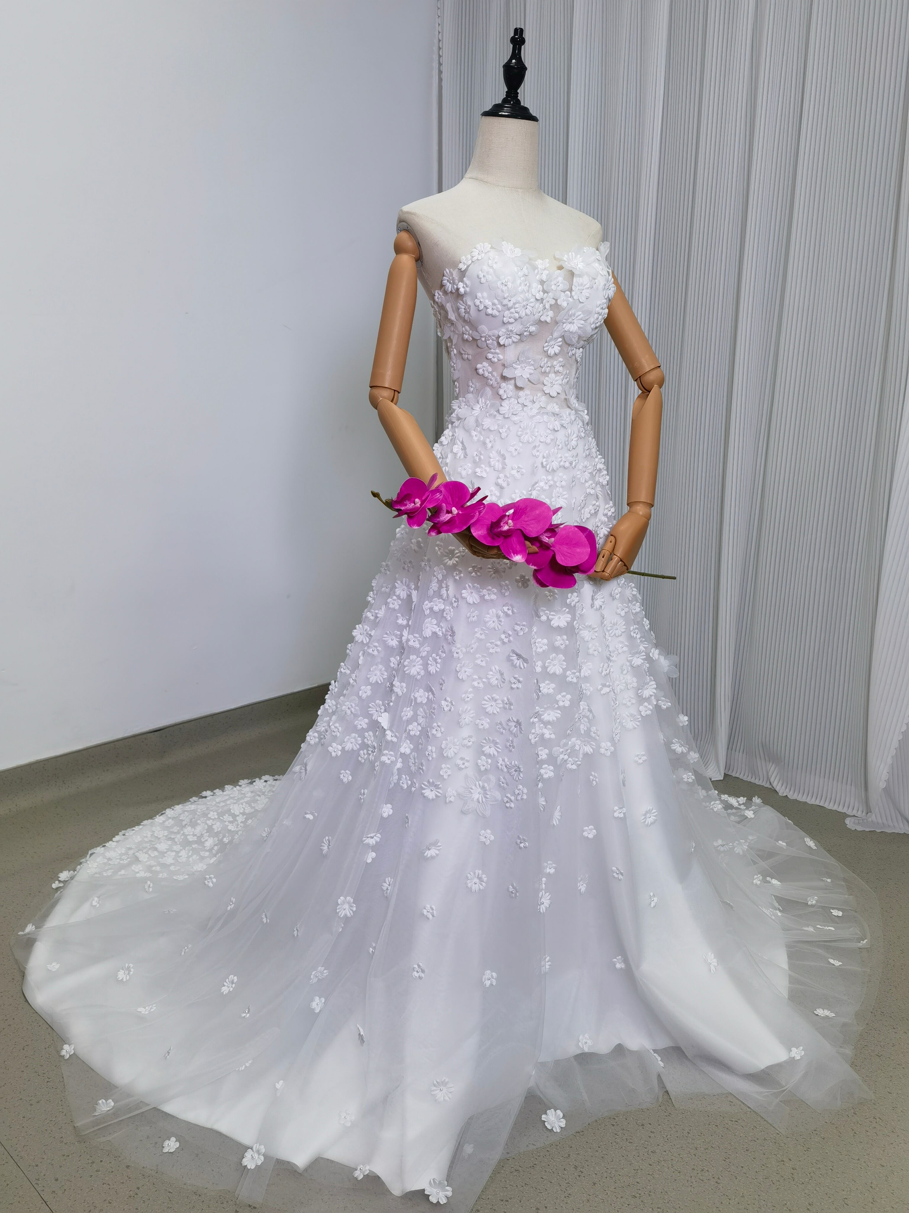 送料無料!ベアトップ ハンドメイド パール 花 ウエディングドレス 華やかなトレーン 前撮り 結婚式