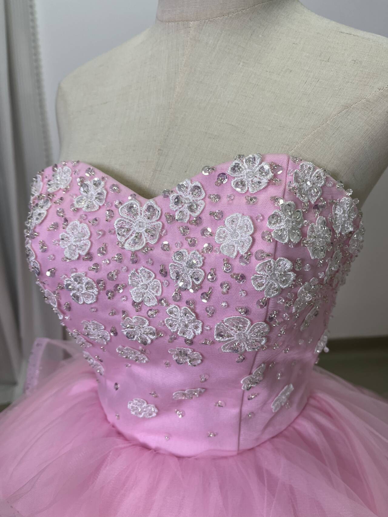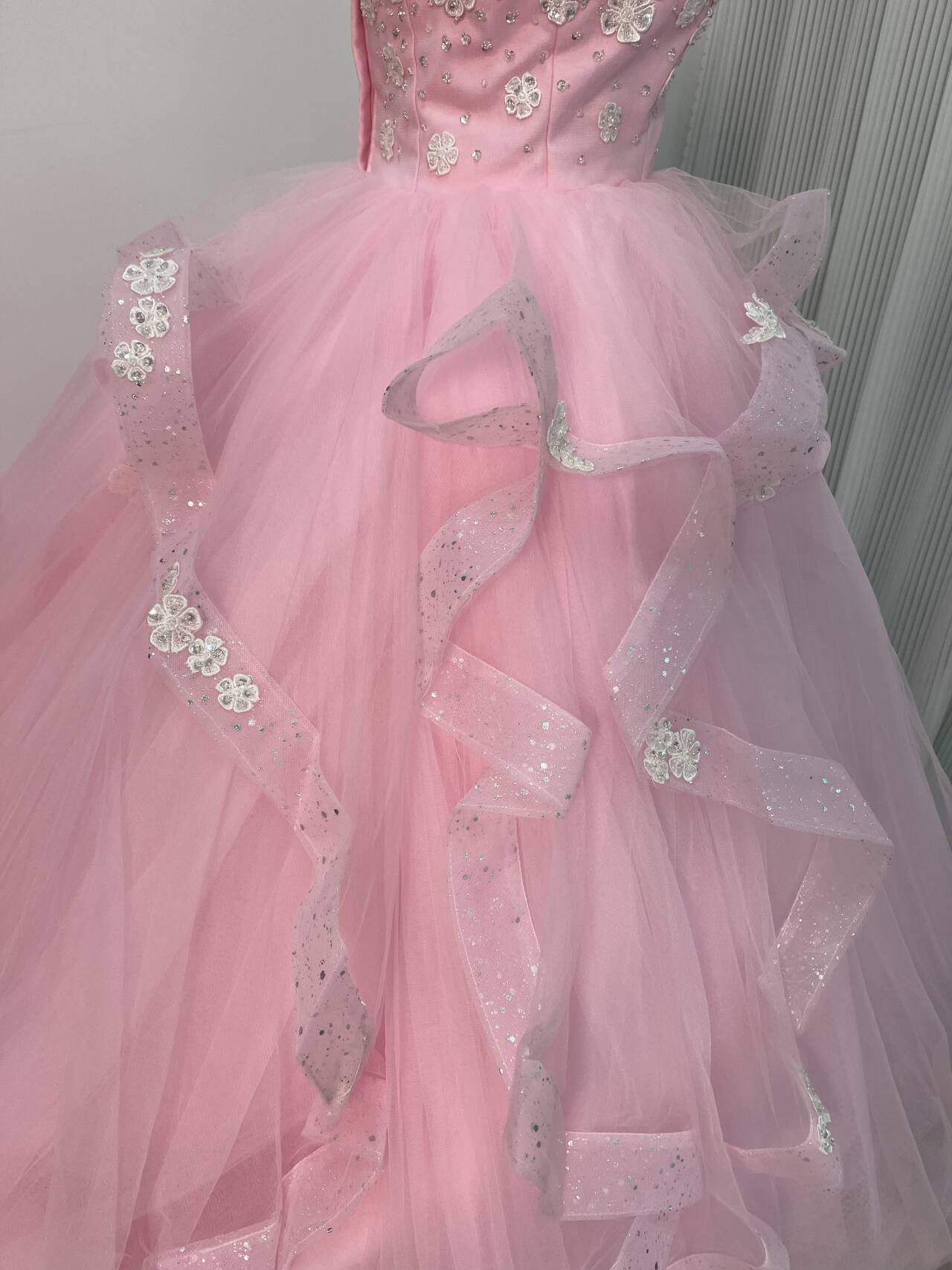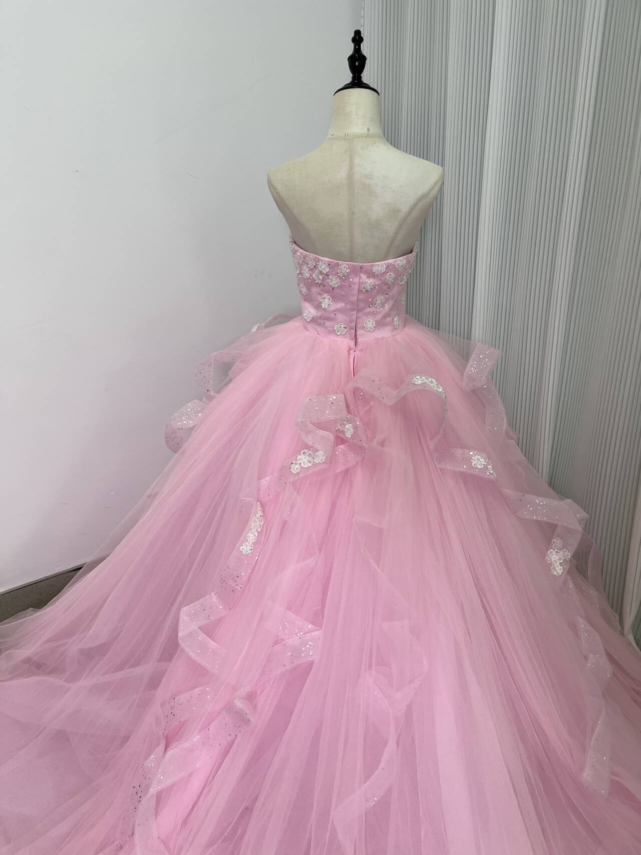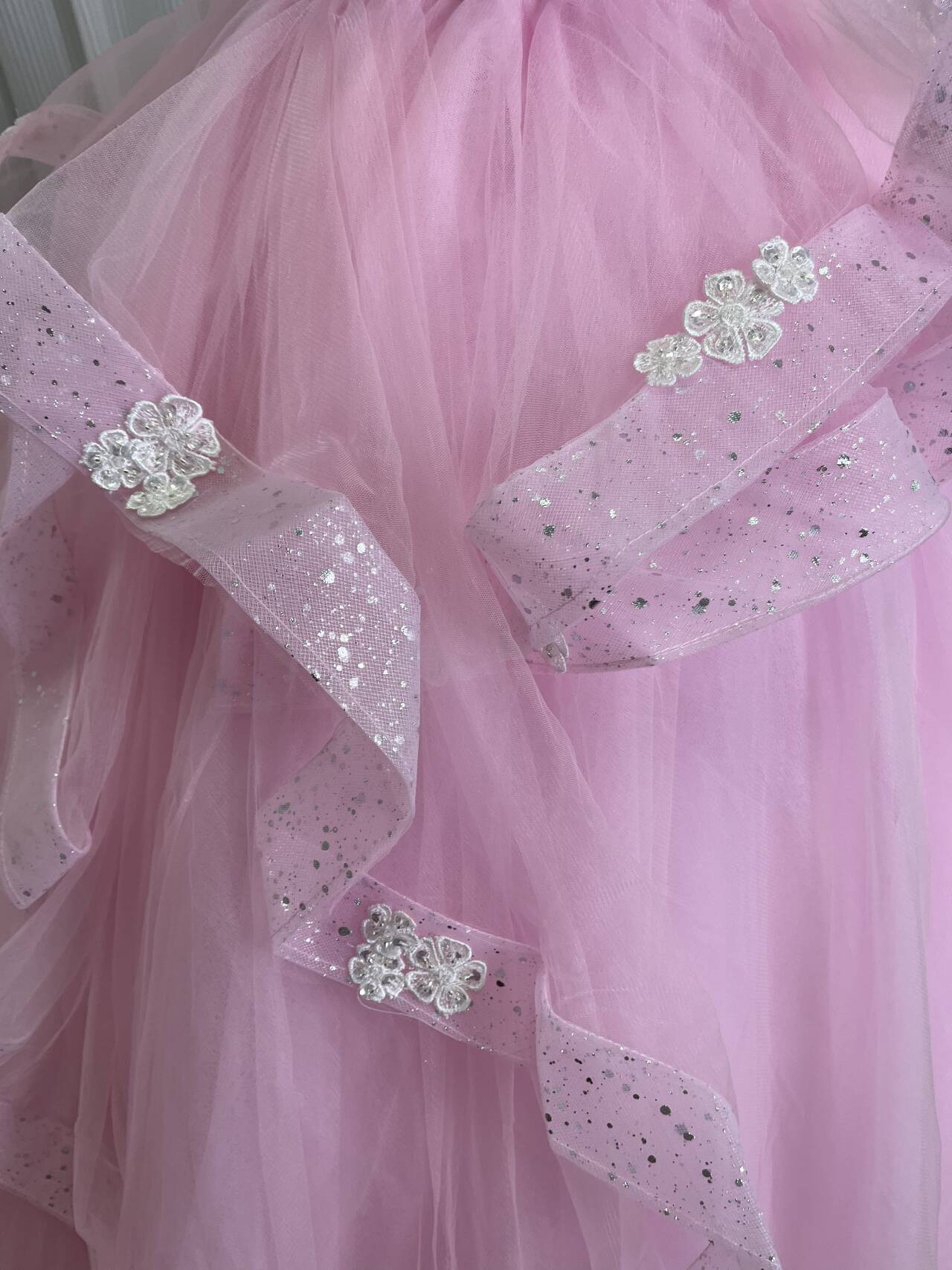 送料無料!美品! ピンク 花モチーフ カラードレス ソフトチュール ラッフルフリル 華やかなトレーン結婚式
