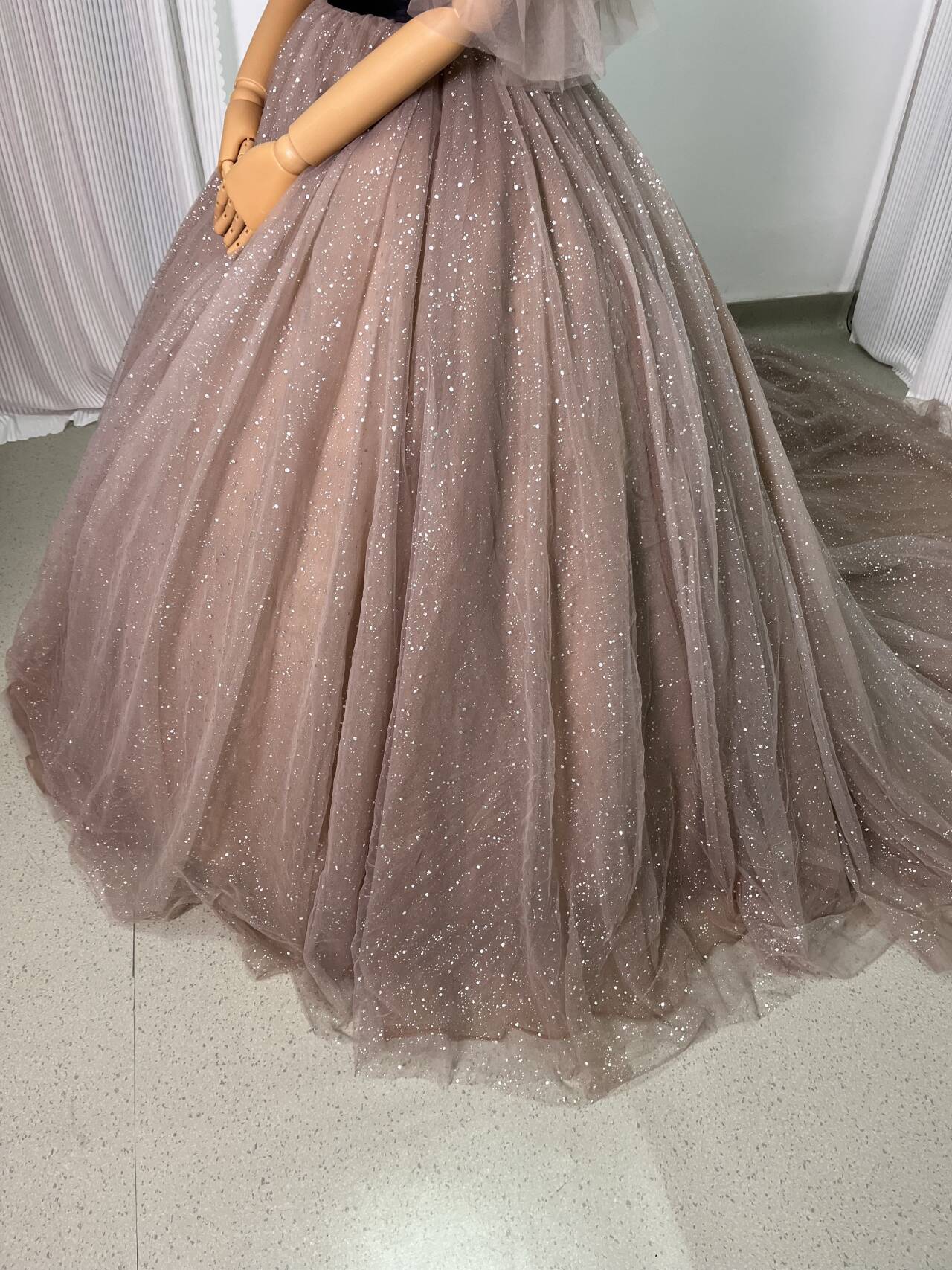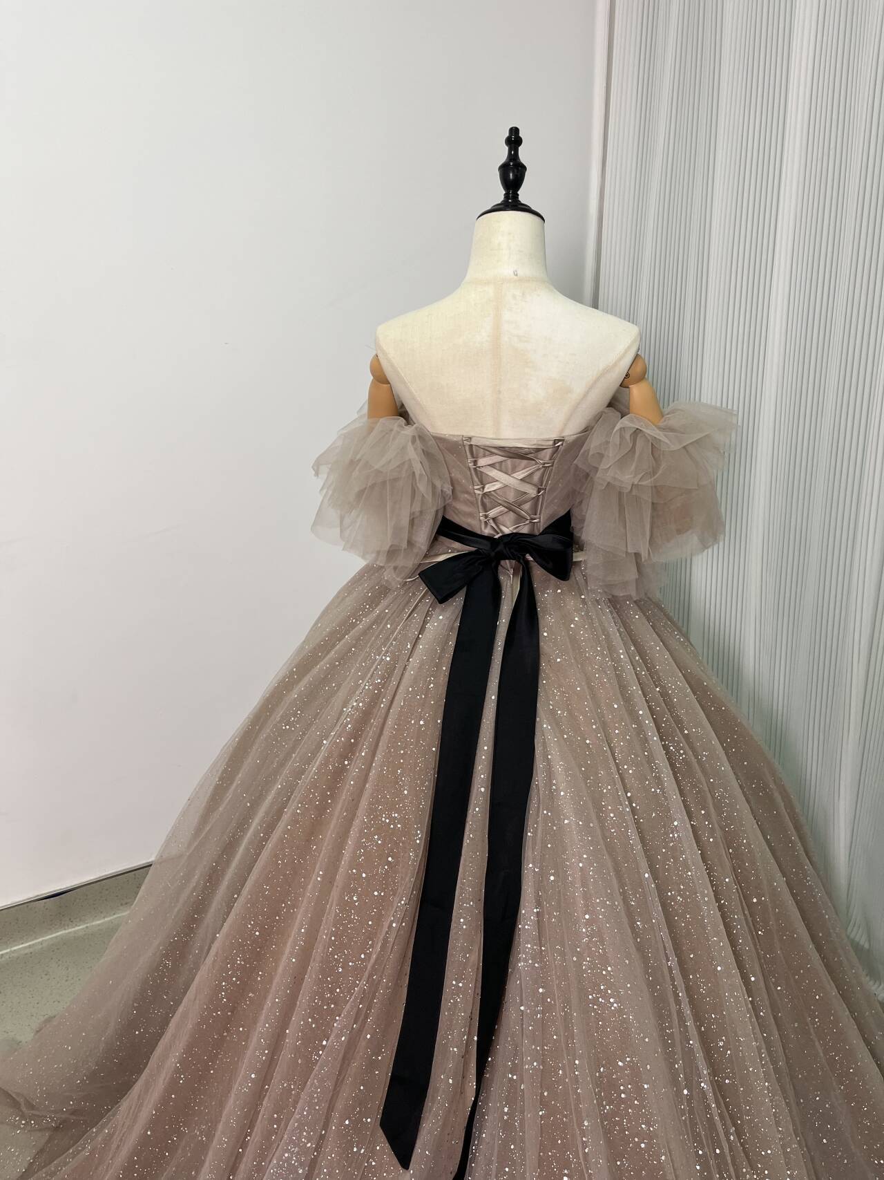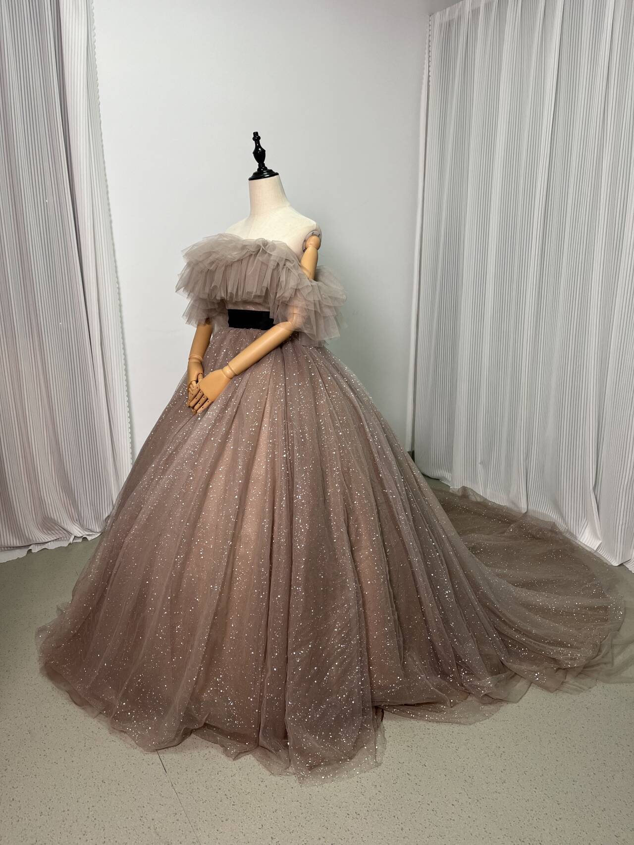 大好評中!取り外しオフショルダー キラキラチュール カラードレス 編み上げ 華やかなトレーン /結婚式披露