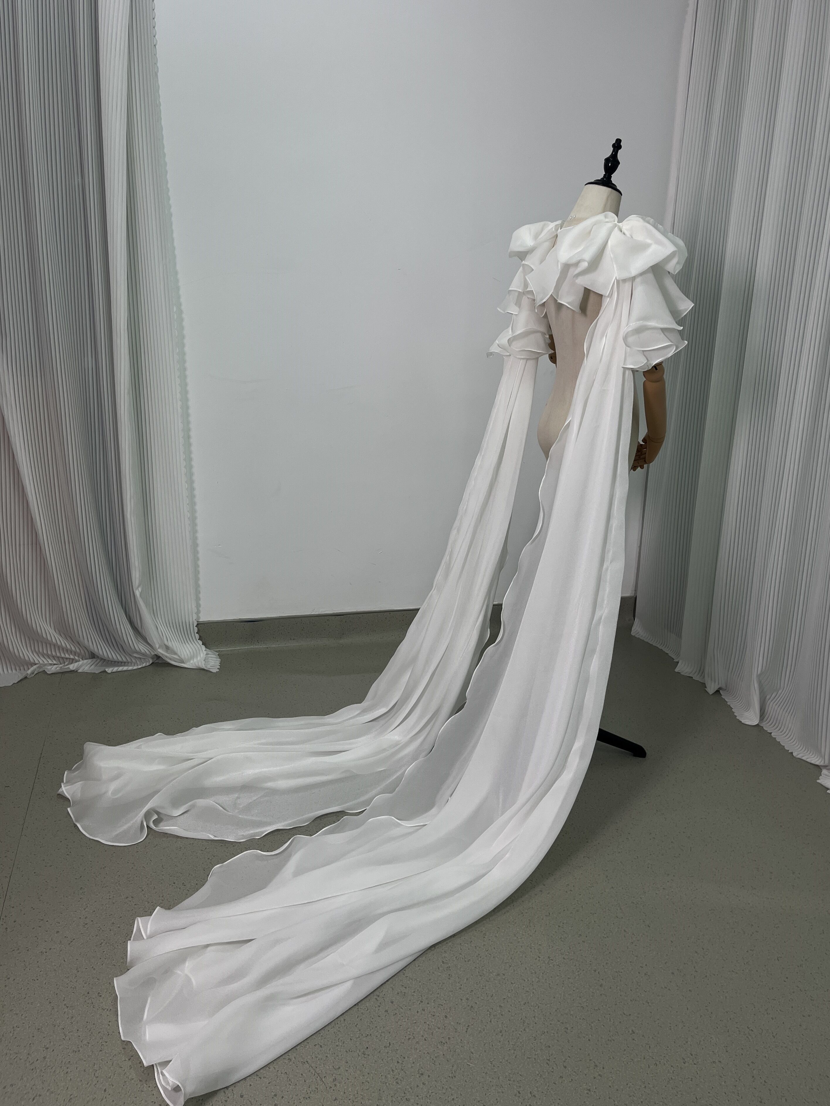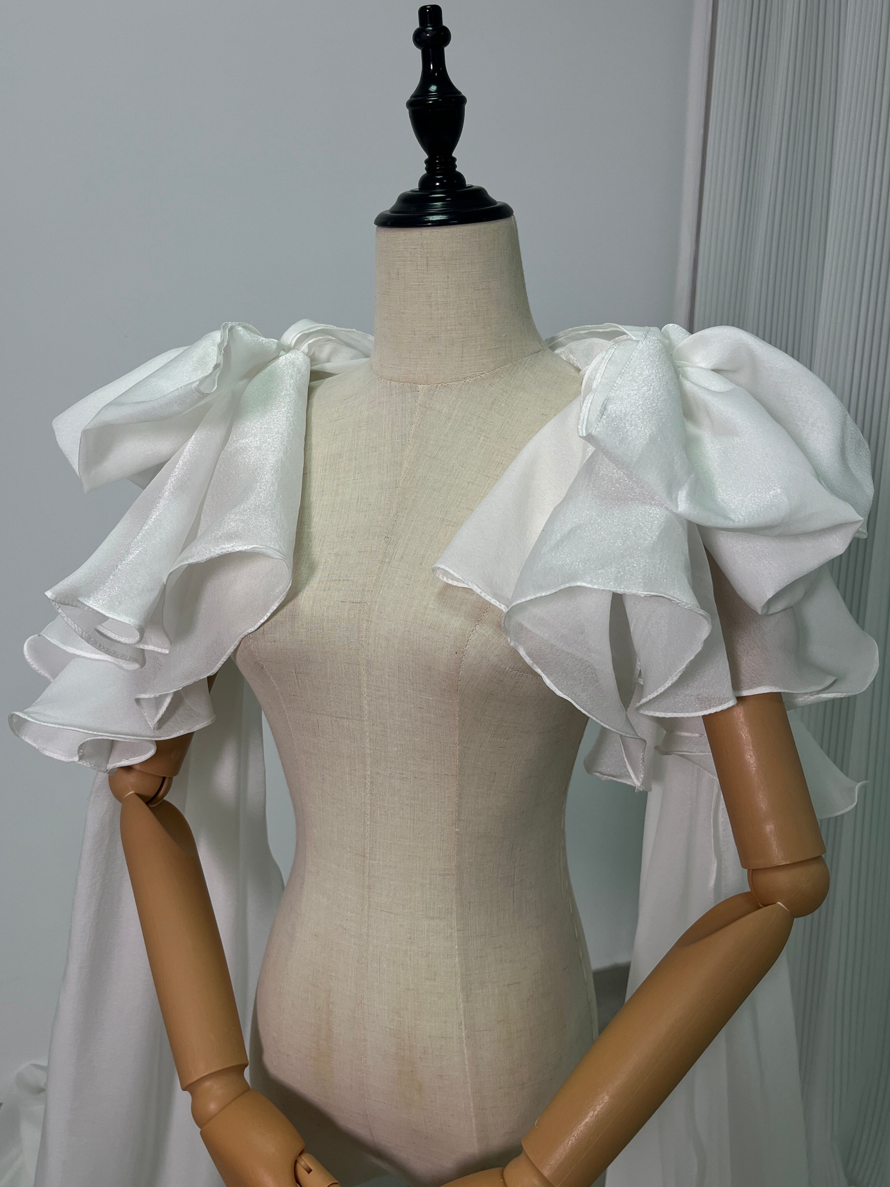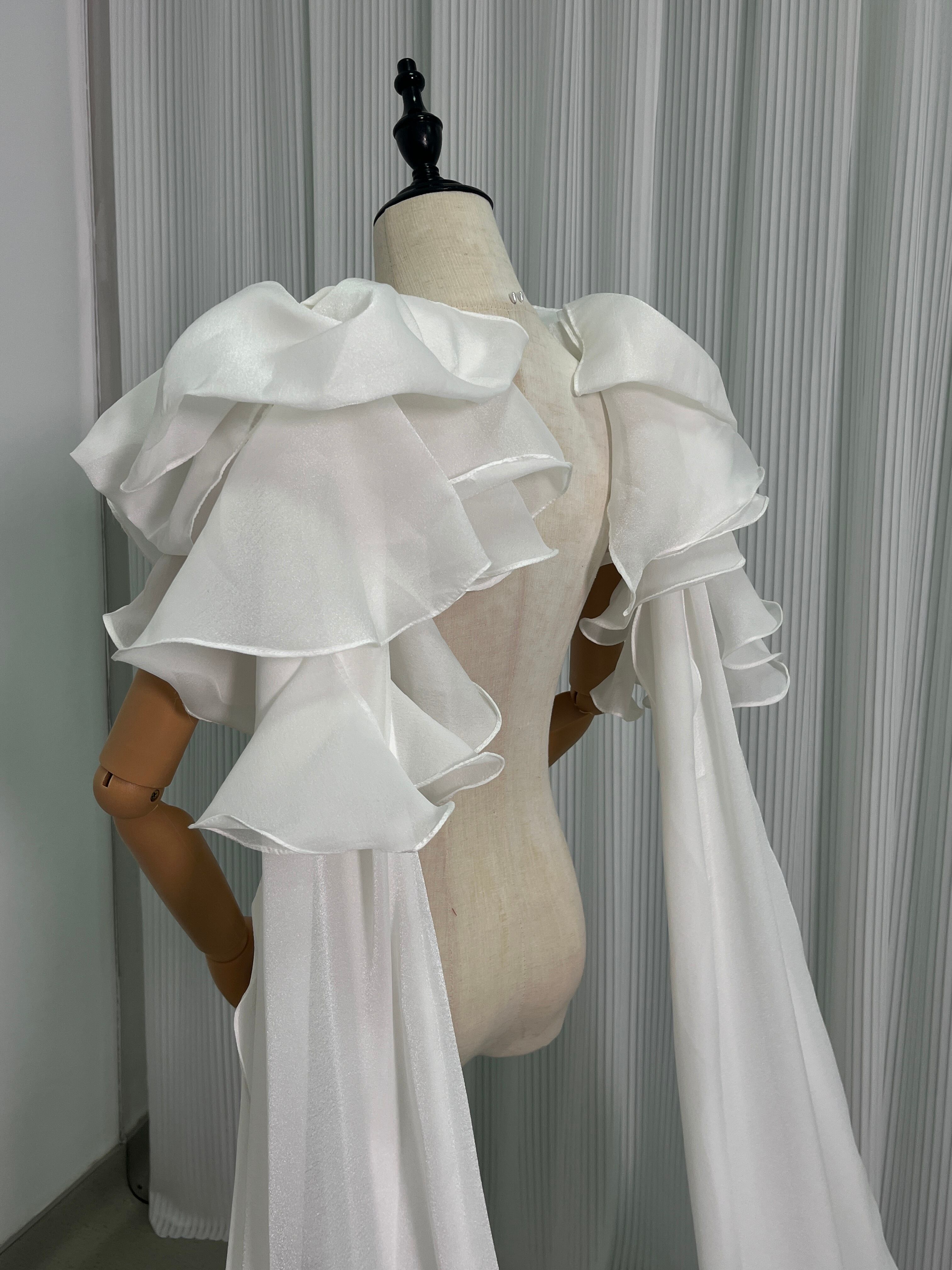 送料無料 !上品!ホワイト ロングトレーン ポンチョ ラッフルトレーン 肩リボン /結婚式/披露宴/