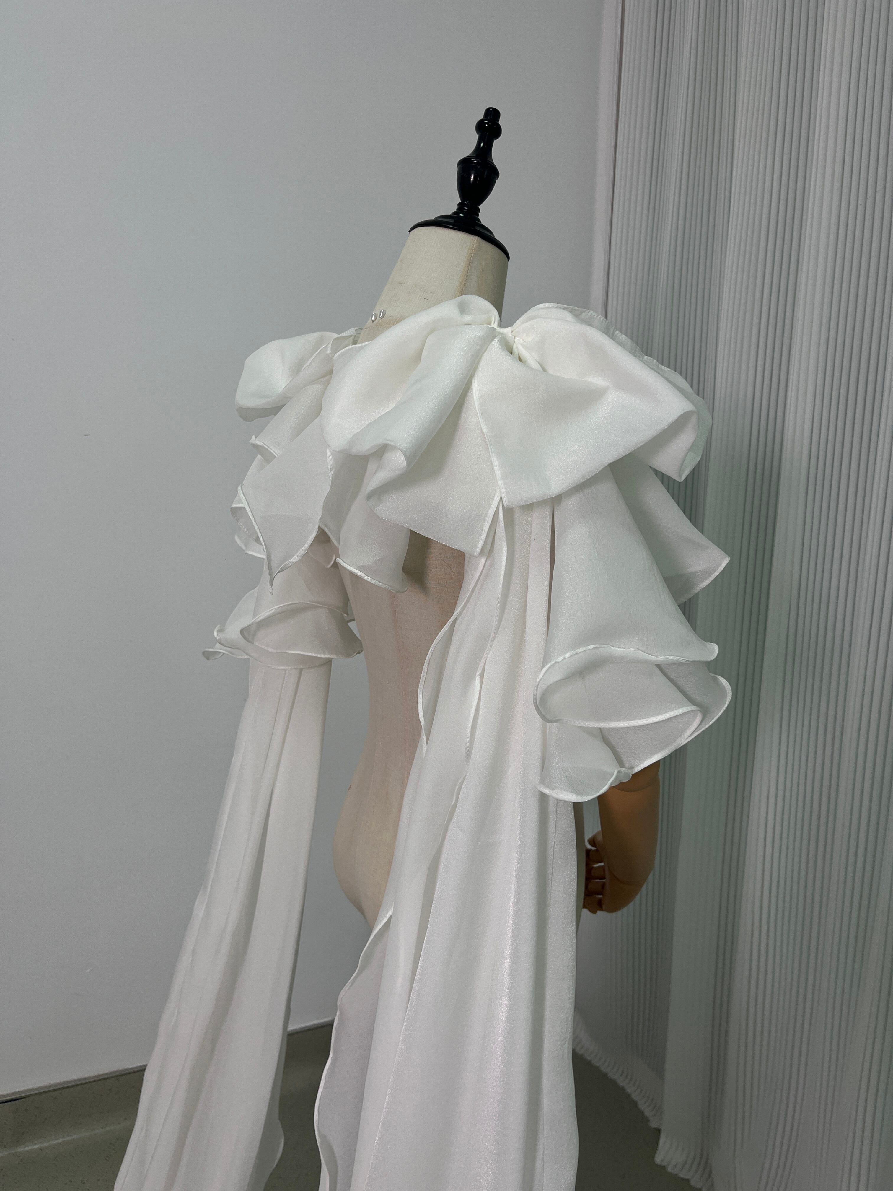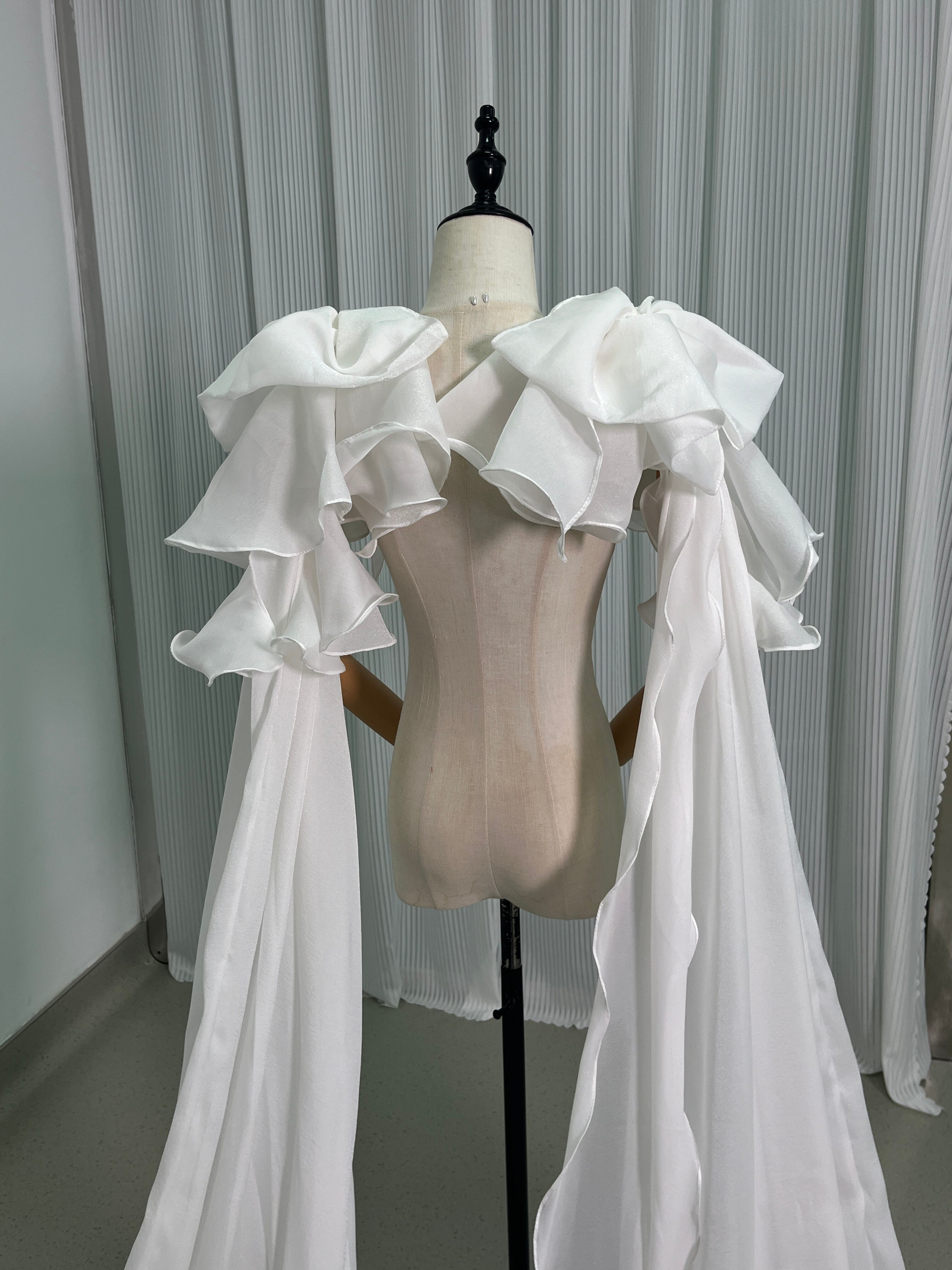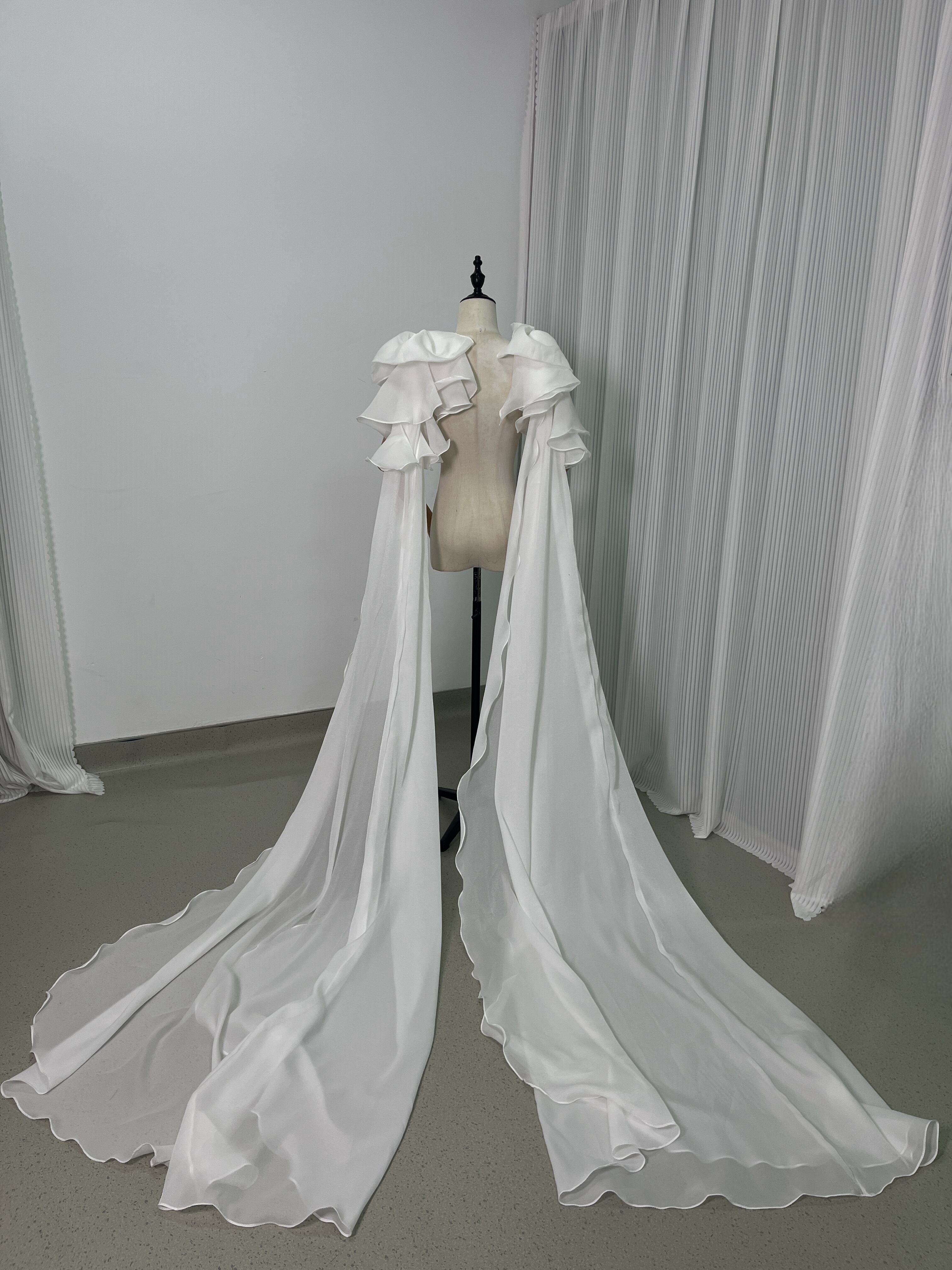 送料無料 !上品!ホワイト ロングトレーン ポンチョ ラッフルトレーン 肩リボン /結婚式/披露宴/
