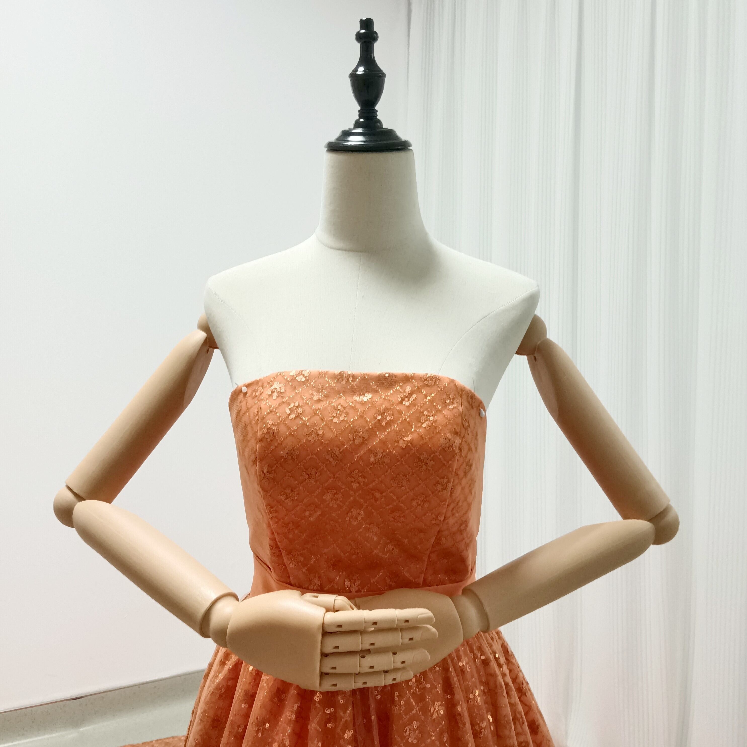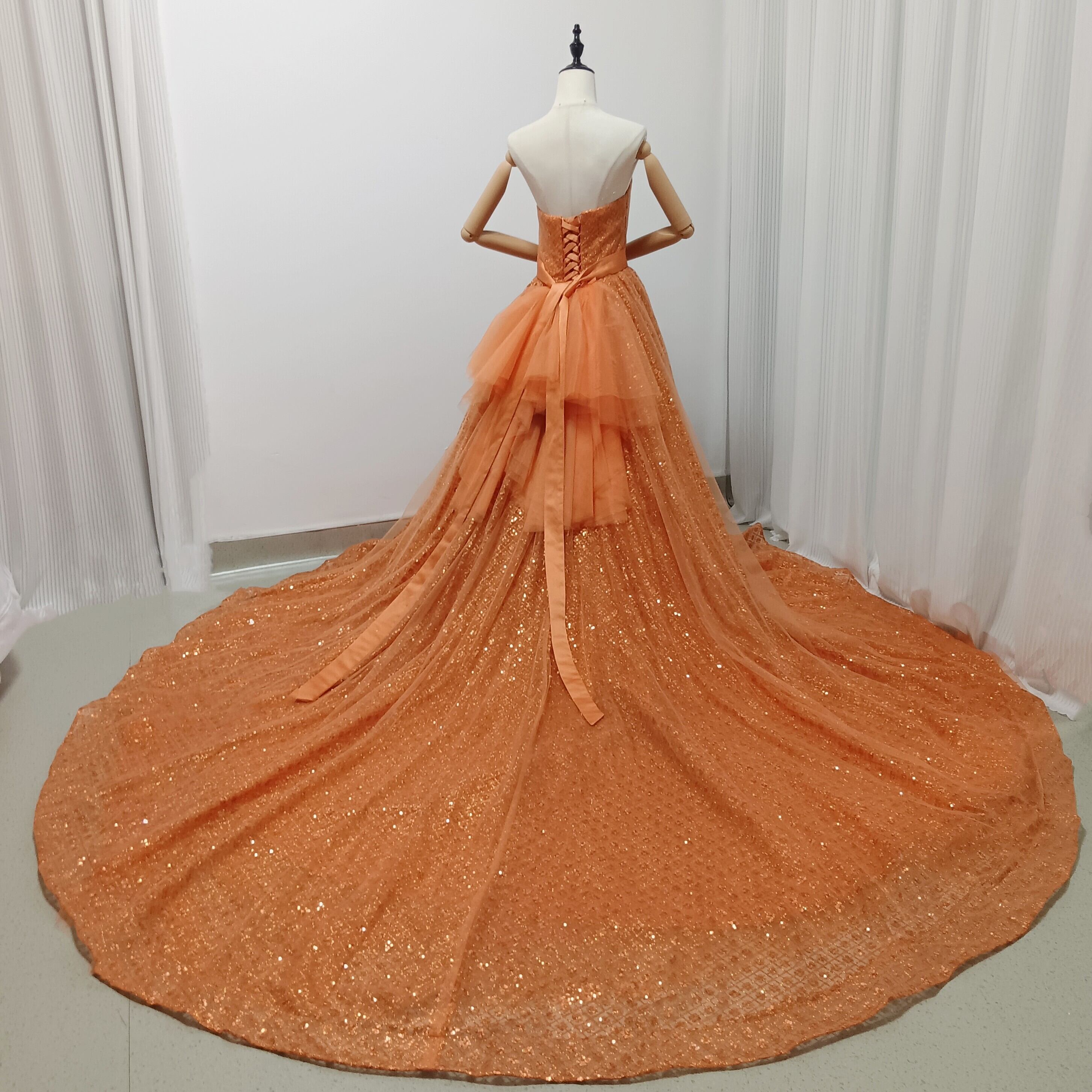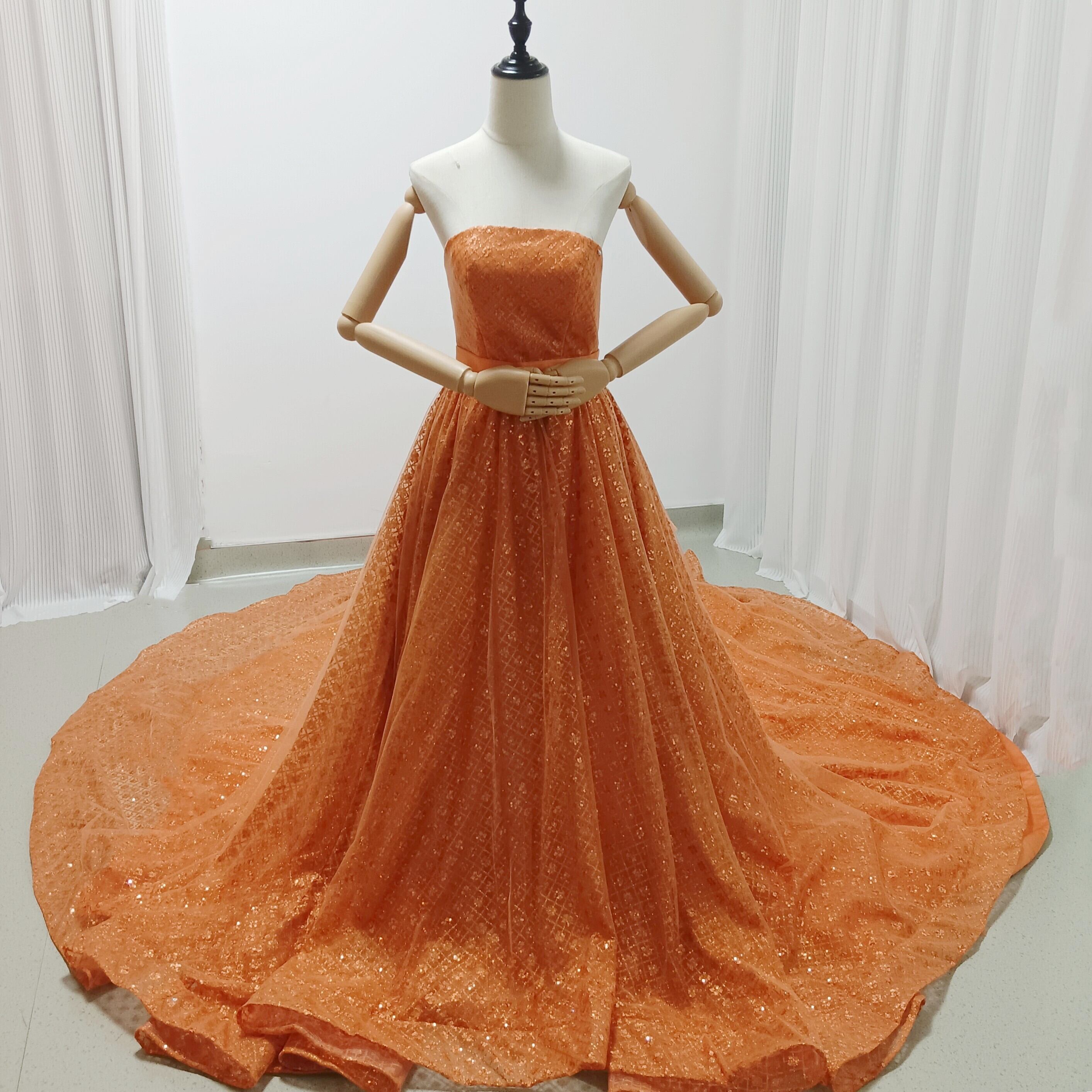 大好評中!オレンジ ベアトップ キラキラチュール カラードレス 編み上げ 華やかなトレーン /結婚式披露