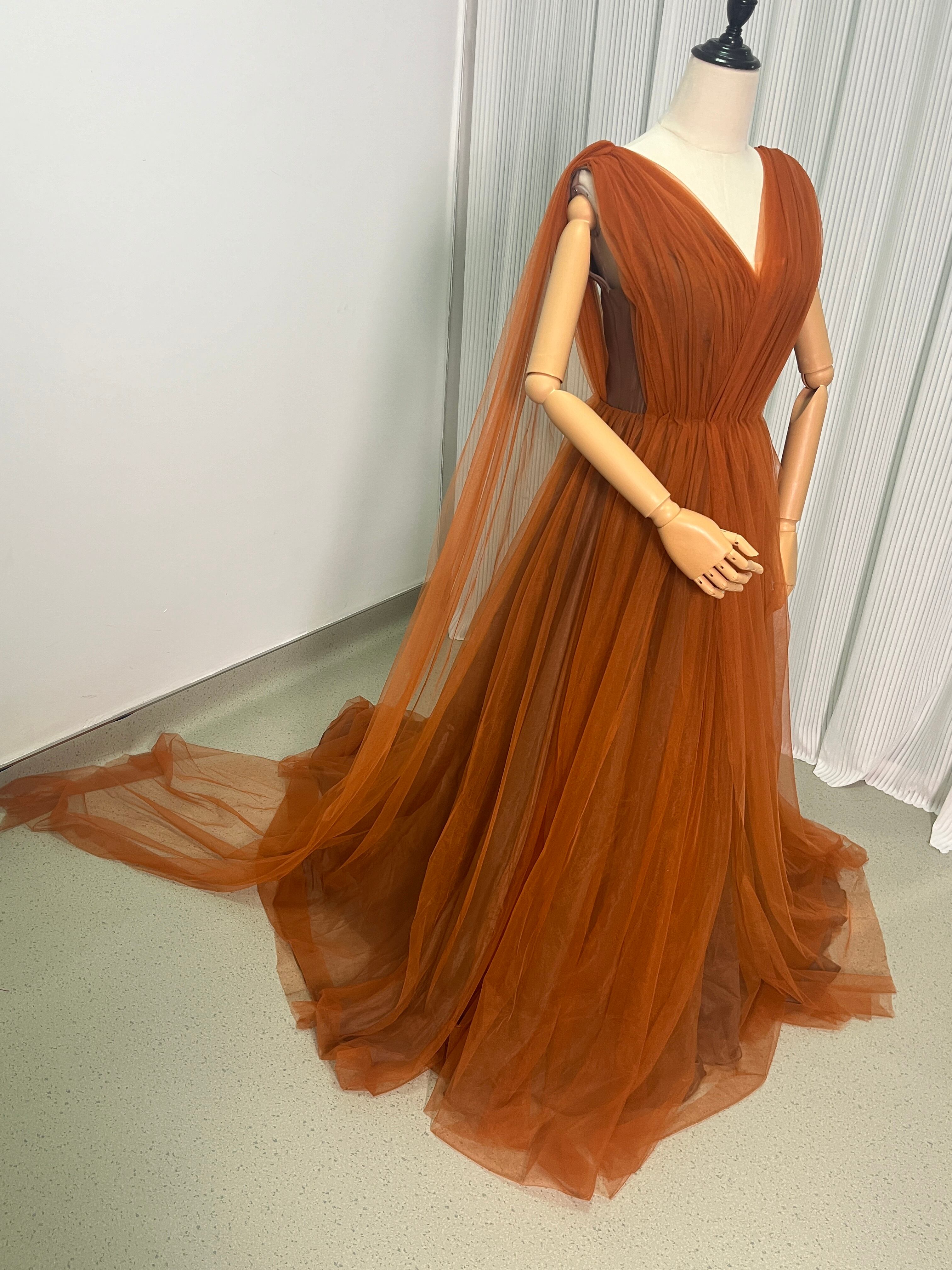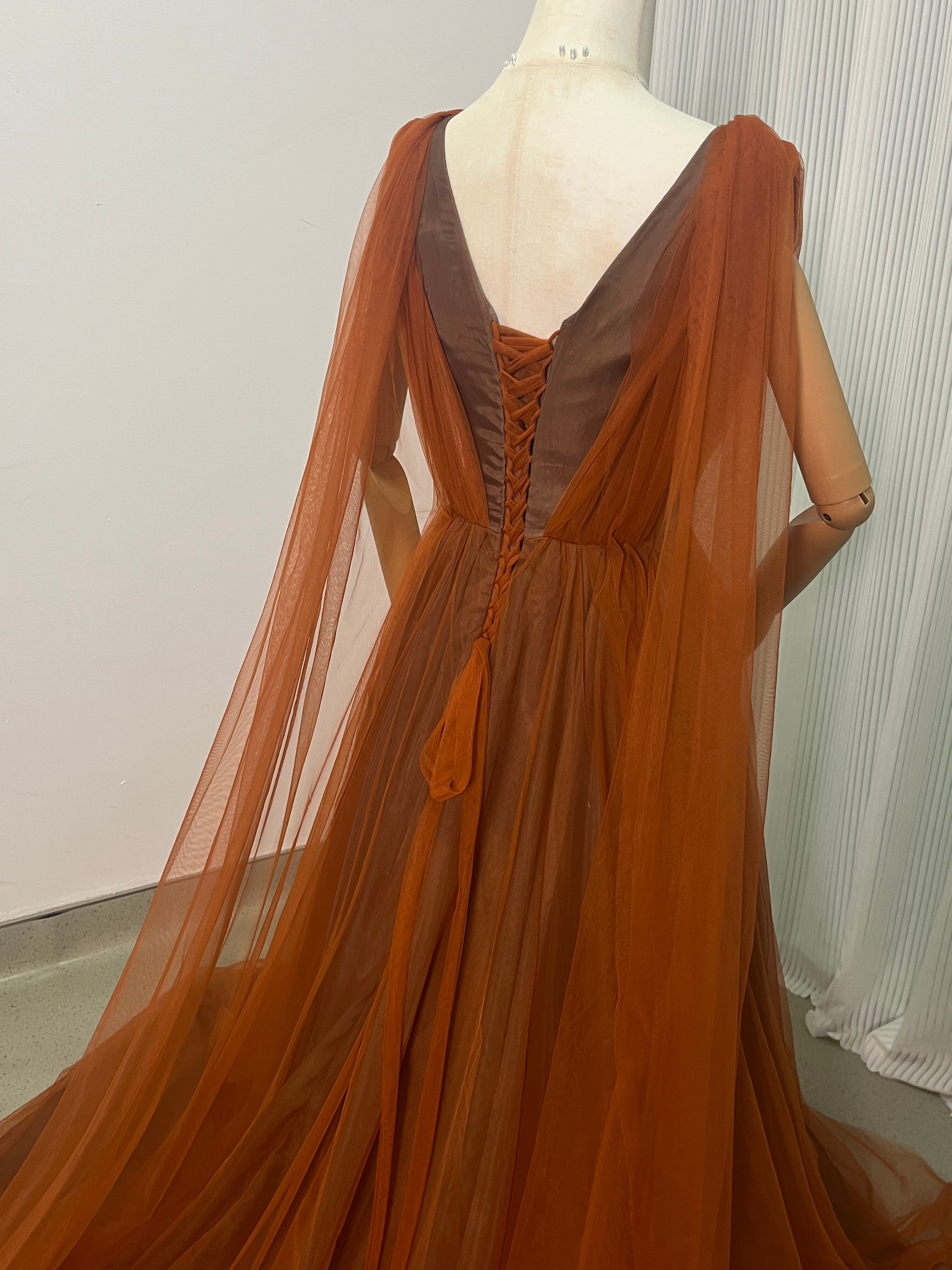 大好評中!オレンジ Vネック カラードレス チュールドレス 編み上げ 華やかなトレーン /結婚式披露