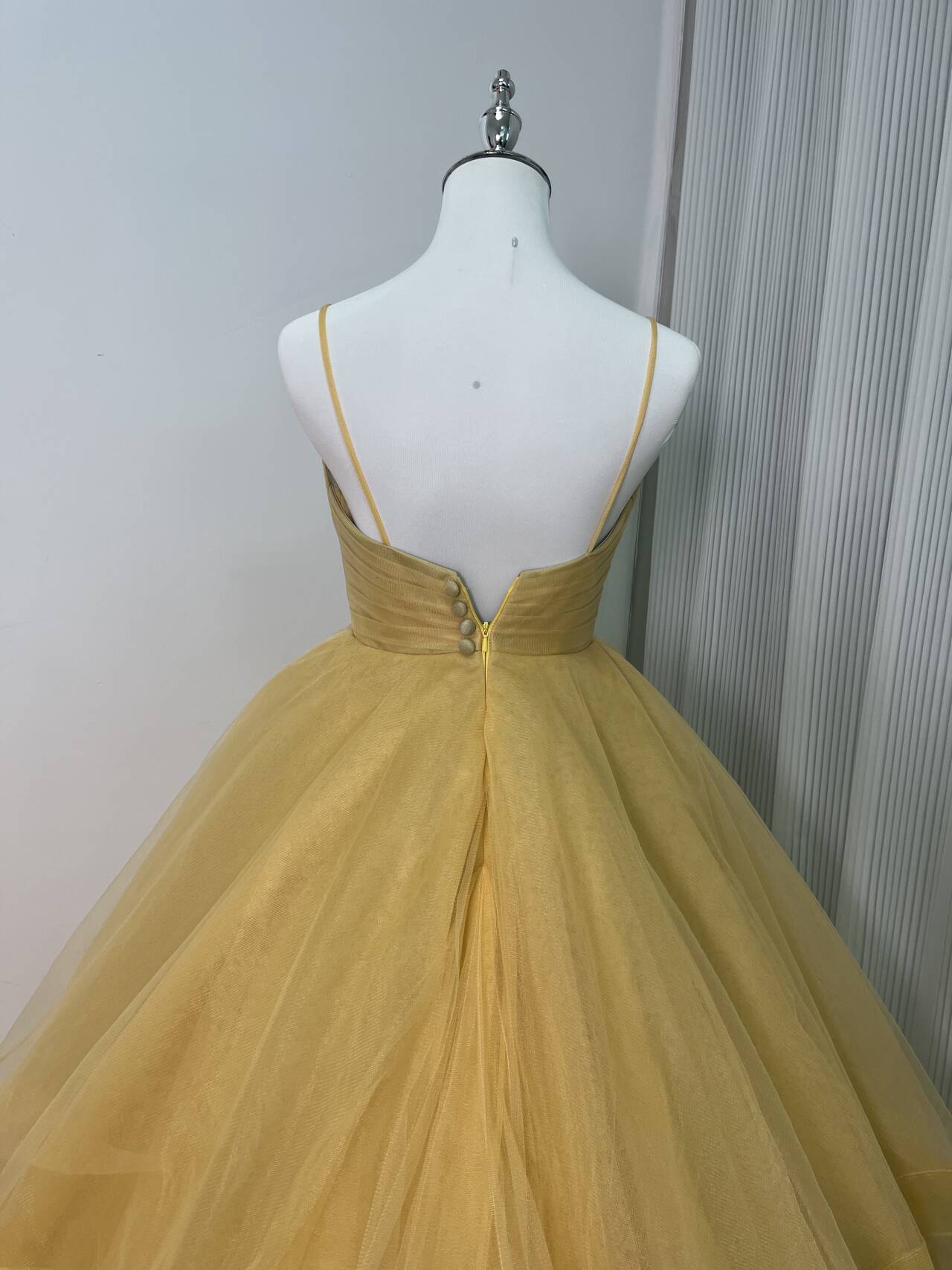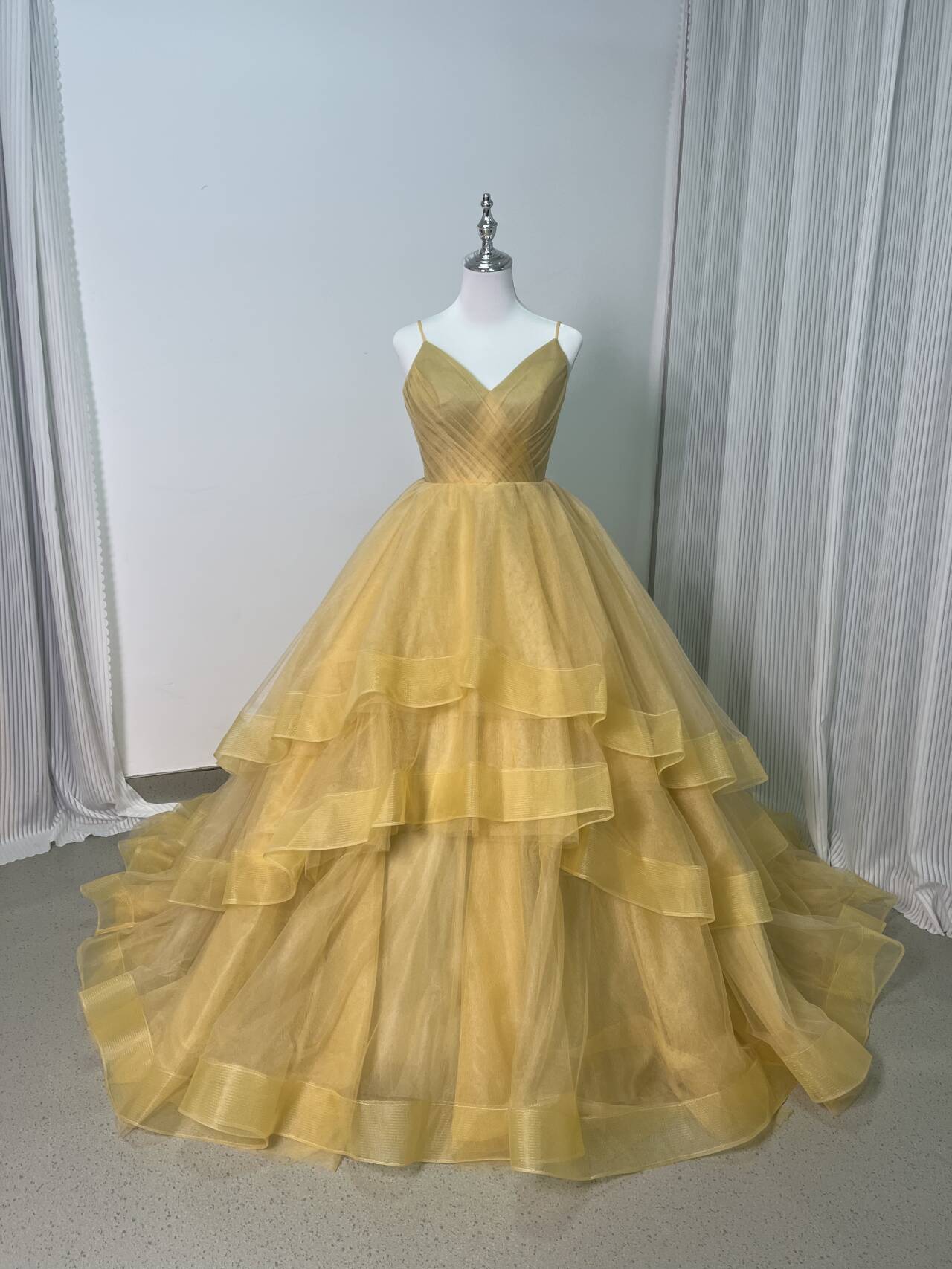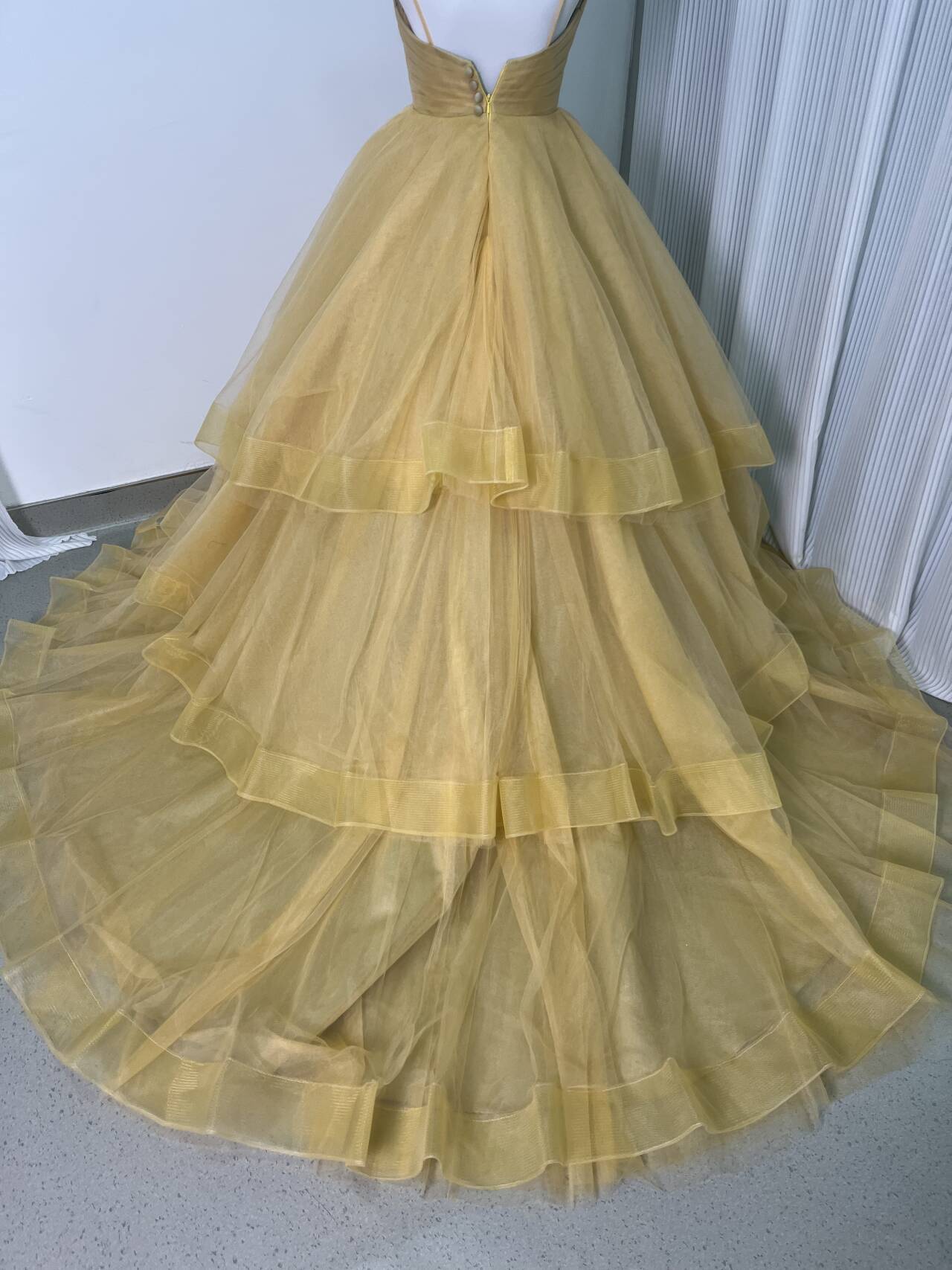 高品質!カナリーイエロー キャミソール カラードレス 華やかなトレーン チュールドレス 披露宴/拳式