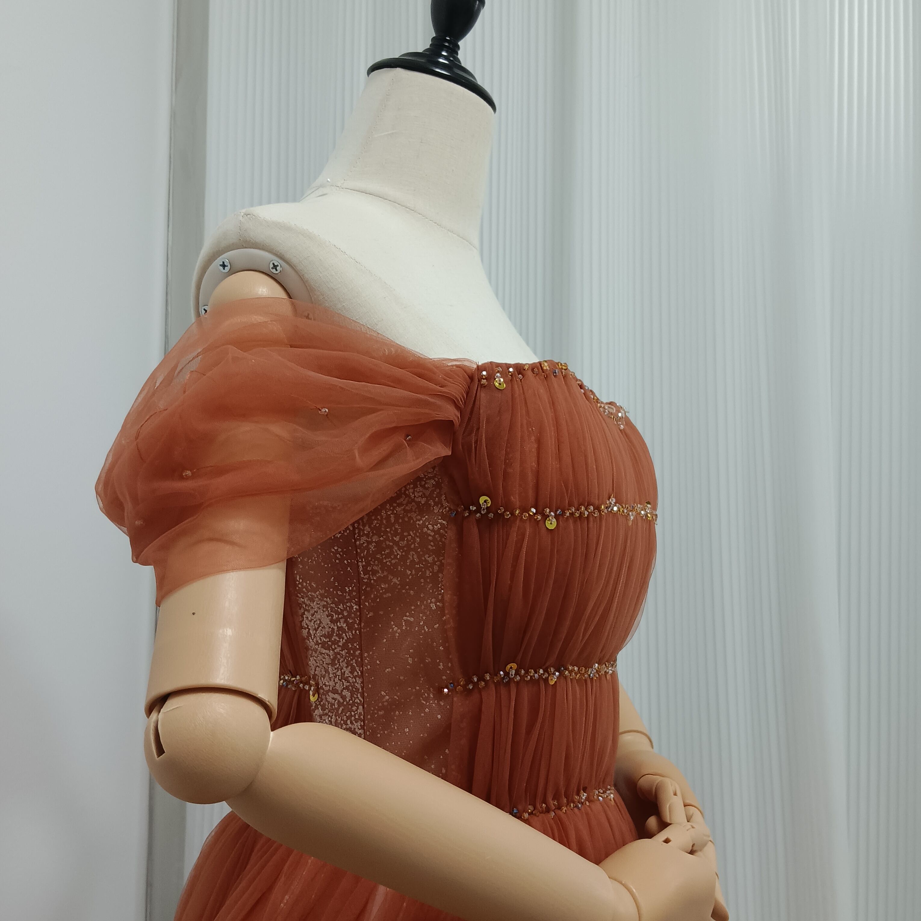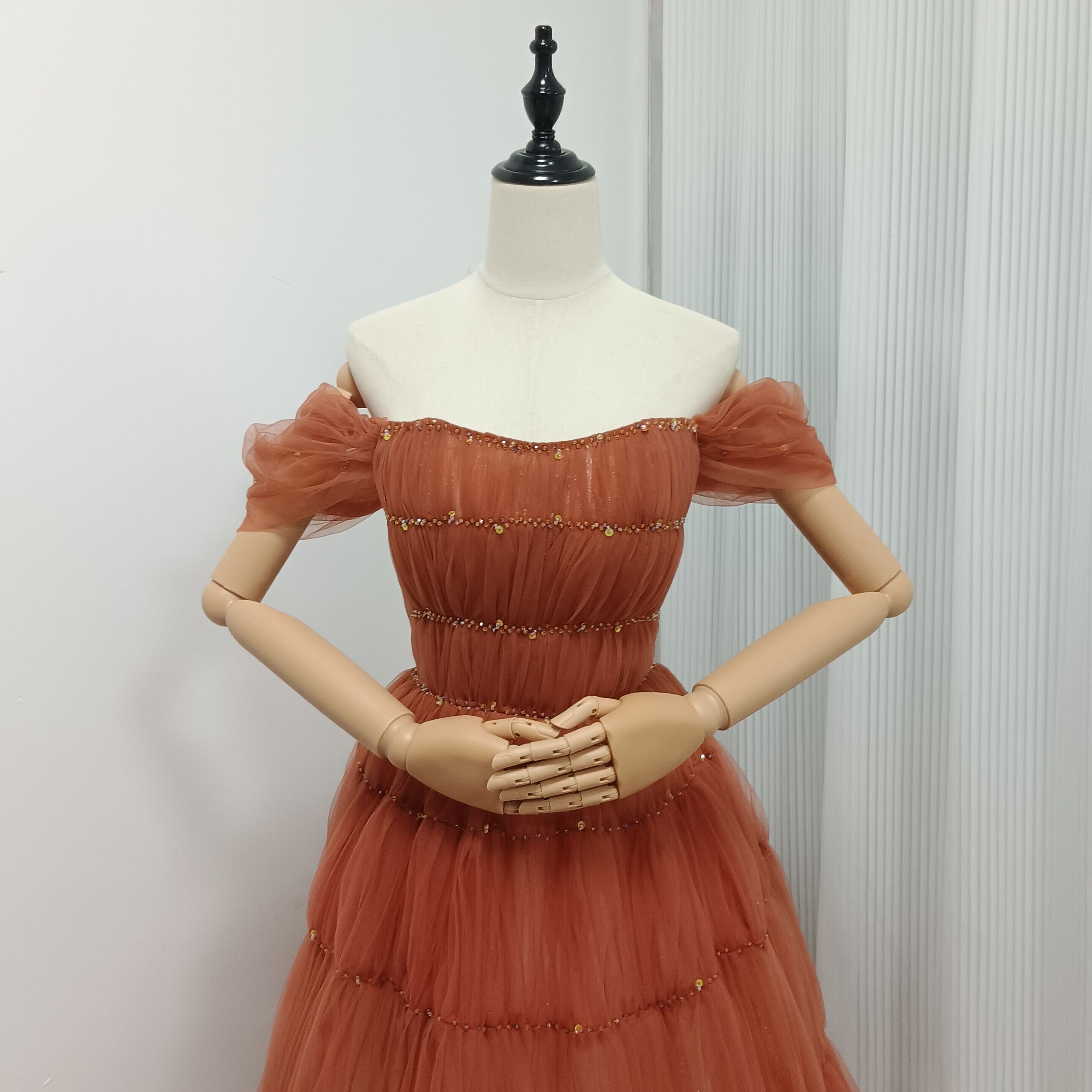 テラコッタ色 オフショルダー カラードレス 編み上げ 華やかなトレーン /結婚式披露